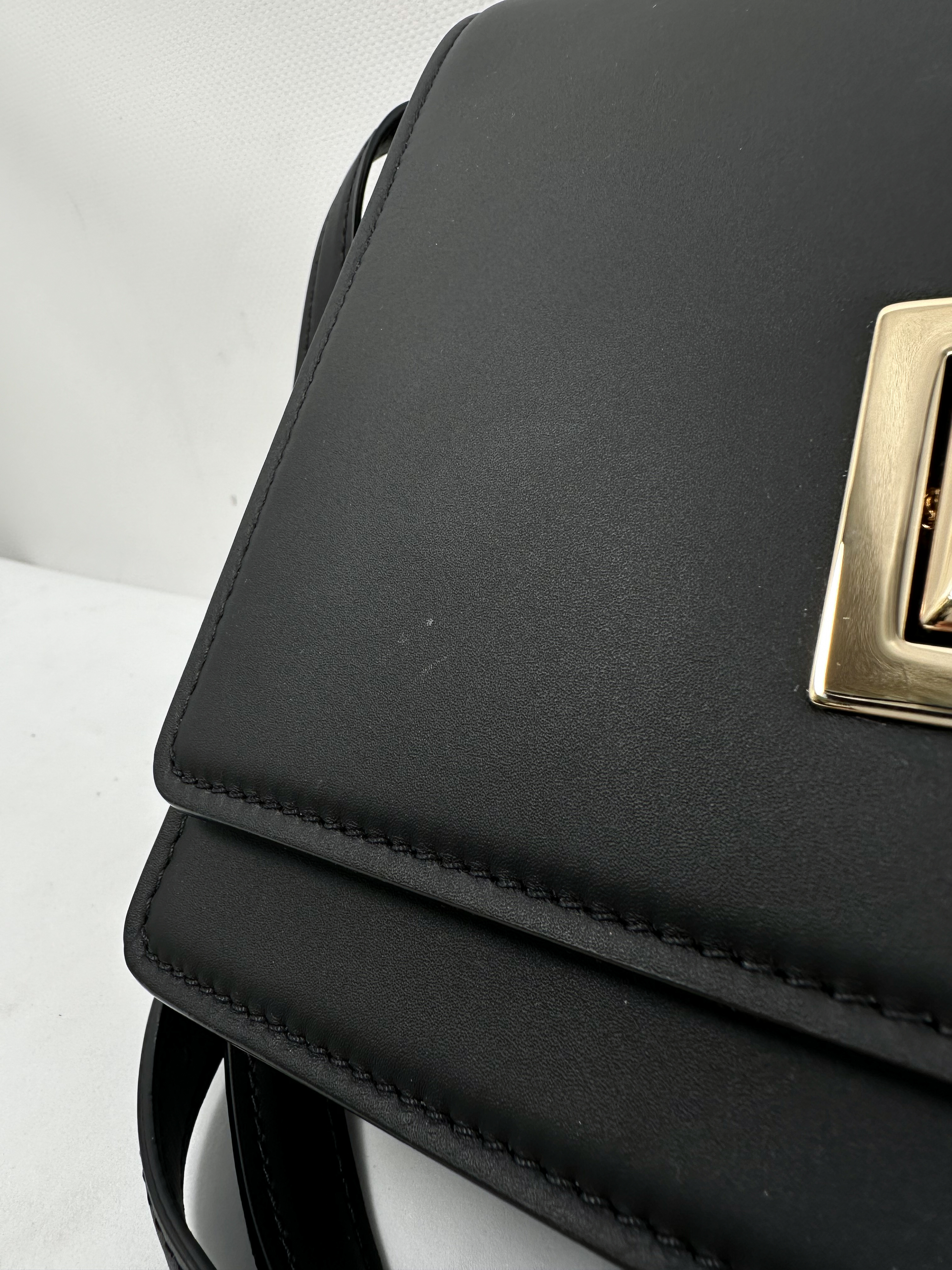 "Czarna skórzana torebka, kwadratowy kształt, klapa zapinana na złotą logowaną klamrę, regulowany pasek na ramię, złote okucia z logo marki, jedna zasuwana kieszeń w tylnej części, brązowe zamszowe wnętrze, dwie przegrody, w tym jedna wykończona zasuwaną kieszenią. Stan bardzo dobry, delikatne zarysowania na zapięciu. Wymiary: szerokość 22cm, wysokość 20cm, głębokość 7cm."