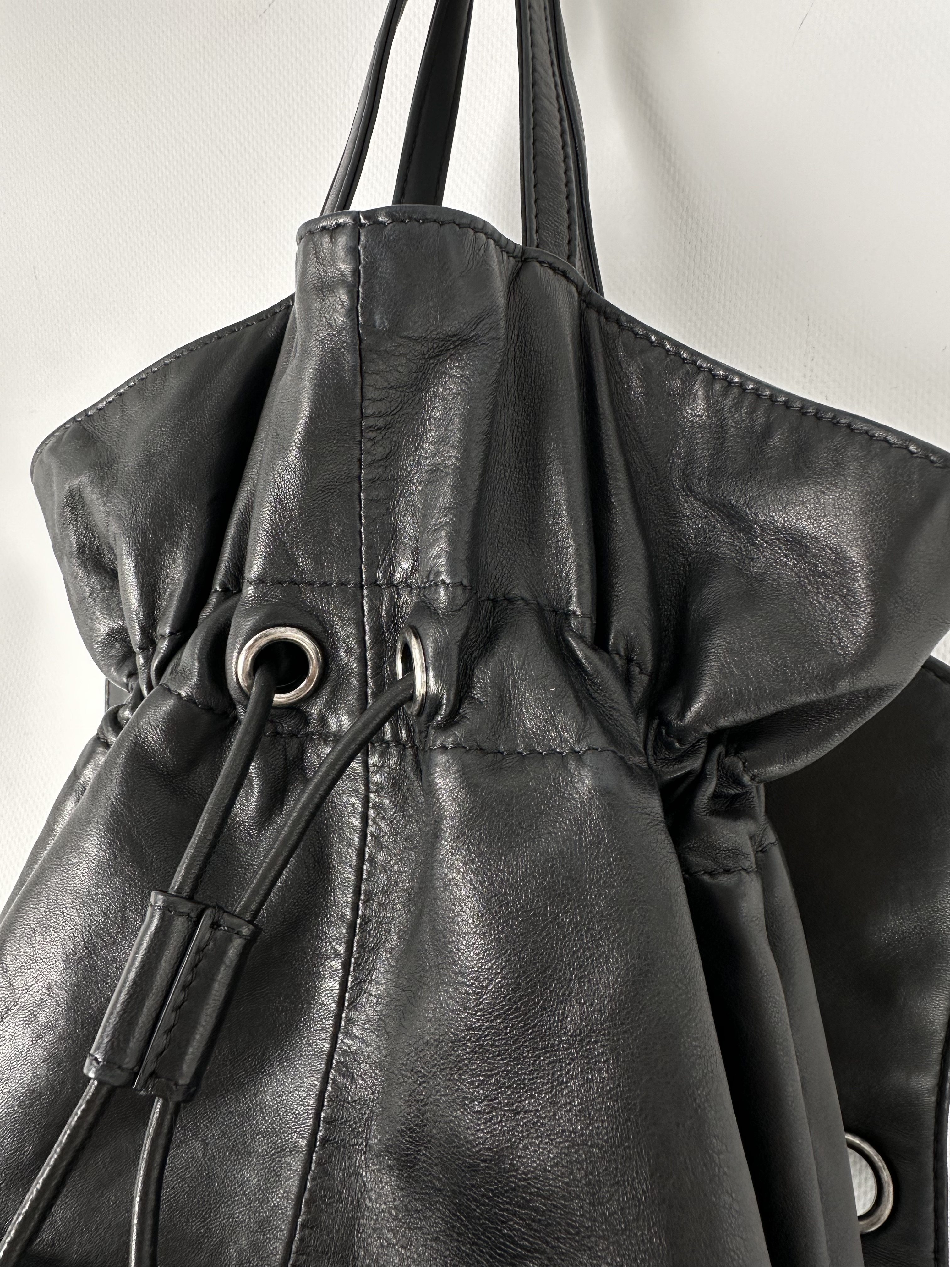 "Drawstring Shopping Bag 2014. Worek przeciwkurzowy w komplecie. Czarno torebka Chanel, delikatna skóra lamb skin, srebrno-grafitowe okucia. Torebka składa się z wbudowanego w środek worka. Posiada kartę autentyczności. Pasek regulujący był poddany naprawie. Torebka jest w bardzo dobrym stanie.