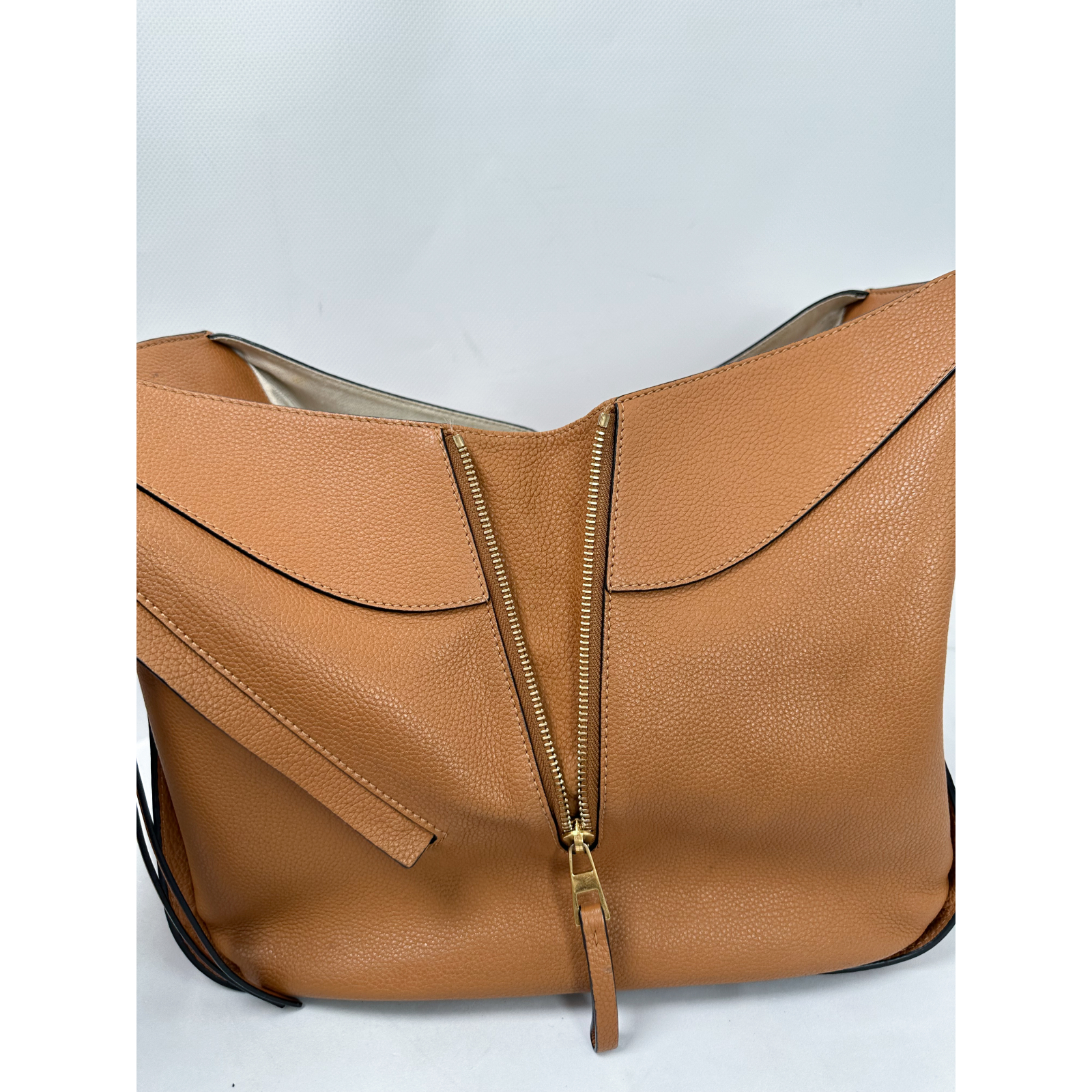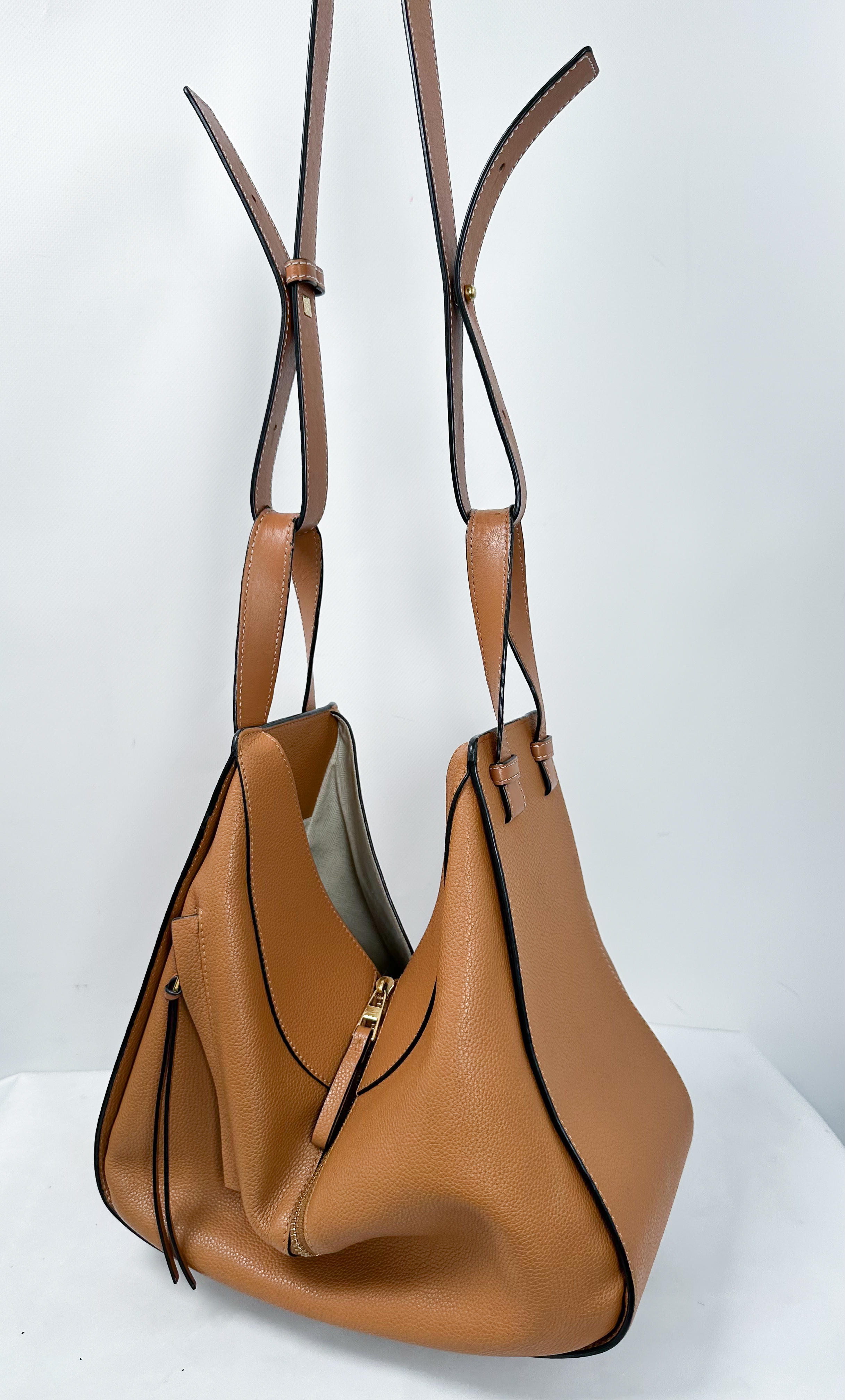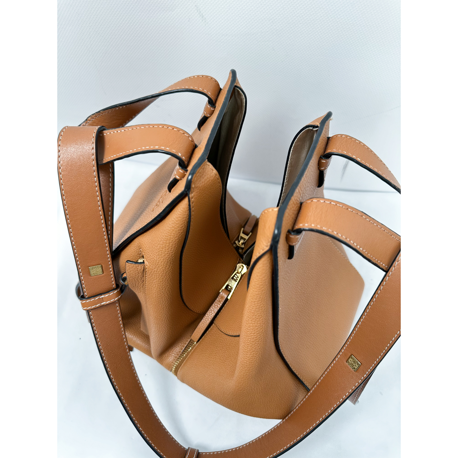 "LOEWE HAMMOCK. Brązowa skórzana torebka, złote okucia, logowanie z boku torebki, regulowany pasek, torebka posiada rozpinane zamki. Używana w bardzo dobrym stanie, rączki są delikatnie poprzecierane, podszewka torebki posiada niewielkie plamy, okucia posiadają rysy. W komplecie rachunek oraz karta. Wymiary: 25 x 26,5 x 16 cm (wys. x szer. x gł.)."