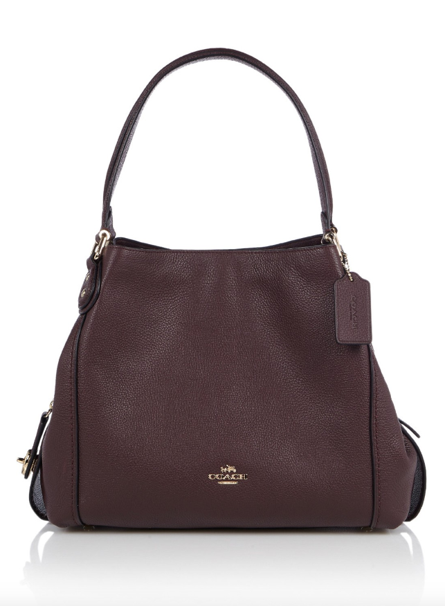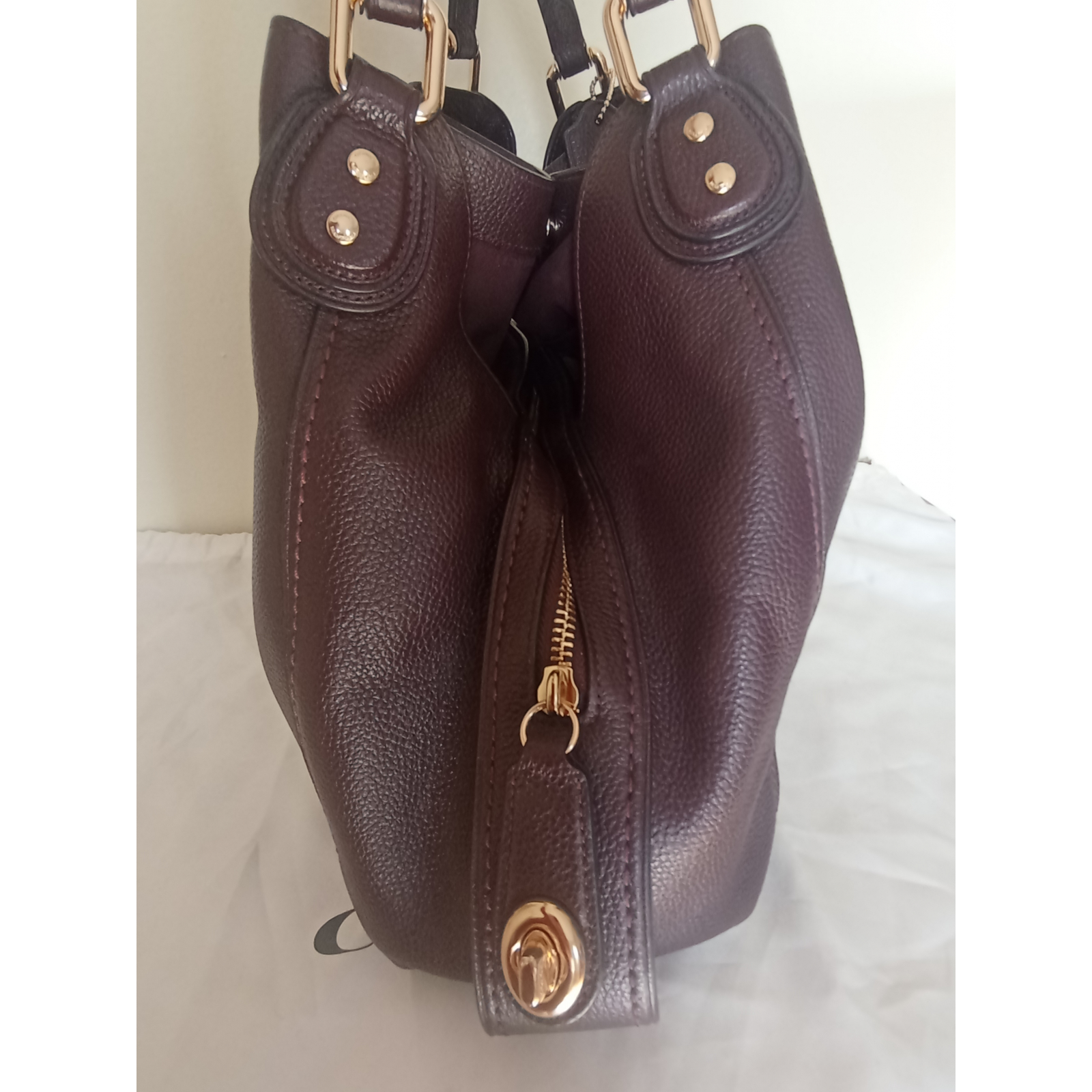 "Torebka skórzana na ramię, w kolorze burgunda z miękkiej groszkowej skóry w kształcie trapezu. Torebka posiada trzy komory, jedna zamykana na suwak, dwie boczne na magnes. Dwie kieszenie wewnątrz, jedna zamykana na suwak, skórzany certyfikat marki naszyty wewnątrz, na zewnątrz logo marki w złotym kolorze. Wszystkie metalowe okucia w złotym kolorze, na spodzie cztery metalowe nóżki.