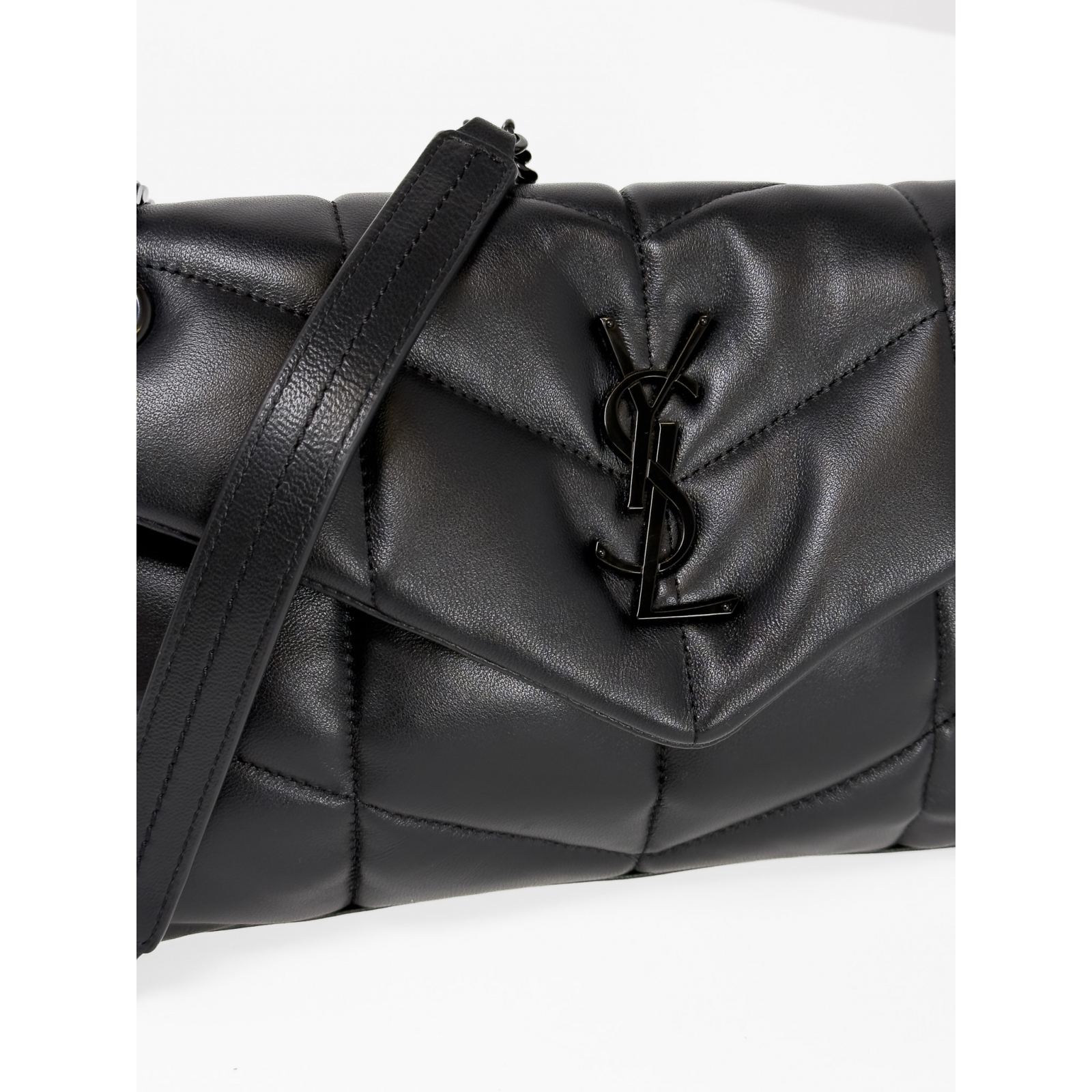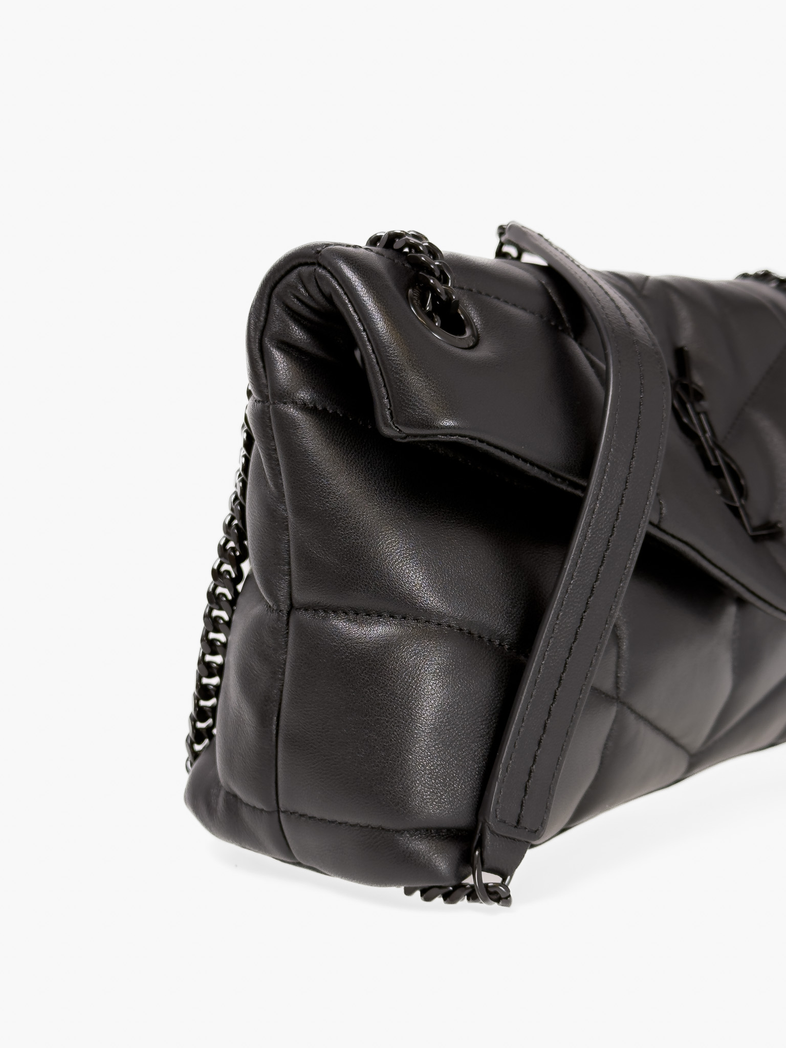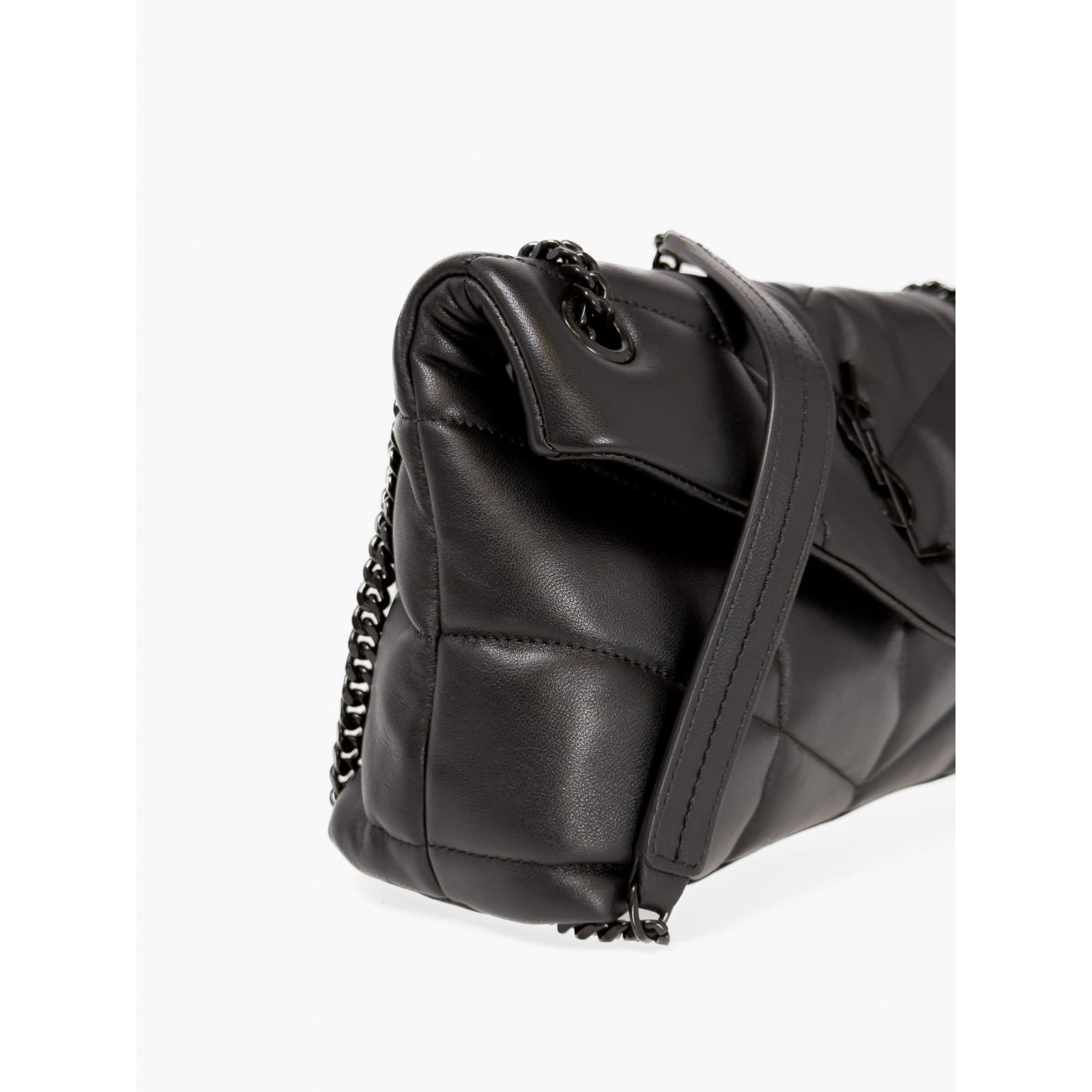 "Czarna torebka na ramię wykonana z miękkiej, pikowanej skóry, ozdobiona czarnym logo marki na klapie, zapinana na zapięcie magnetyczne, czarny łańcuchowy pasek na ramię wykończony dwoma skórzanymi wstawkami, z możliwością regulacji długości, materiałowe wnętrze, jedna komora z kieszenią, w zestawie z workiem przeciwkurzowym. Stan idealny. Wymiary: szerokość 29cm, wysokość 17cm, głębokość 9cm. Model: Loulou small quilted leather shoulder bag."