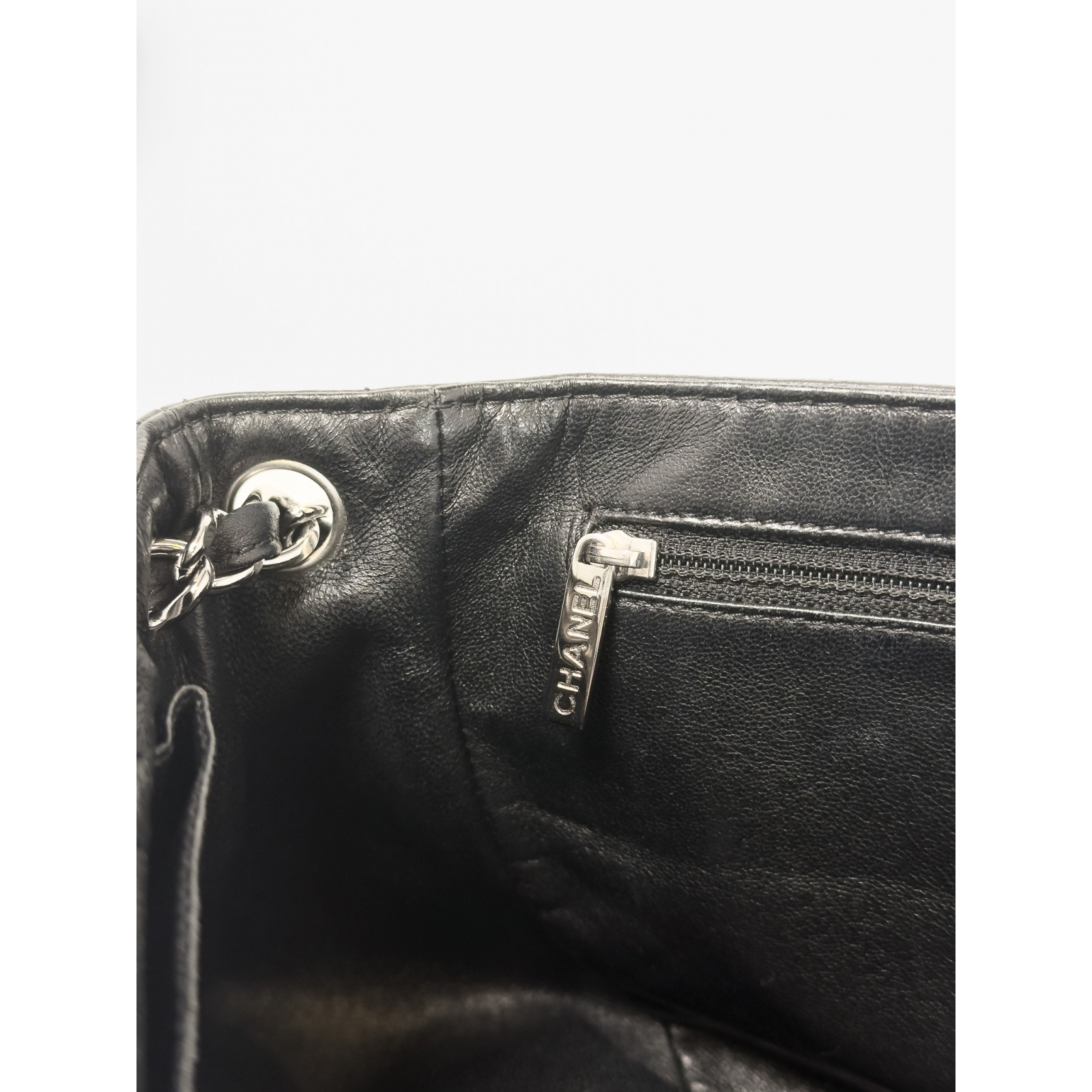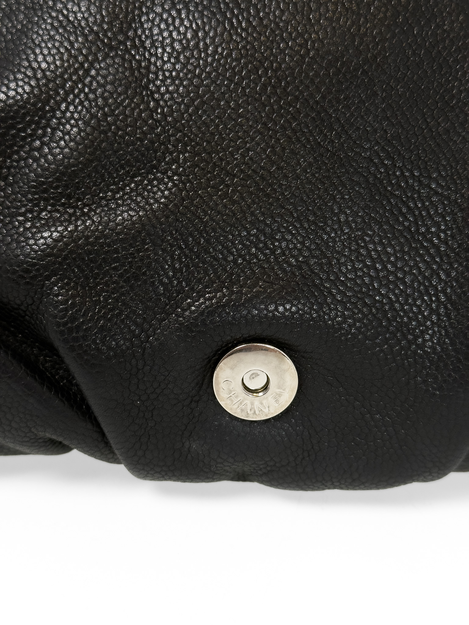 "Czarna skórzana torebka wykończona diamentowym przeszyciem oraz dużym logo marki na klapie, łańcuchowy regulowany pasek na ramię wykończony skórą, zaokrąglony kształt, miejscami marszczona skóra, srebrne okucia, zapinana na zatrzask magnetyczny, jedna komora z dwoma kieszeniami wewnątrz. Stan bardzo dobry, posiada delikatne ślady użytkowania wewnątrz. Wymiary: szerokość 40cm, wysokość 15cm, głębokość 12cm."