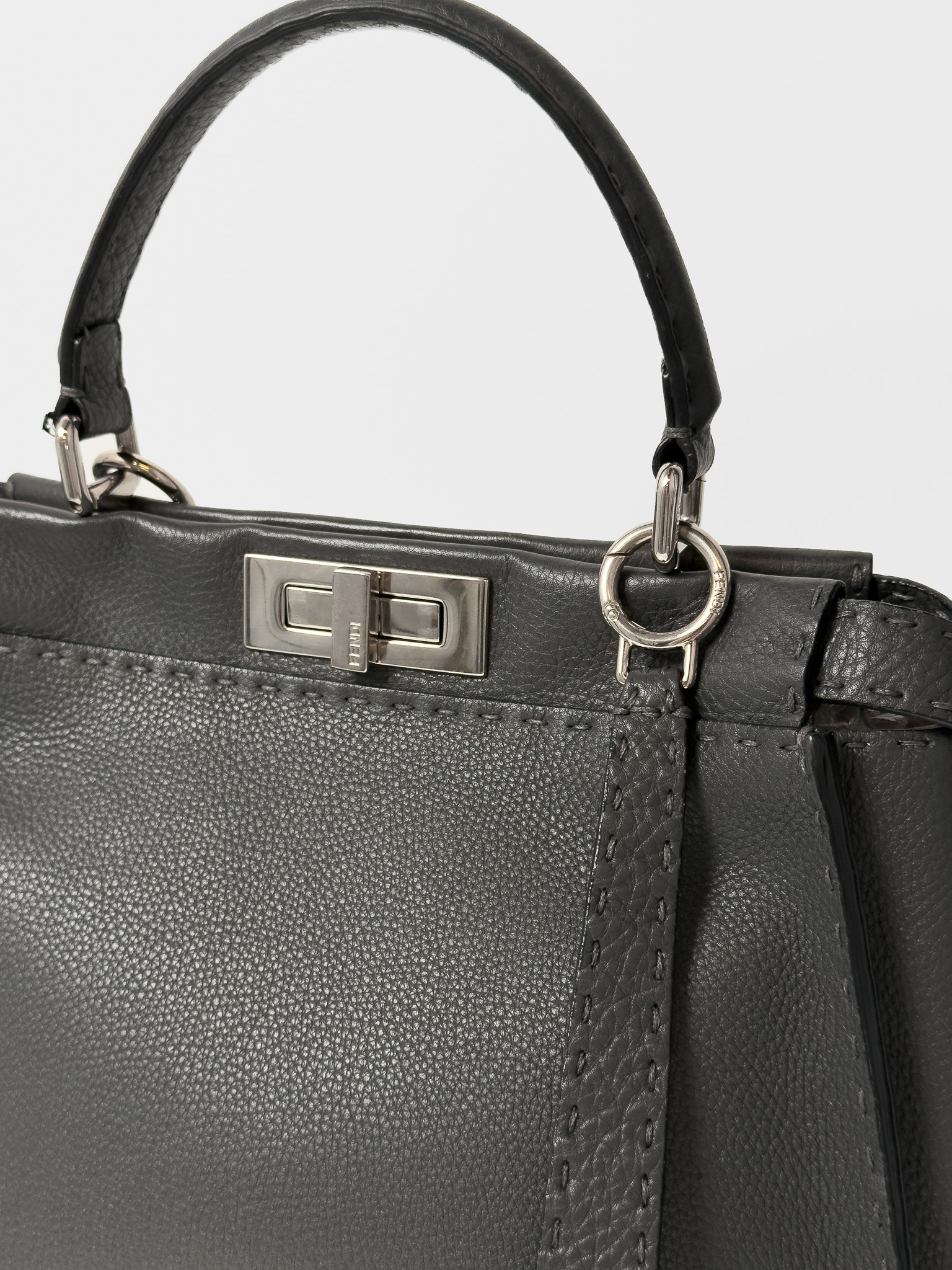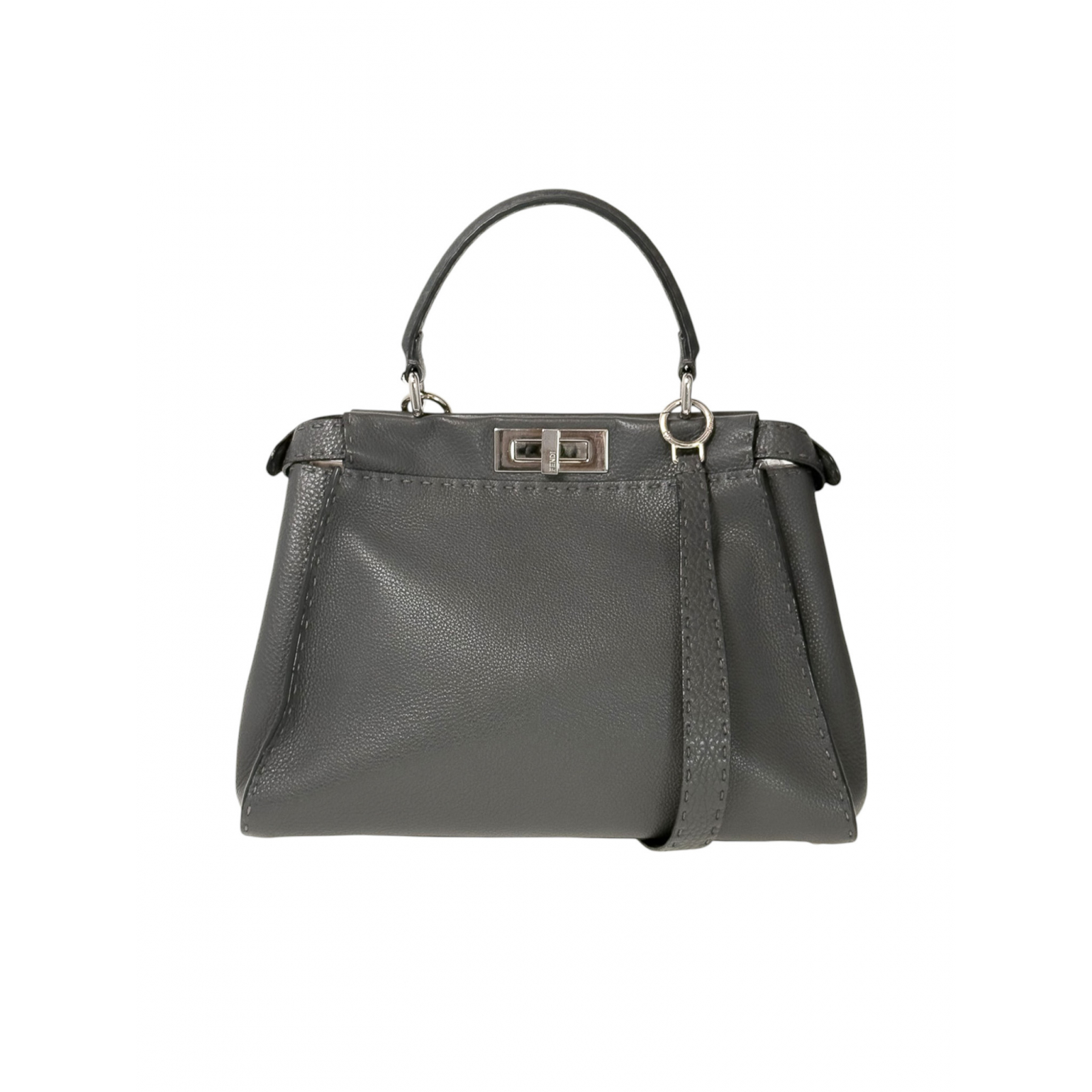 "Skórzana torebka do ręki/ na ramię w kolorze grafitowym, groszkowa skóra, wykończona stębnowaniem, dwa przekręcane srebrne logowane zapięcia po bokach, długi odpinany regulowany pasek na ramię, rączka w górnej części, dwie przegrody, mała kieszonka w środku zapinana na suwak, kremowe wnętrze, pięć nóżek od spodu. Stan bardzo dobry, posiada rysy na metalowych elementach, lekkie zabrudzenia wewnątrz, delikatne przetarcie przy jednym rogu. Wymiary: szerokość 34cm, wysokość 25cm, głębokość 14cm."