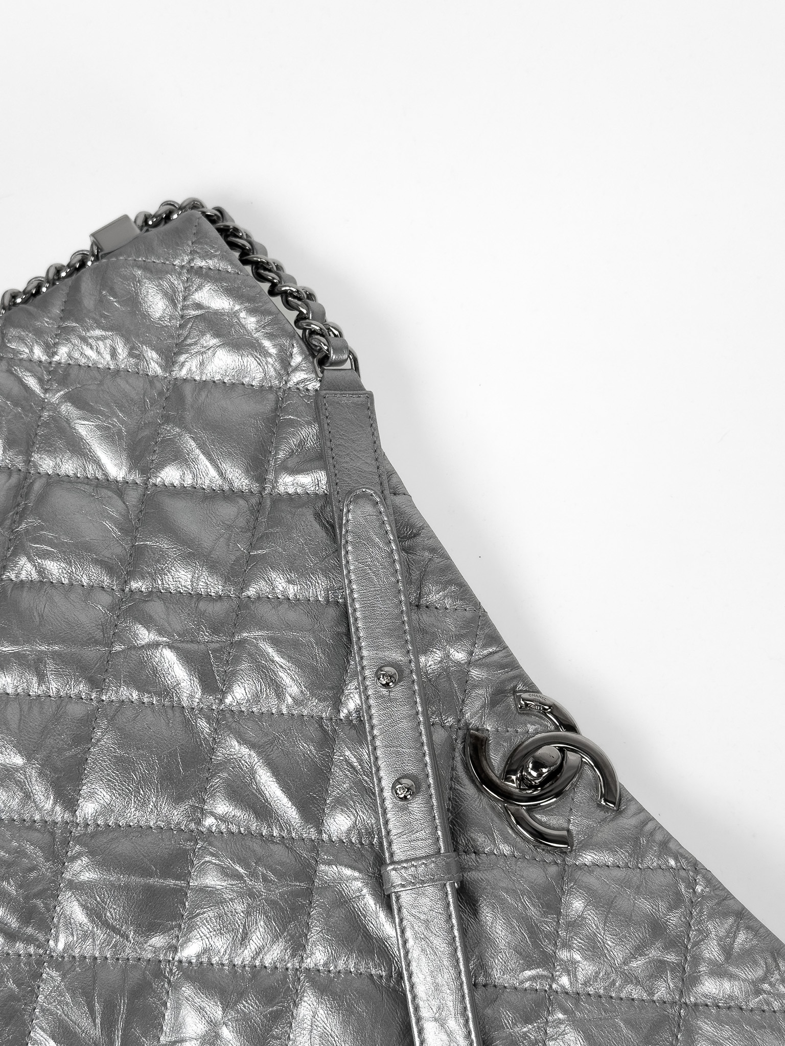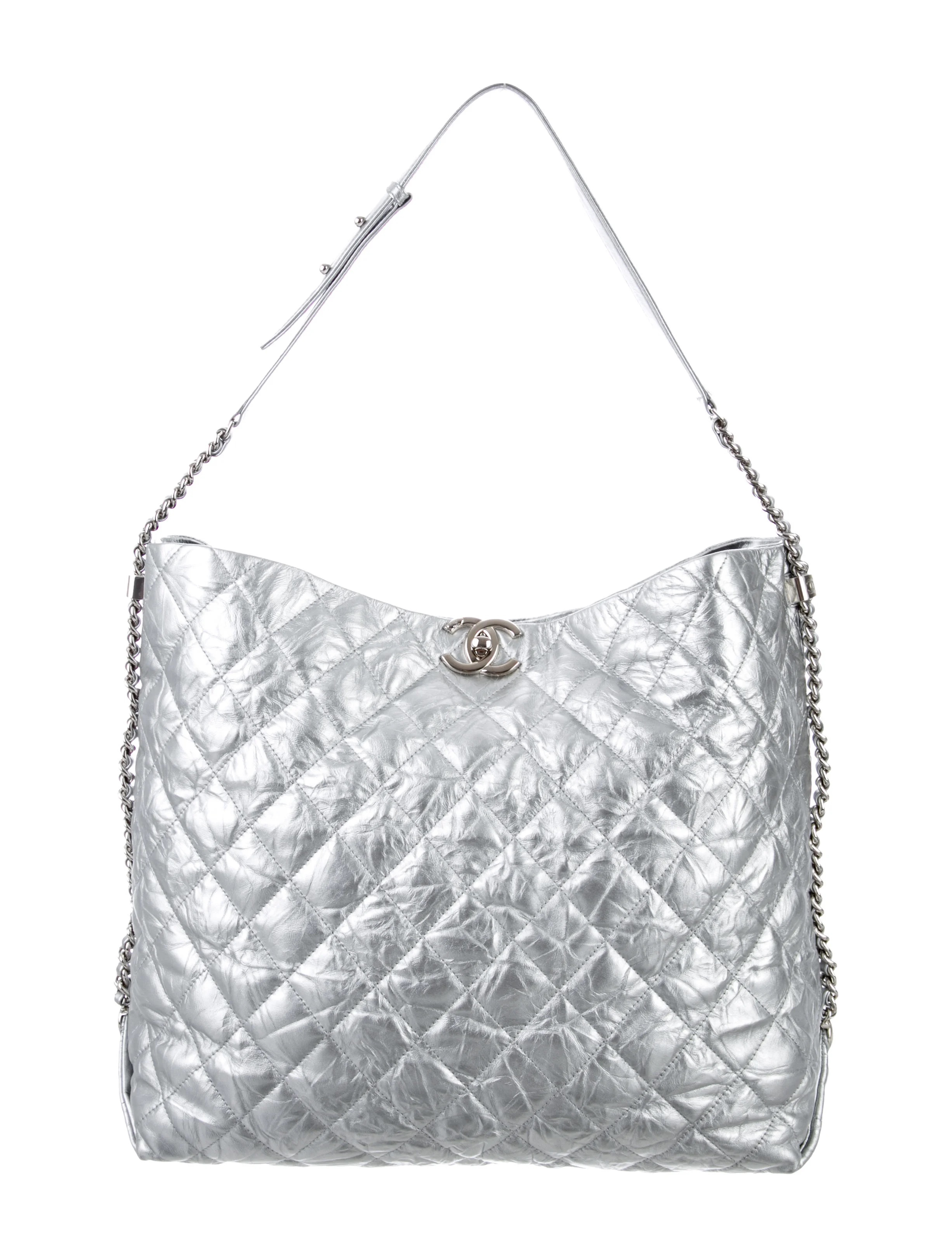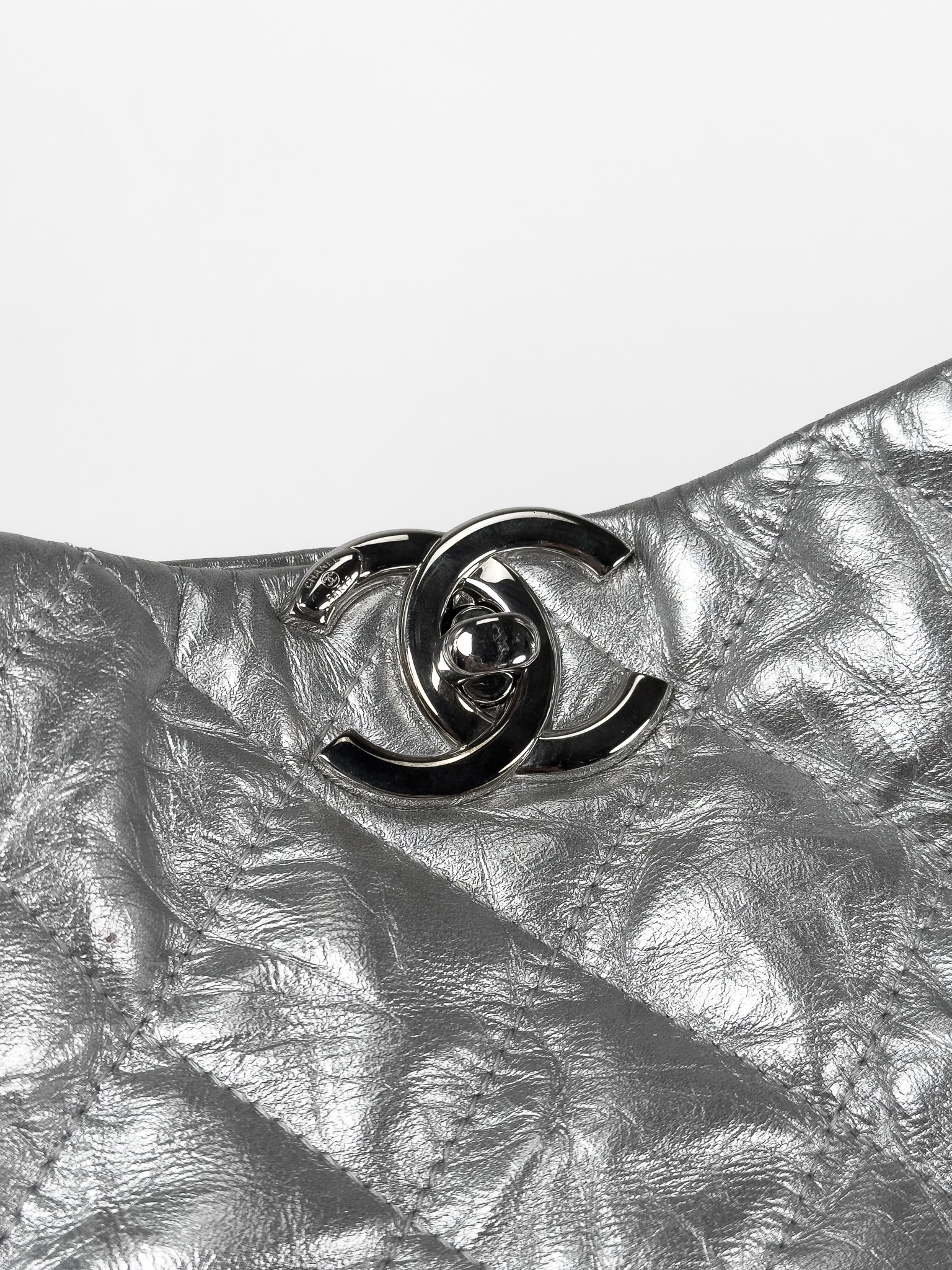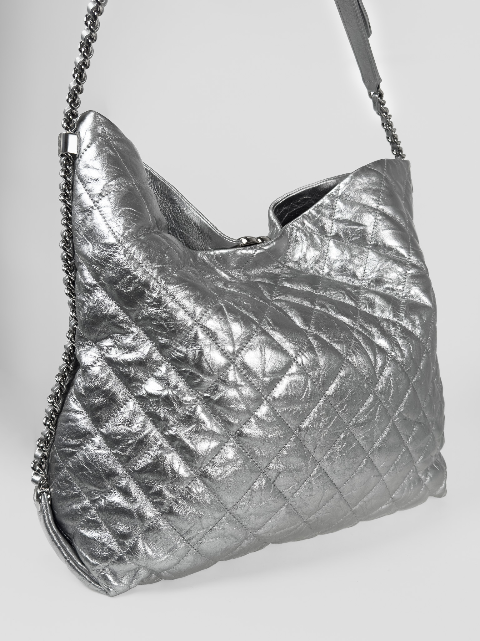 "Model: big bang hobo. Srebrna skórzana torebka, większy format typu worek, ozdobiona łańcuchem, zapinana na logo marki. Posiada regulowany pasek. Stan: bardzo dobry. Wymiary: szerokość 49cm, wysokość 38cm, głębokość 13cm."