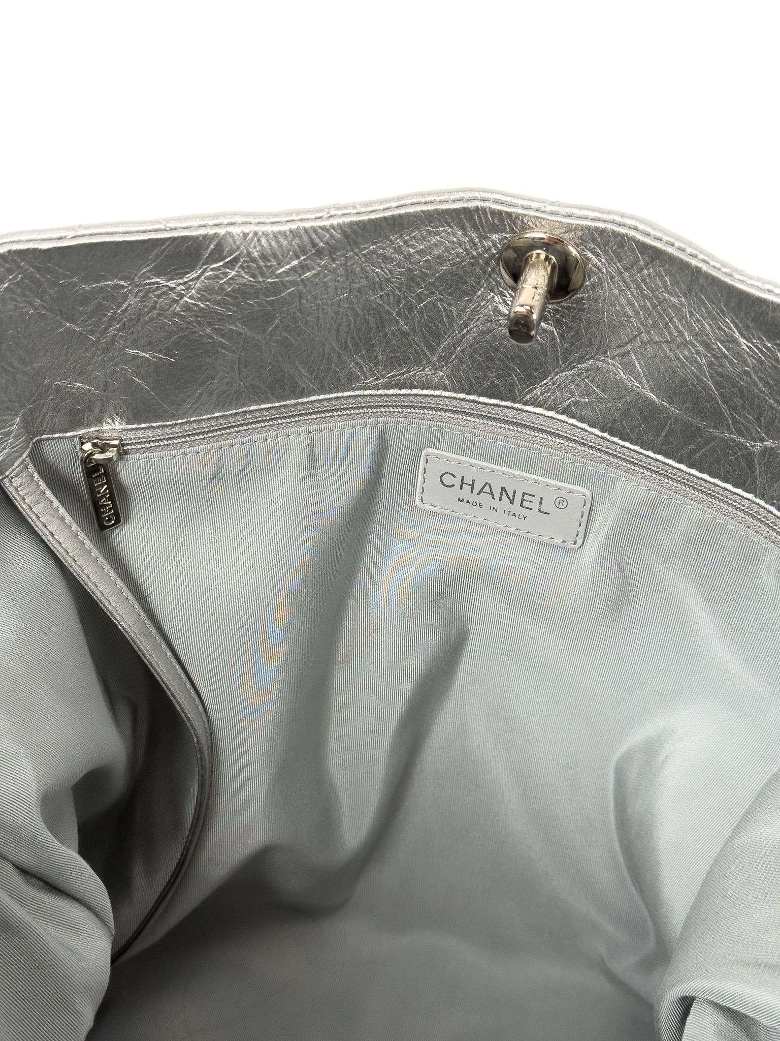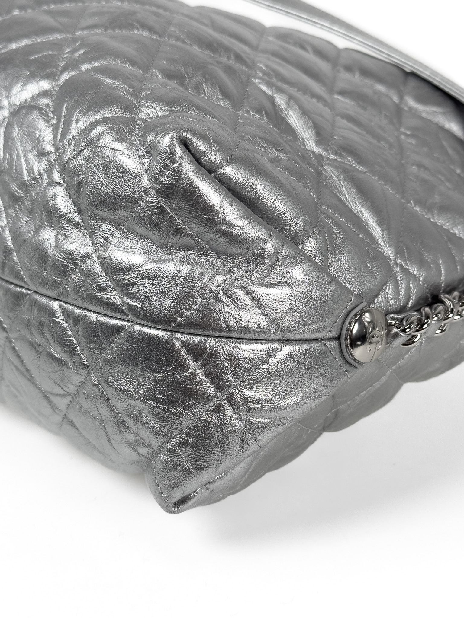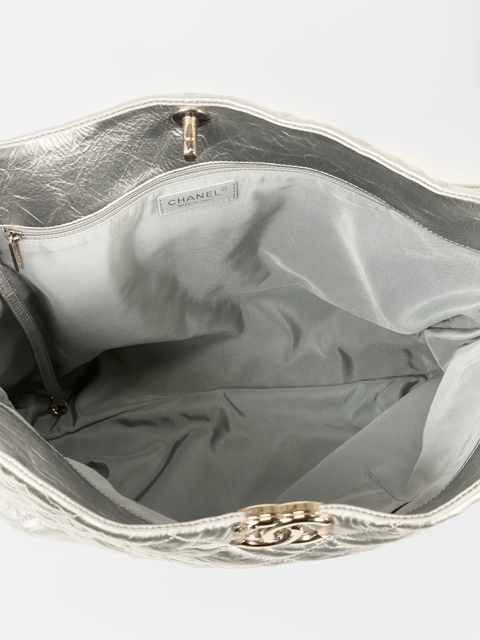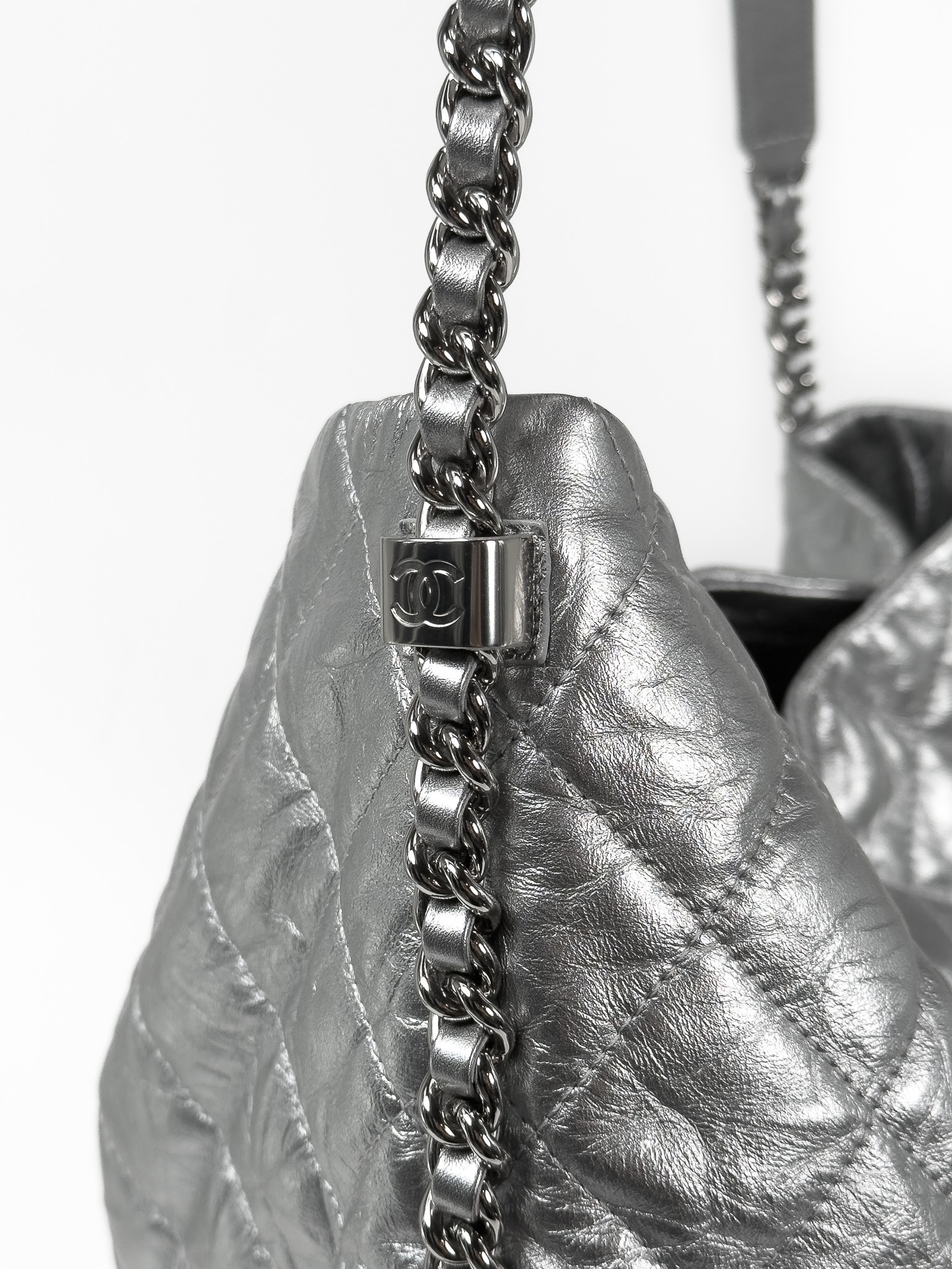 "Model: big bang hobo. Srebrna skórzana torebka, większy format typu worek, ozdobiona łańcuchem, zapinana na logo marki. Posiada regulowany pasek. Stan: bardzo dobry. Wymiary: szerokość 49cm, wysokość 38cm, głębokość 13cm."