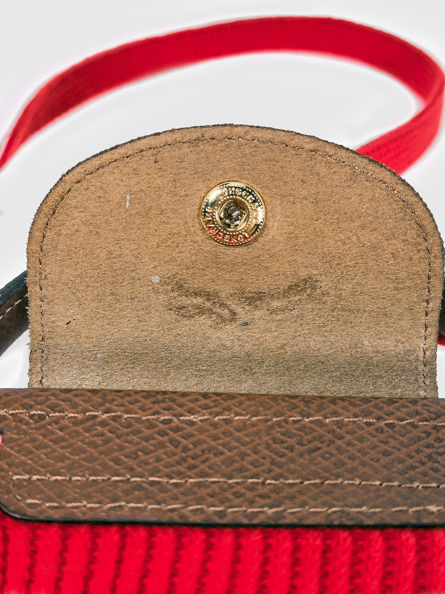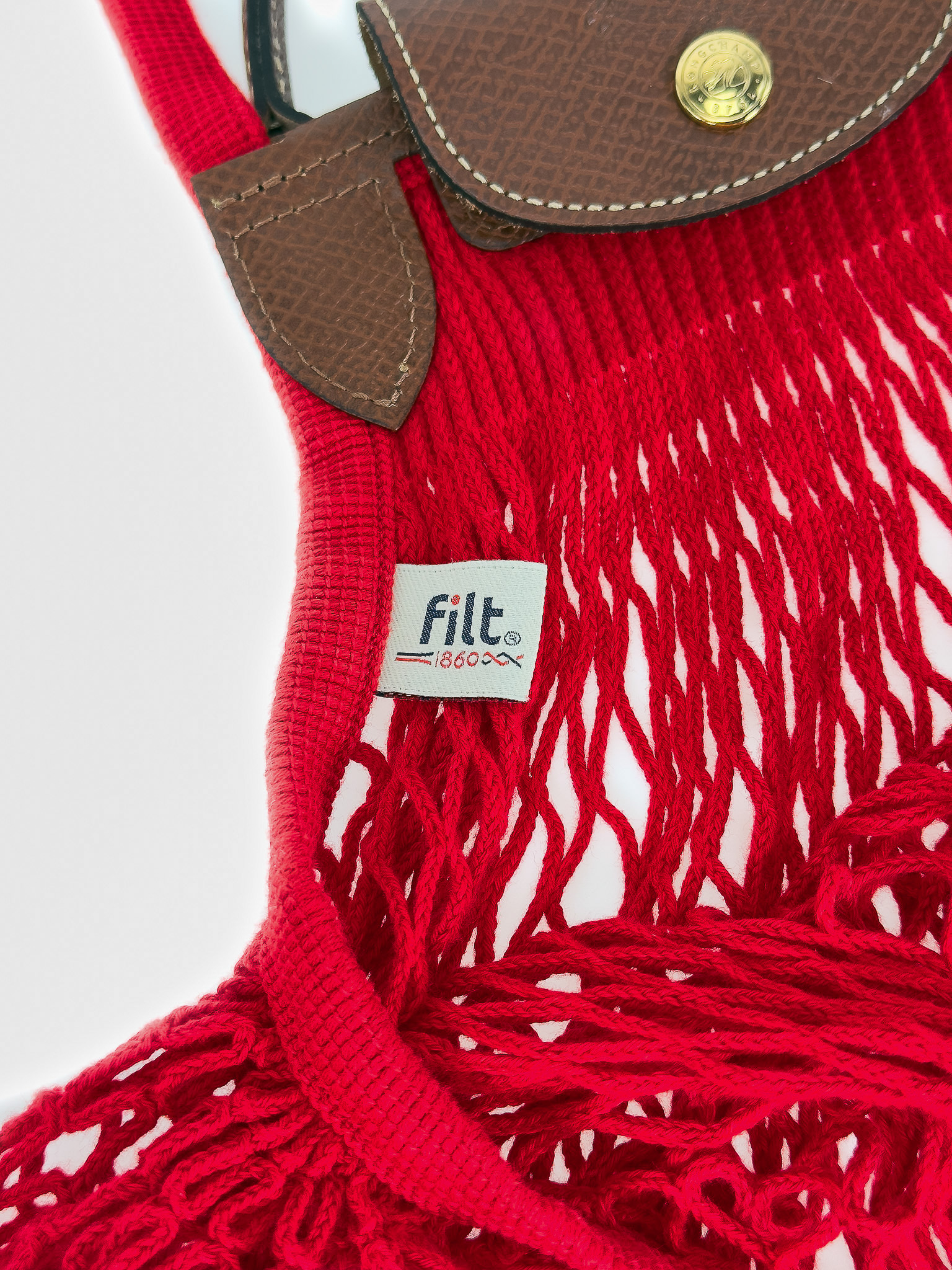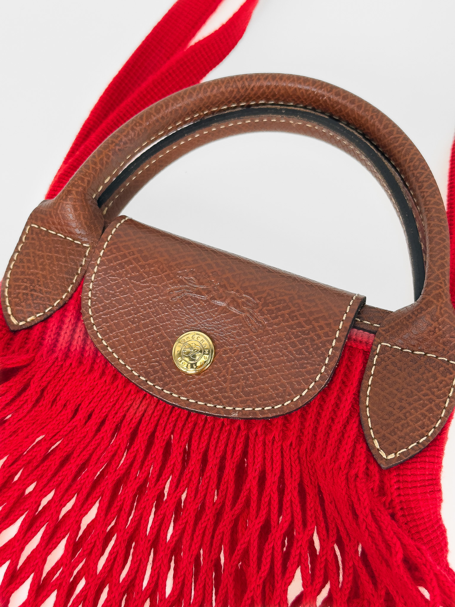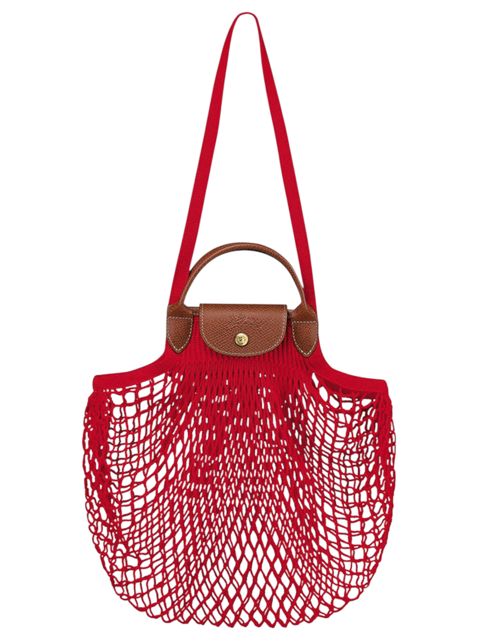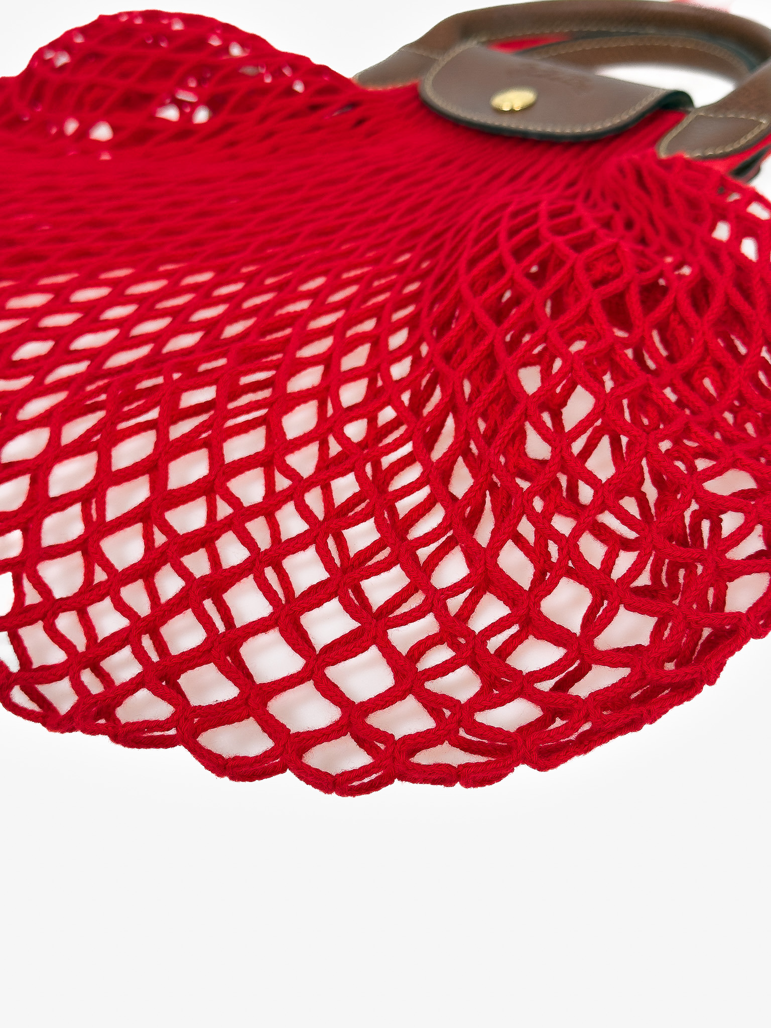 "Model: Le Pliage; Czerwona pleciona torebka do ręki/ na ramię, ażurowa, dwa skórzane brązowe chwyty do ręki, zapinana na złoty logowany zatrzask. Stan bardzo dobry. Wymiary: szerokość 44cm, wysokość 33cm."