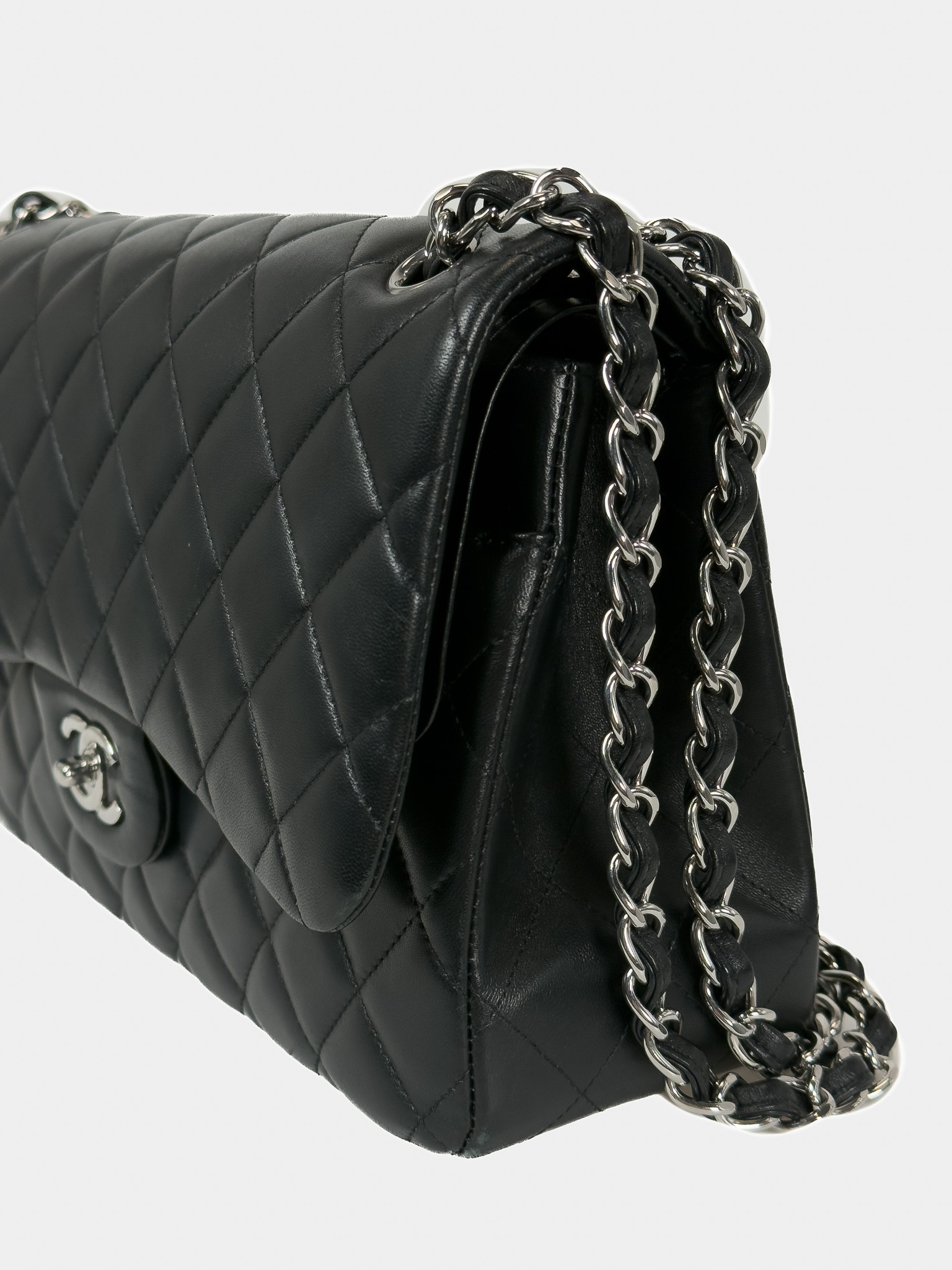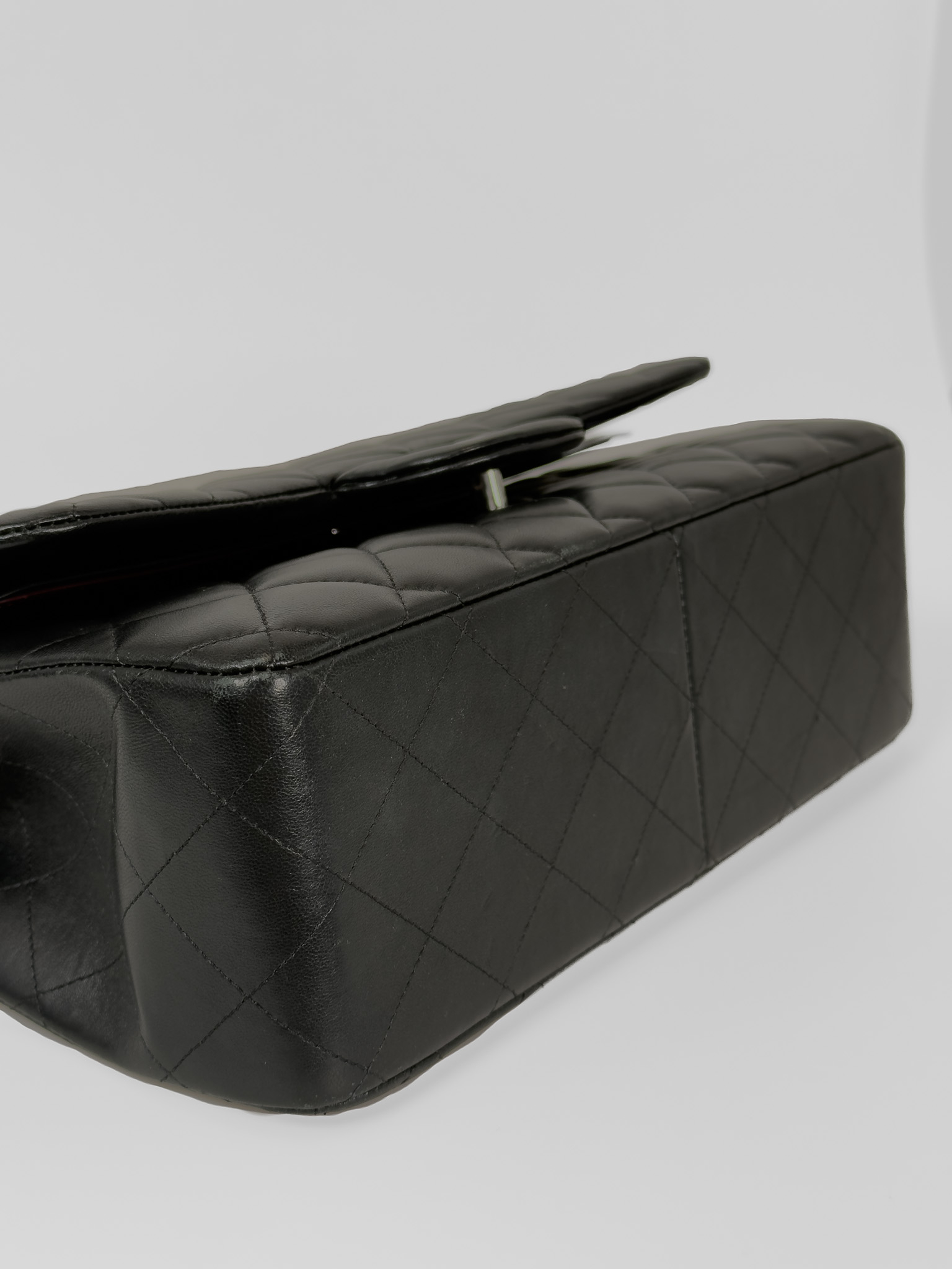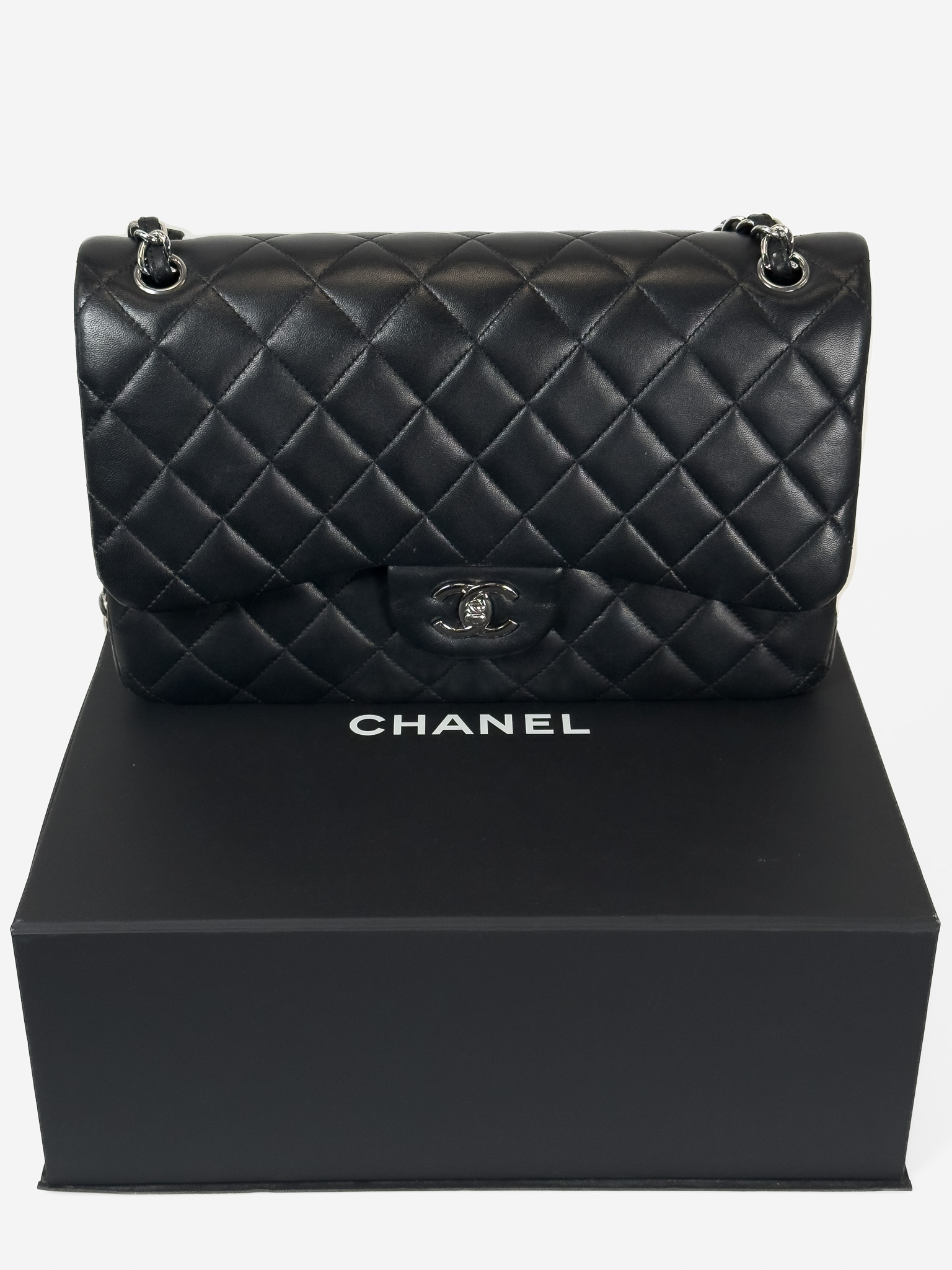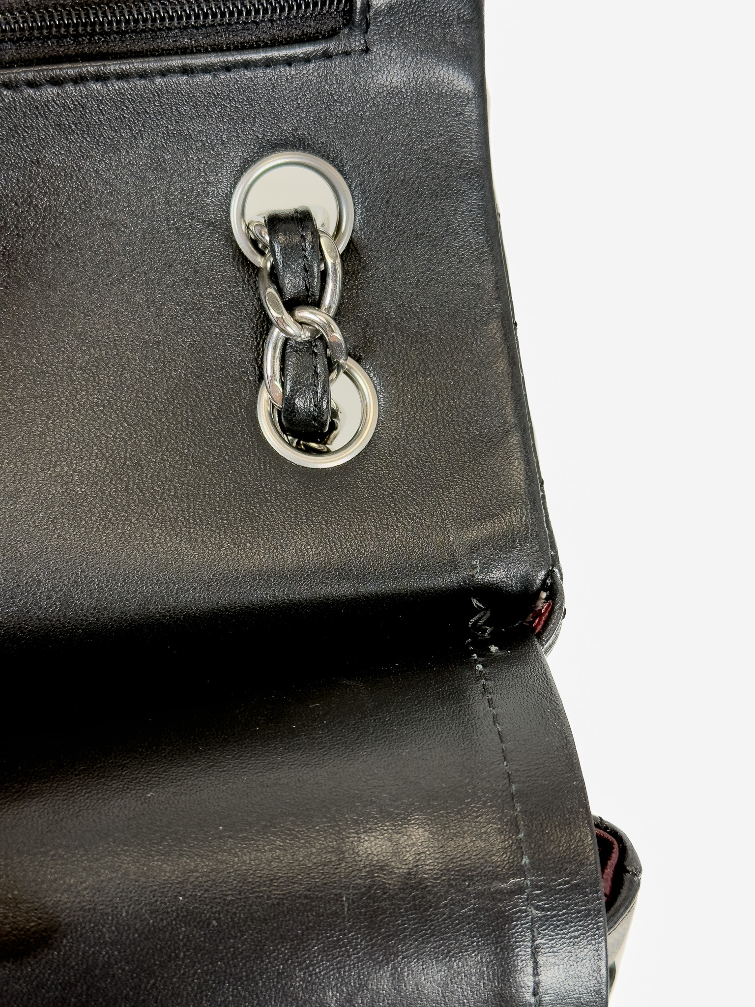"model: Flap. Czarna skórzana pikowana diamentowo torebka, srebrne zapięcie z logo marki na przodzie, długi pasek na ramię ozdobiony srebrnym łańcuchem, kieszeń pod klapą oraz w tylnej części, dwie komory, bordowe wnętrze, w zestawie z pudełkiem, workiem przeciwkurzowym oraz rachunkiem z karty. Stan bardzo dobry, posiada przetarte rogi oraz zarysowania w podstawie, po prawej stronie od wewnątrz odprucie w rogu. Wymiary: szerokość 30cm, wysokość 19cm, głębokość 9cm."