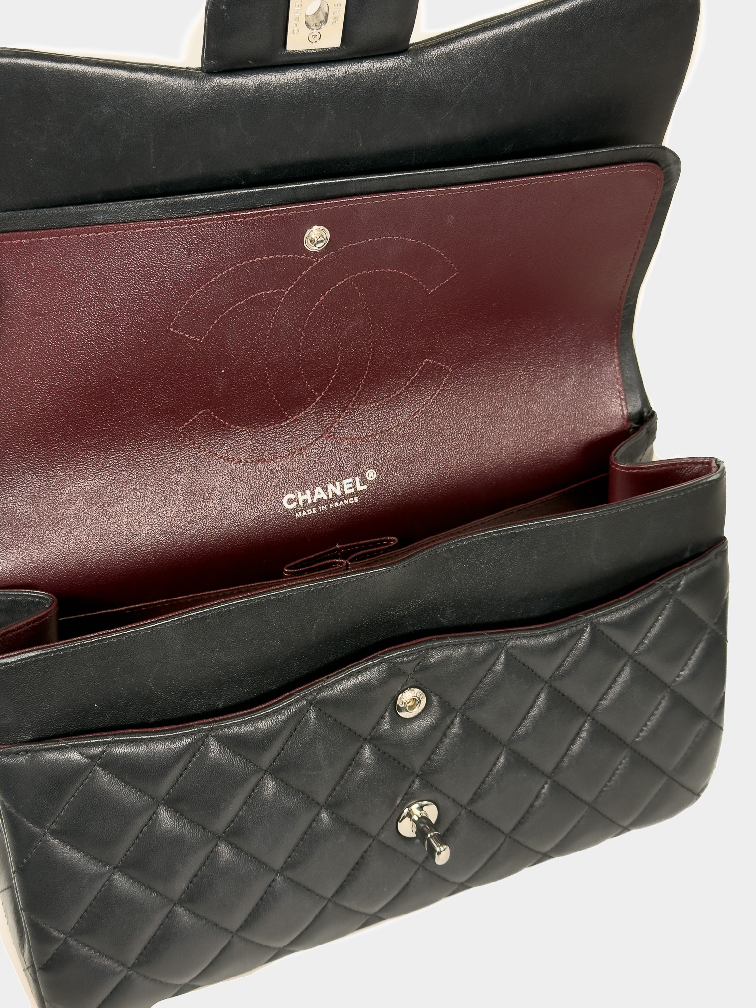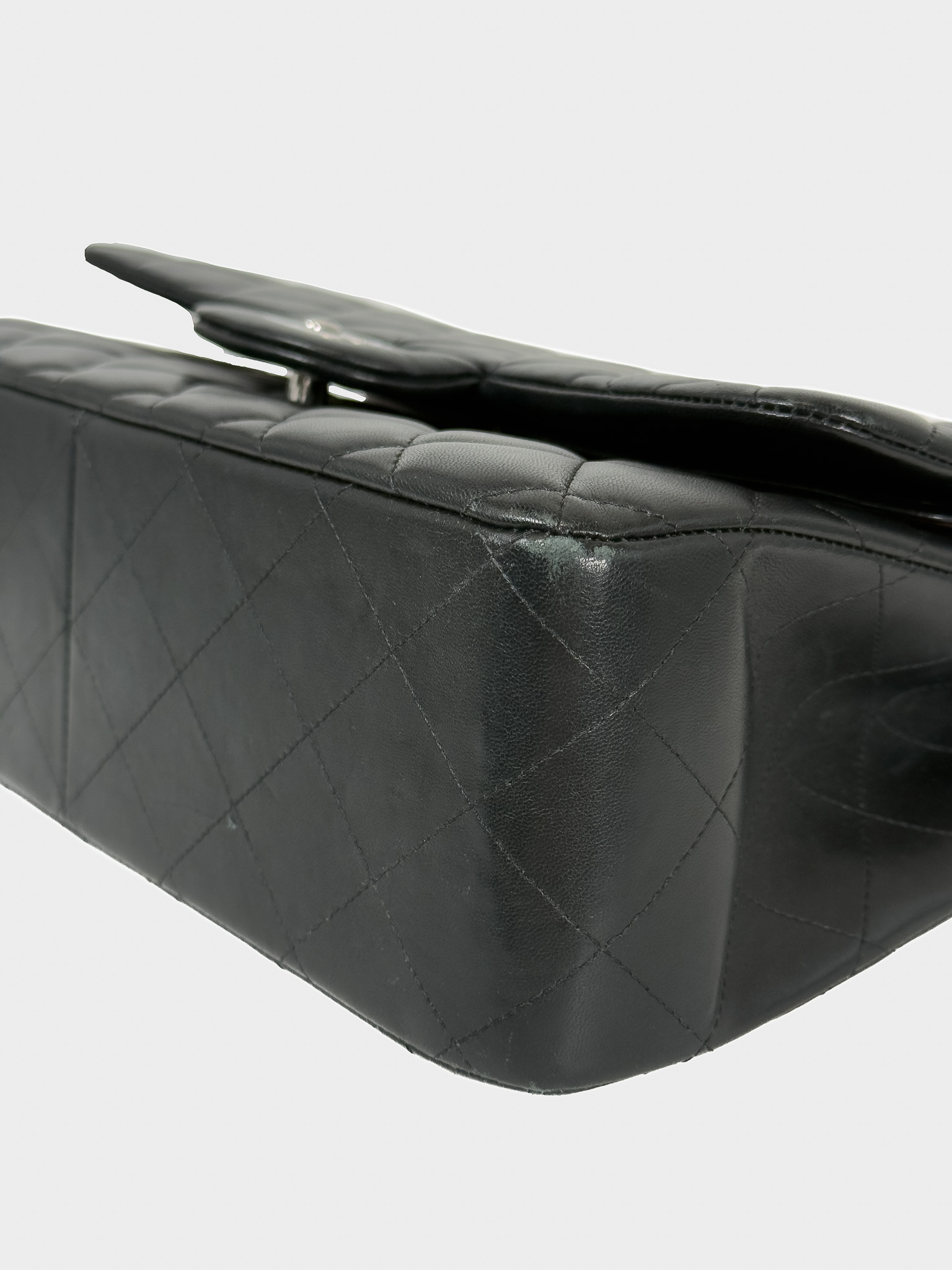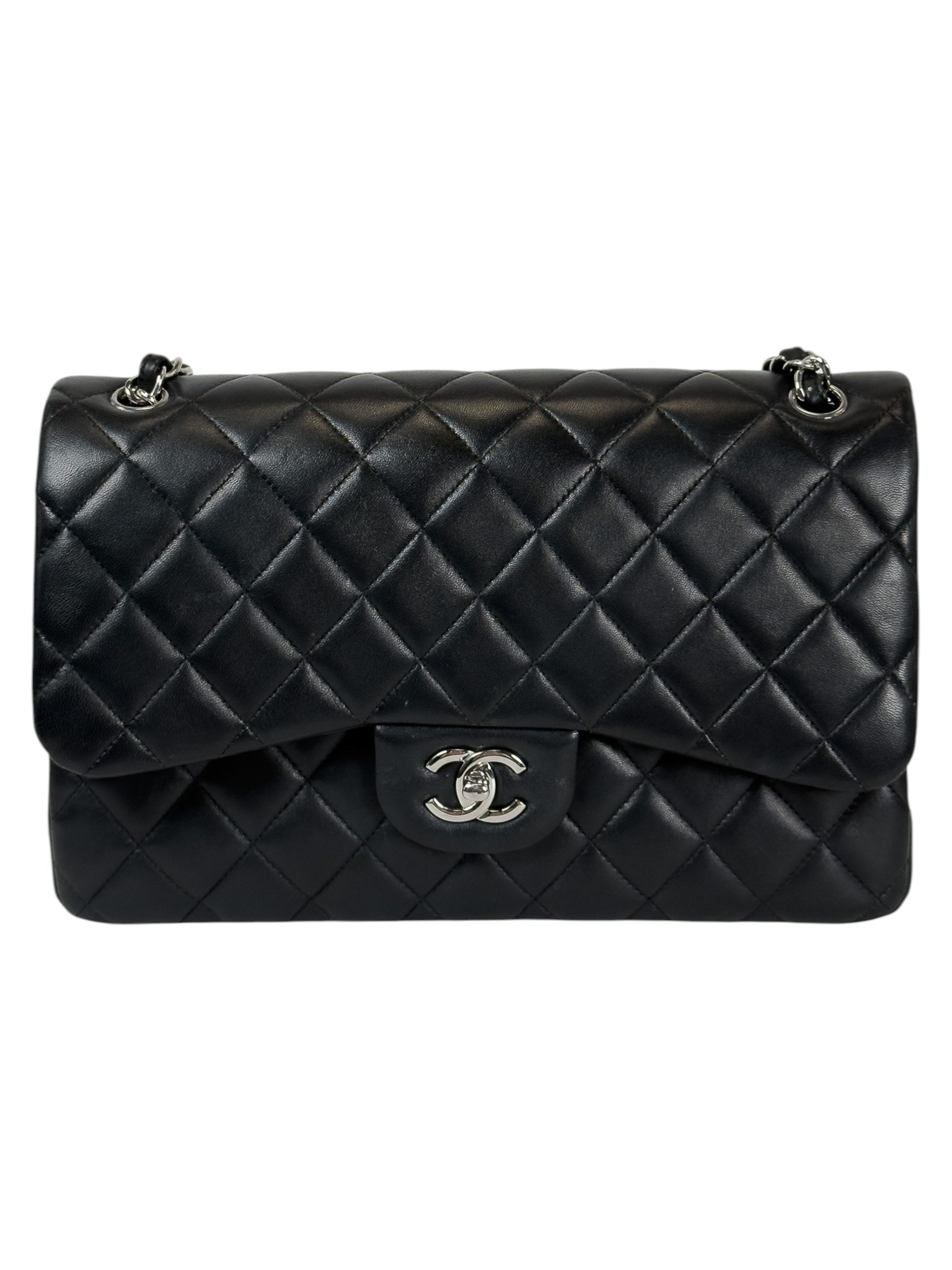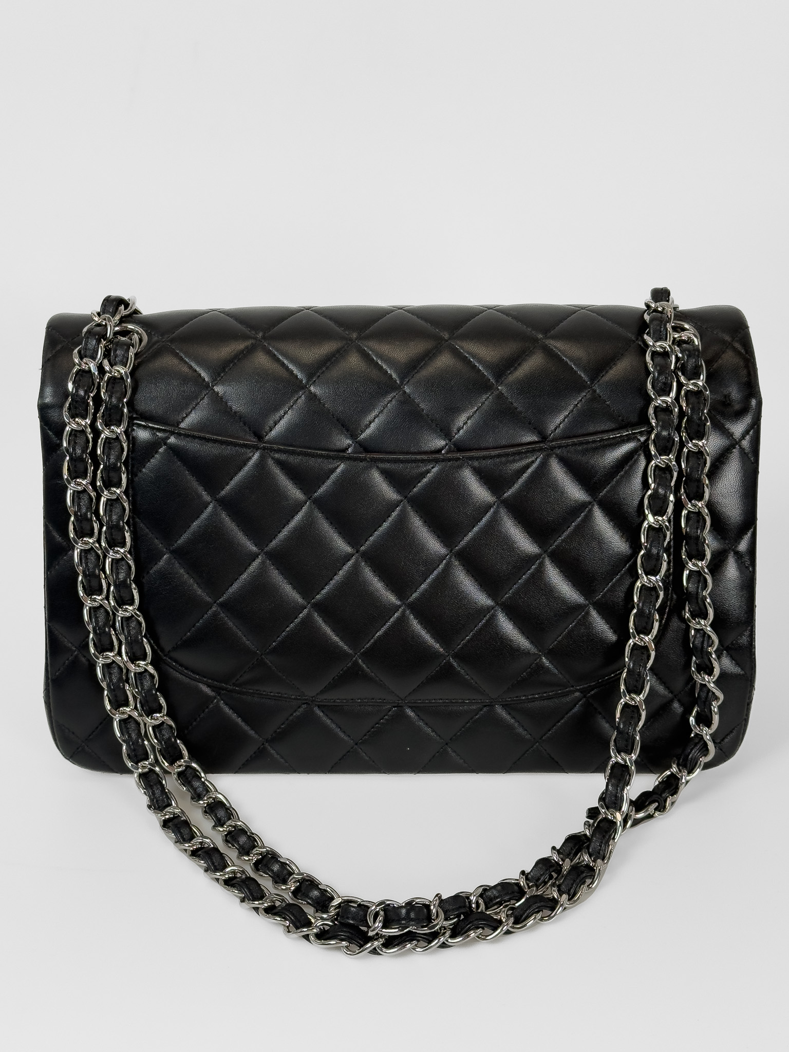 "model: Flap. Czarna skórzana pikowana diamentowo torebka, srebrne zapięcie z logo marki na przodzie, długi pasek na ramię ozdobiony srebrnym łańcuchem, kieszeń pod klapą oraz w tylnej części, dwie komory, bordowe wnętrze, w zestawie z pudełkiem, workiem przeciwkurzowym oraz rachunkiem z karty. Stan bardzo dobry, posiada przetarte rogi oraz zarysowania w podstawie, po prawej stronie od wewnątrz odprucie w rogu. Wymiary: szerokość 30cm, wysokość 19cm, głębokość 9cm."
