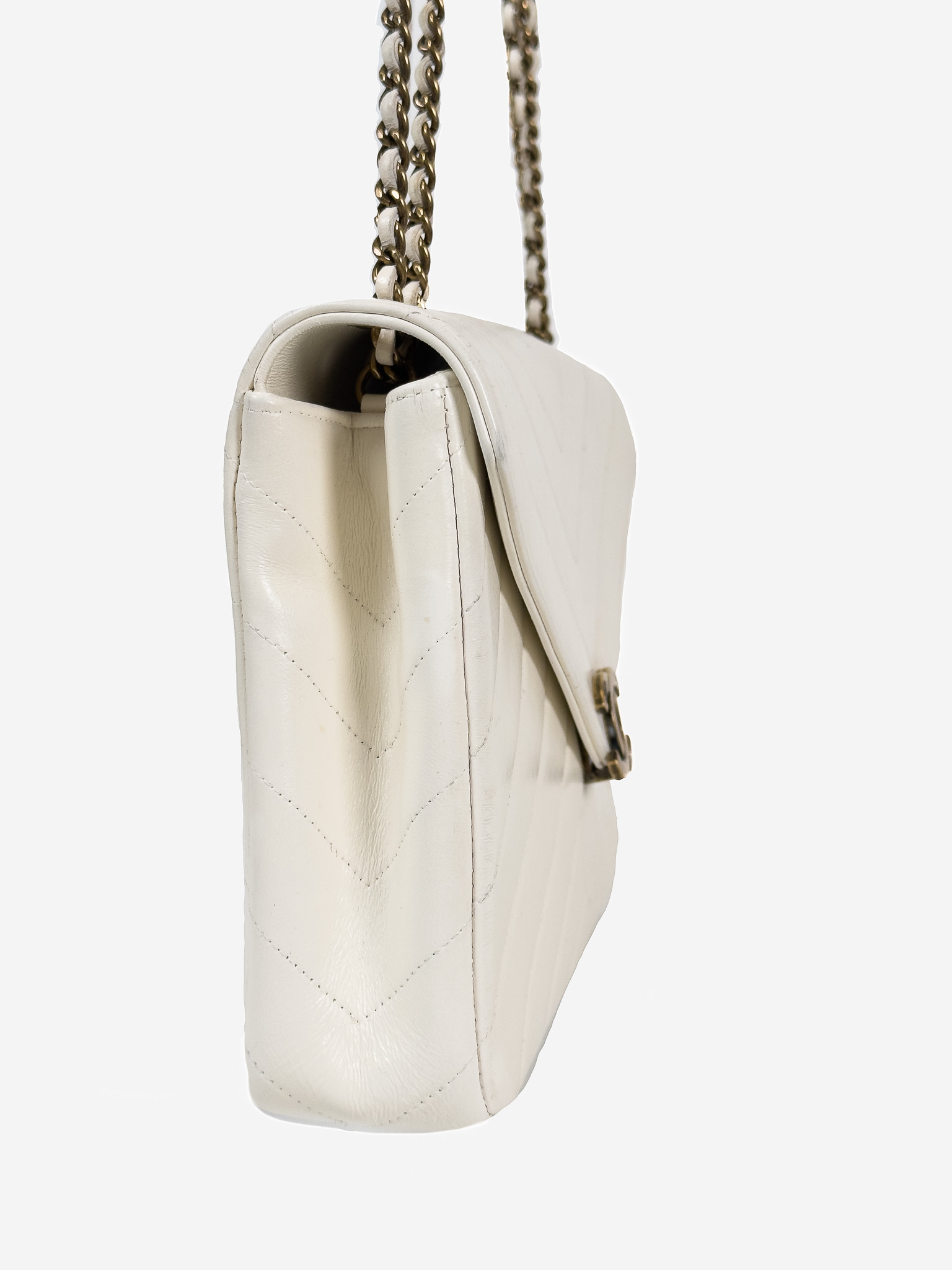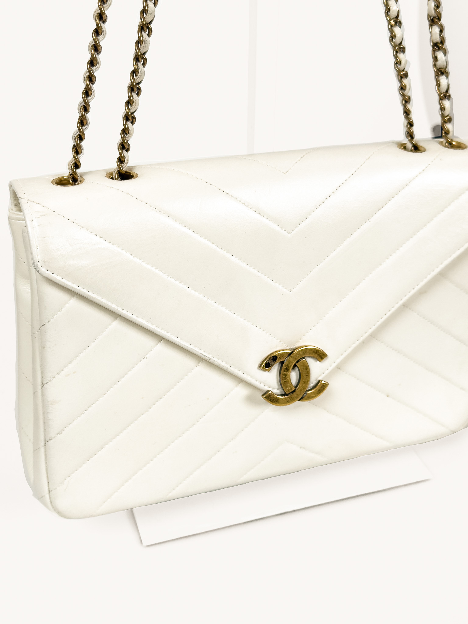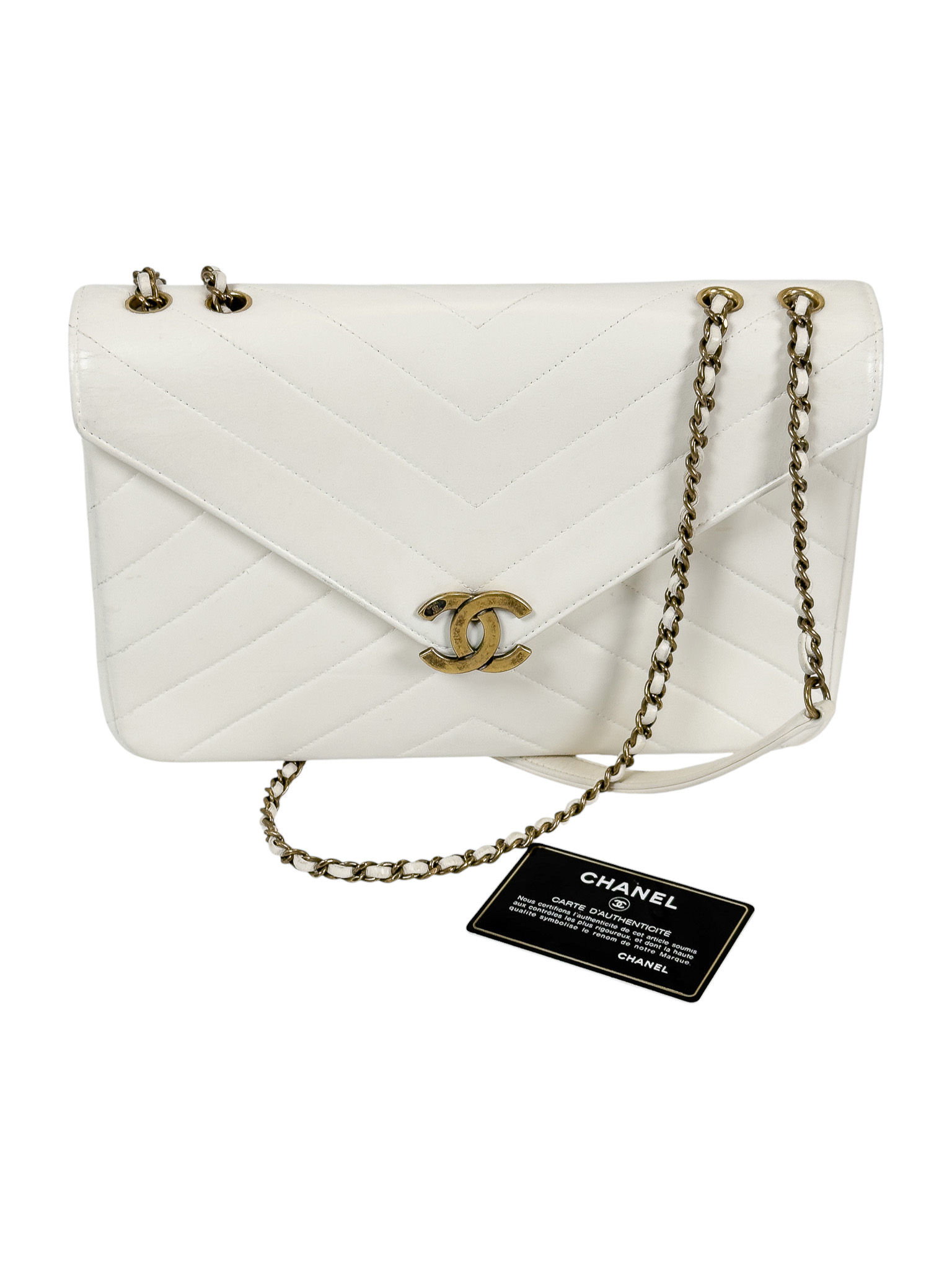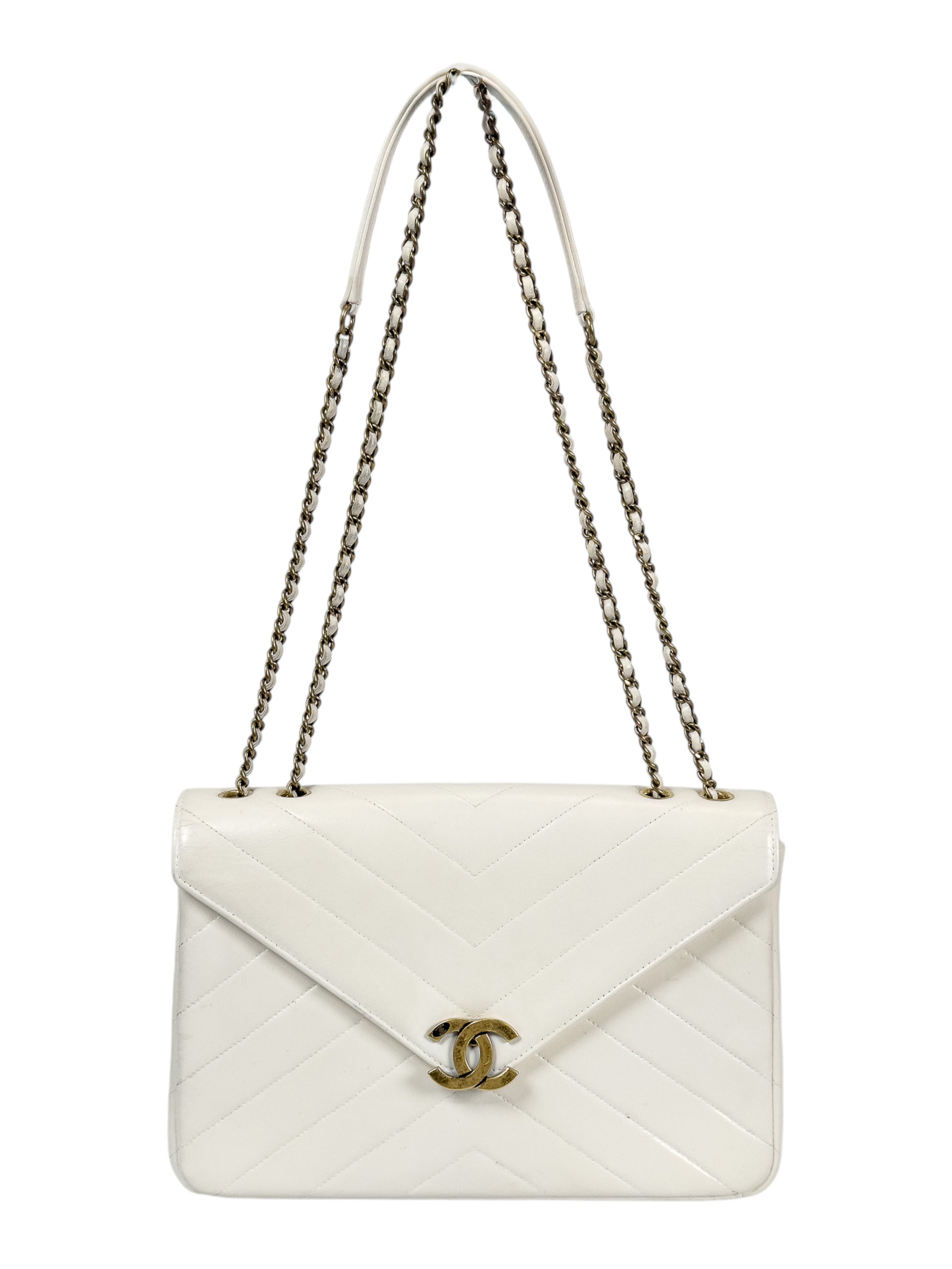 "model Chevron Coco Envelope Flapj Jasnokremowa torebka, gładka skóra jagnięca, pikowana w jodełkę z przeplatanym łańcuszkiem łańcuszkiem ze starego złota. Nosi ślady użytkowania, małe przetarcia na skórze, drobne zarysowania, wewnątrz kieszonka na zamek, oraz mniejsza na karty. Stan bardzo dobry. W zestawie z pudełkiem oraz woreczkiem przeciwkurzowym. Wymiary: wysokość 27 cm, szerokość 19 cm, głębokość 6 cm."