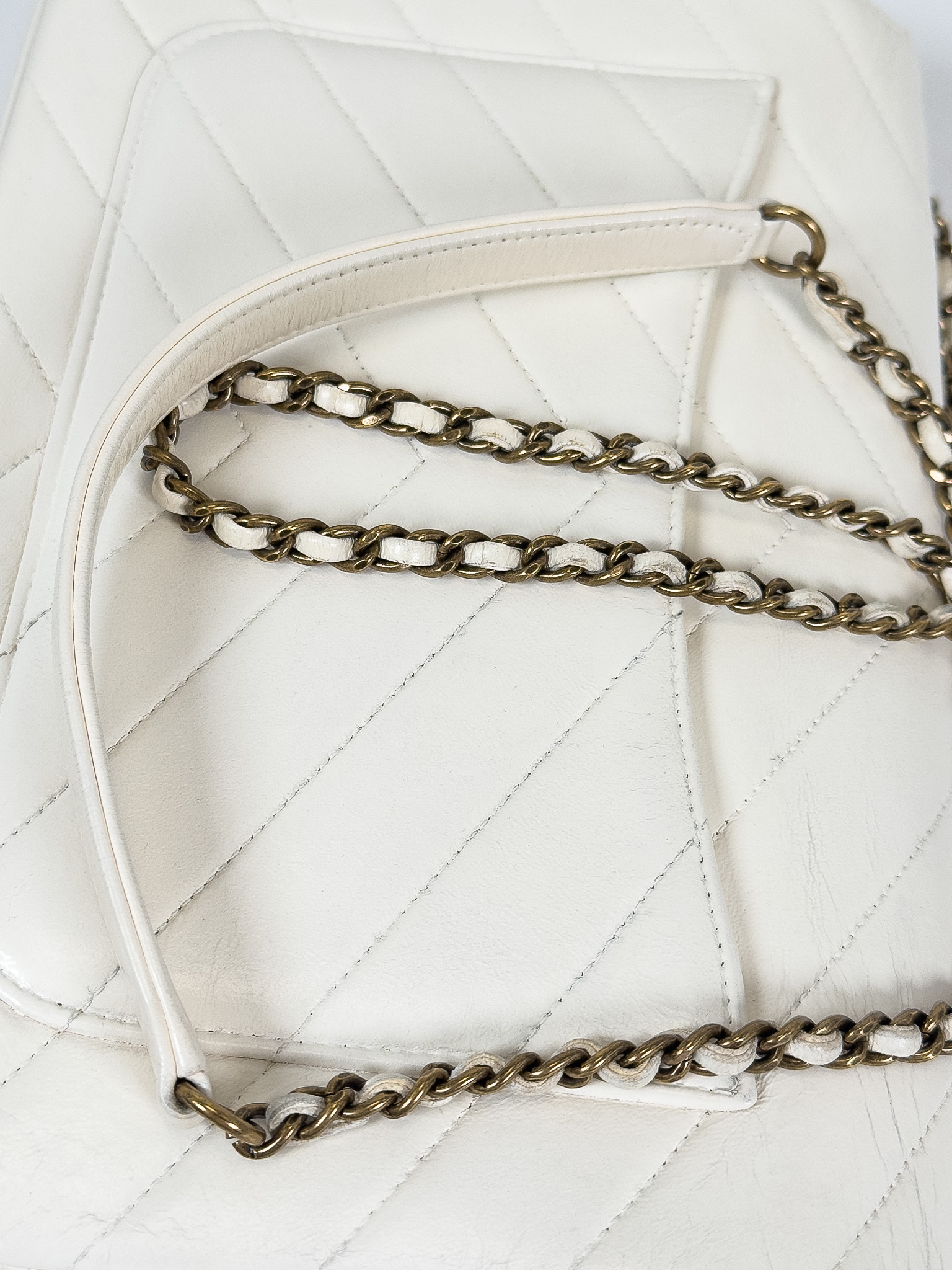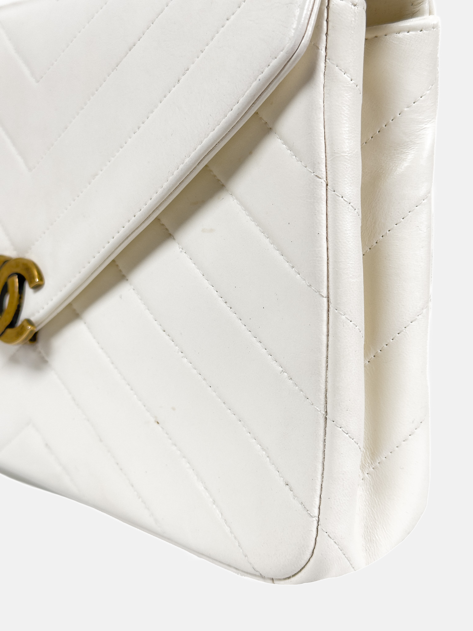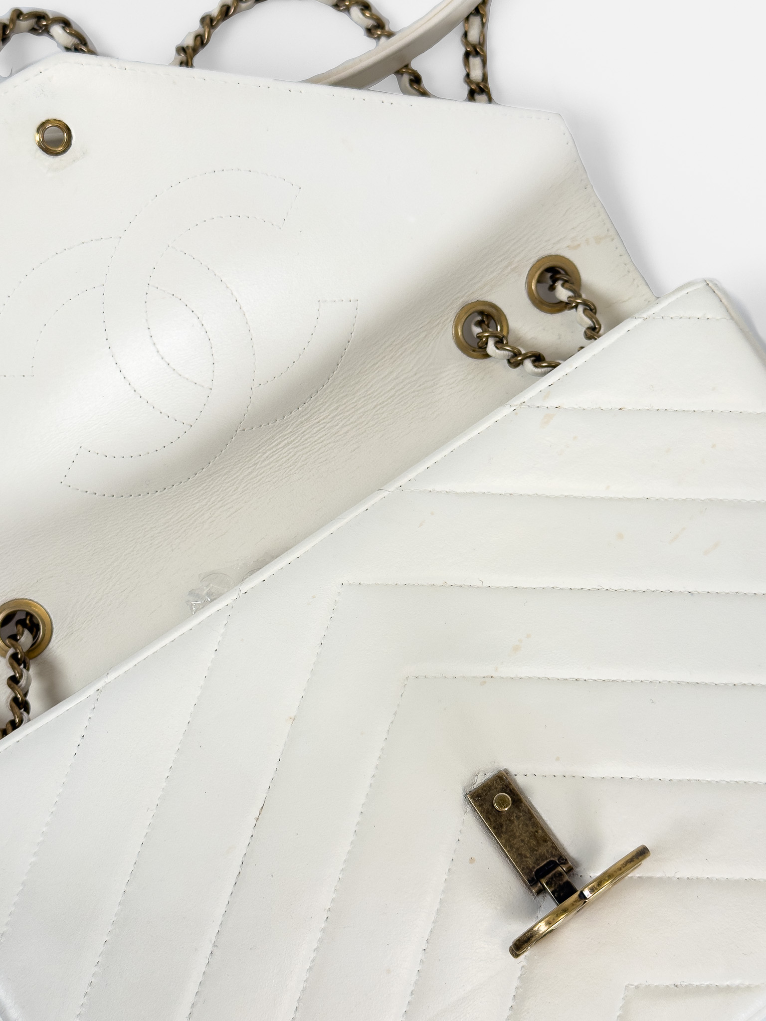 "model Chevron Coco Envelope Flapj Jasnokremowa torebka, gładka skóra jagnięca, pikowana w jodełkę z przeplatanym łańcuszkiem łańcuszkiem ze starego złota. Nosi ślady użytkowania, małe przetarcia na skórze, drobne zarysowania, wewnątrz kieszonka na zamek, oraz mniejsza na karty. Stan bardzo dobry. W zestawie z pudełkiem oraz woreczkiem przeciwkurzowym. Wymiary: wysokość 27 cm, szerokość 19 cm, głębokość 6 cm."