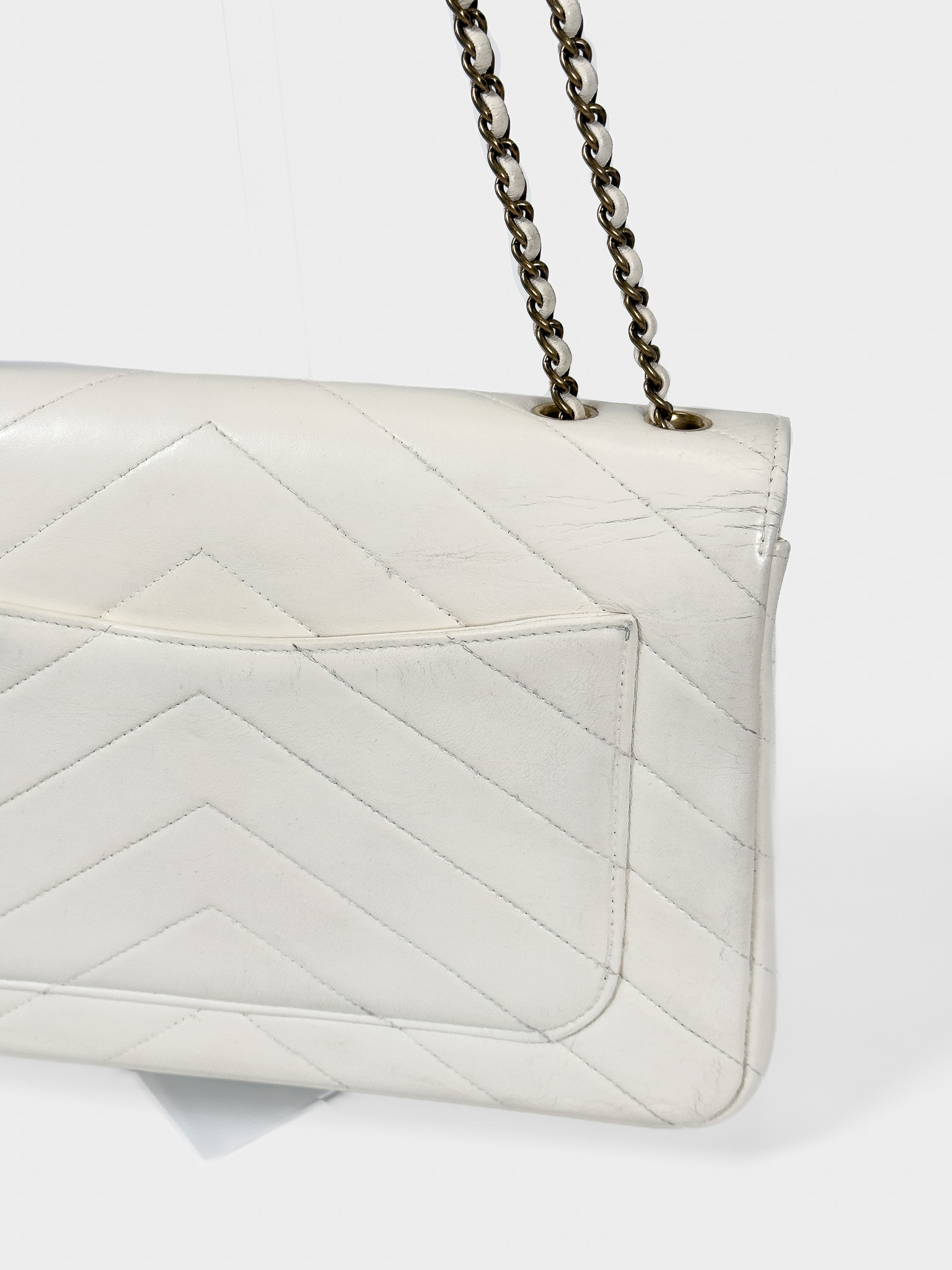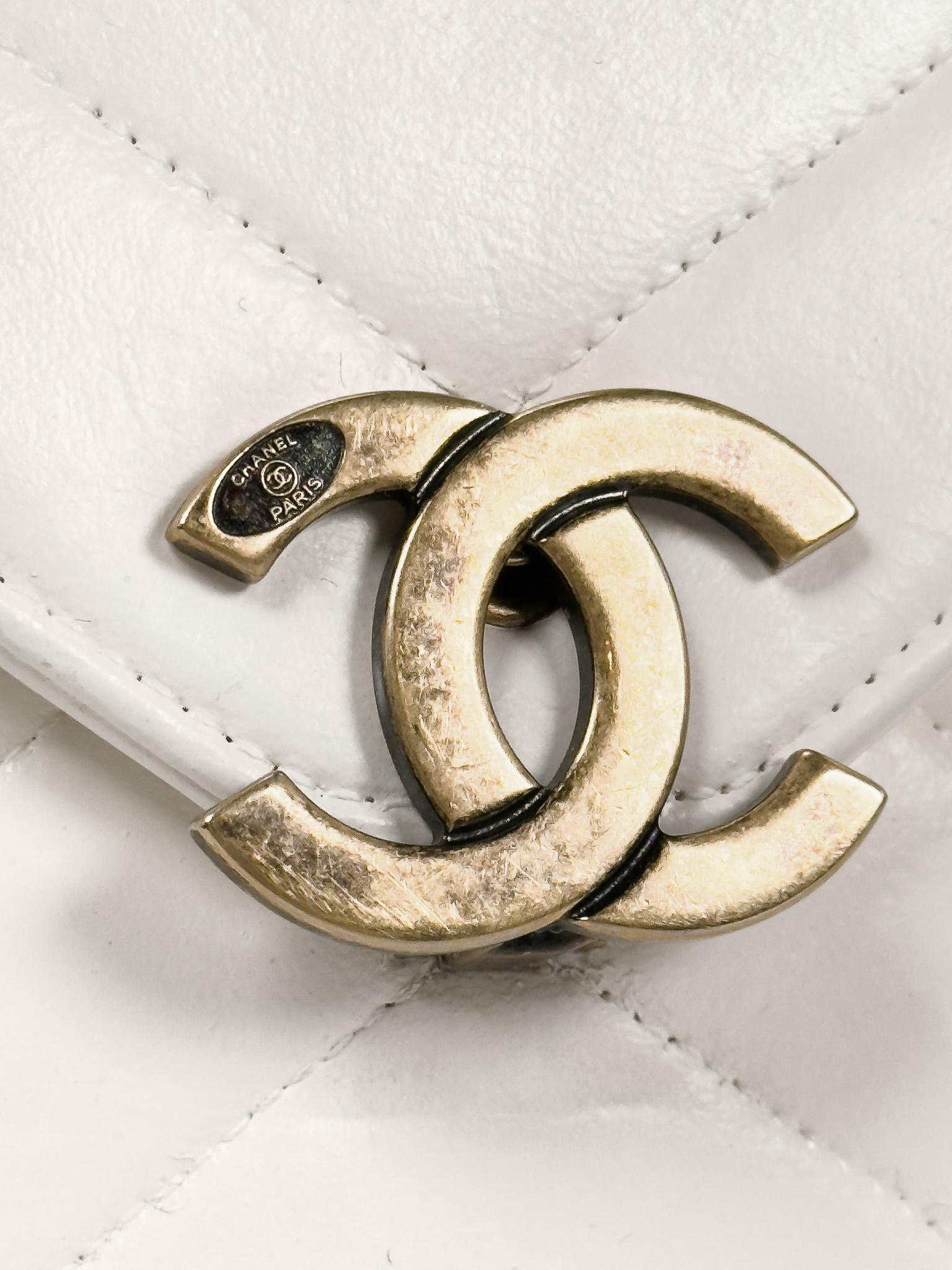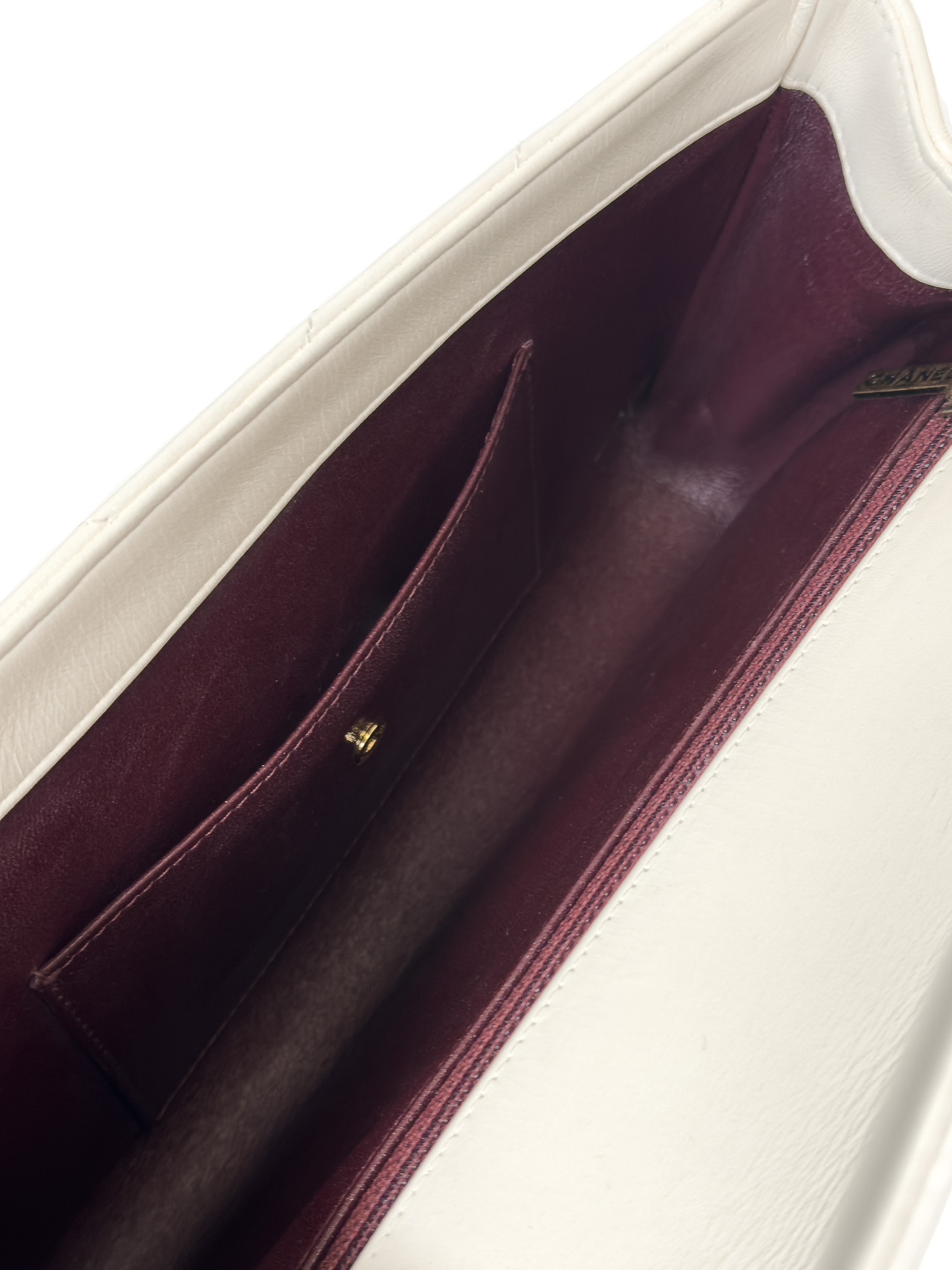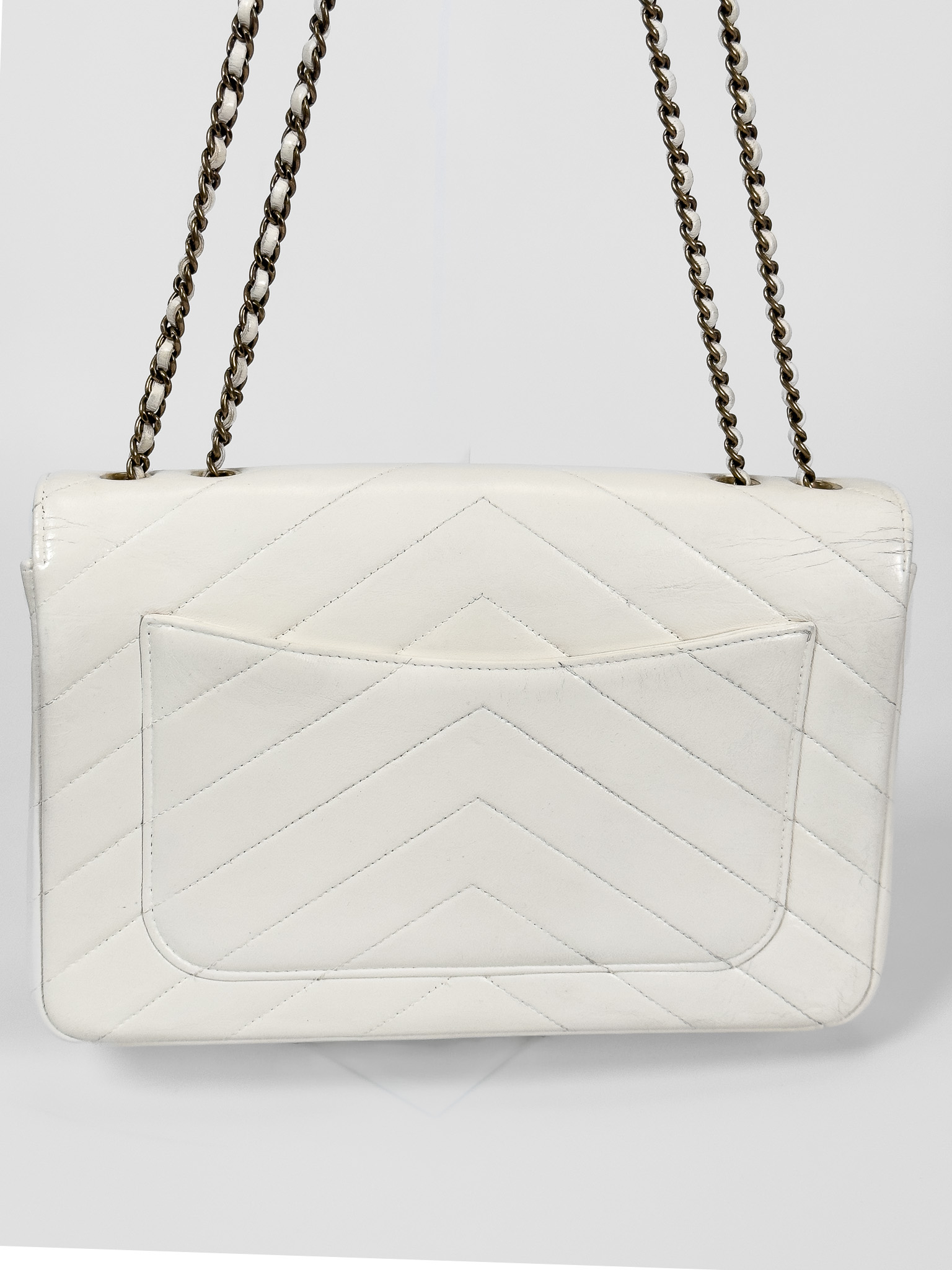 "model Chevron Coco Envelope Flapj Jasnokremowa torebka, gładka skóra jagnięca, pikowana w jodełkę z przeplatanym łańcuszkiem łańcuszkiem ze starego złota. Nosi ślady użytkowania, małe przetarcia na skórze, drobne zarysowania, wewnątrz kieszonka na zamek, oraz mniejsza na karty. Stan bardzo dobry. W zestawie z pudełkiem oraz woreczkiem przeciwkurzowym. Wymiary: wysokość 27 cm, szerokość 19 cm, głębokość 6 cm."