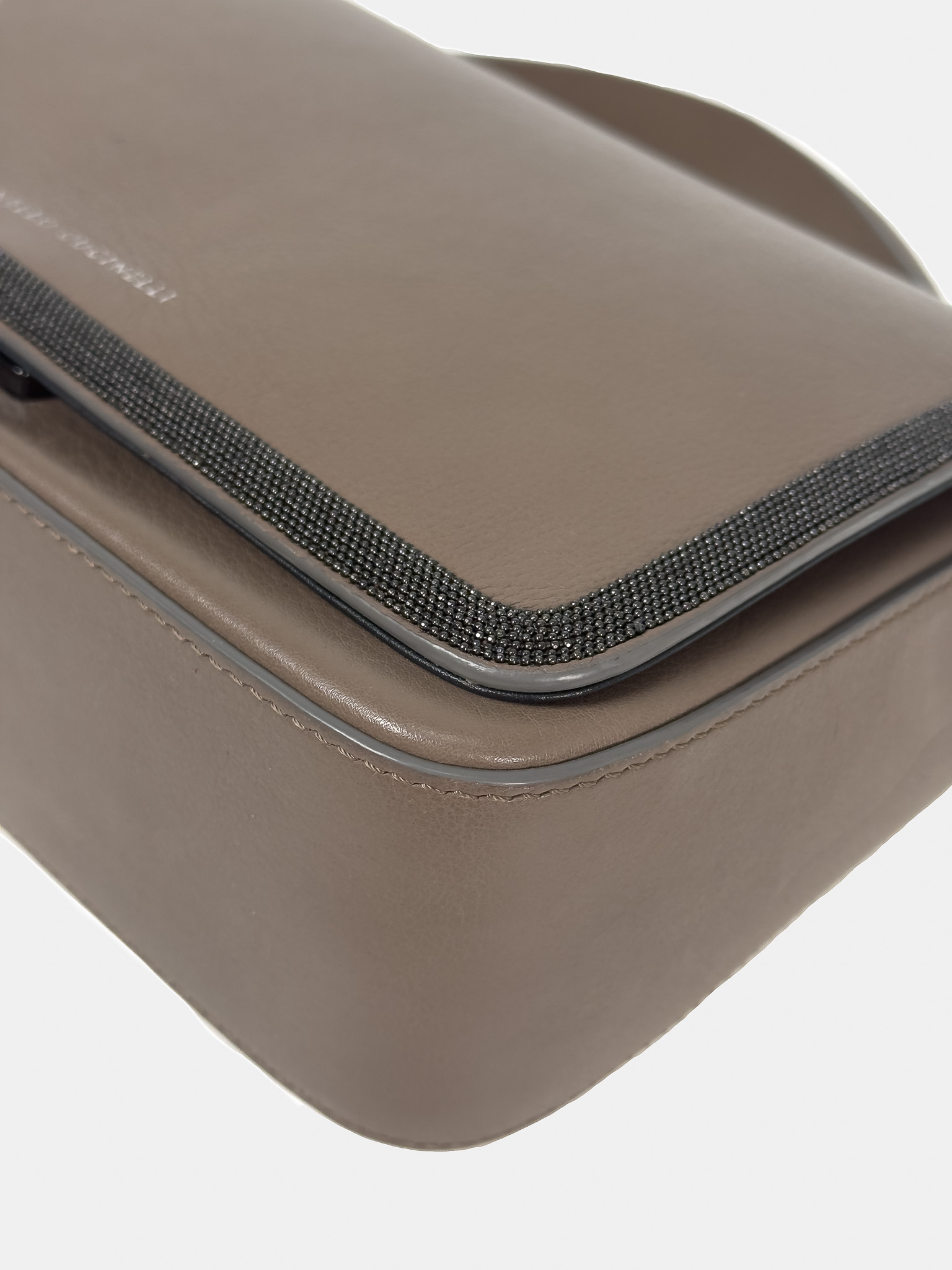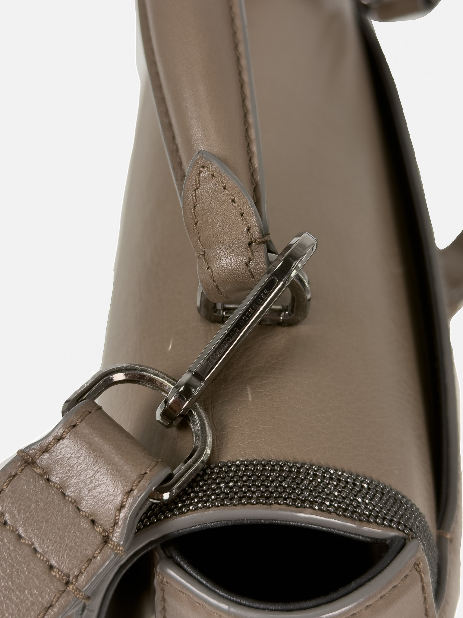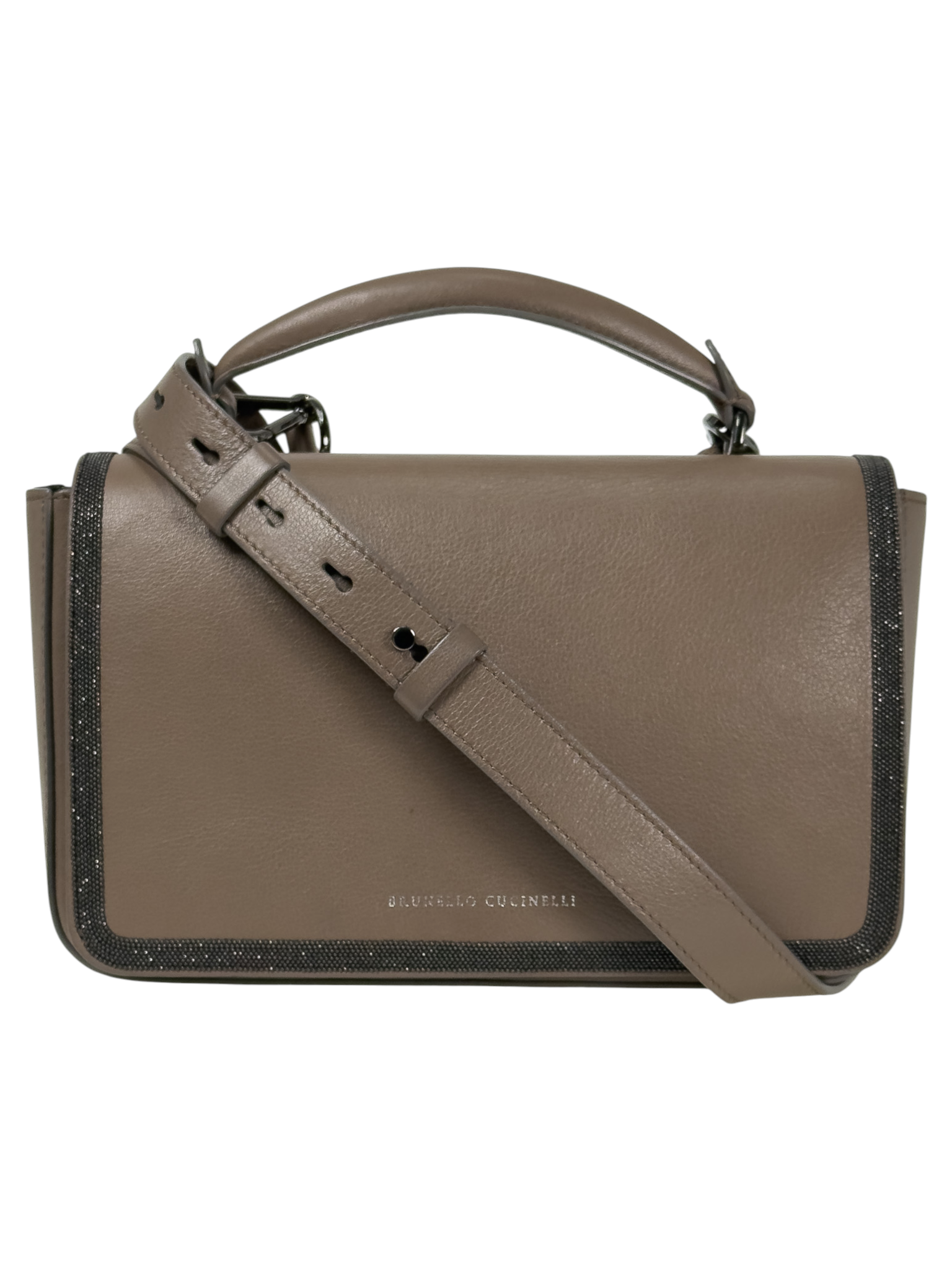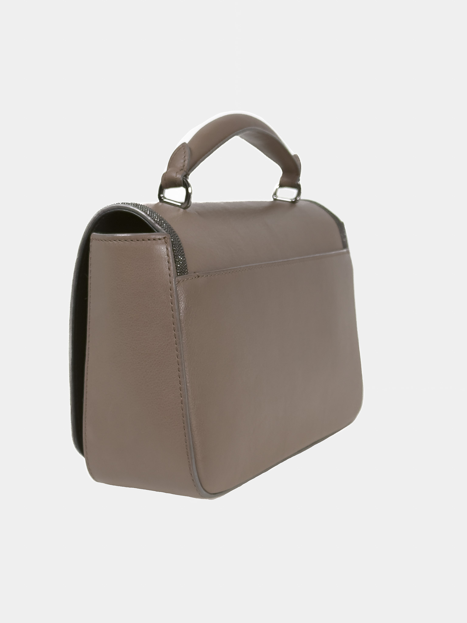 "Torebka w kolorze taupe wykończona paskiem koralików charakterystycznym dla marki, skórzana, delikatne logowanie, posiada rączkę oraz pasek z regulacją. W środku ma małą kieszonkę na zamek oraz dużą przegrodę z tyłu posiada dodatkową. Stan: bardzo dobry, mocne zarysowania na zapięciu torebki. Wymiary: szerokość 25cm, wysokość 14,5cm, głębokość 7,5cm."