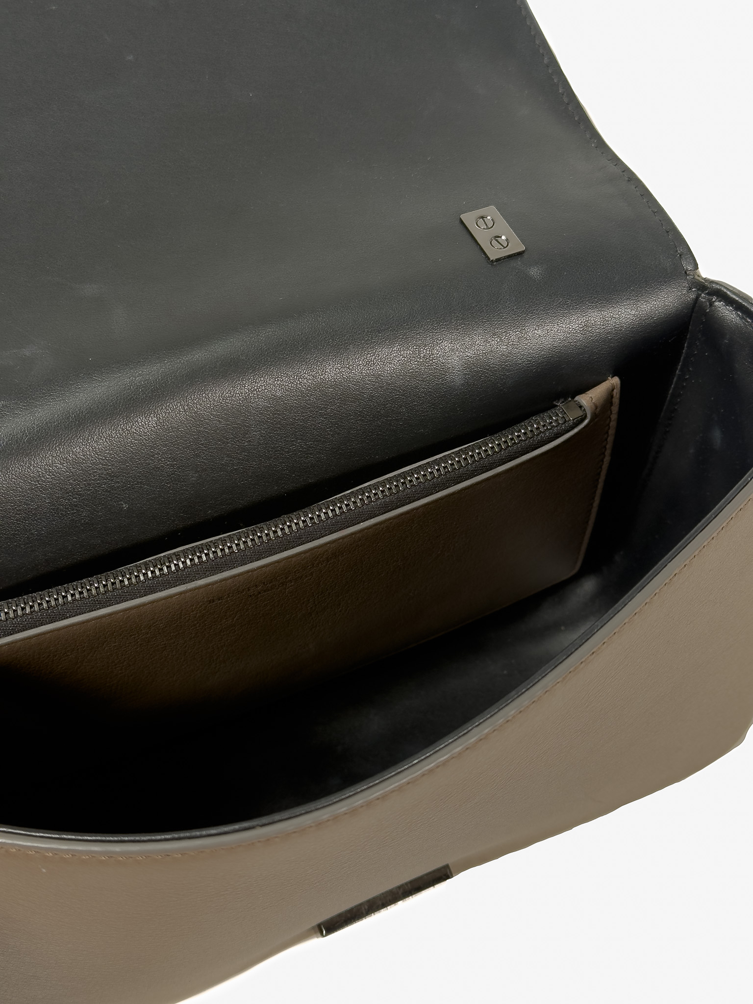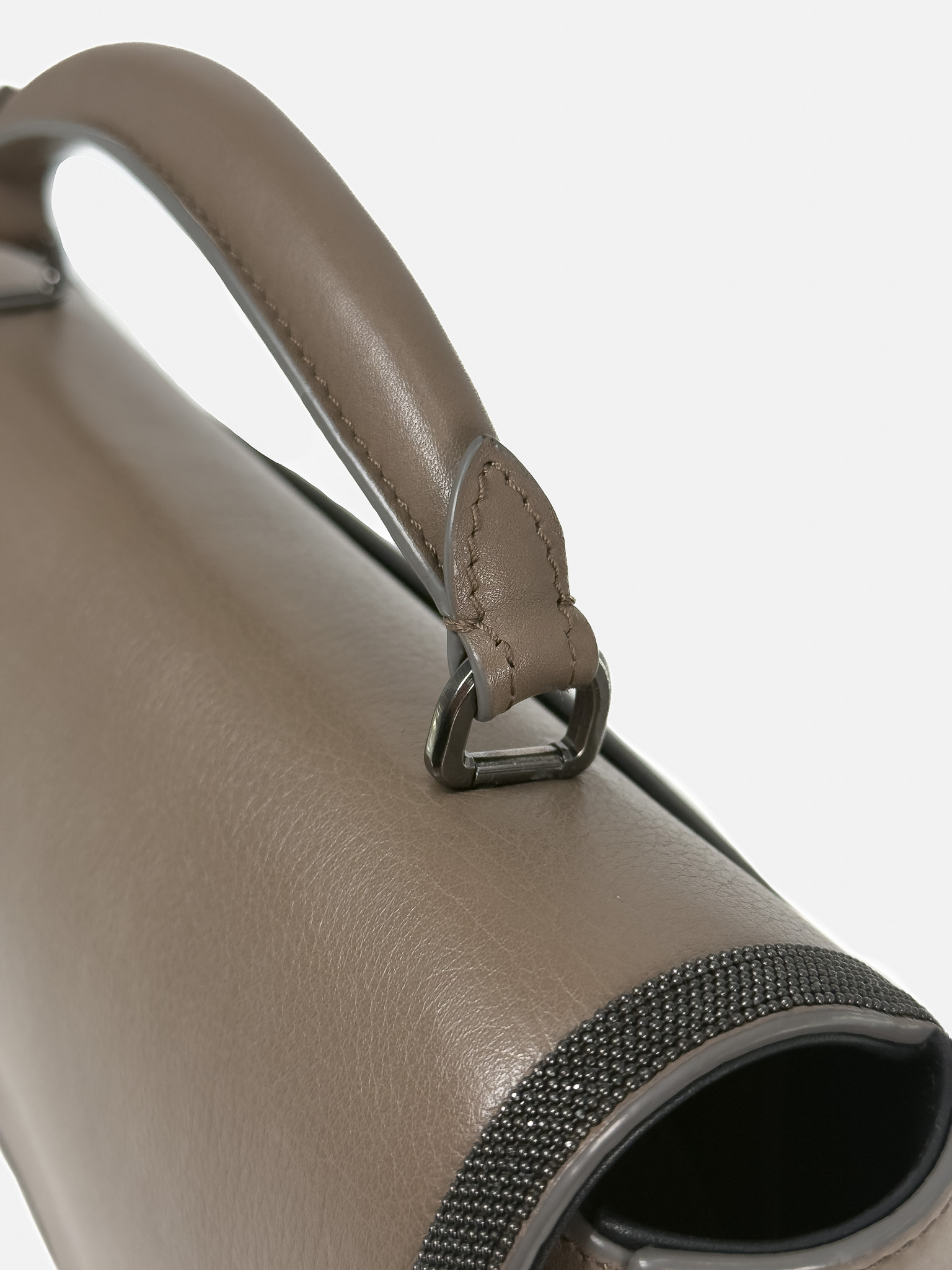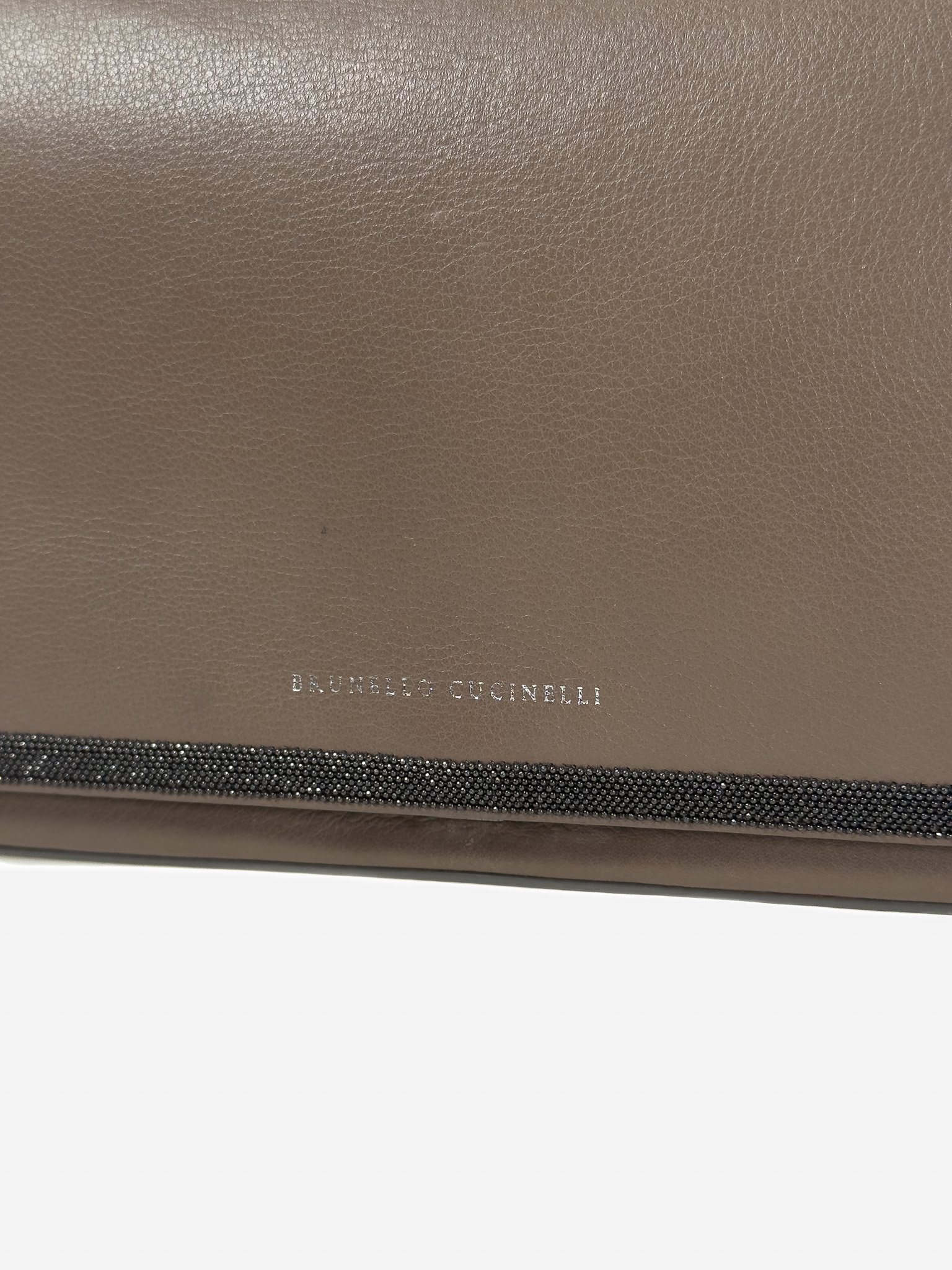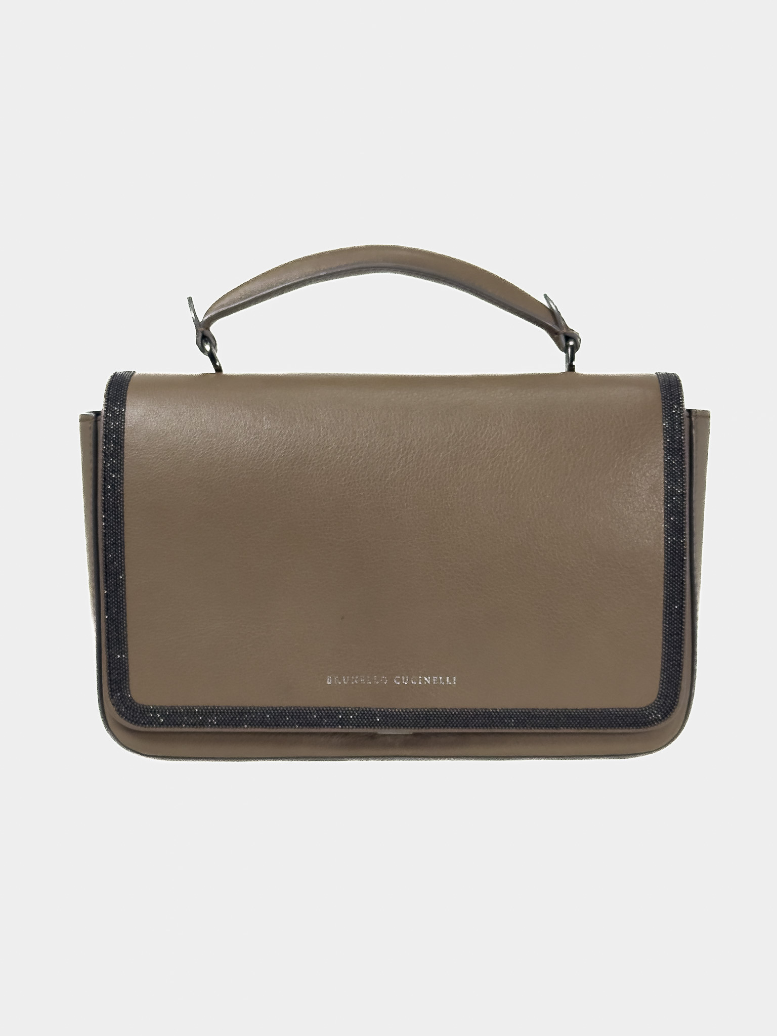 "Torebka w kolorze taupe wykończona paskiem koralików charakterystycznym dla marki, skórzana, delikatne logowanie, posiada rączkę oraz pasek z regulacją. W środku ma małą kieszonkę na zamek oraz dużą przegrodę z tyłu posiada dodatkową. Stan: bardzo dobry, mocne zarysowania na zapięciu torebki. Wymiary: szerokość 25cm, wysokość 14,5cm, głębokość 7,5cm."