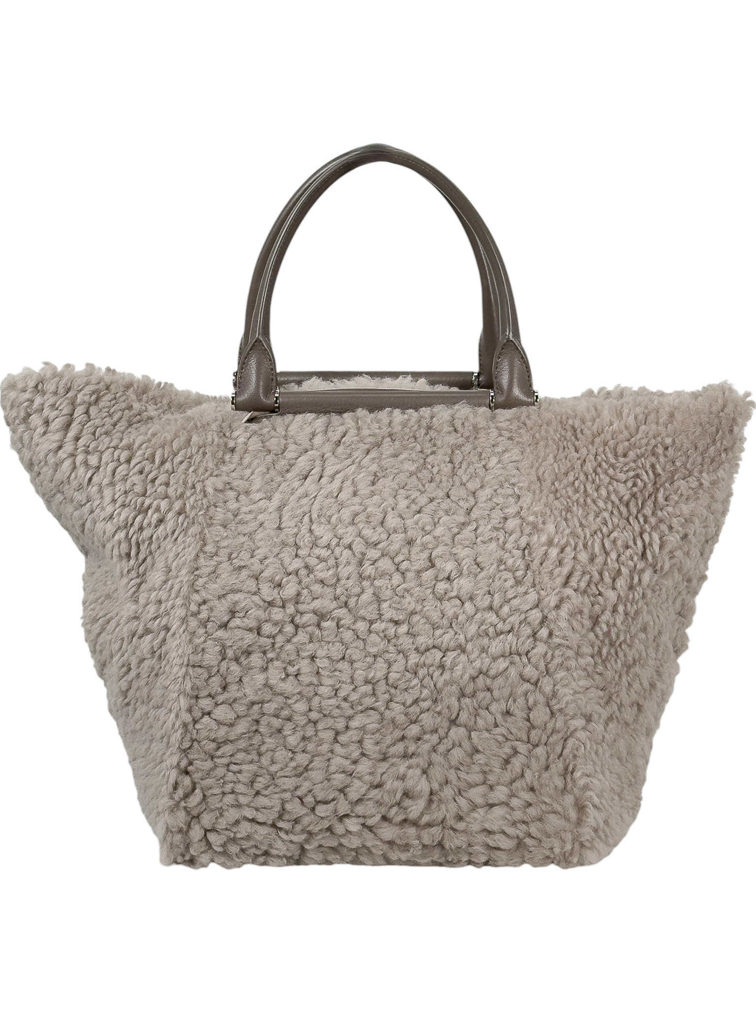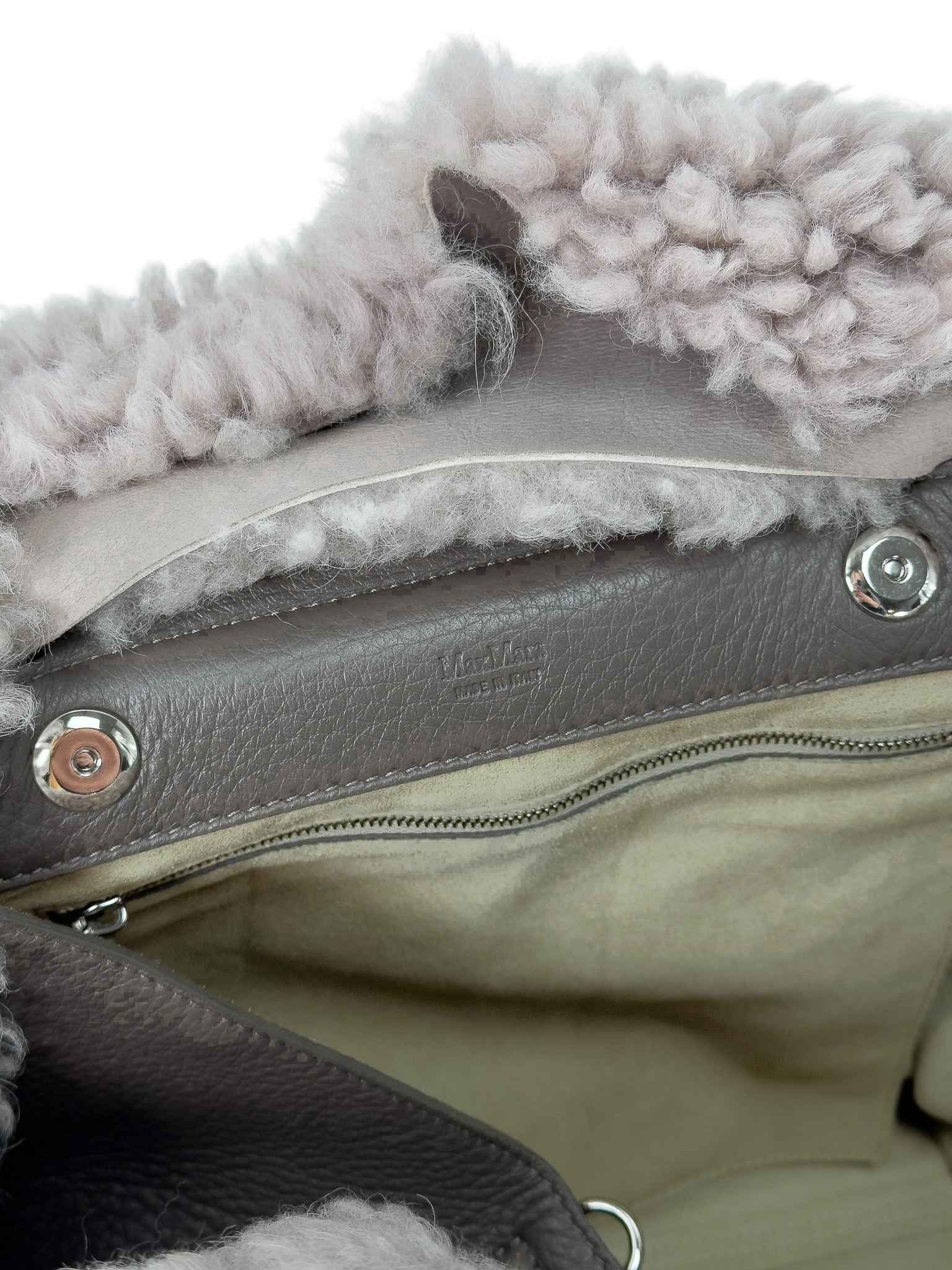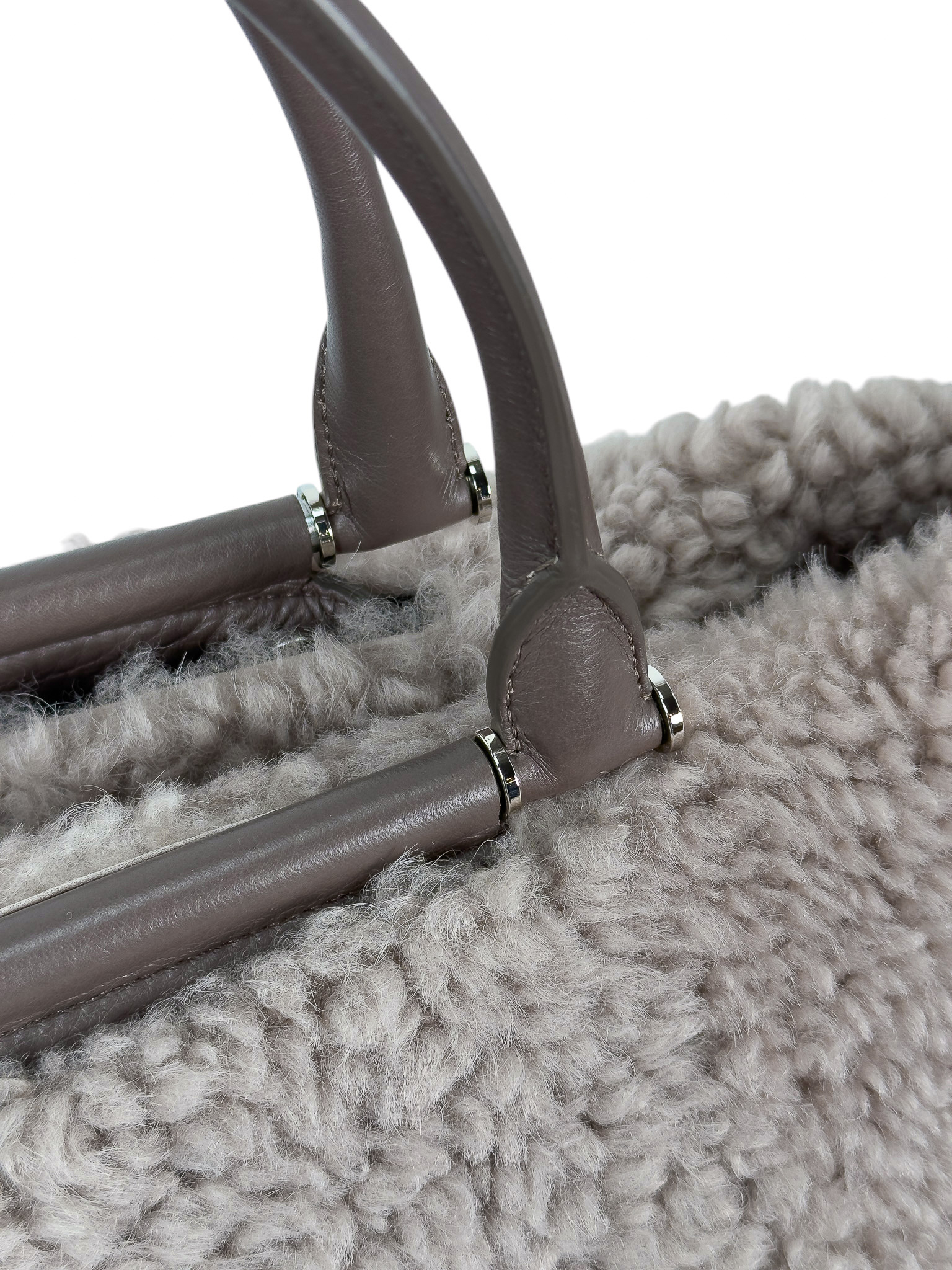 "Skórzana torebka w kolorze taupe ozdobiona ściąganym futrem/kożuchem, groszkowa skóra, dwa uchwyty do ręki/ na ramię, srebrne okucia, zamszowe wnętrze, jedna duża komora, dwie kieszenie, zapinana na logowany karabińczyk w zestawie z workiem przeciwkurzowym. Stan idealny. Wymiary: szerokość 28cm, wysokość 34cm, głębokość 31cm."