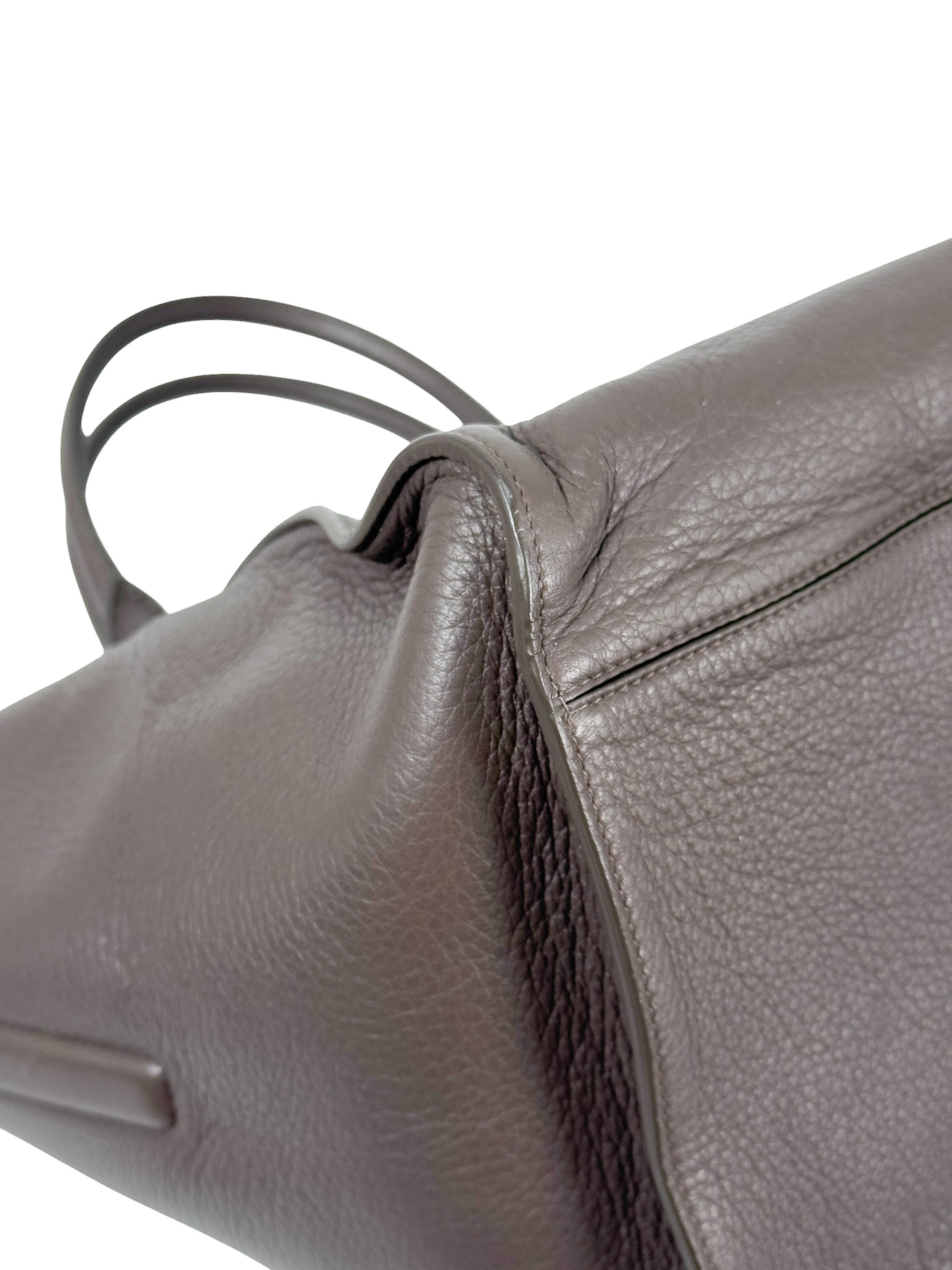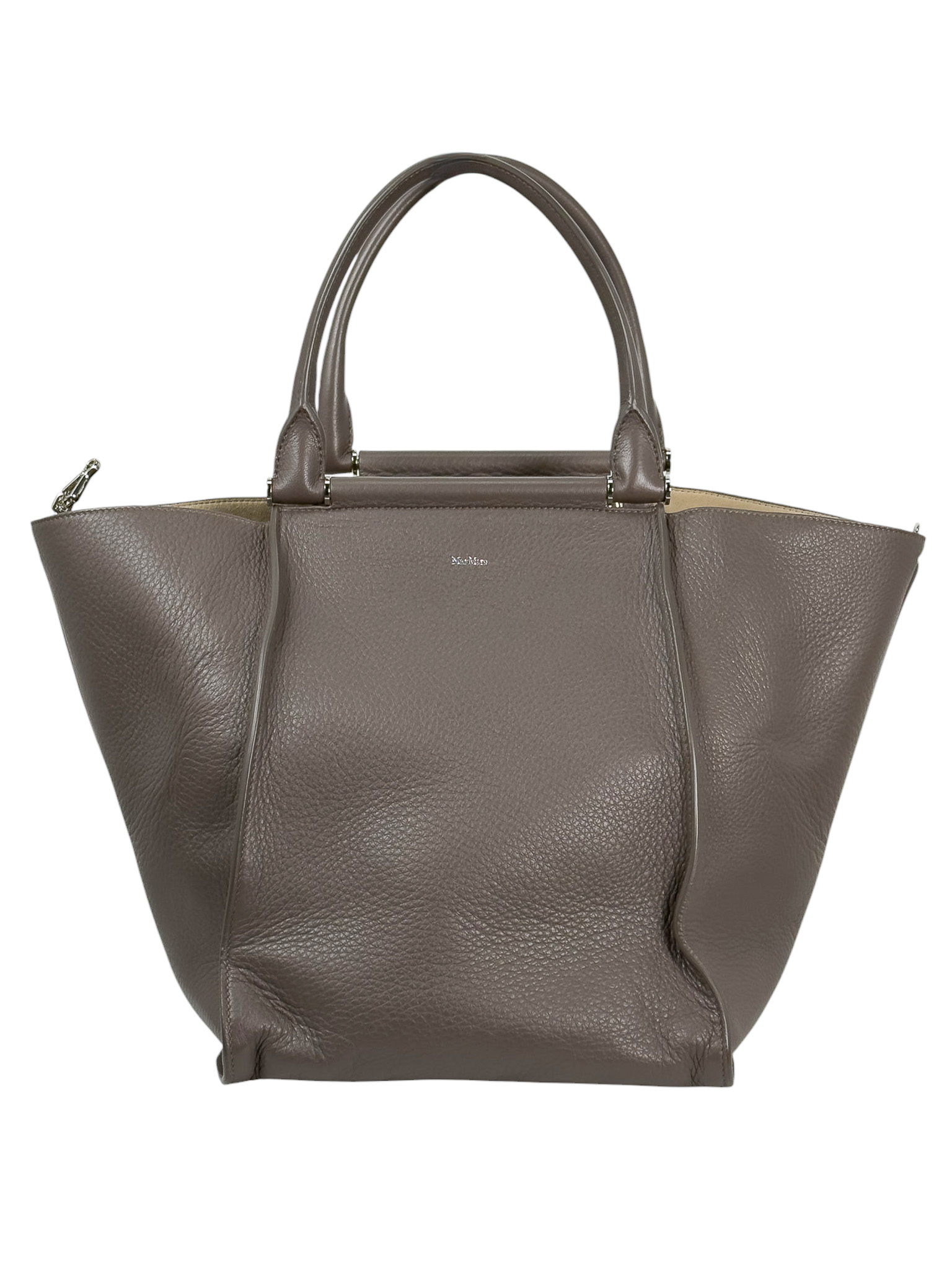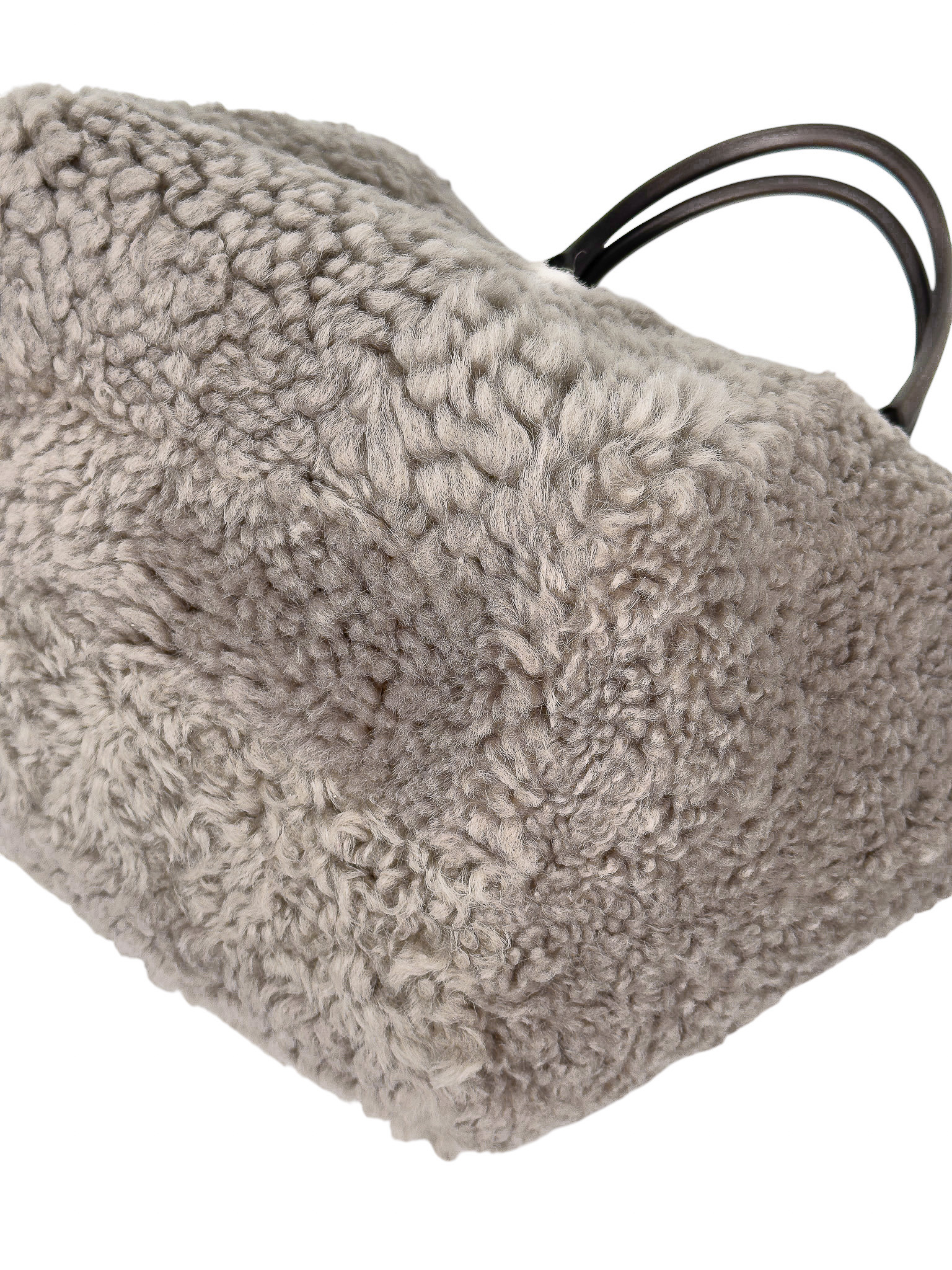 "Skórzana torebka w kolorze taupe ozdobiona ściąganym futrem/kożuchem, groszkowa skóra, dwa uchwyty do ręki/ na ramię, srebrne okucia, zamszowe wnętrze, jedna duża komora, dwie kieszenie, zapinana na logowany karabińczyk w zestawie z workiem przeciwkurzowym. Stan idealny. Wymiary: szerokość 28cm, wysokość 34cm, głębokość 31cm."
