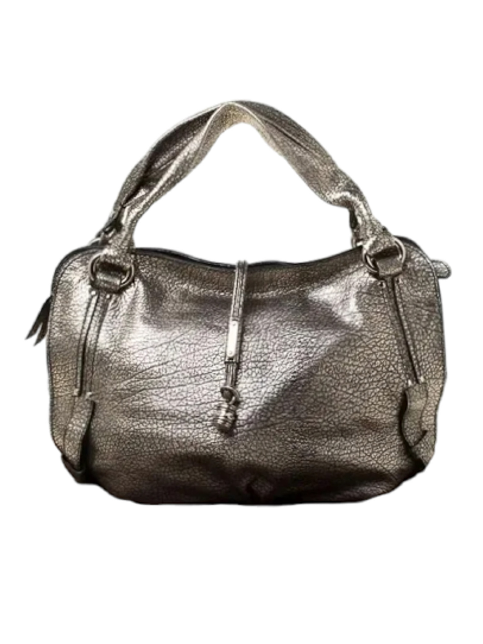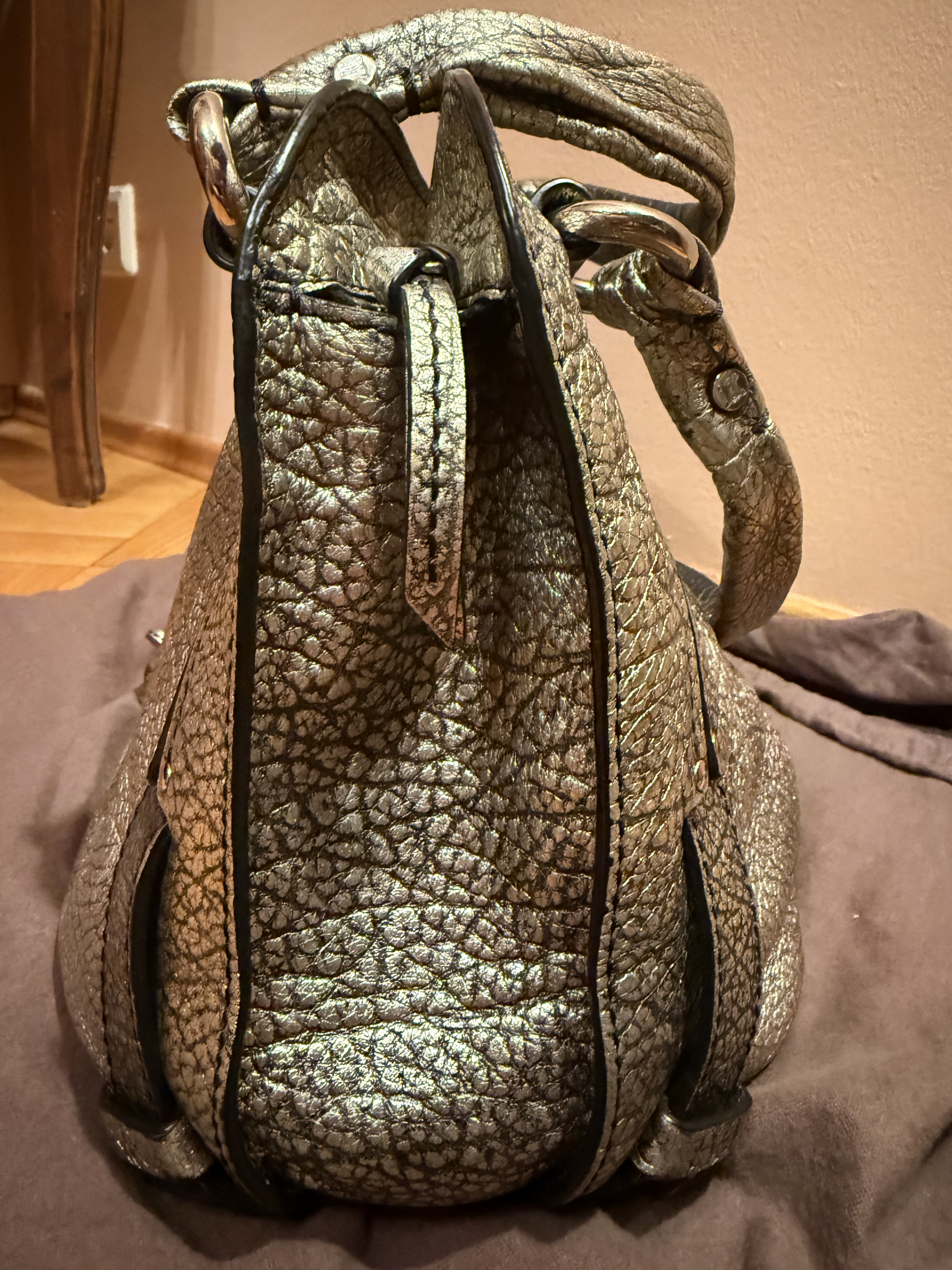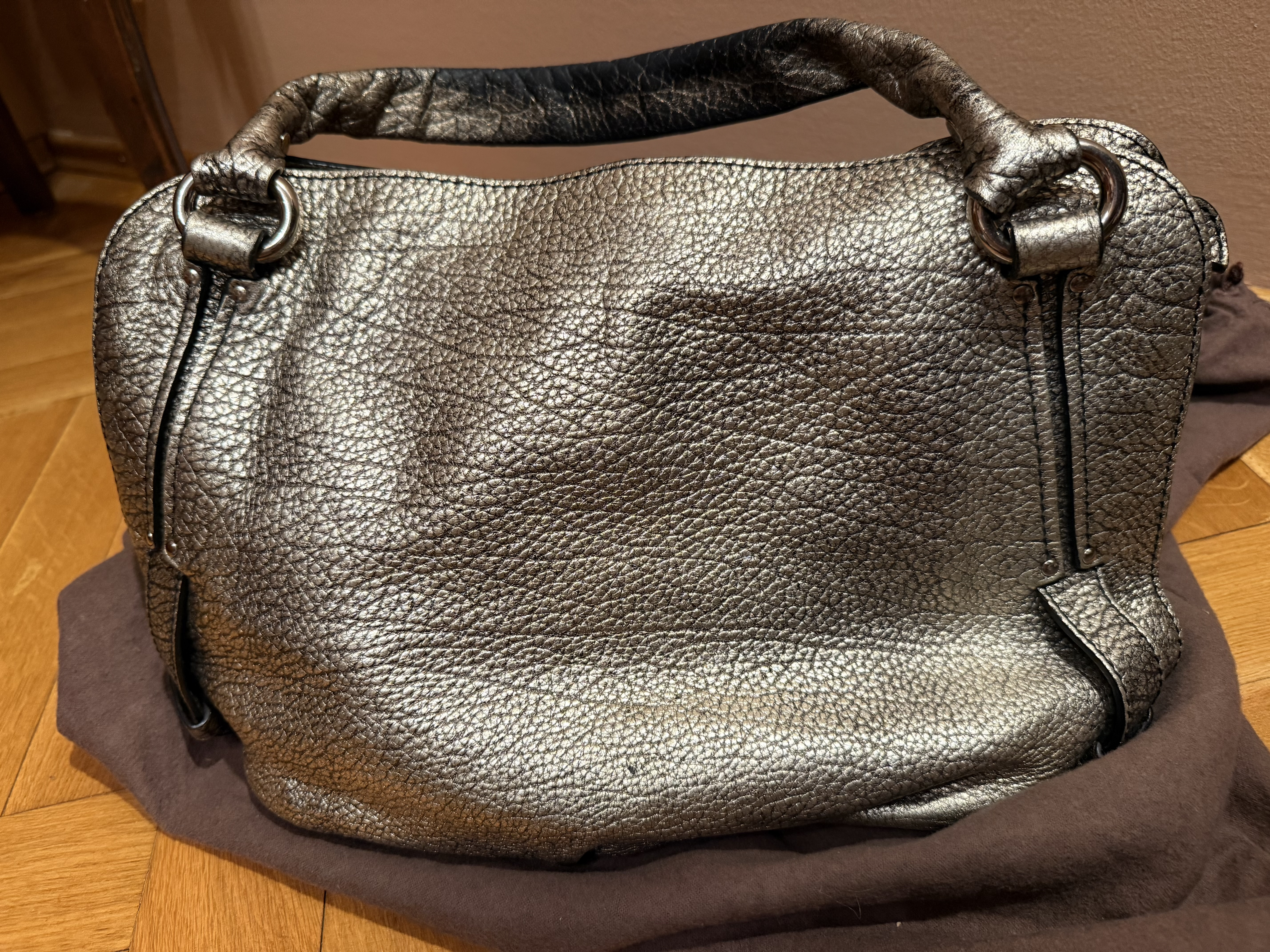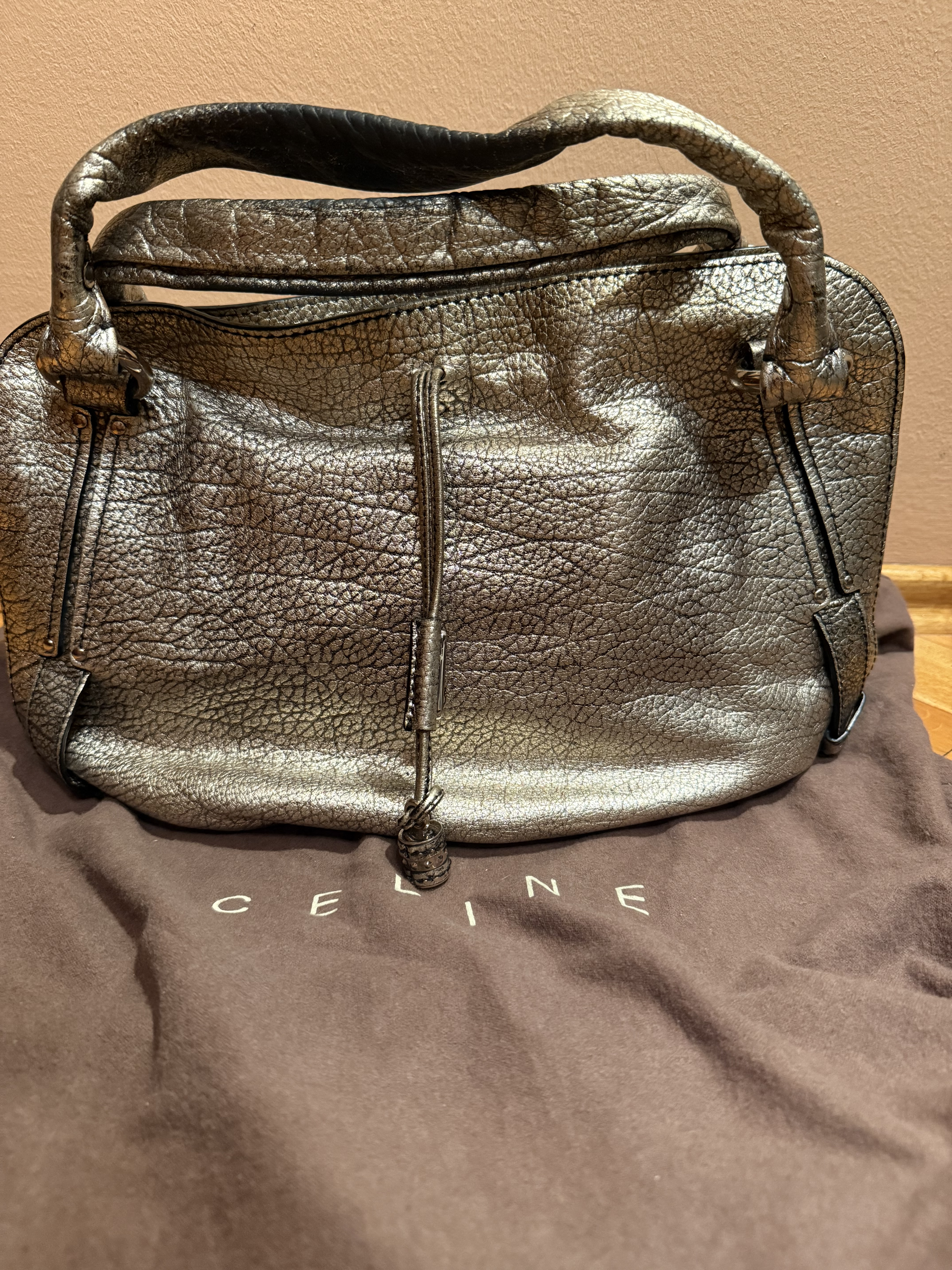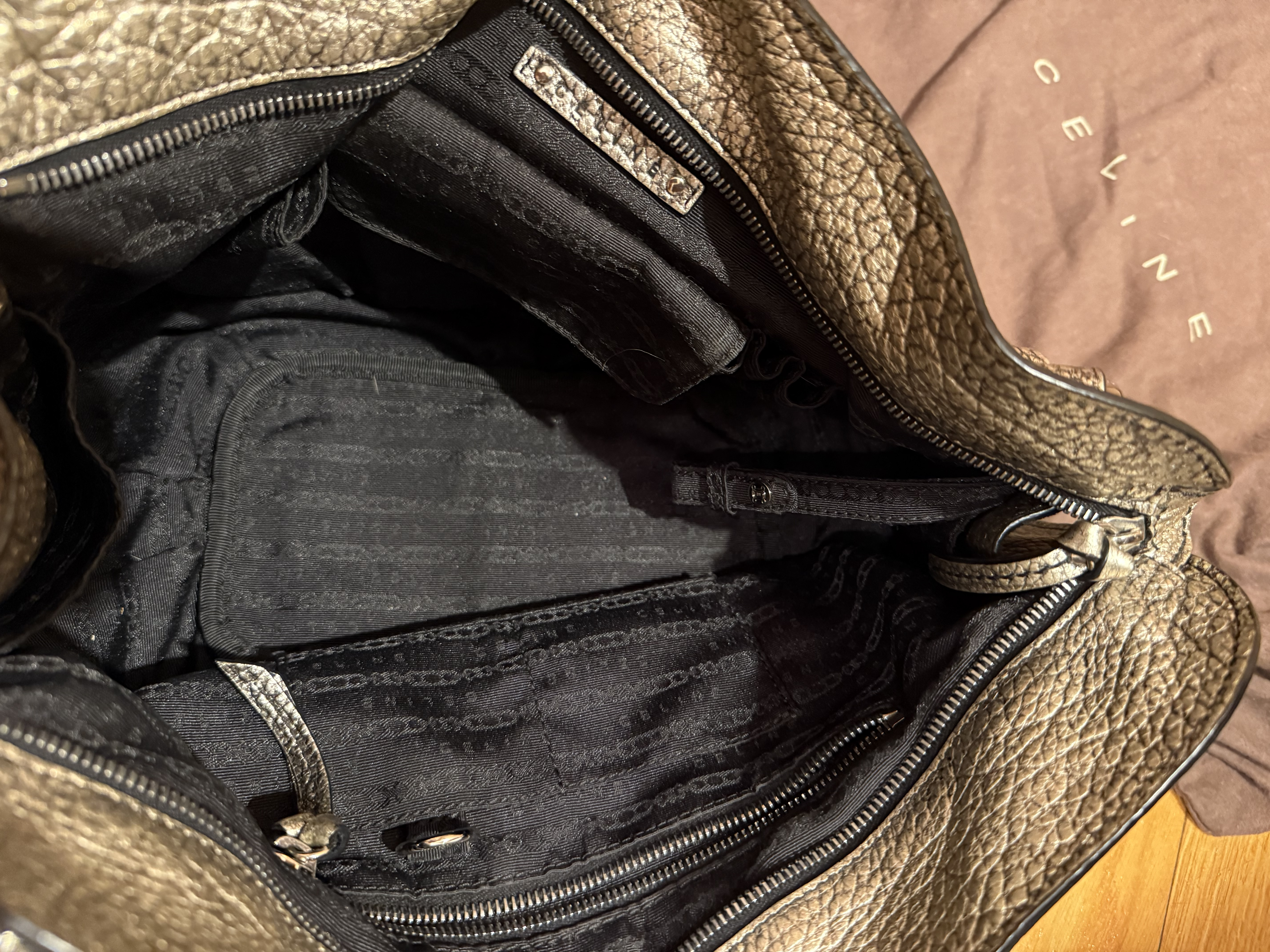 "Złota torebka Celine, w komplecie z woreczkiem, stan dobry, czysty środek, skóra posiada zarysowania, delikatne przebarwienia na rączkach, niewidoczne przy noszeniu ze względu na fakturę torebki"