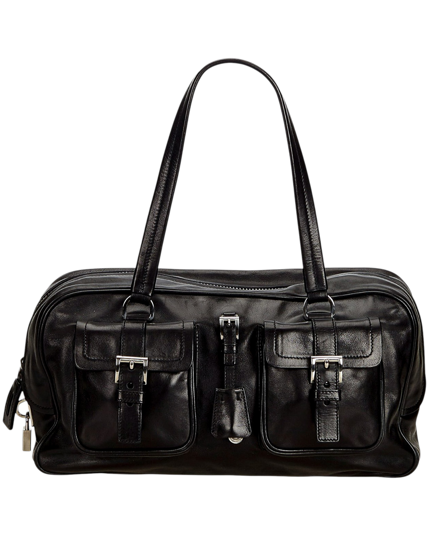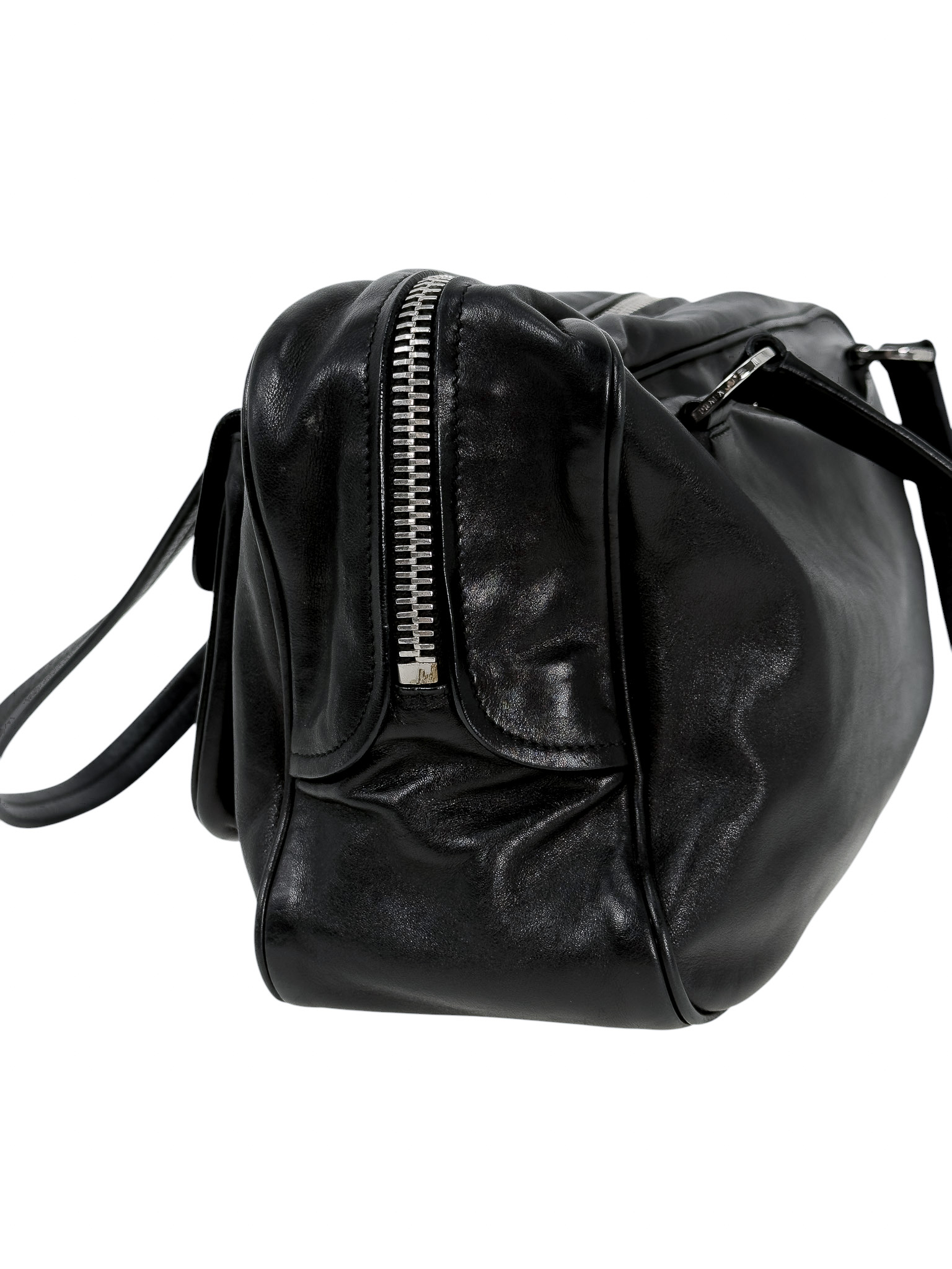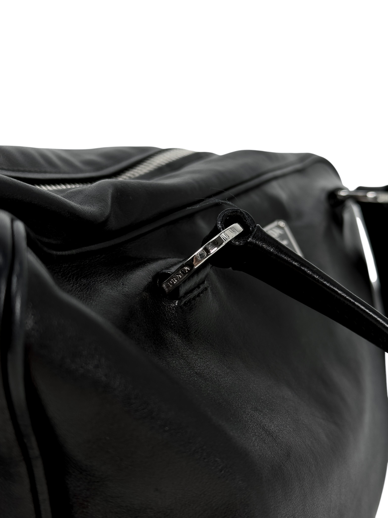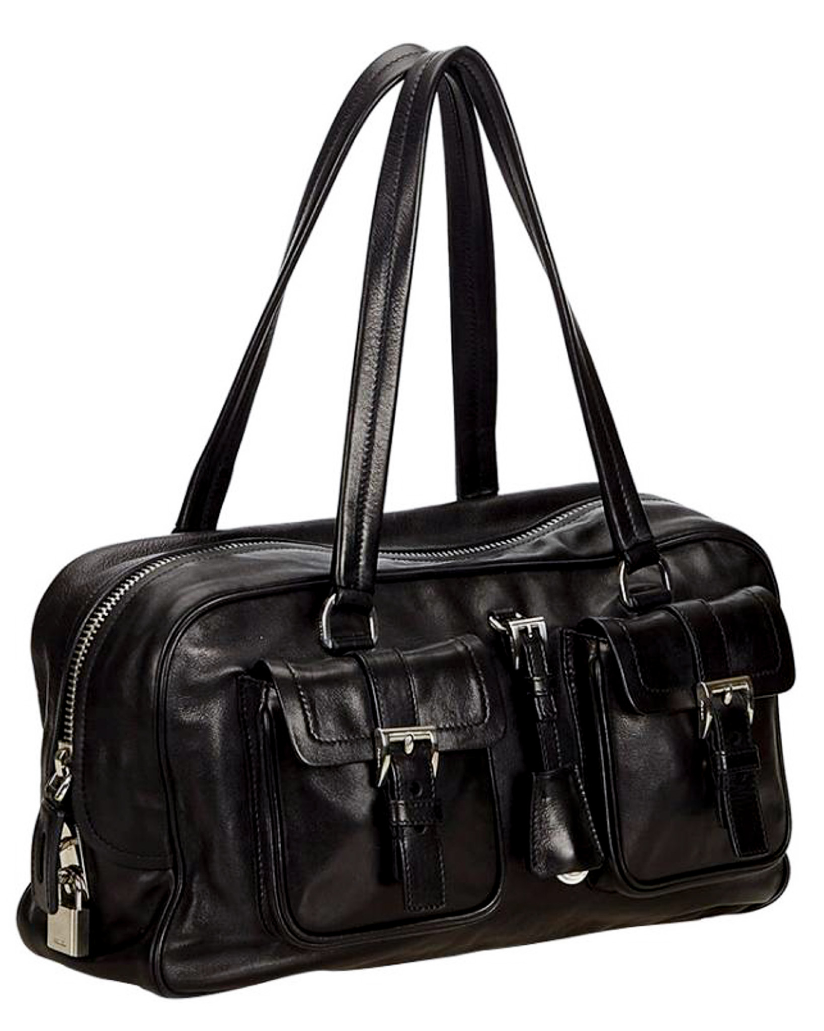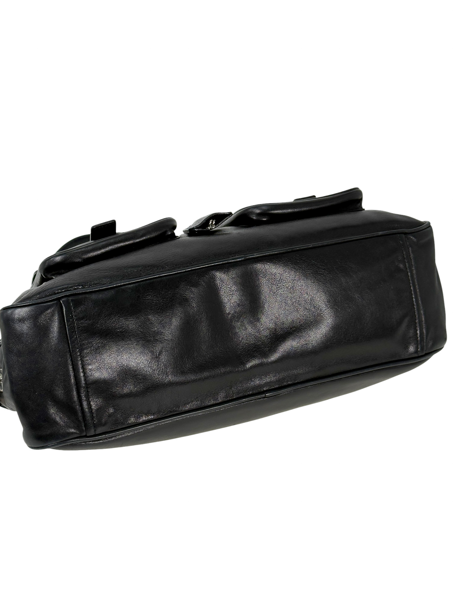 "Czarna skórzana torebka do ręki/ na ramię, prostokątny kształt, miękka skóra, trójkątne logo marki w centralnej części, srebrne okucia, dwie zapinane kieszenie oraz zawieszka z kluczami z tyłu, zapinana na suwak, logowane wnętrze, jedna duża komora z kieszenią, logowana kłódka, w komplecie z workiem przeciwkurzowym. Stan dobry, posiada przetarcia na rogach. szerokość 34cm, wysokość 18cm, głębokość 10cm."