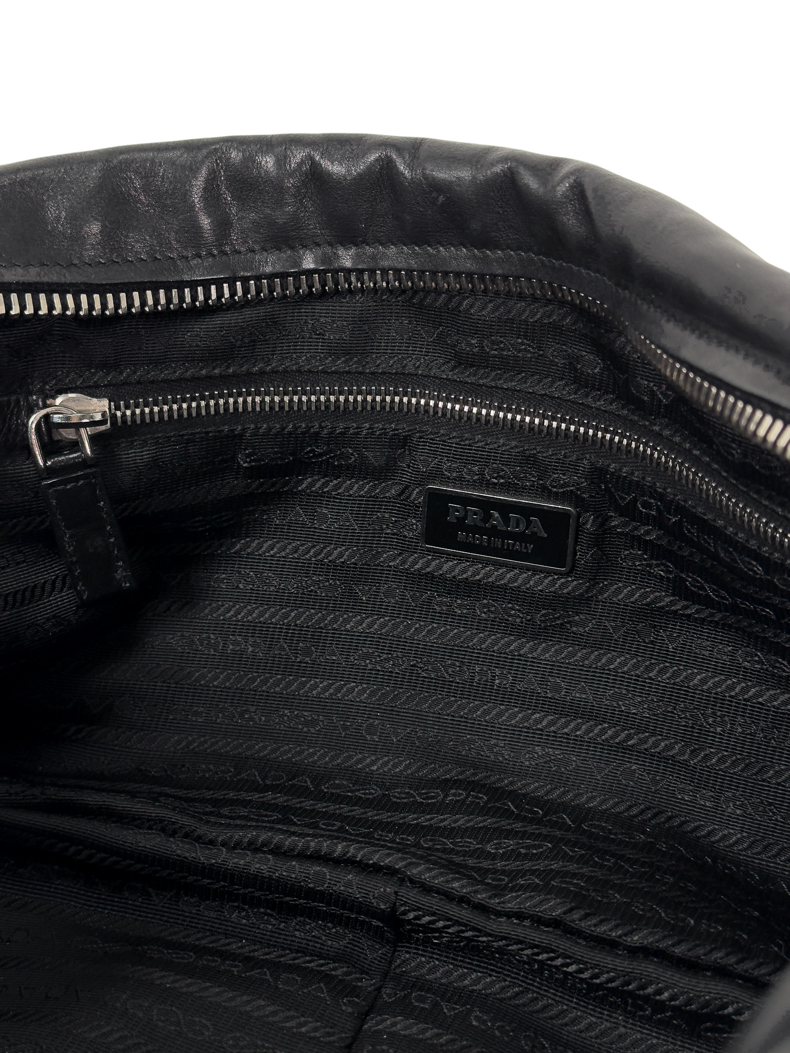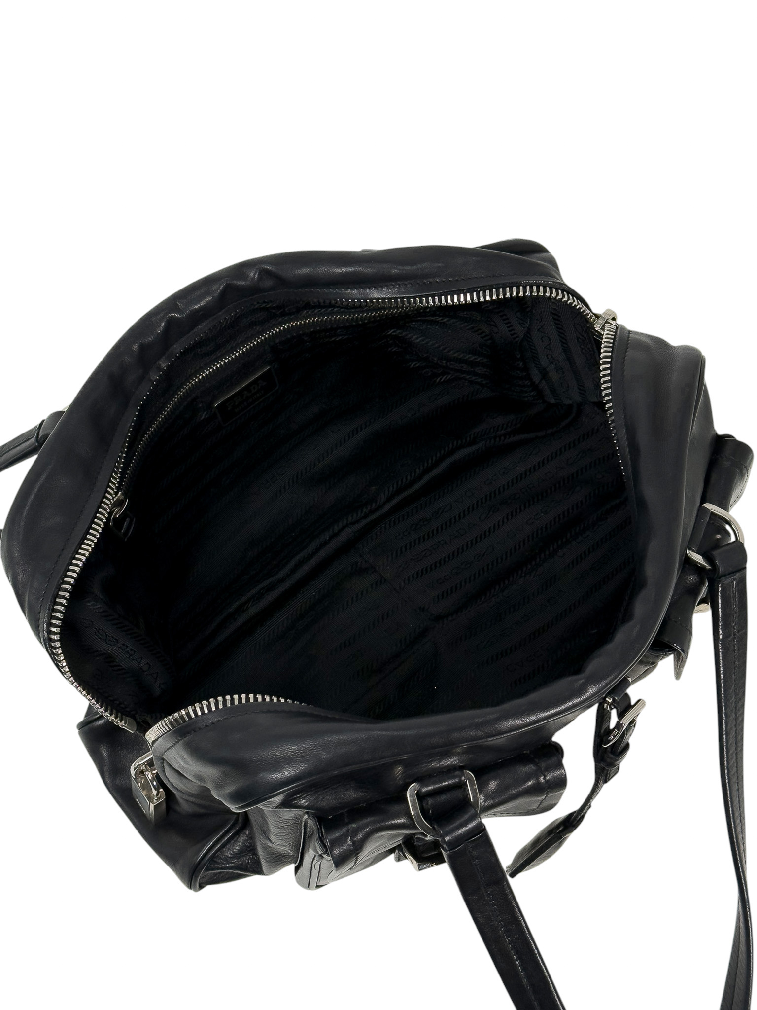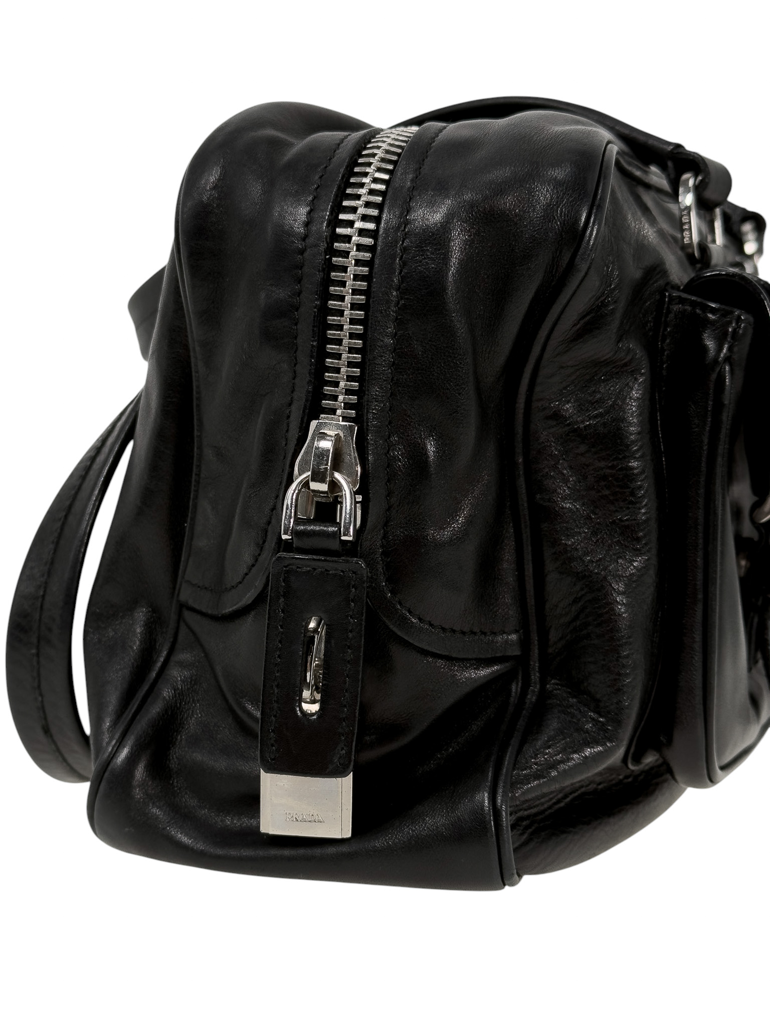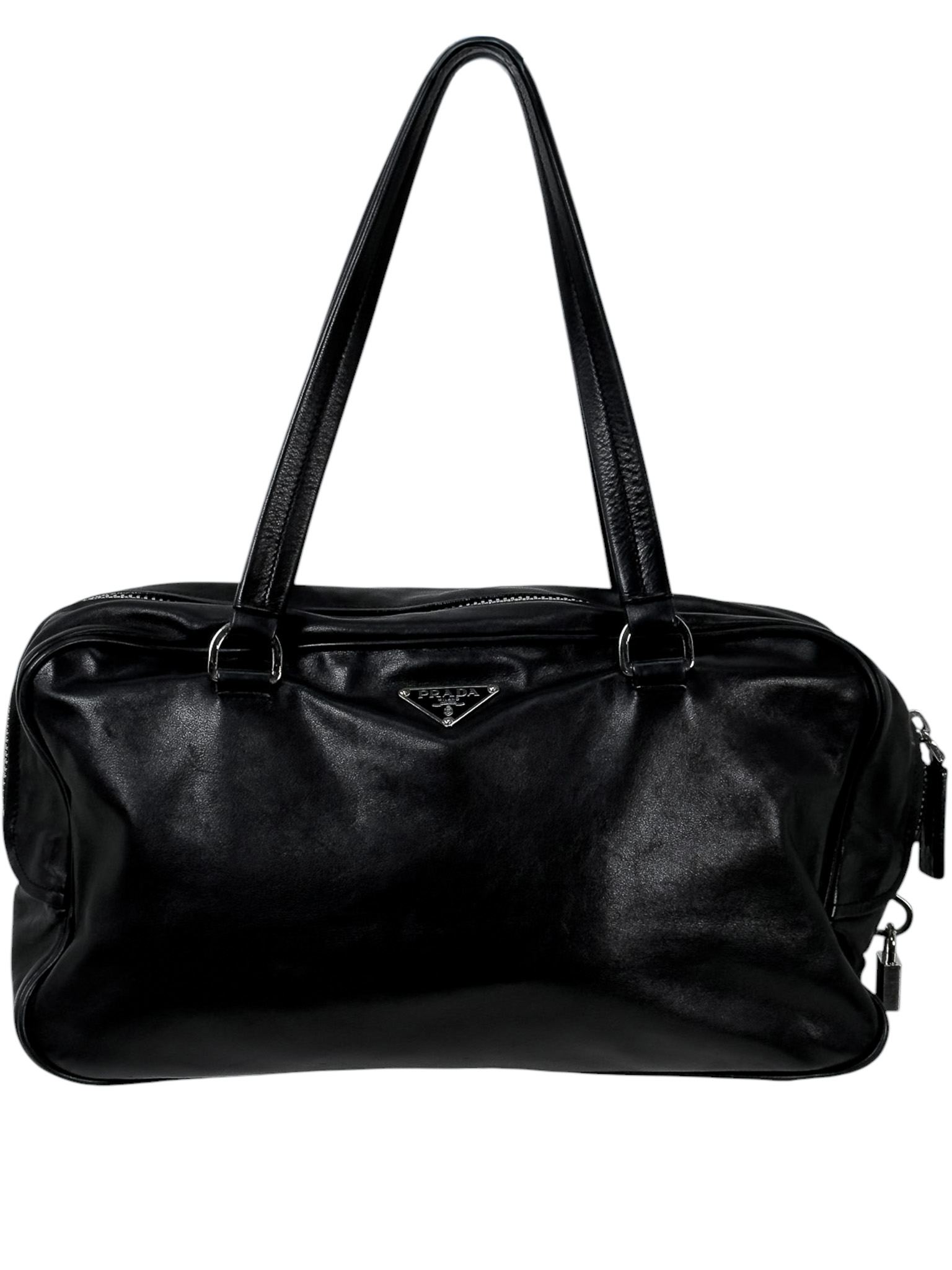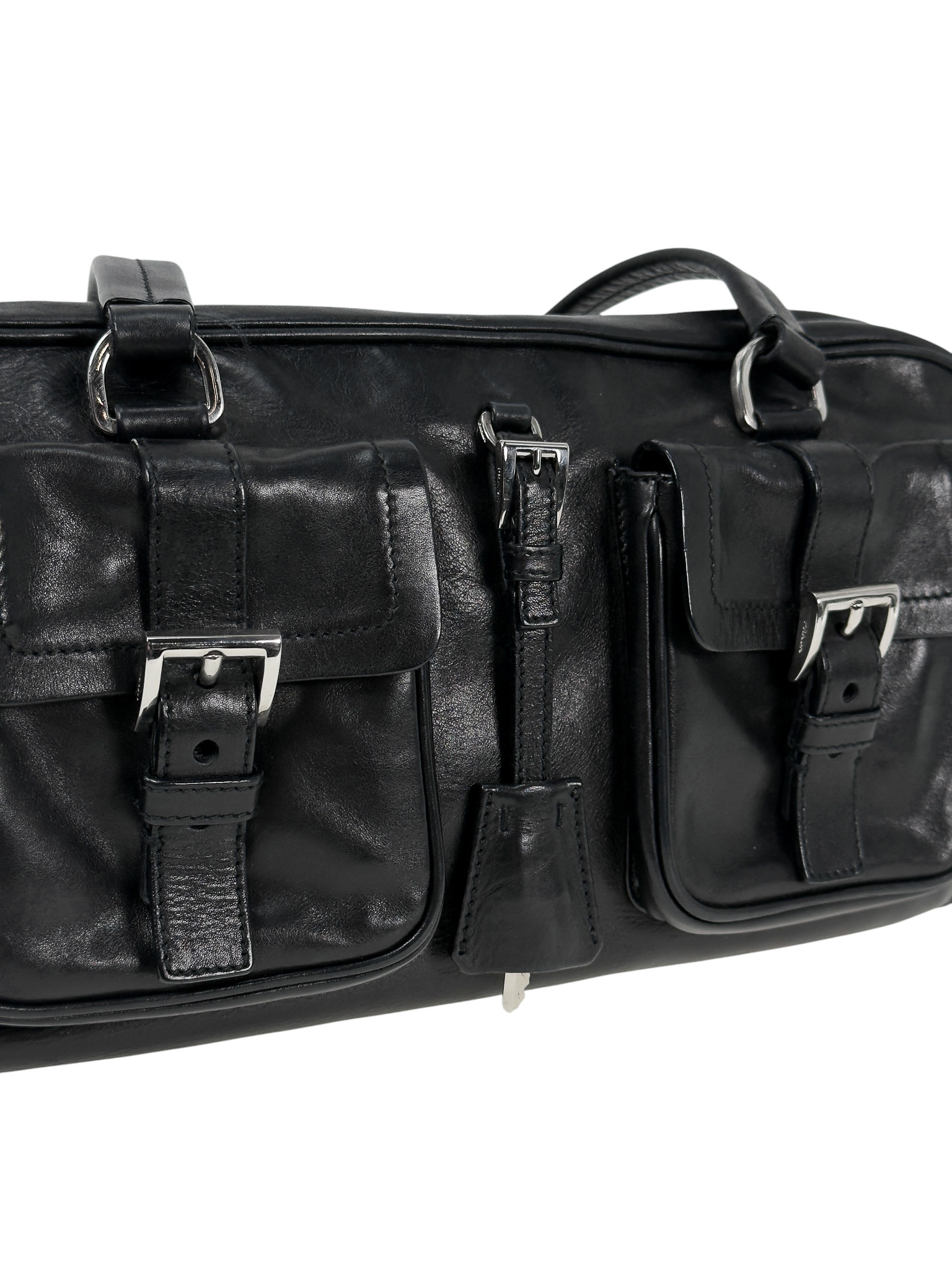 "Czarna skórzana torebka do ręki/ na ramię, prostokątny kształt, miękka skóra, trójkątne logo marki w centralnej części, srebrne okucia, dwie zapinane kieszenie oraz zawieszka z kluczami z tyłu, zapinana na suwak, logowane wnętrze, jedna duża komora z kieszenią, logowana kłódka, w komplecie z workiem przeciwkurzowym. Stan dobry, posiada przetarcia na rogach. szerokość 34cm, wysokość 18cm, głębokość 10cm."