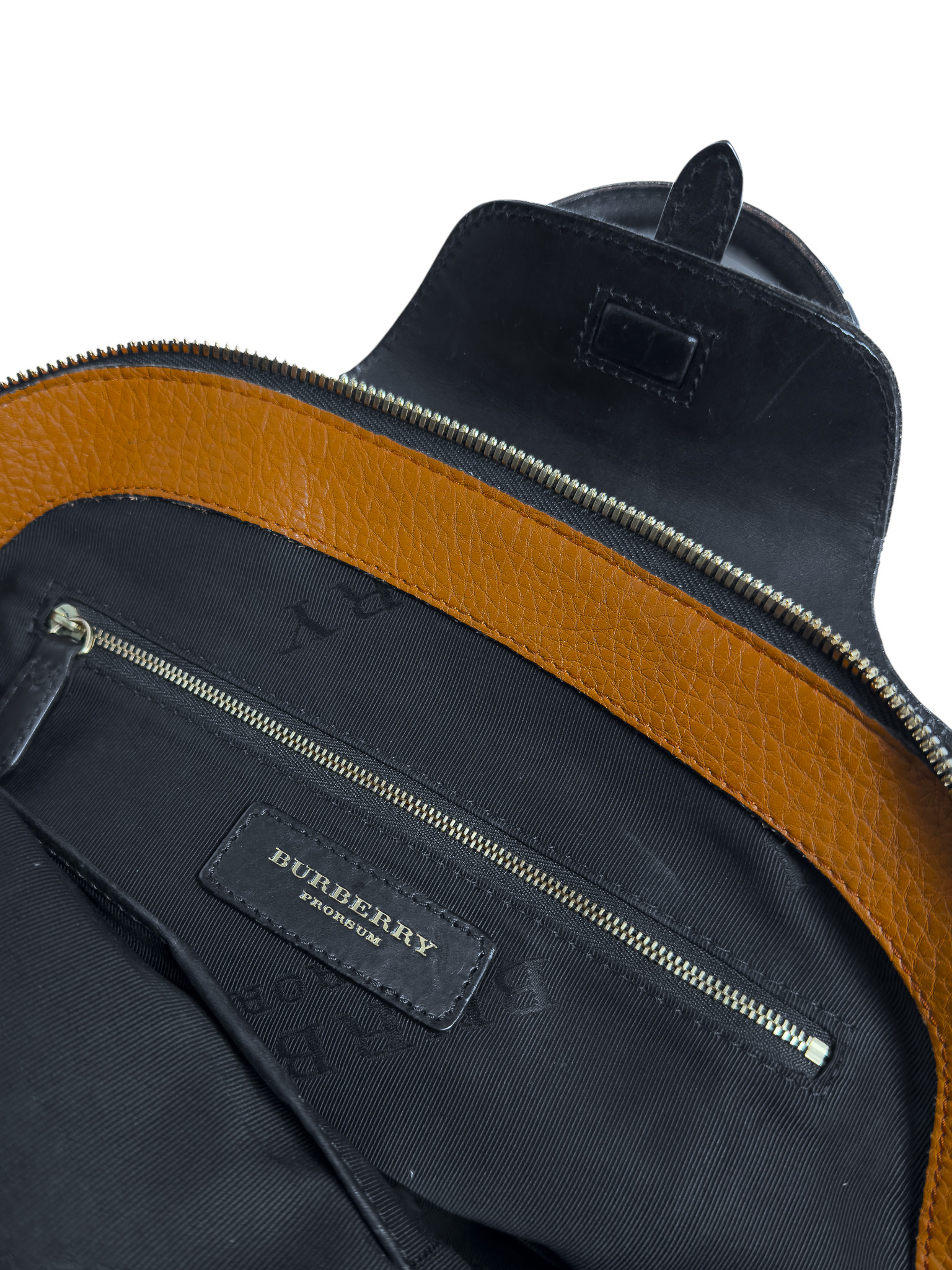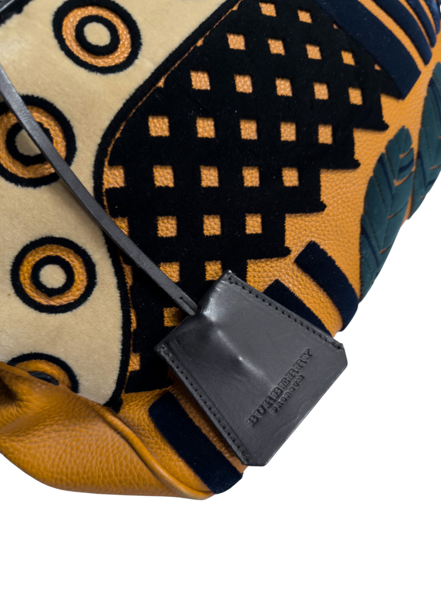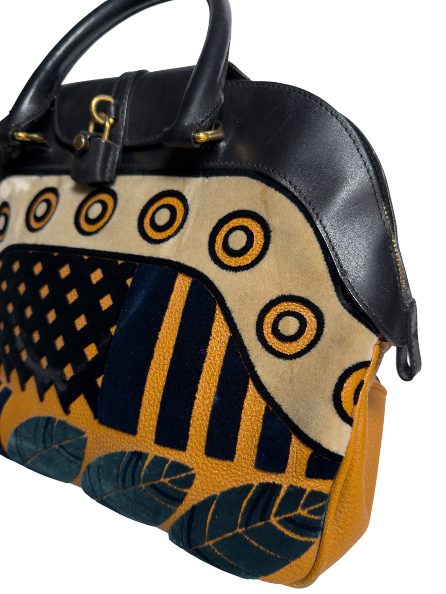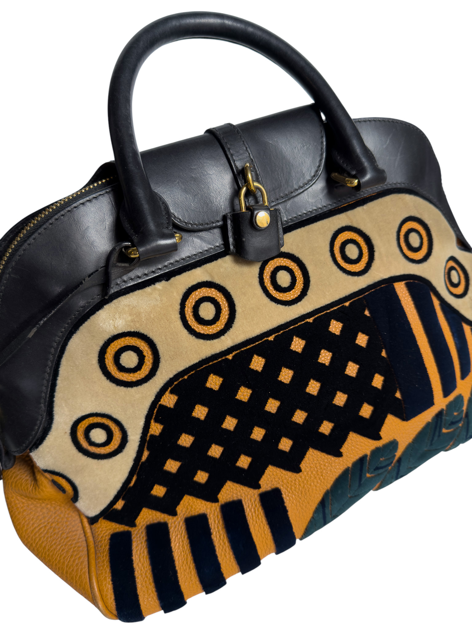 "Czarno pomarańczowa torba wykonana ze skóry z kolorowymi pluszowymi wzorami. Miejscami rysy na skórze i przetarcia na materiale. Wymiary: 36x28x15cm, rączki: 36cm"