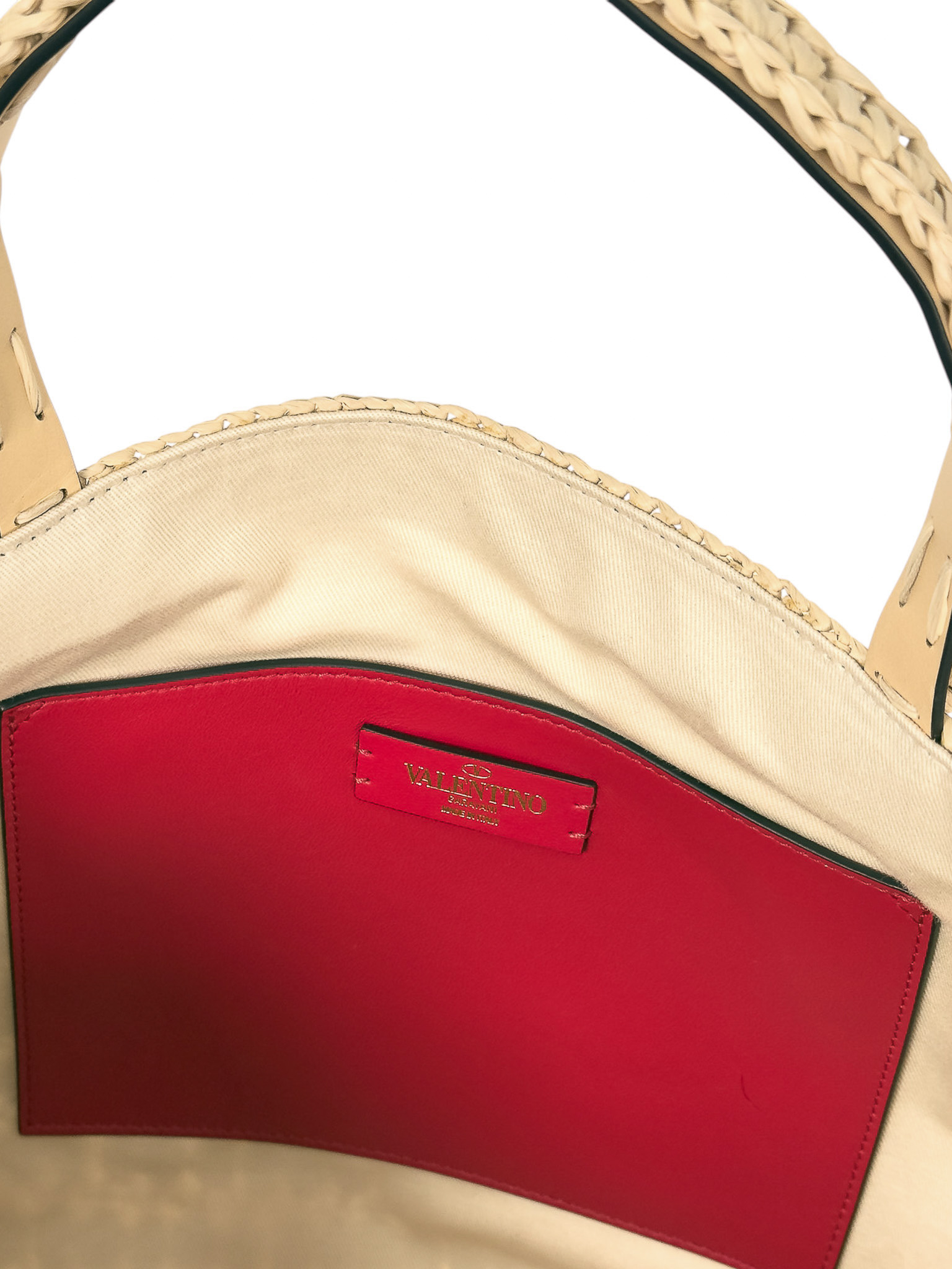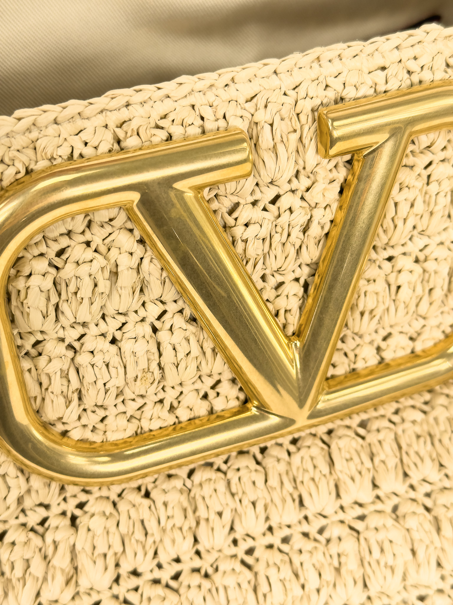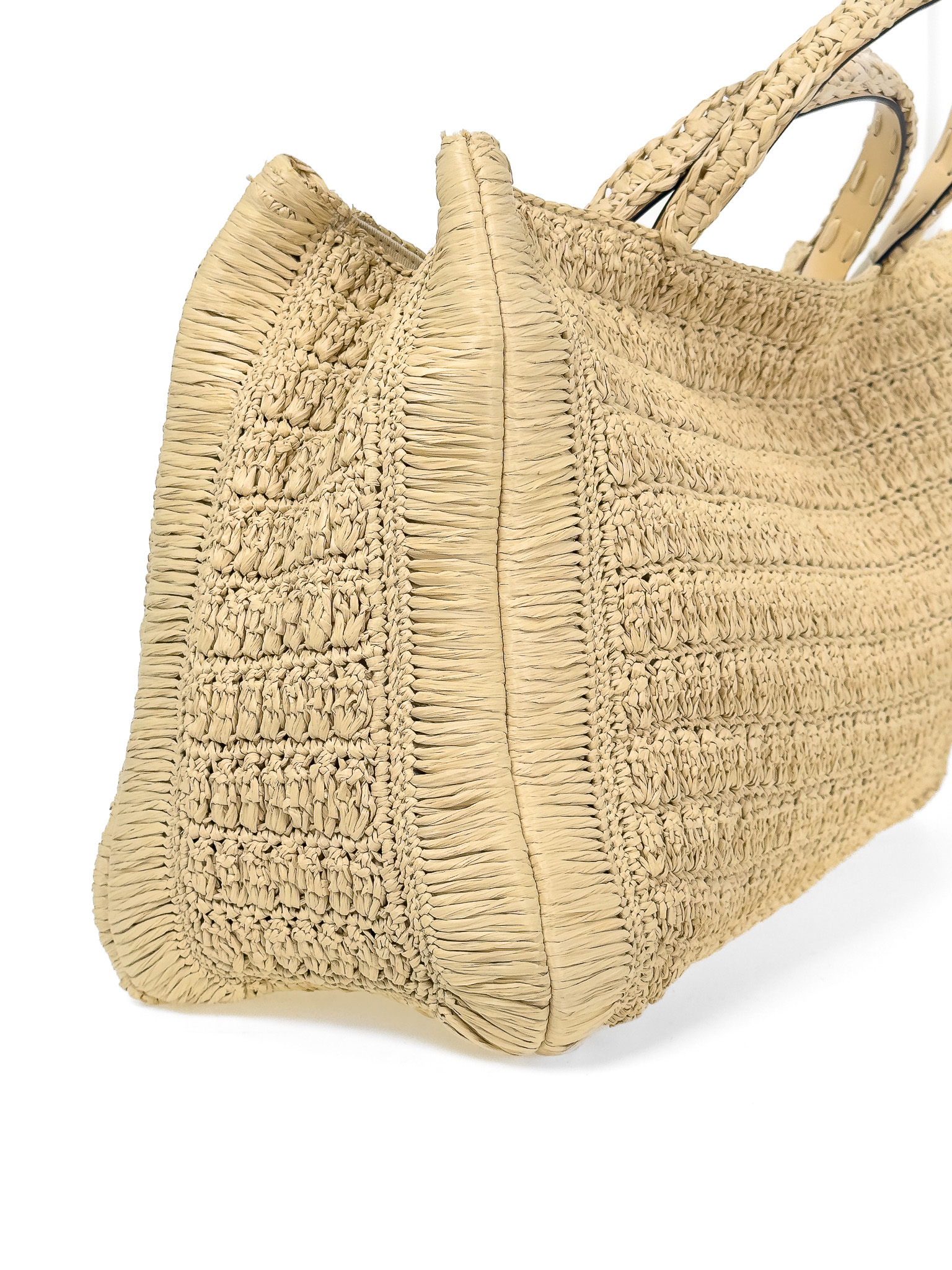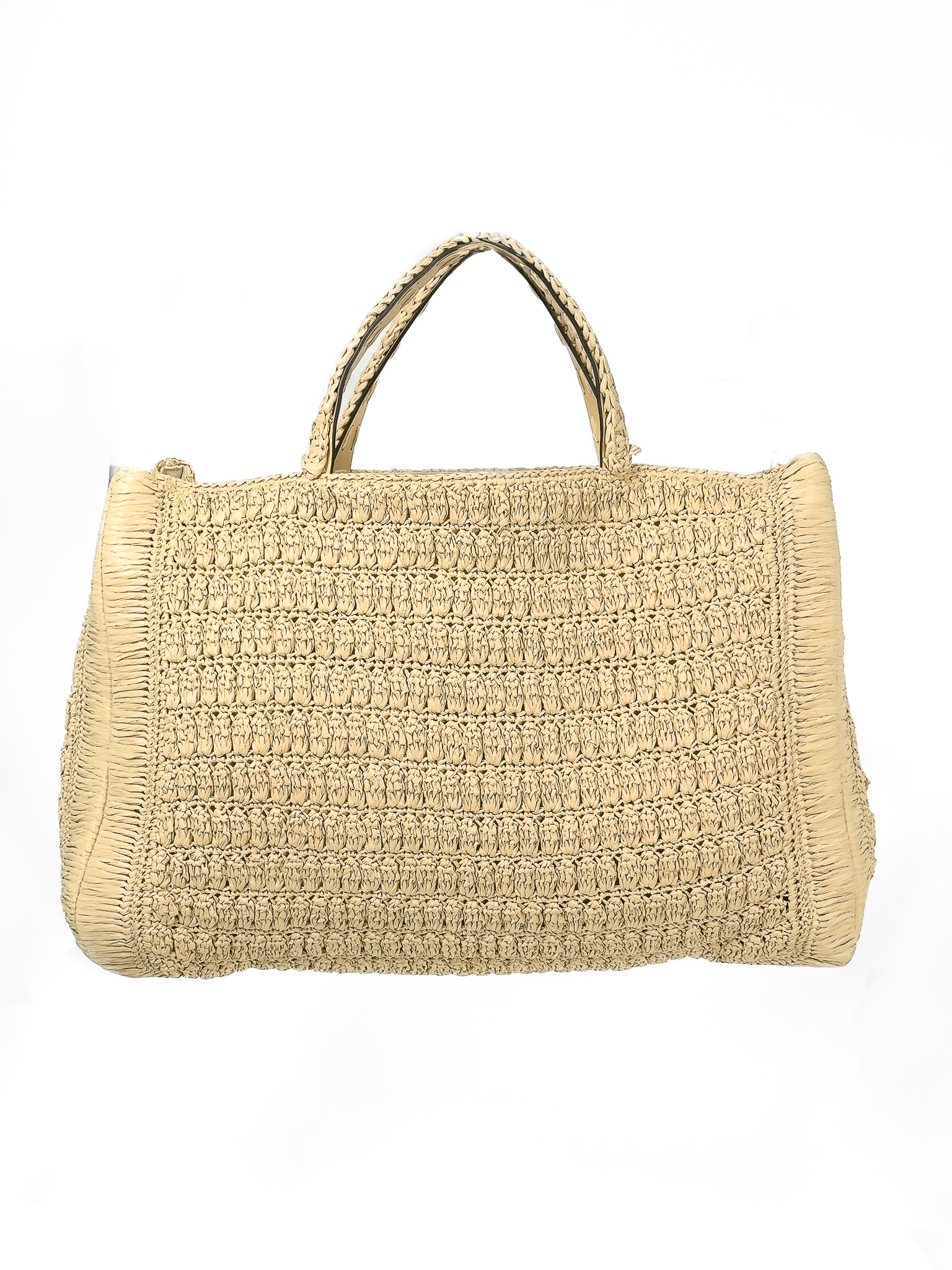 "Beżowa torba do ręki wykonana z rafii, duże złote logo marki na przodzie, dwa uchwyty do ręki, prostokątny kształt, materiałowe wnętrze, jedna skórzana czerwona kieszeń wewnątrz, zestawie z rachunkiem. Stan bardzo dobry, posiada delikatne ślady użytkowania. Wymiary: szerokość 46cm, wysokość 30cm, głębokość 17cm."