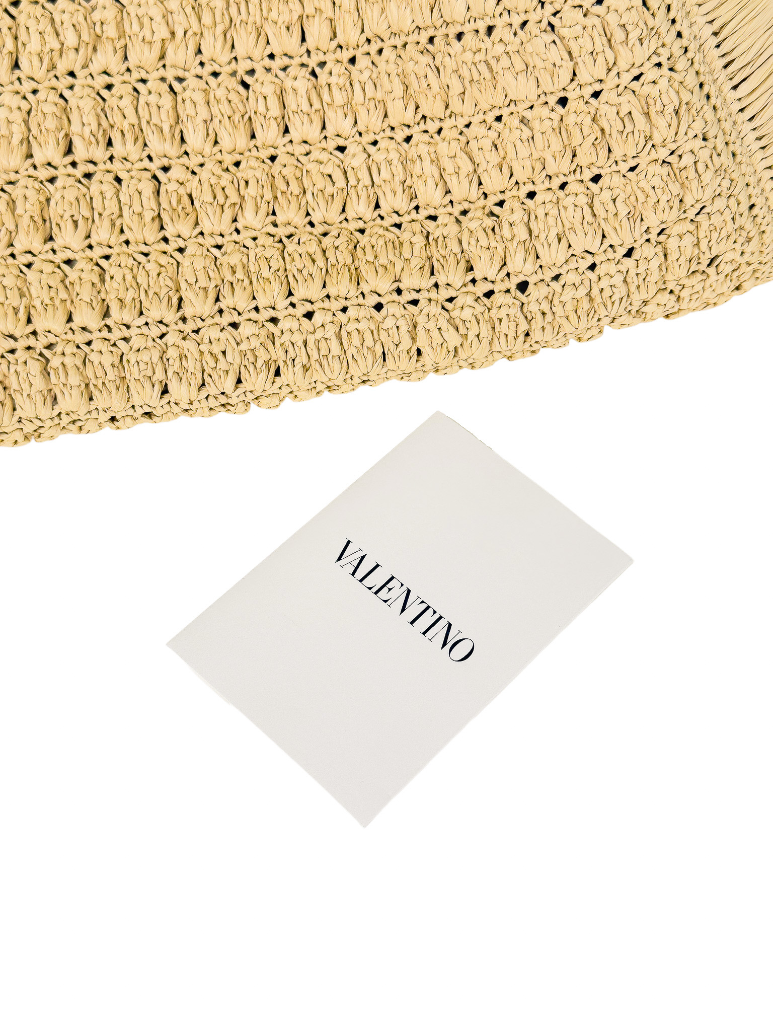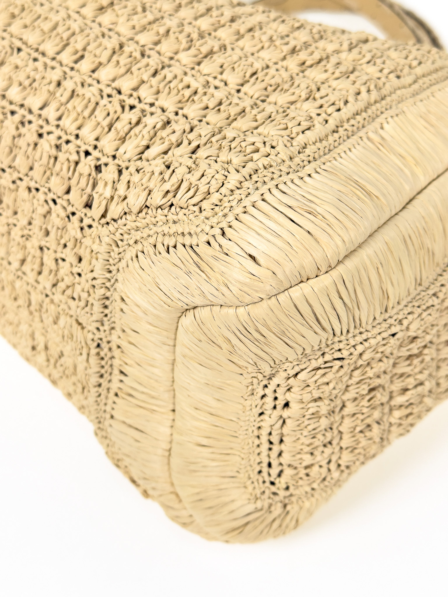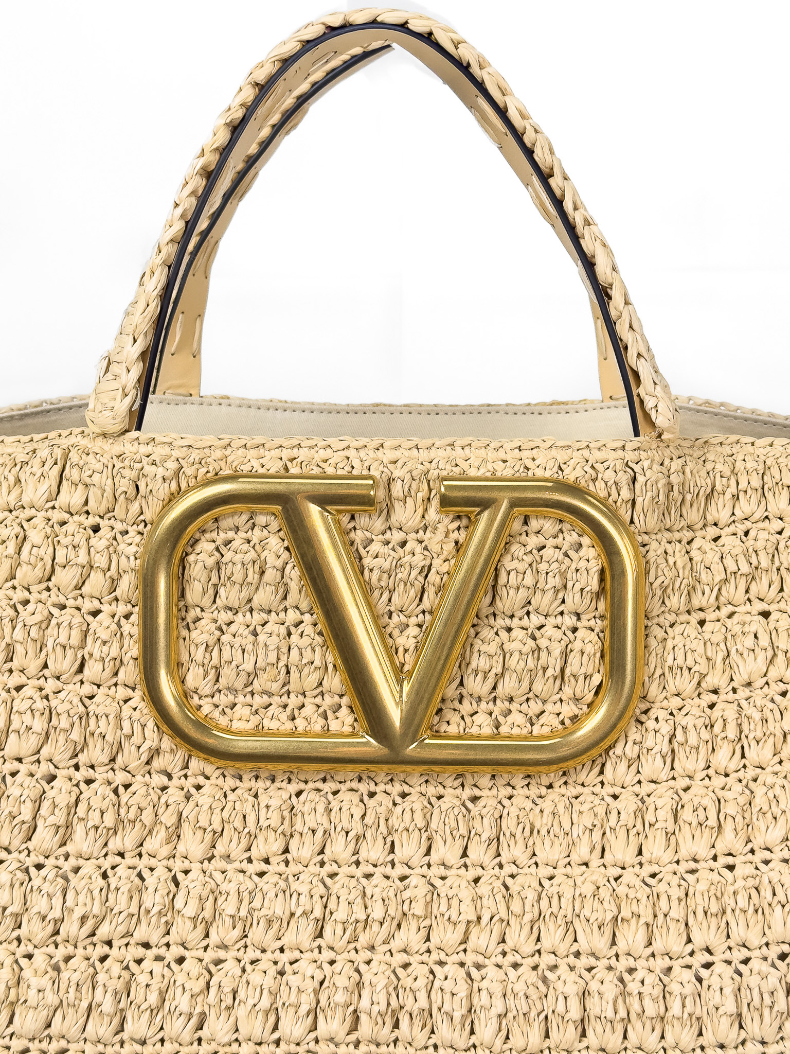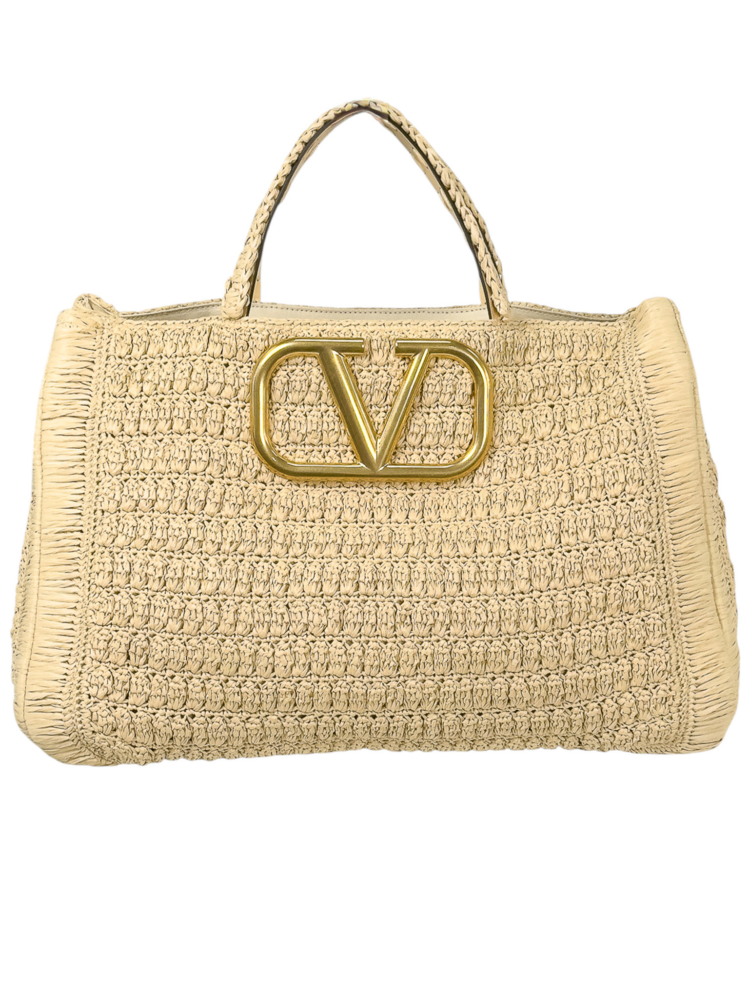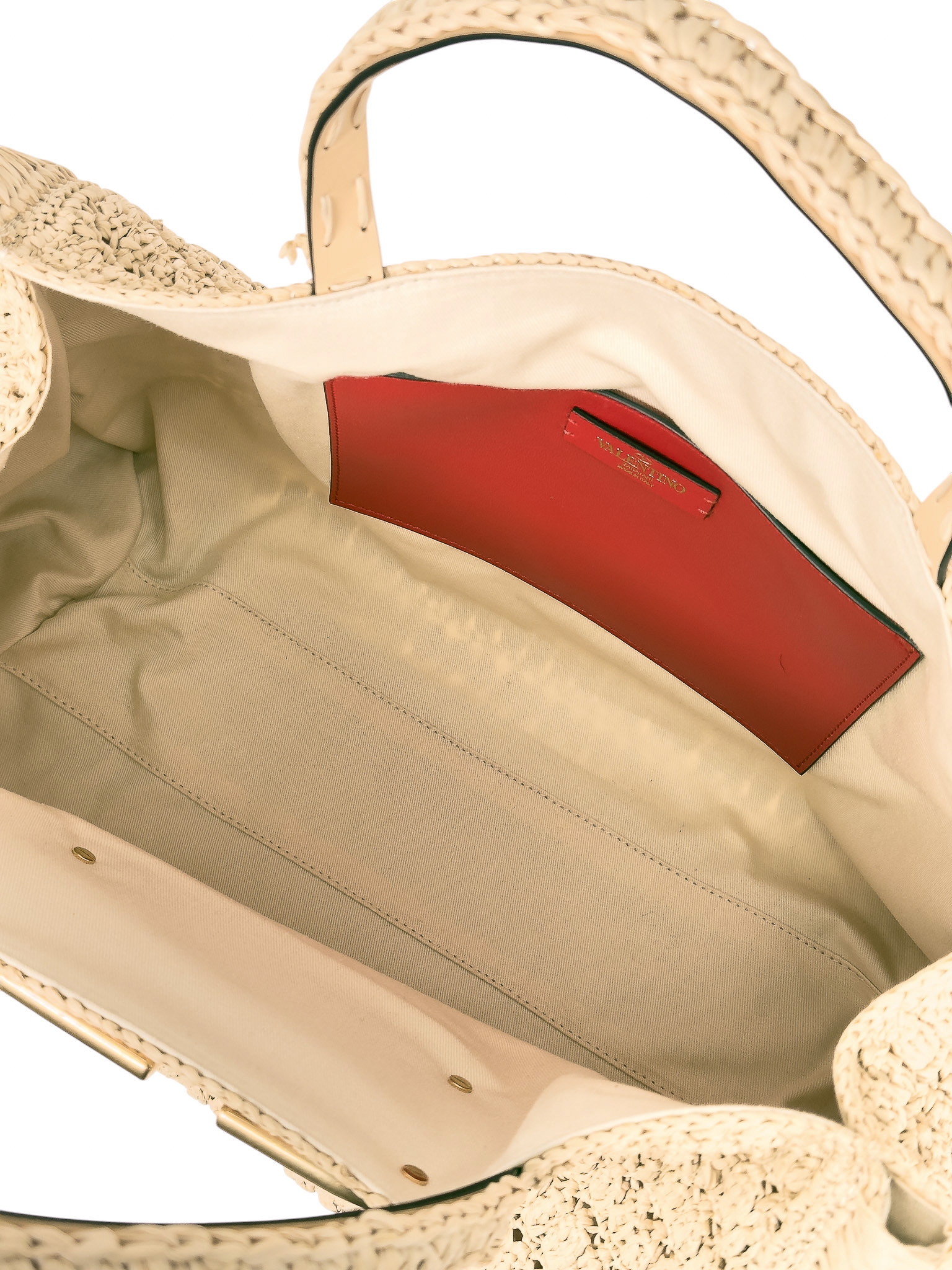 "Beżowa torba do ręki wykonana z rafii, duże złote logo marki na przodzie, dwa uchwyty do ręki, prostokątny kształt, materiałowe wnętrze, jedna skórzana czerwona kieszeń wewnątrz, zestawie z rachunkiem. Stan bardzo dobry, posiada delikatne ślady użytkowania. Wymiary: szerokość 46cm, wysokość 30cm, głębokość 17cm."