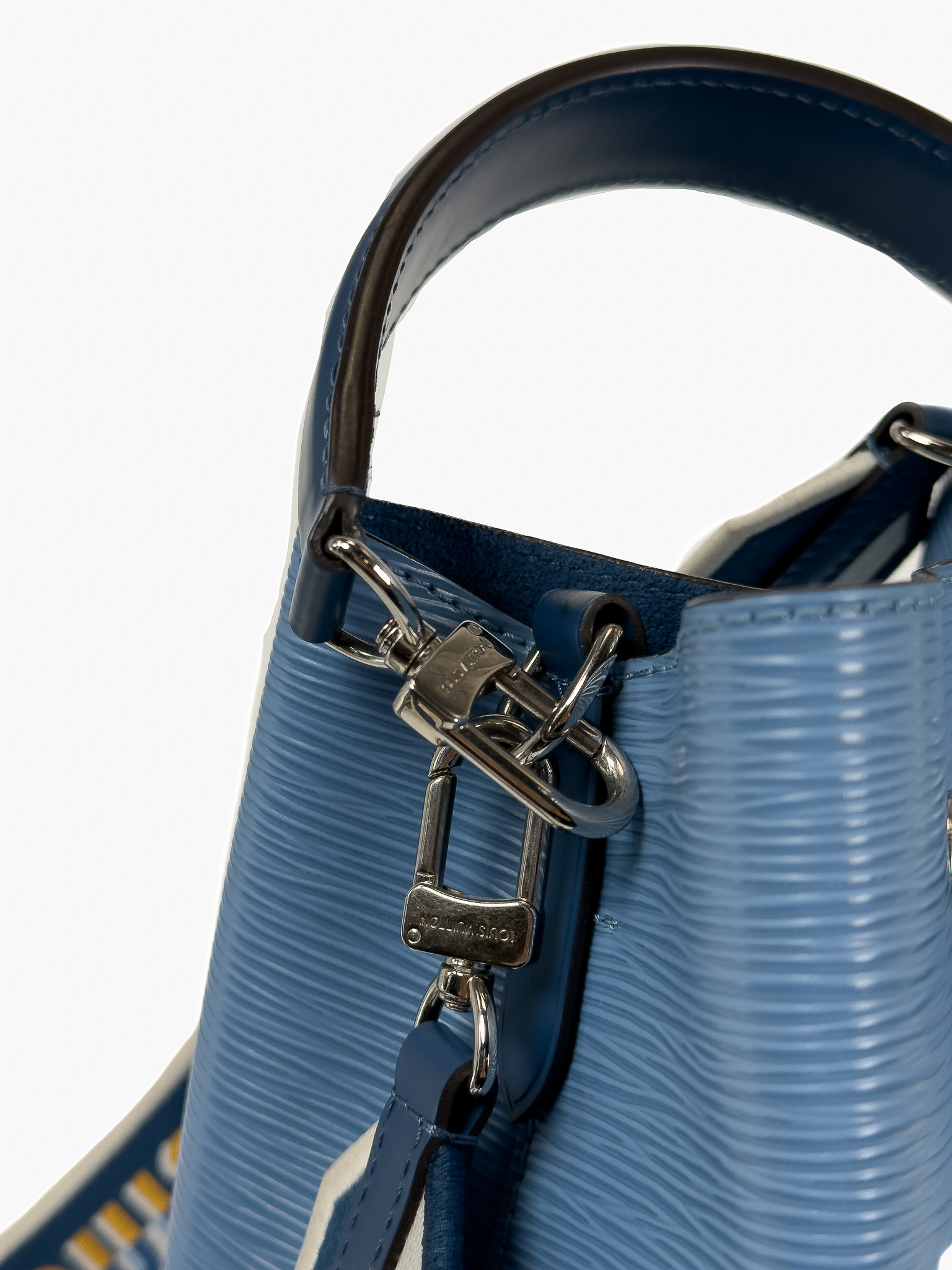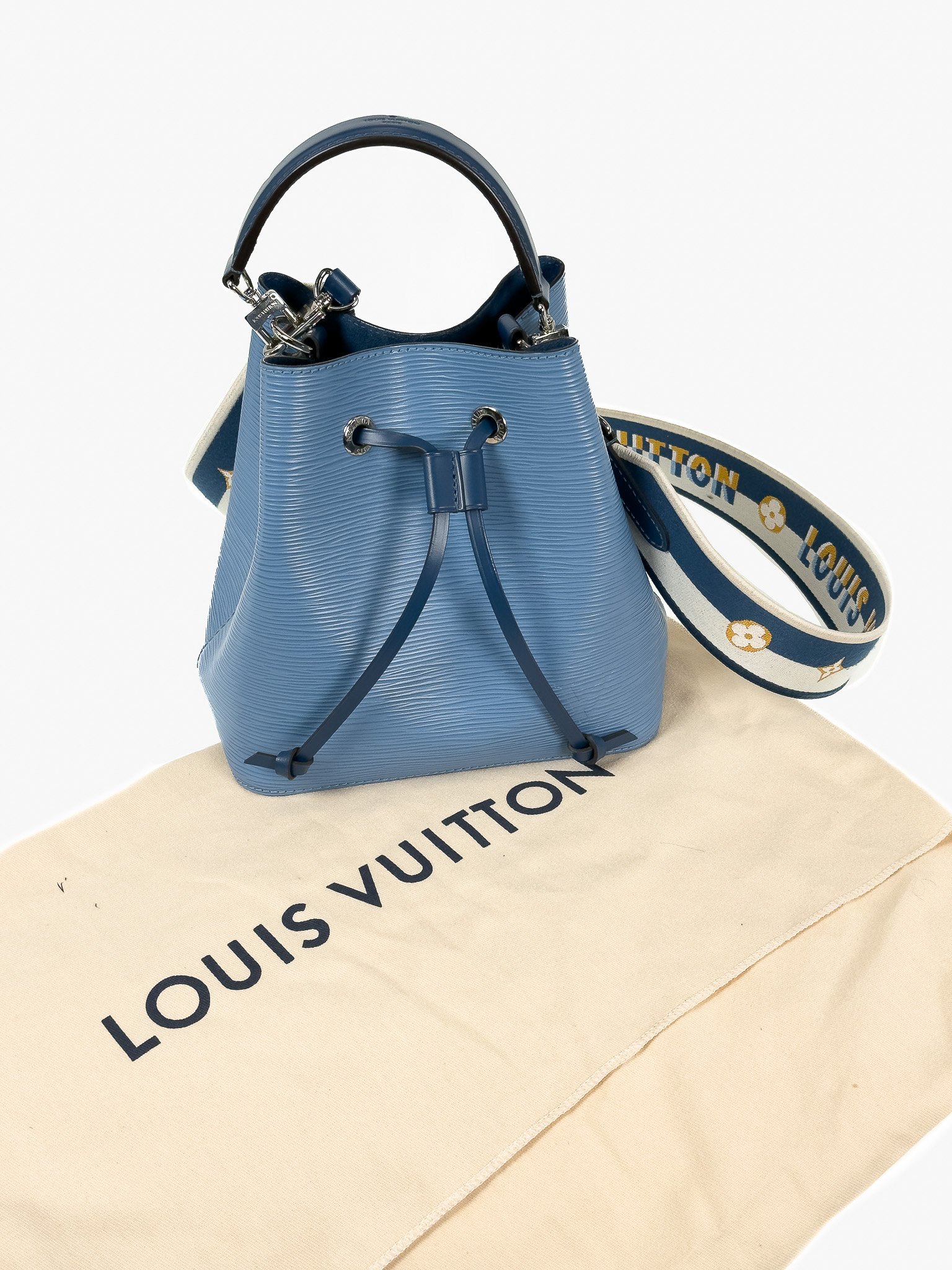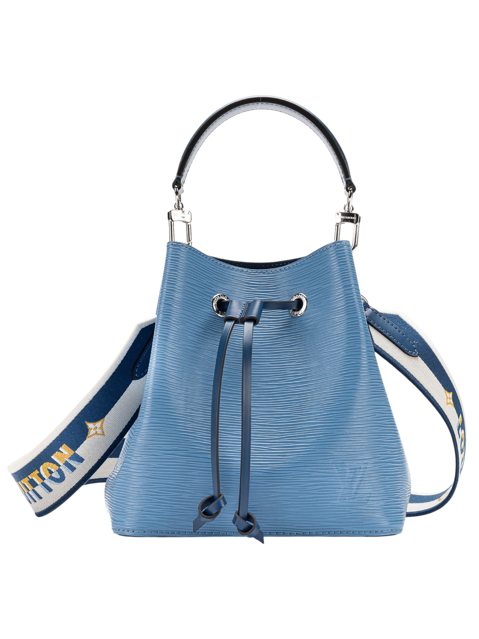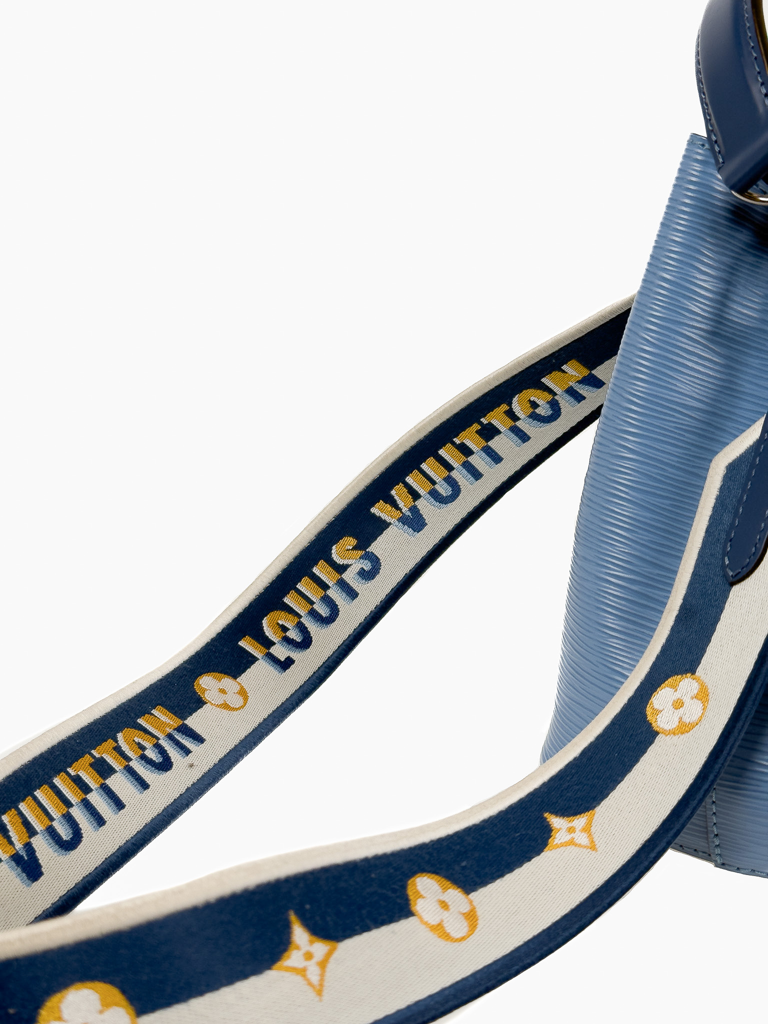 "Model: NeoNoe BB Epi. Niebieska torebka na ramię/ do ręki, skóra epi, ściągana w górnej części, uchwyt do ręki, biało-żółto-niebieski długi materiałowy, logowany pasek na ramię, srebrne okucia, dwie komory oraz kieszeń na środku. W zestawie: pudełko oraz worek przeciwkurzowy. Stan idealny. Wymiary: szerokość 20cm, wysokość 21cm, głębokość 14cm."