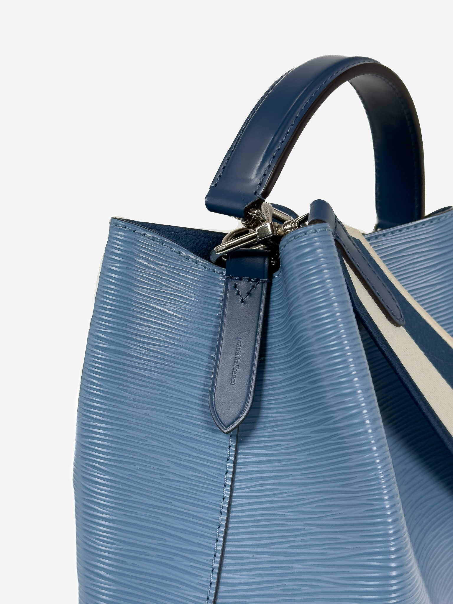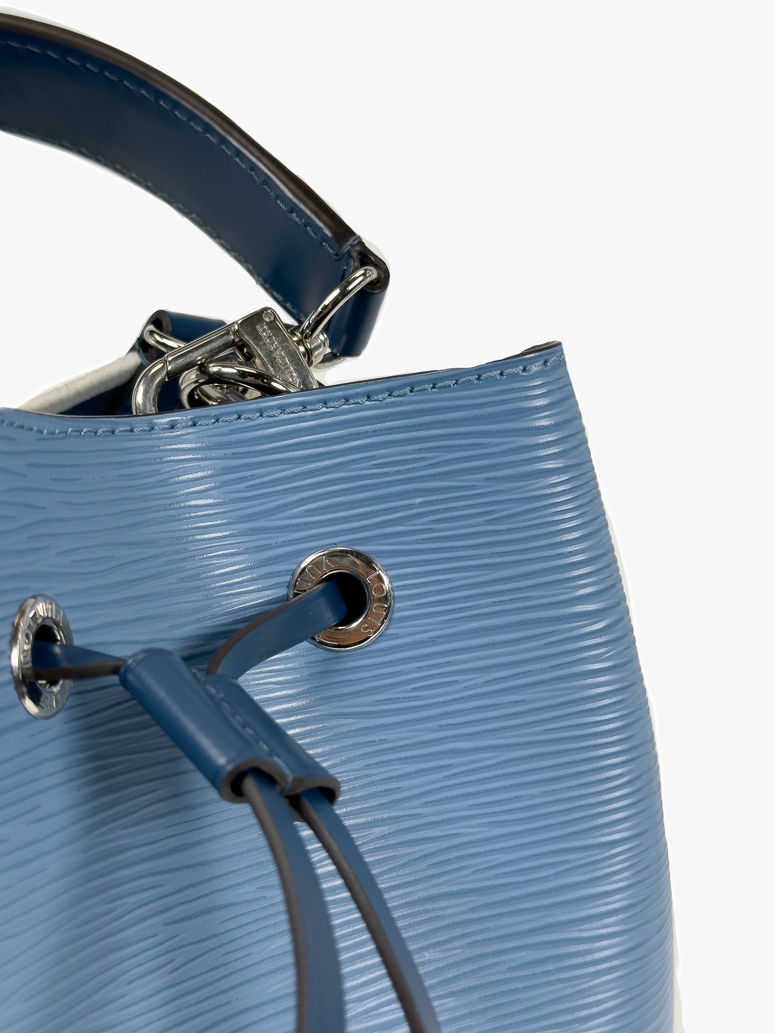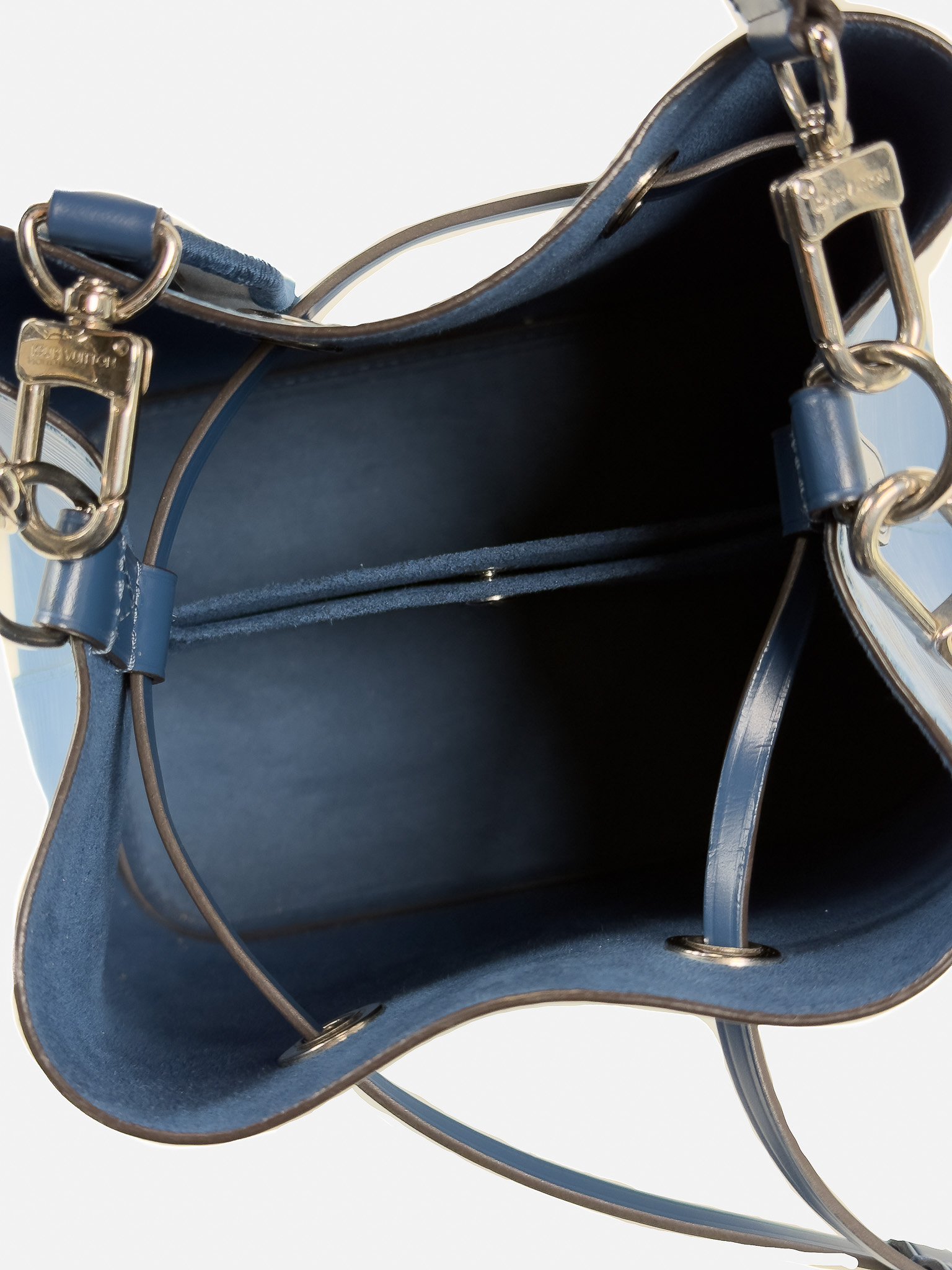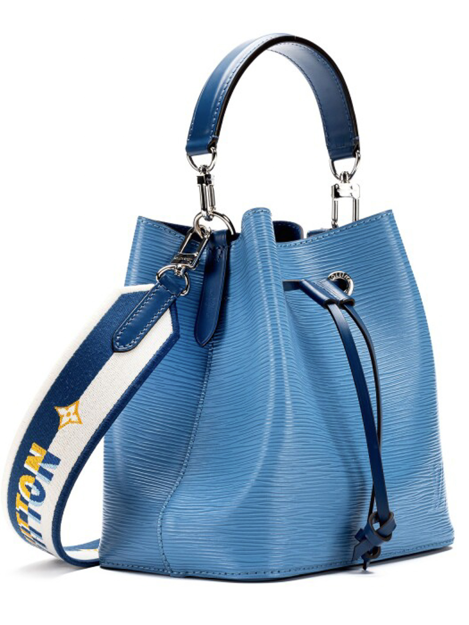 "Model: NeoNoe BB Epi. Niebieska torebka na ramię/ do ręki, skóra epi, ściągana w górnej części, uchwyt do ręki, biało-żółto-niebieski długi materiałowy, logowany pasek na ramię, srebrne okucia, dwie komory oraz kieszeń na środku. W zestawie: pudełko oraz worek przeciwkurzowy. Stan idealny. Wymiary: szerokość 20cm, wysokość 21cm, głębokość 14cm."