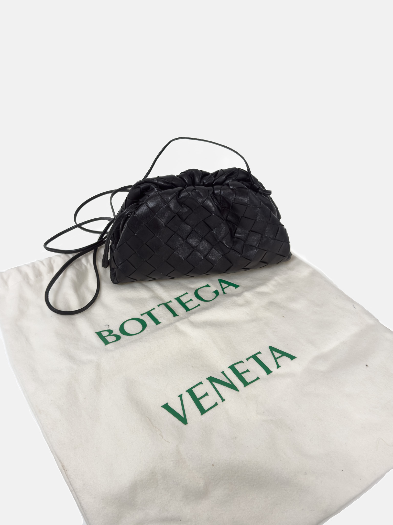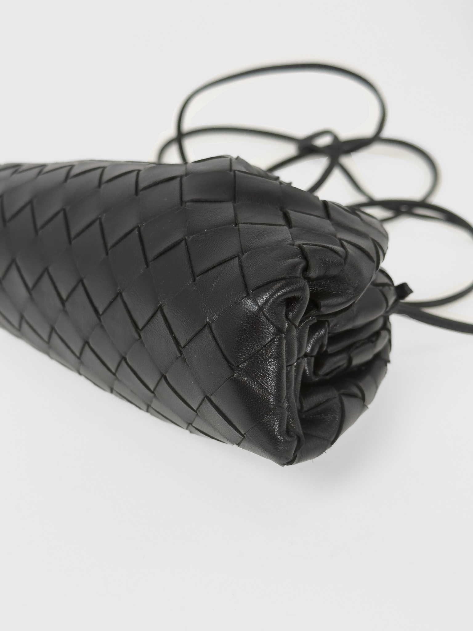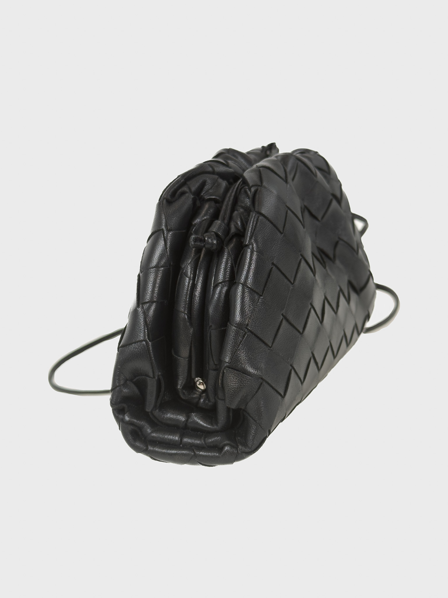 "Model: The Mini Pouch. Czarna torebka wykonana z plecionej skóry, charakterystycznej dla marki, zamykana na magnetyczny zatrzask, cienki pasek na ramię, komora wewnątrz. Stan bardzo dobry. Wymiary: wysokość 13cm, szerokość 22cm."