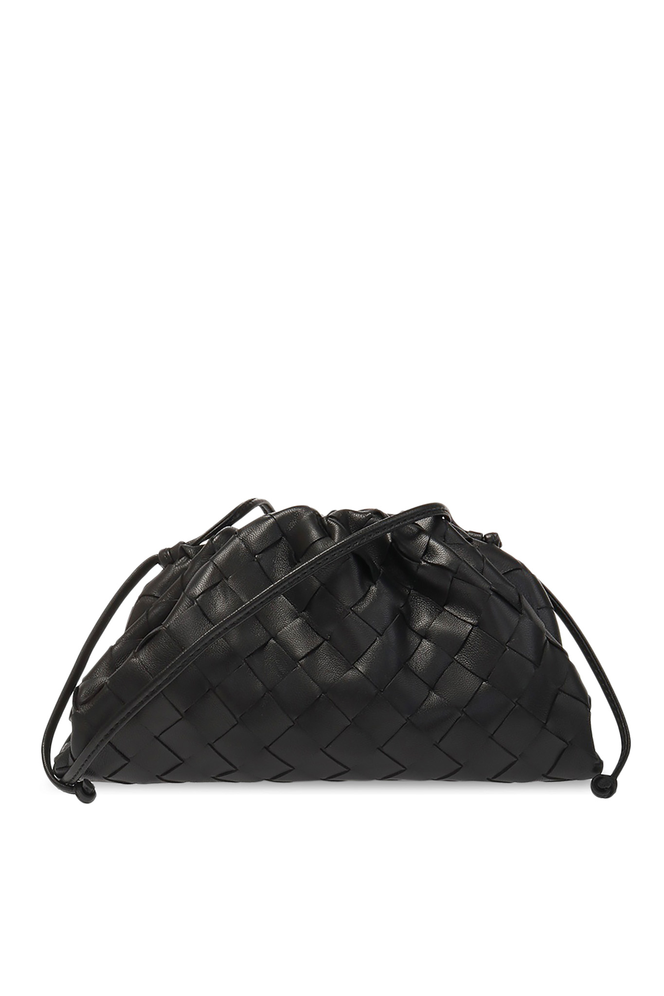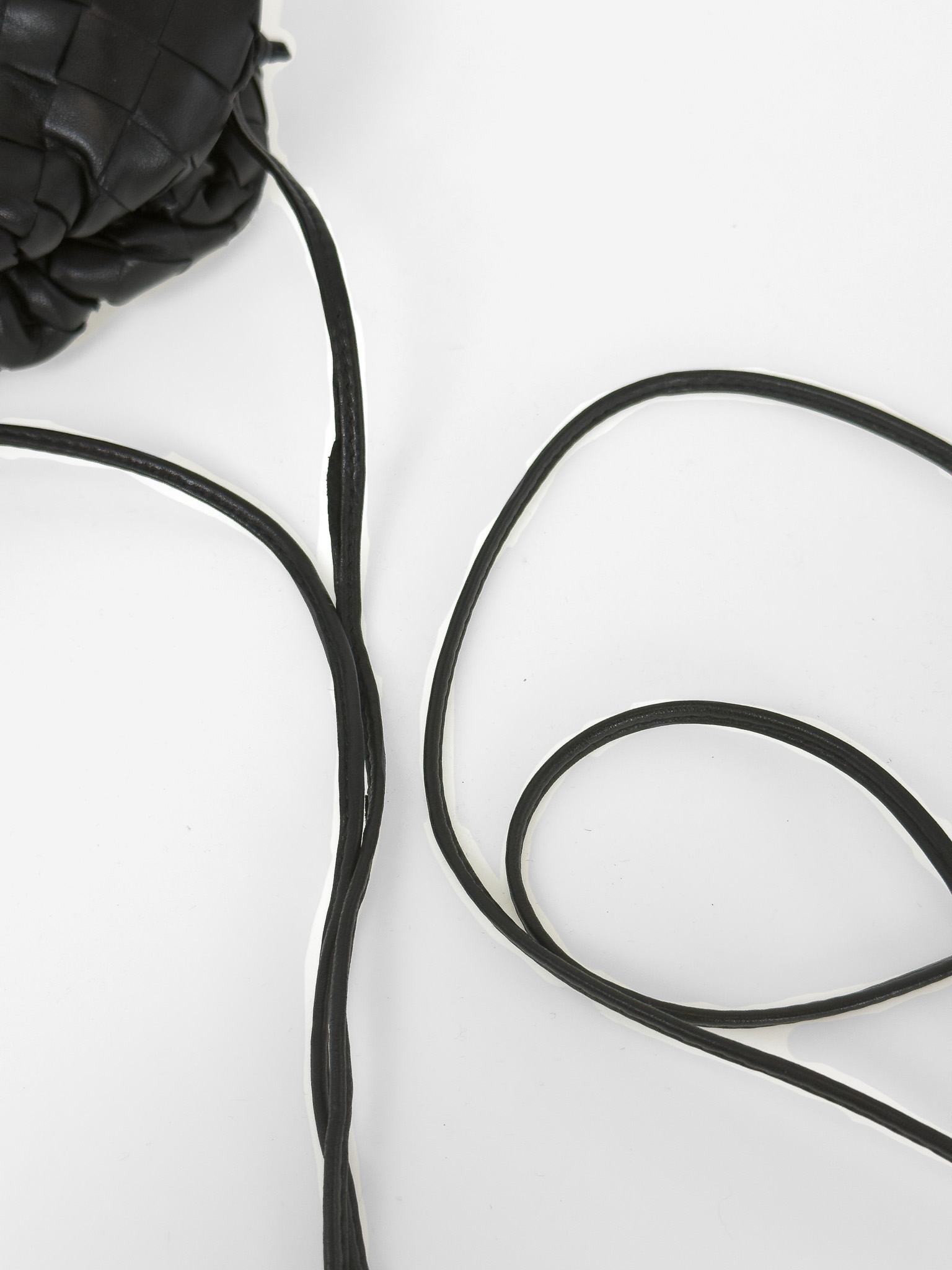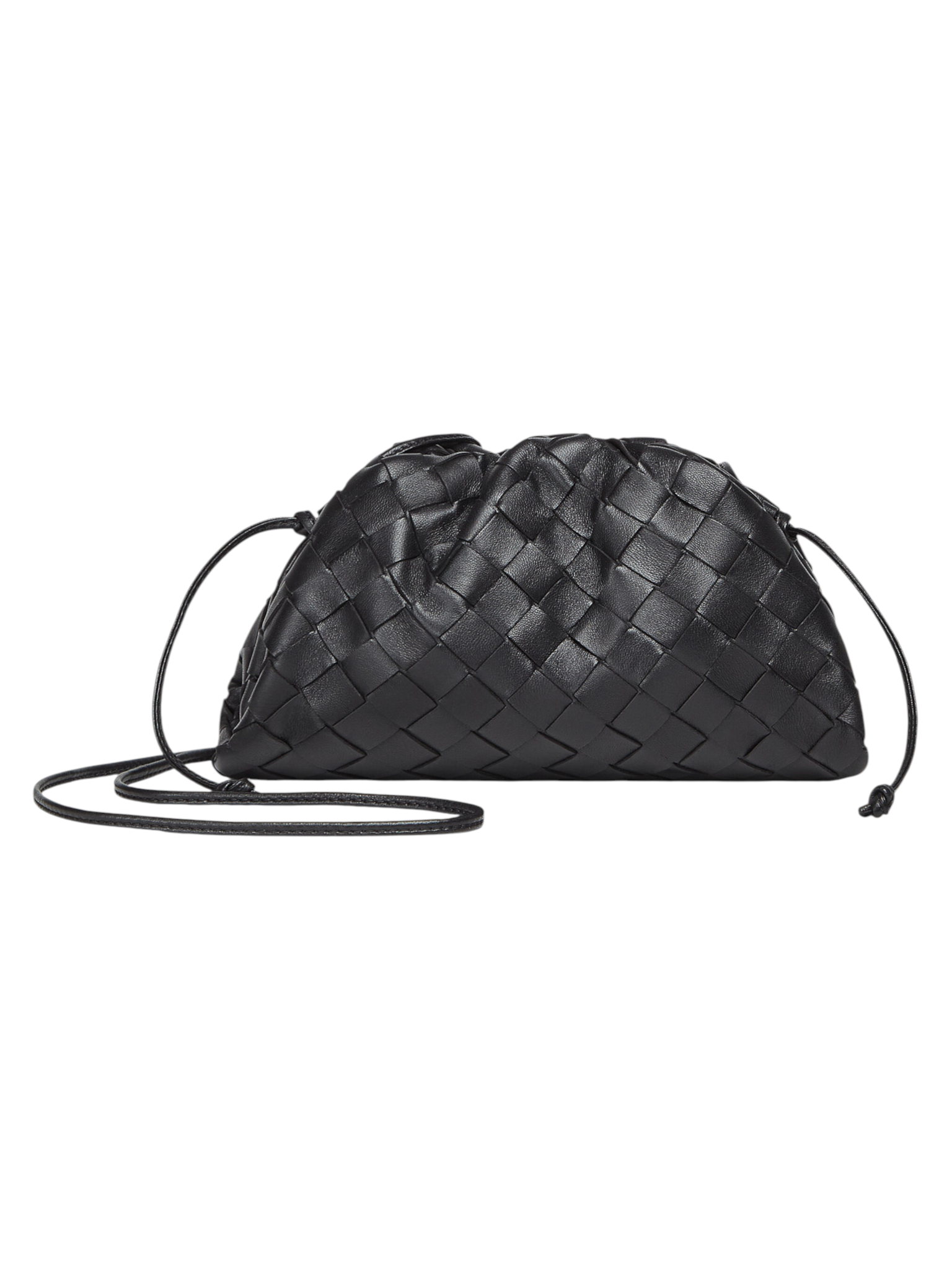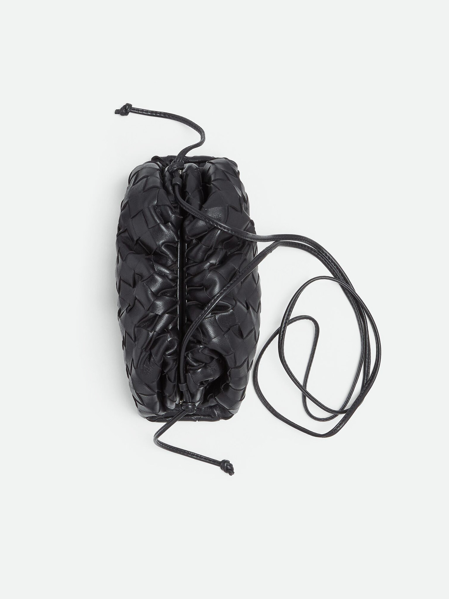 "Model: The Mini Pouch. Czarna torebka wykonana z plecionej skóry, charakterystycznej dla marki, zamykana na magnetyczny zatrzask, cienki pasek na ramię, komora wewnątrz. Stan bardzo dobry. Wymiary: wysokość 13cm, szerokość 22cm."