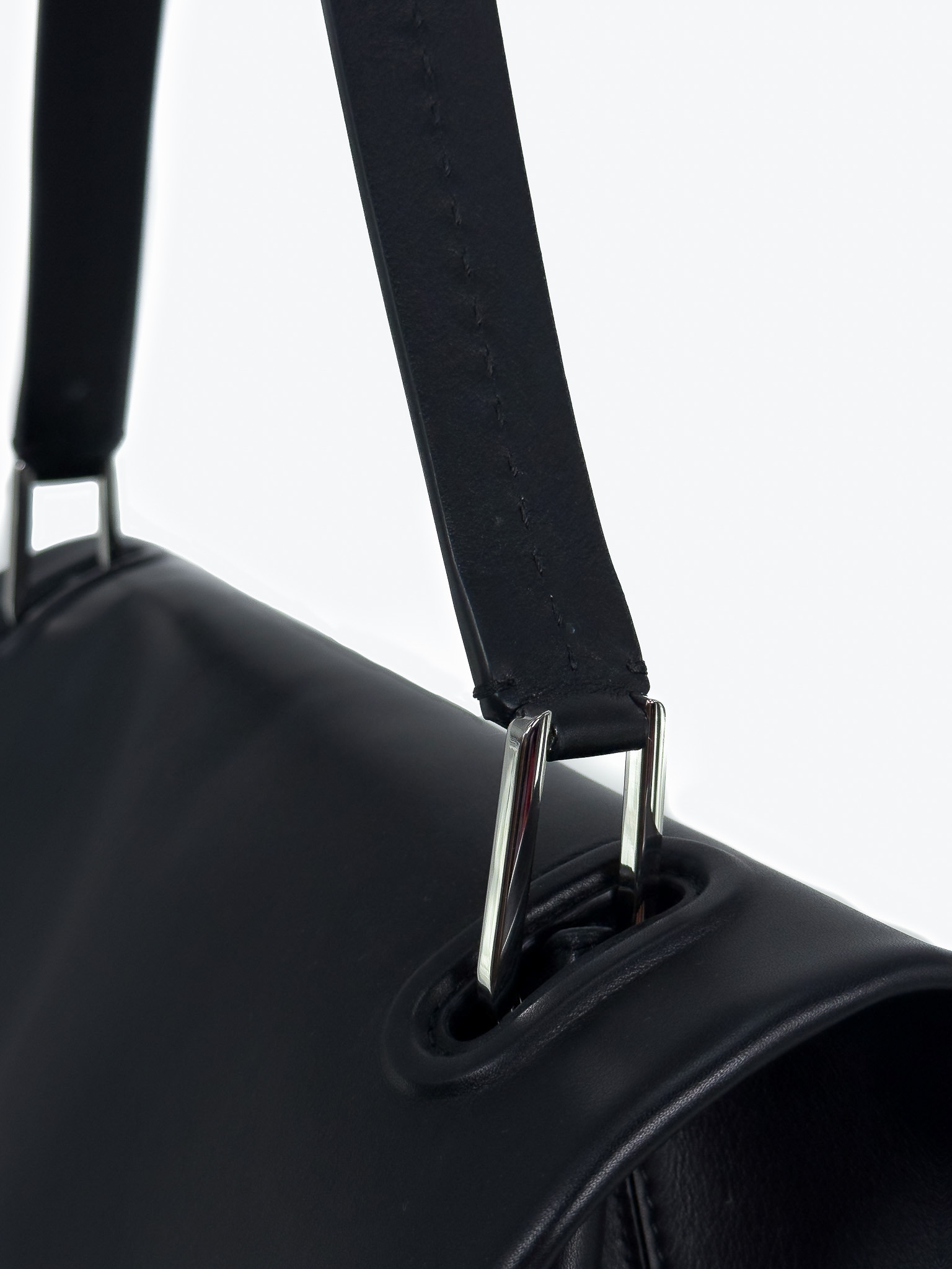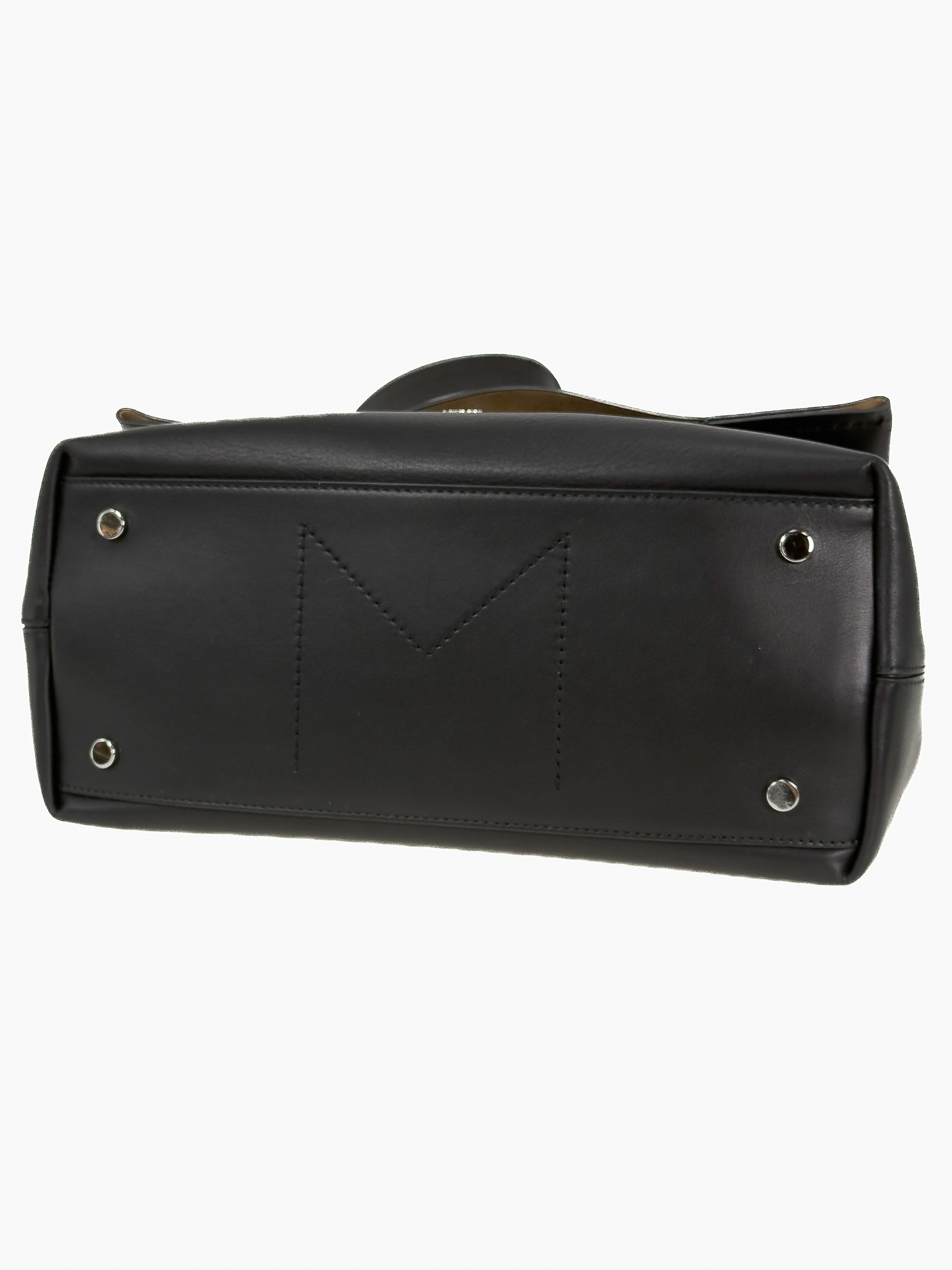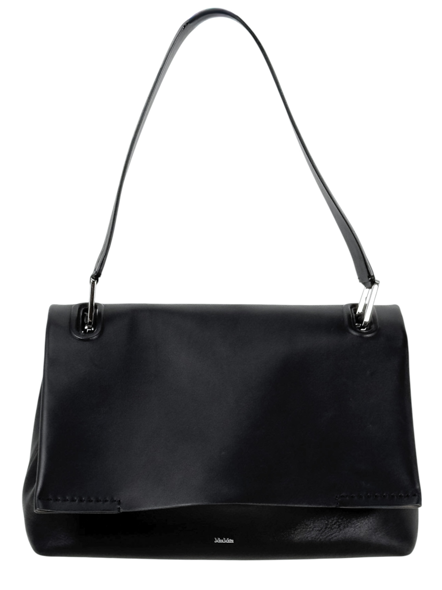 "Czarna skórzana torebka na ramię, miękka skóra, jeden uchwyt, wykończona dekoracyjnym przeszyciem, logo marki pod klapą, srebrne okucia, cztery nóżki od spodu, brązowe wnętrze, jedna komora z kieszenią, w zestawie z workiem przeciwkurzowym. Stan bardzo dobry, posiada delikatne zarysowania na skórze oraz nóżkach, plamy od długopisu wewnątrz. Wymiary: szerokość 34cm, wysokość 23cm, głębokość 16cm."