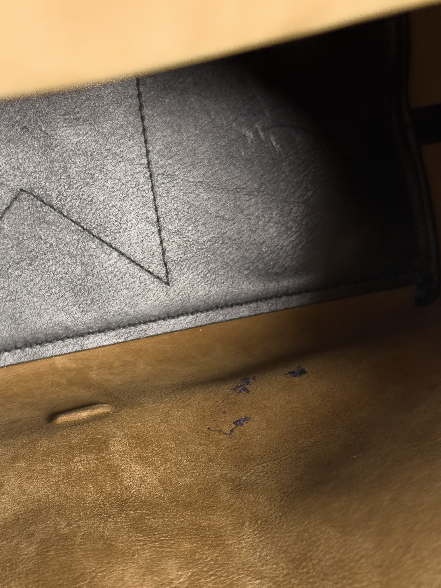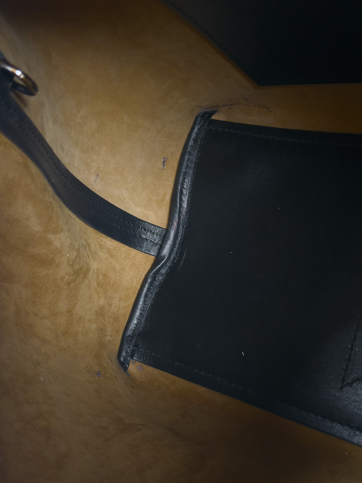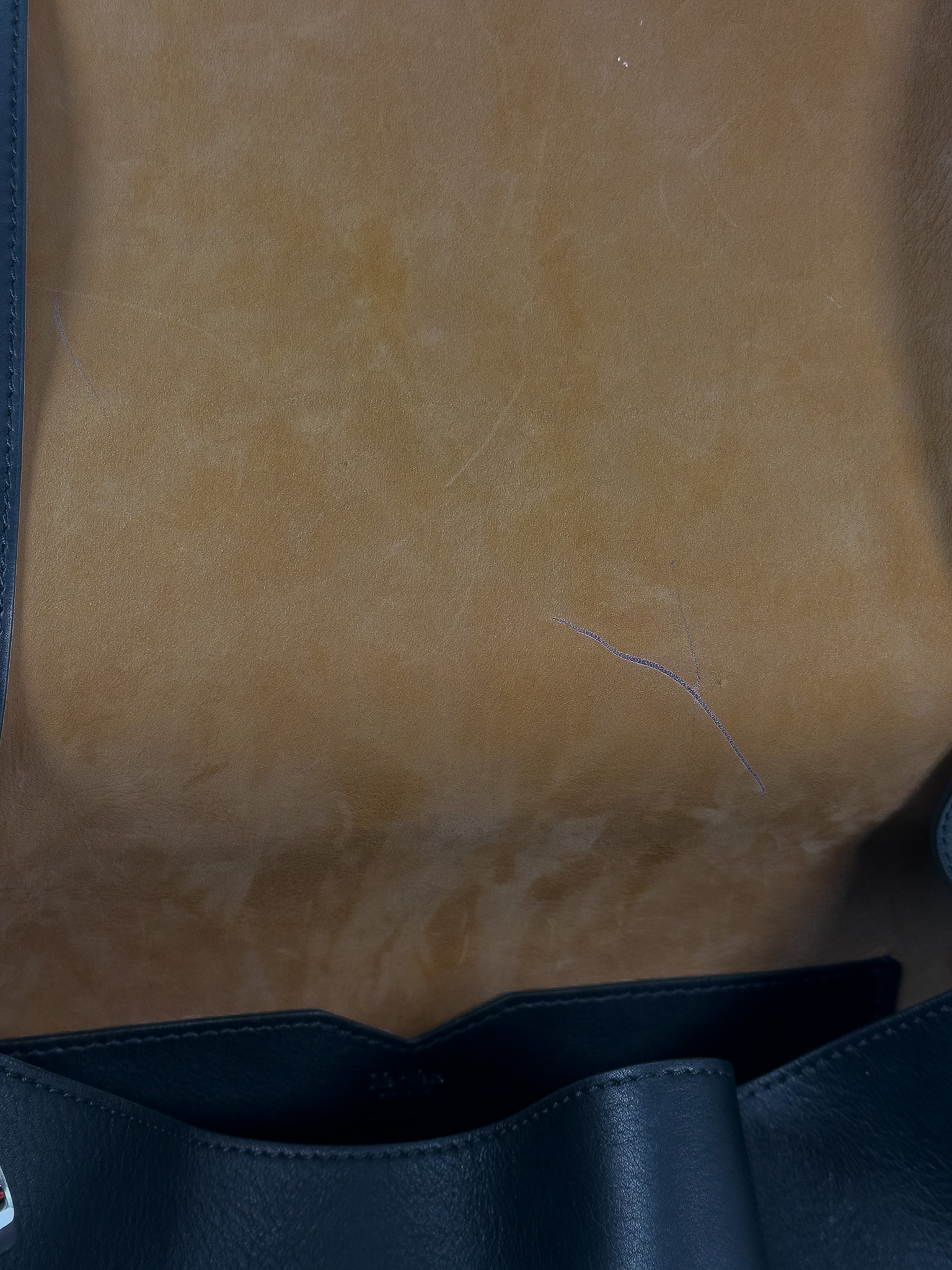 "Czarna skórzana torebka na ramię, miękka skóra, jeden uchwyt, wykończona dekoracyjnym przeszyciem, logo marki pod klapą, srebrne okucia, cztery nóżki od spodu, brązowe wnętrze, jedna komora z kieszenią, w zestawie z workiem przeciwkurzowym. Stan bardzo dobry, posiada delikatne zarysowania na skórze oraz nóżkach, plamy od długopisu wewnątrz. Wymiary: szerokość 34cm, wysokość 23cm, głębokość 16cm."
