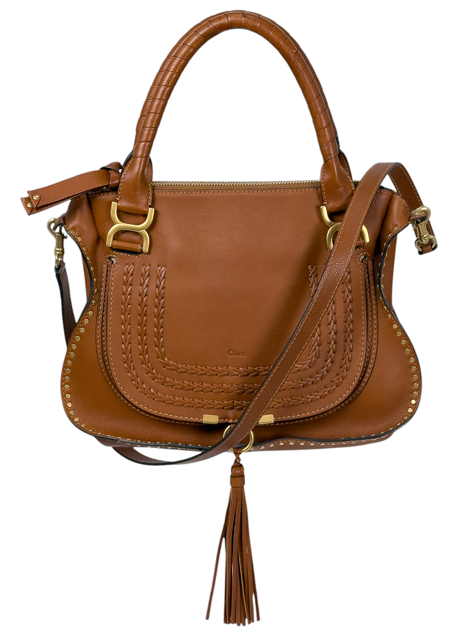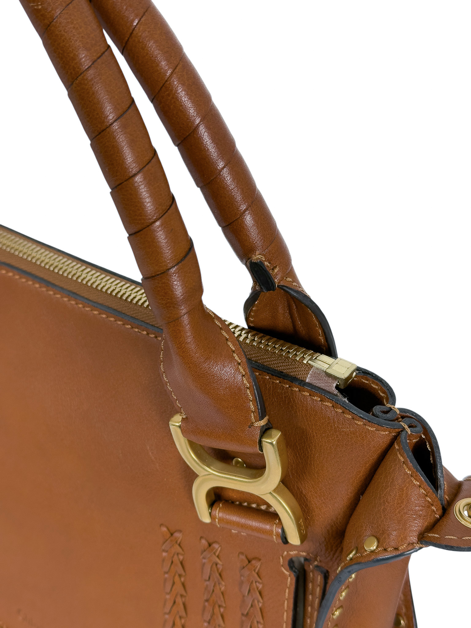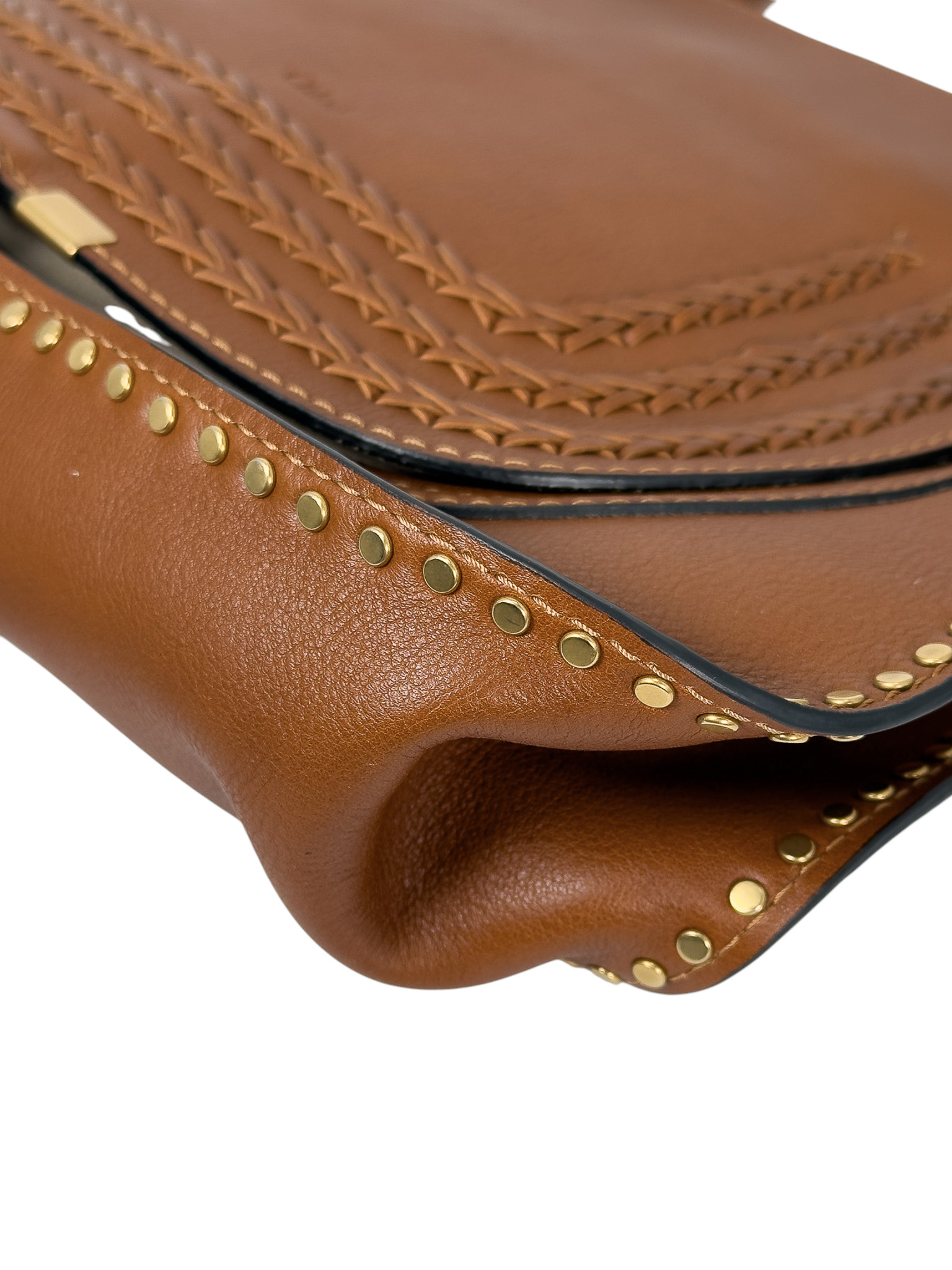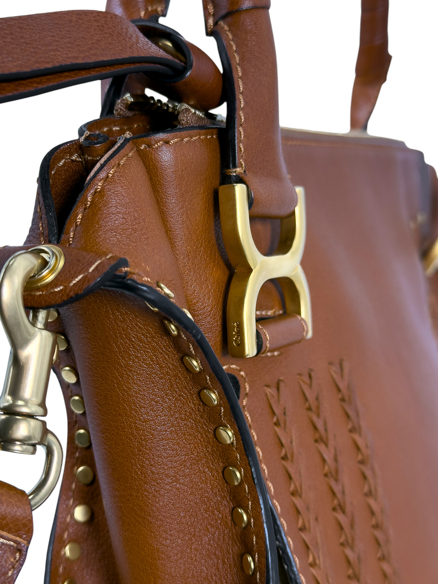 "Model: Marcie. Skórzana torebka średniej wielkości w kolorze karmelowym. Posiada ozdobne przeplatania z przodu torebki oraz ćwieki w kolorze złota przy szwach, mała zewnętrzna kieszonka z chwostem zapinana na magnes. Możliwość noszenia do ręki jak i na ramię. Odpinany dłuższy pasek. Wewnątrz mna podszewce posiada niewielkie ślady z długopisu. Z zewnątrz stan idealny. Wymiary: wysokość 30 cm, szerokość 36 cm, głębokość 12 cm."