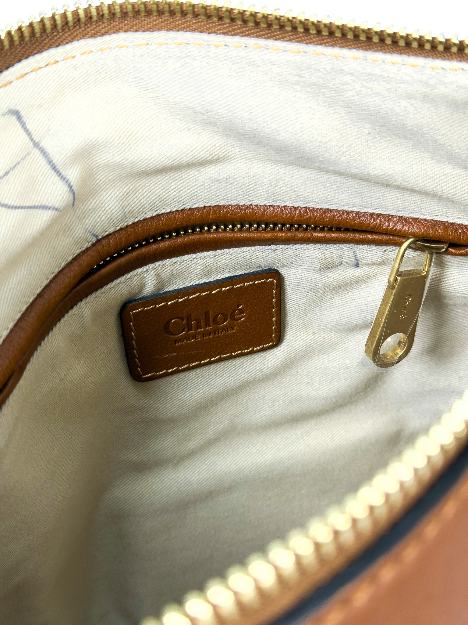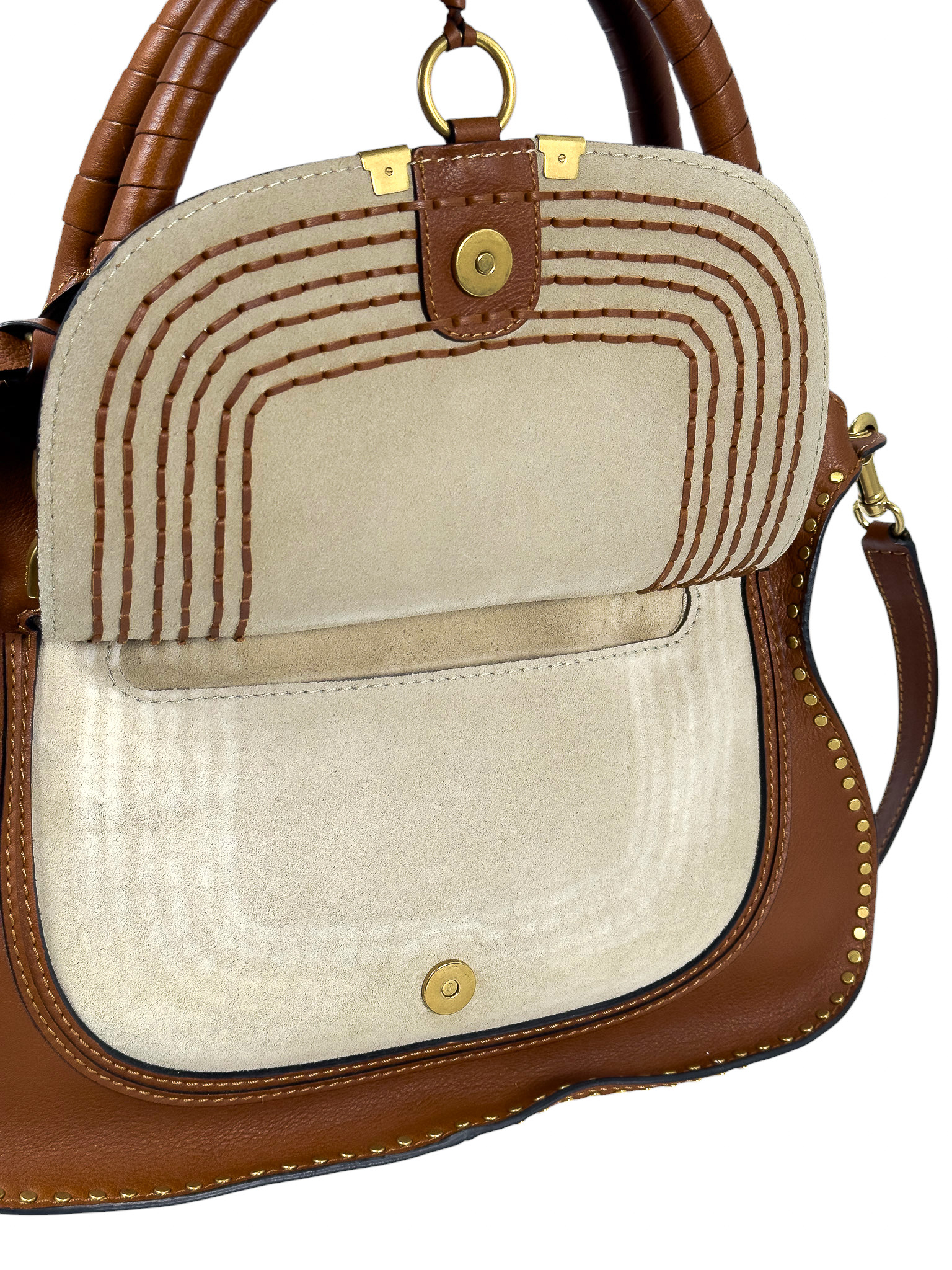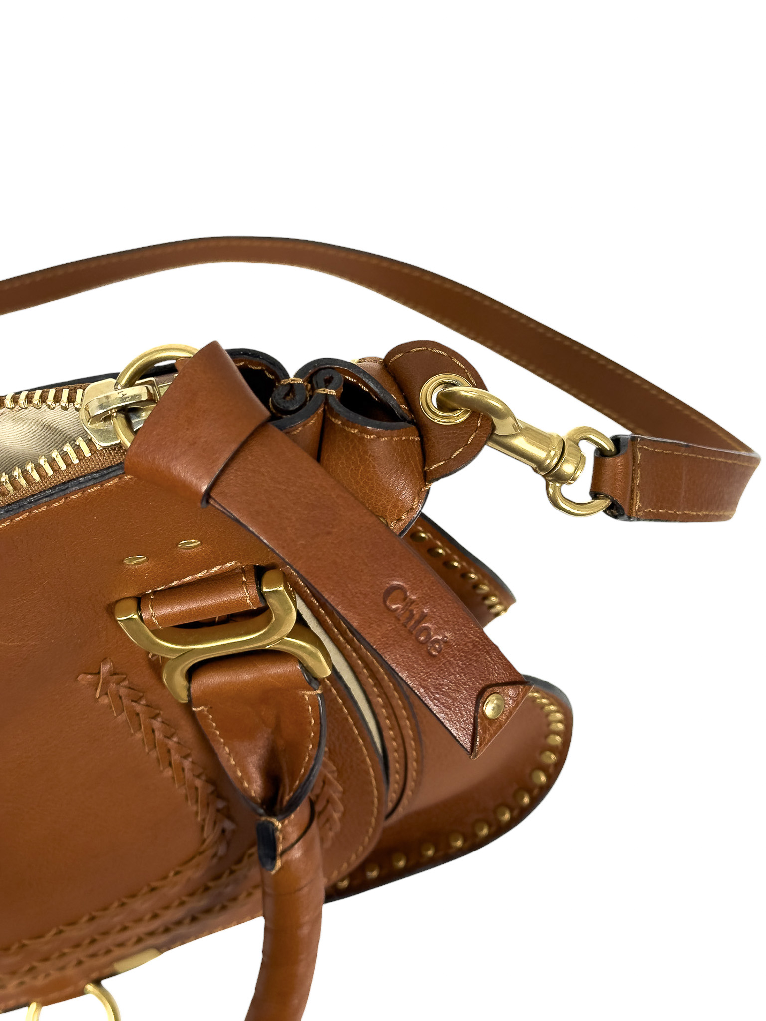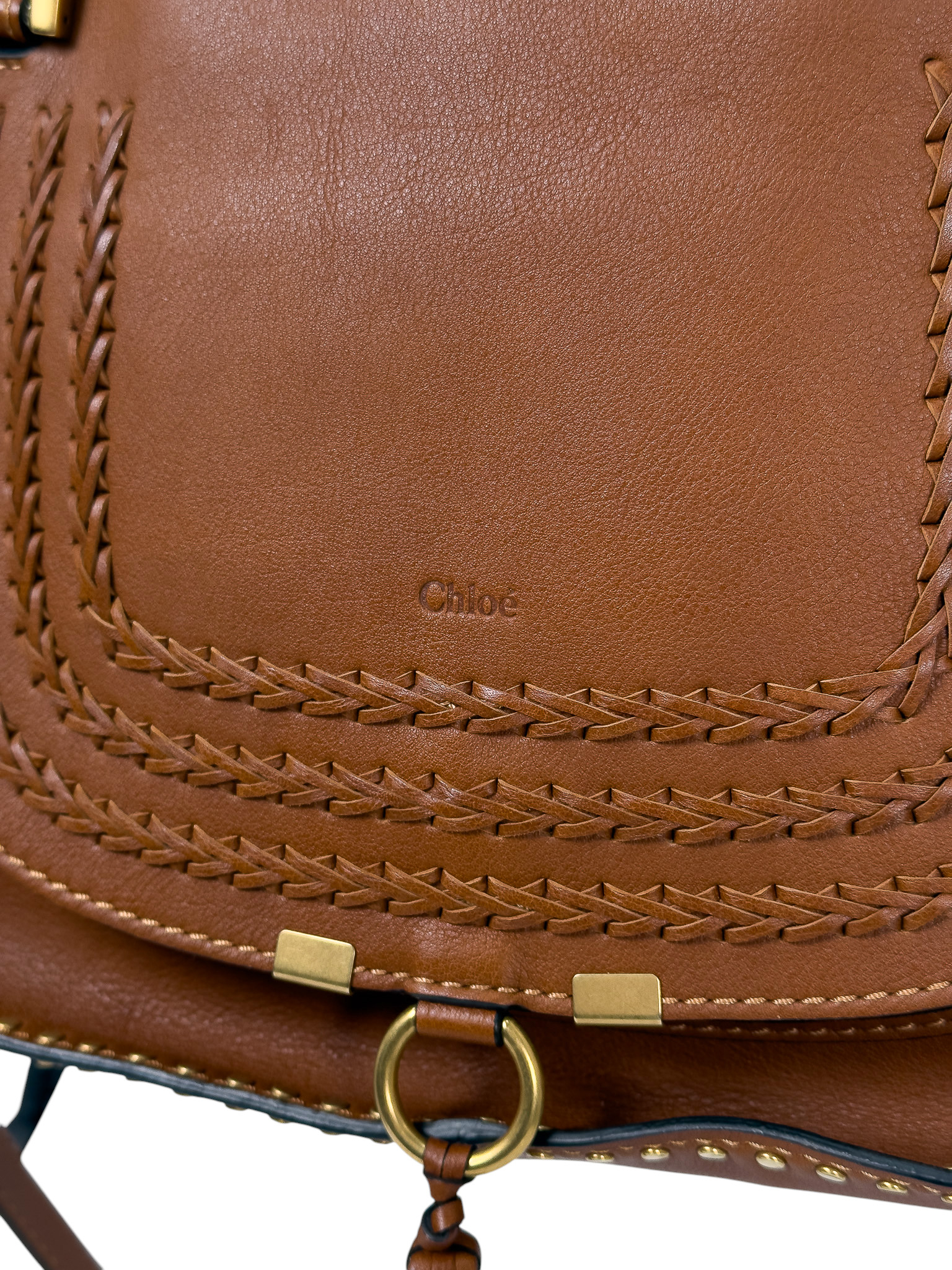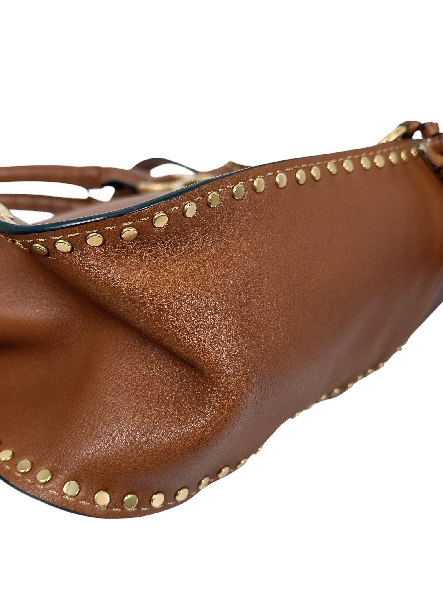 "Model: Marcie. Skórzana torebka średniej wielkości w kolorze karmelowym. Posiada ozdobne przeplatania z przodu torebki oraz ćwieki w kolorze złota przy szwach, mała zewnętrzna kieszonka z chwostem zapinana na magnes. Możliwość noszenia do ręki jak i na ramię. Odpinany dłuższy pasek. Wewnątrz mna podszewce posiada niewielkie ślady z długopisu. Z zewnątrz stan idealny. Wymiary: wysokość 30 cm, szerokość 36 cm, głębokość 12 cm."