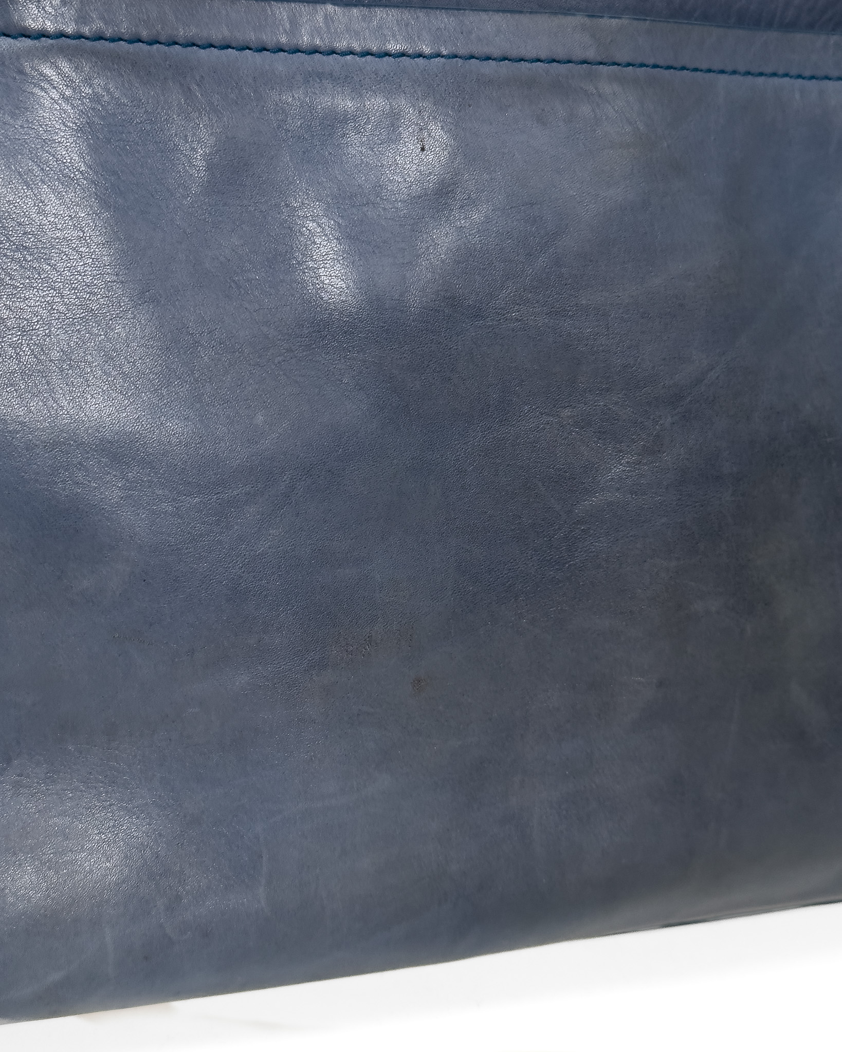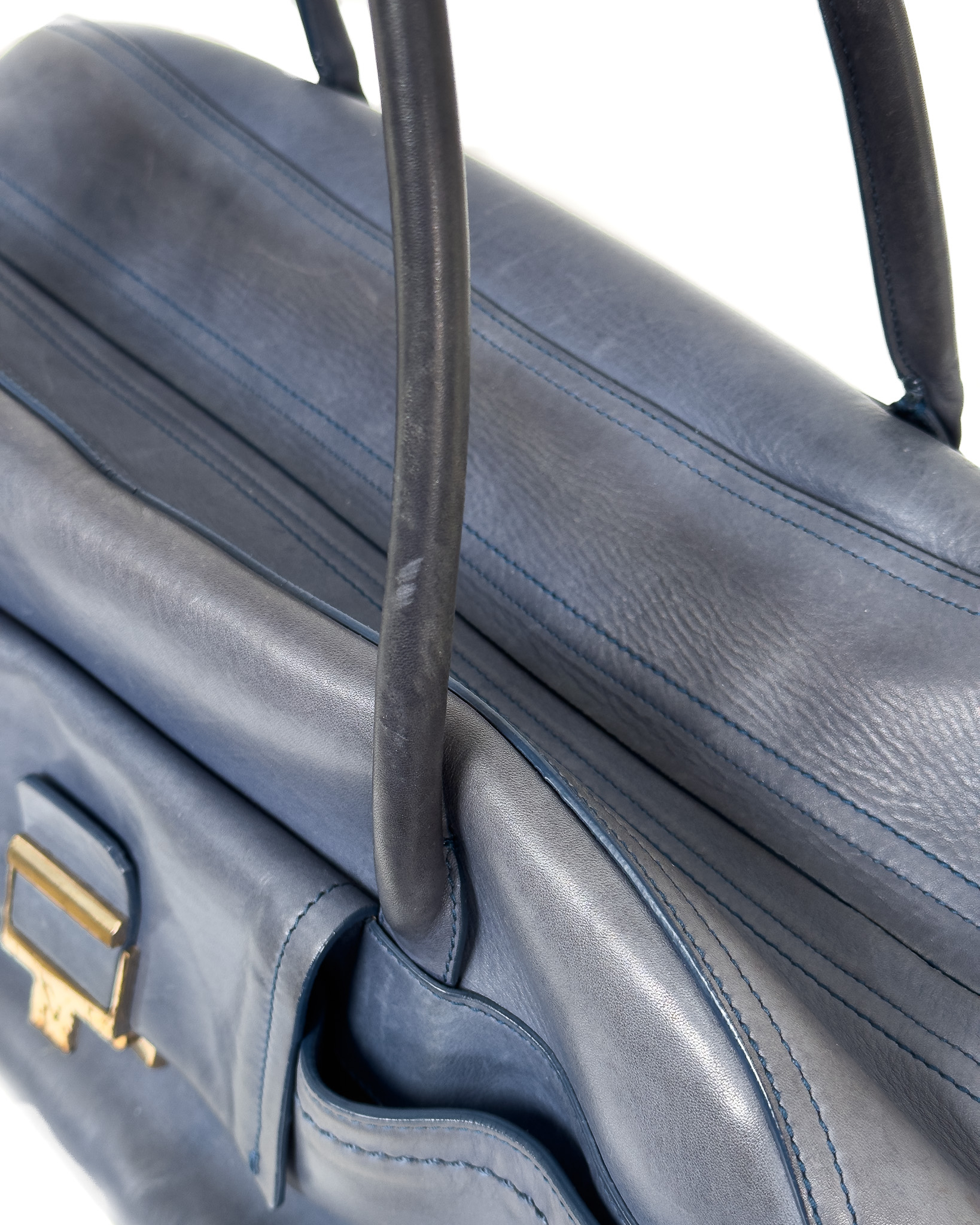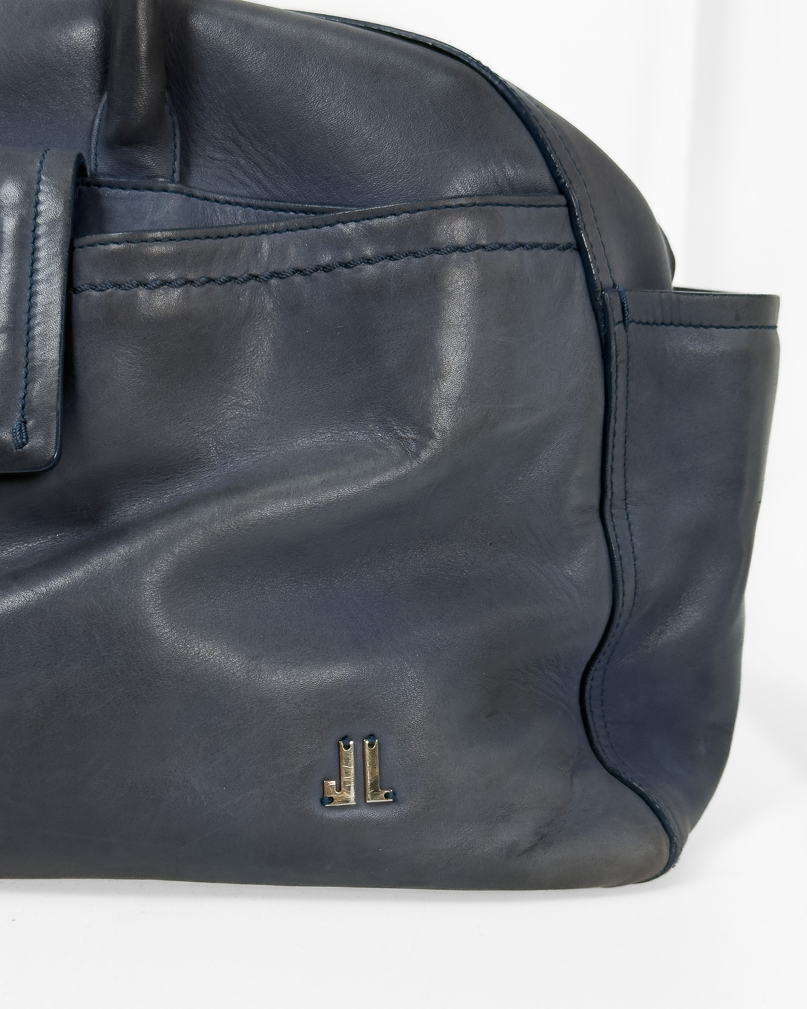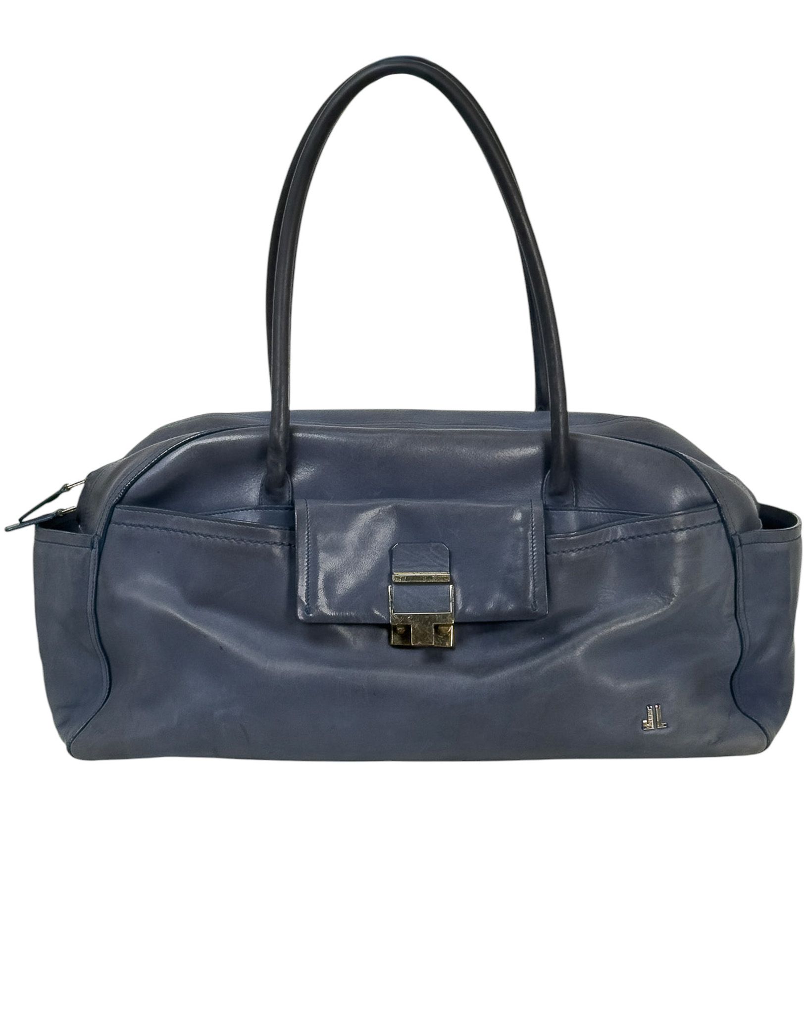 "Niebieska skórzana torebka na ramię, miękka skóra, dwa duże uchwyty na ramię, kieszeń na przodzie wykończona złotym zapięciem oraz inicjały marki, zapinana na dwa logowane suwaki, jedna duża komora wewnątrz z dwoma kieszeniami, brązowe wnętrze, pięć nóżek od spodu. Stan zadowalający, posiada rysy i przetarcia na skórze, zabarwienia na klamrze. Wymiary: szerokość 46cm, wysokość 21cm, głębokość 16cm."