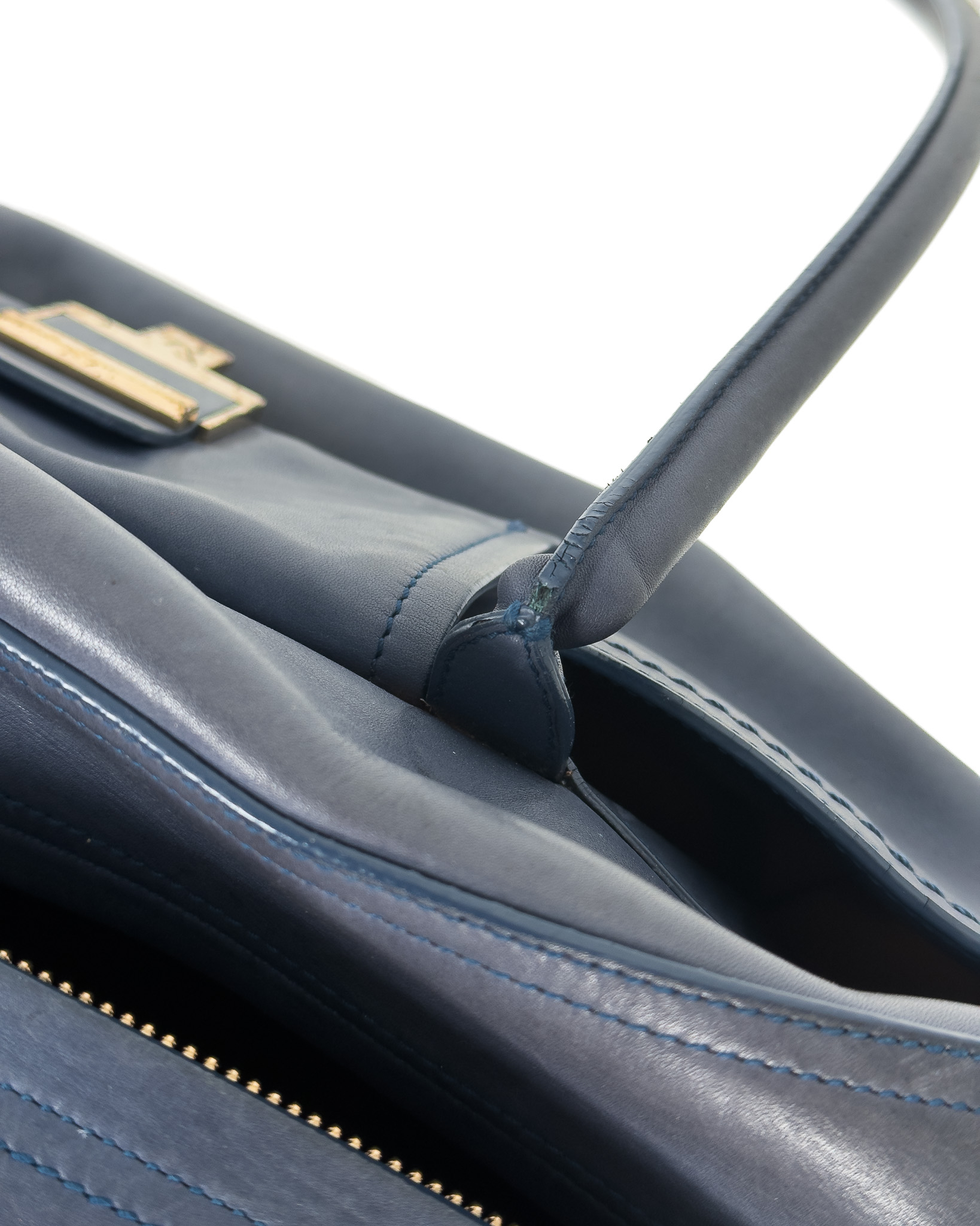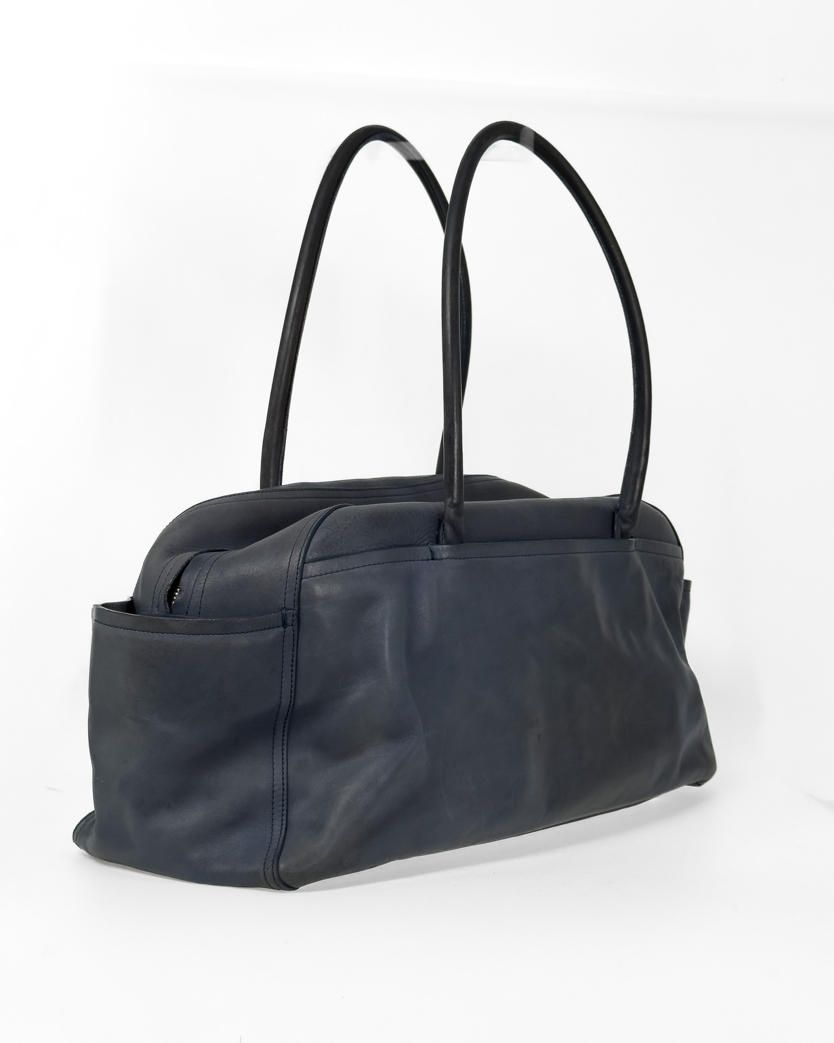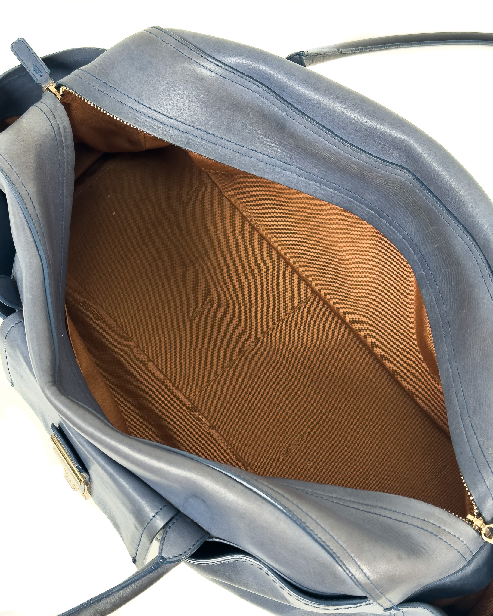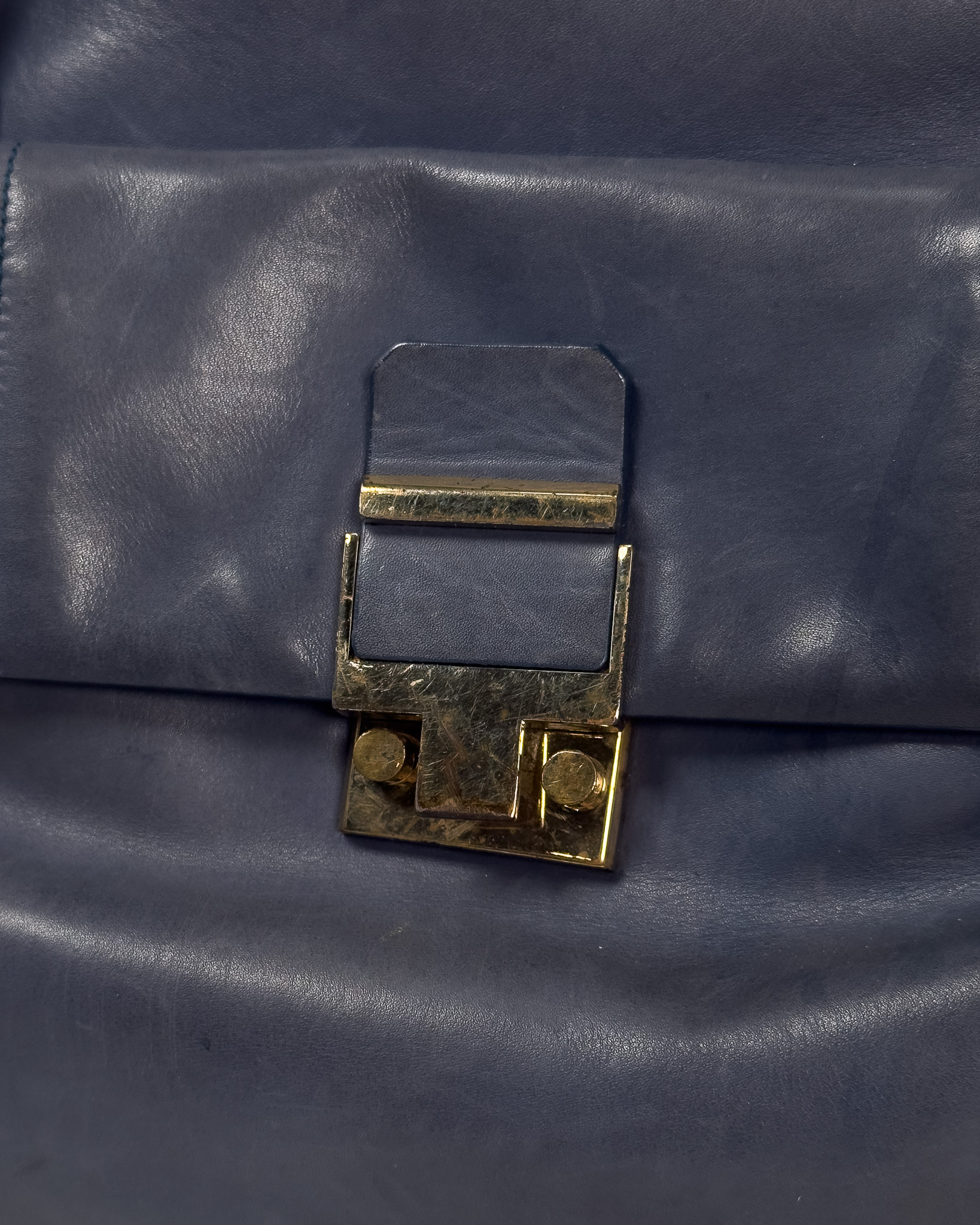 "Niebieska skórzana torebka na ramię, miękka skóra, dwa duże uchwyty na ramię, kieszeń na przodzie wykończona złotym zapięciem oraz inicjały marki, zapinana na dwa logowane suwaki, jedna duża komora wewnątrz z dwoma kieszeniami, brązowe wnętrze, pięć nóżek od spodu. Stan zadowalający, posiada rysy i przetarcia na skórze, zabarwienia na klamrze. Wymiary: szerokość 46cm, wysokość 21cm, głębokość 16cm."