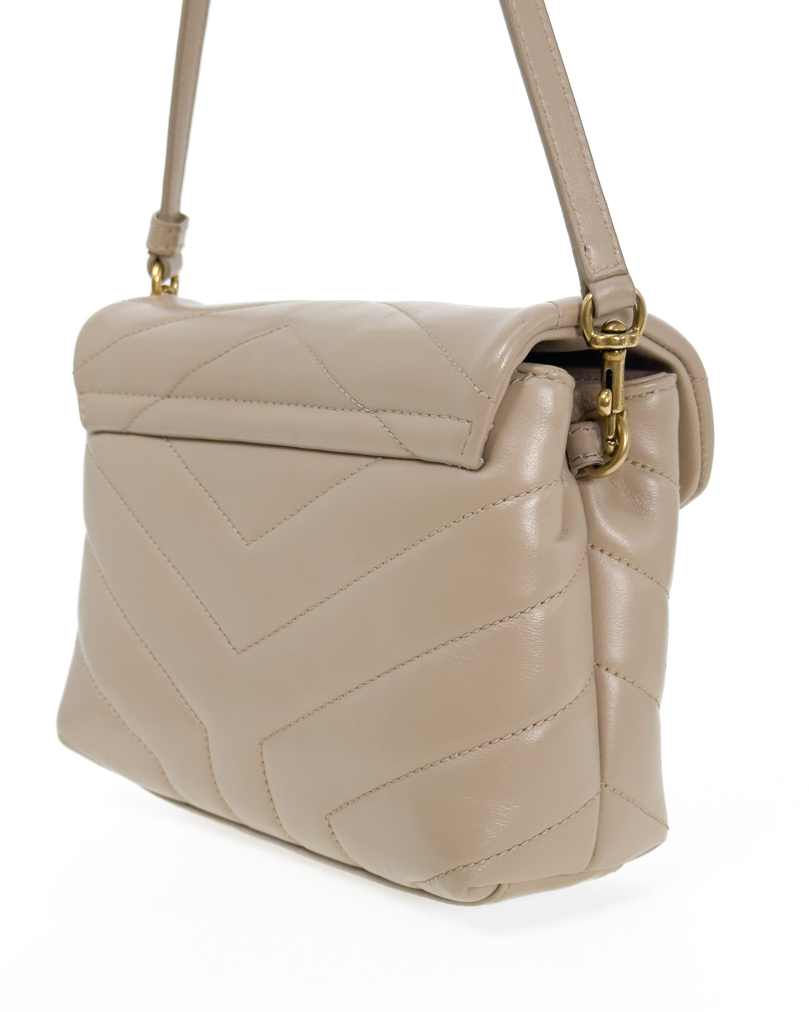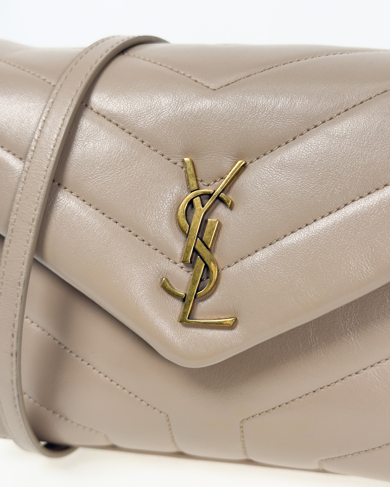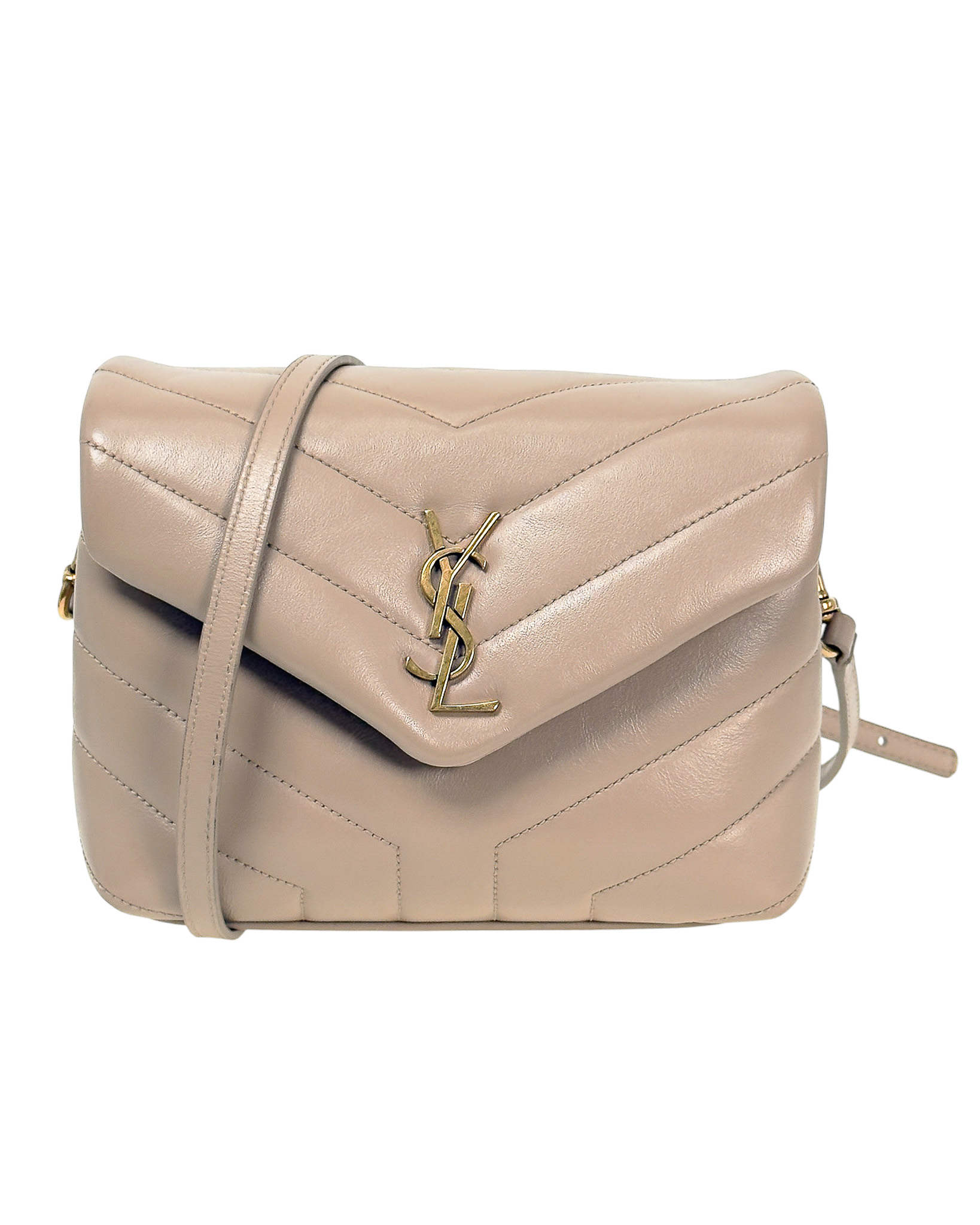 "model: Loulou. Beżowa skórzana torebka ze złotym logo marki na przodzie, pikowana, zapinana na zatrzask, cienki pasek na ramię z regulacją, dwie komory z kieszenią oraz przegrodami na karty wewnątrz. Stan: bardzo dobry. Wymiary: szerokość 20cm, wysokość 15cm, głębokość 7cm."