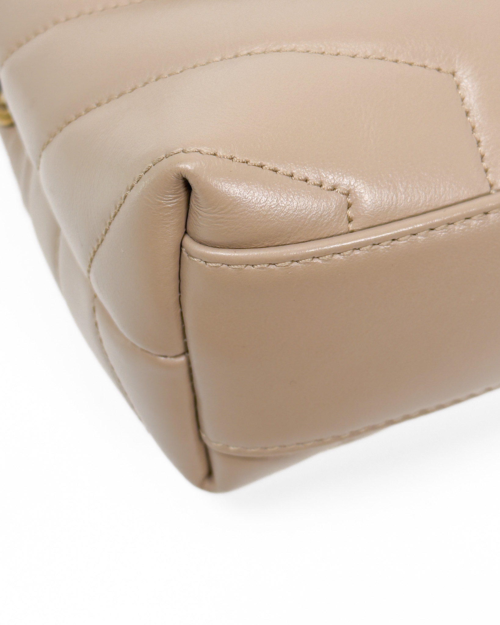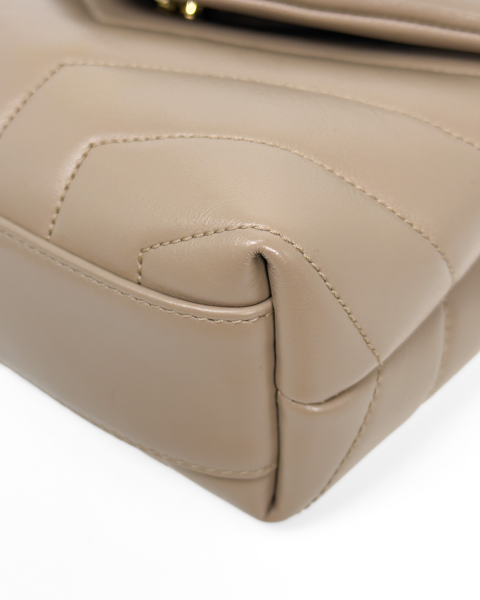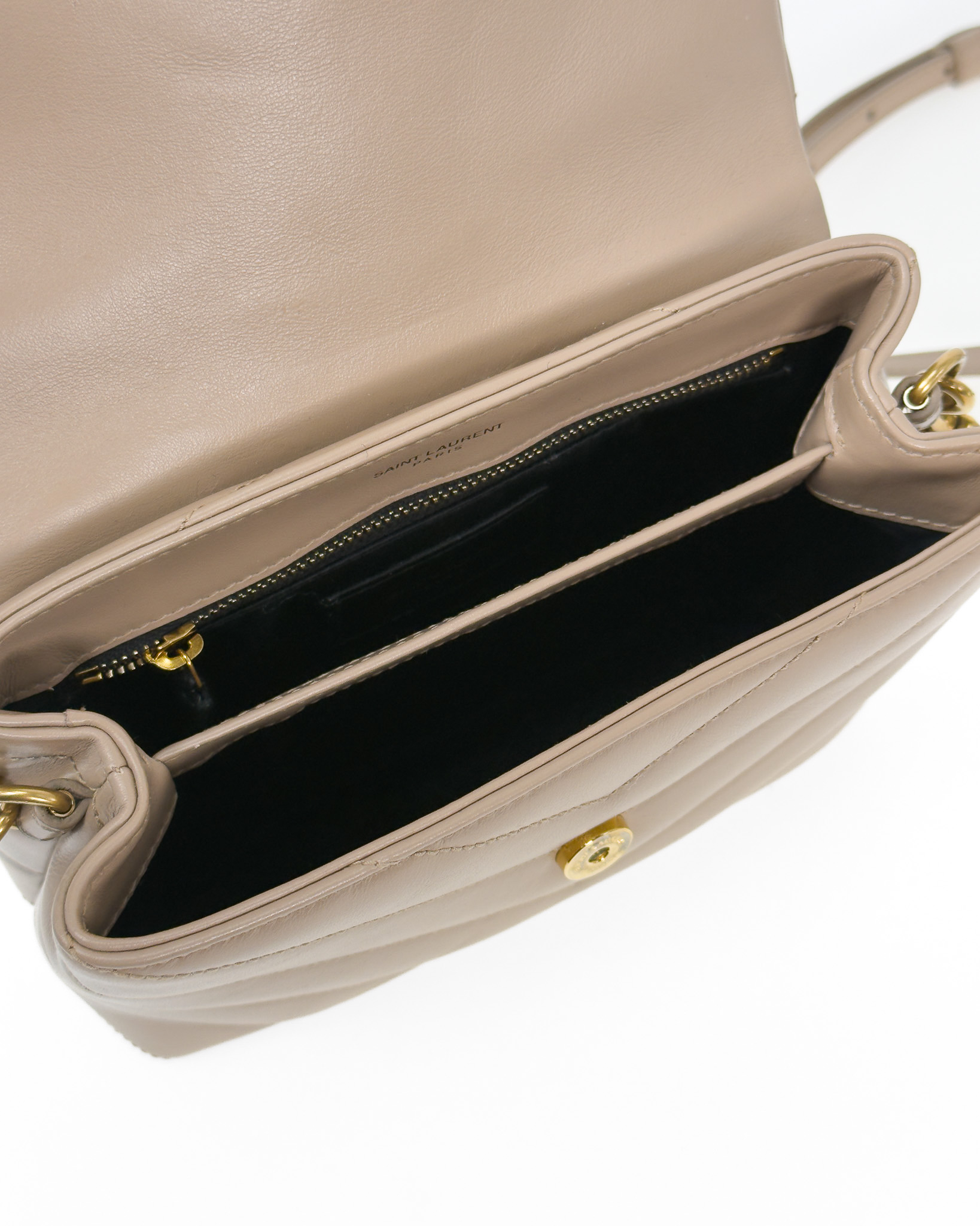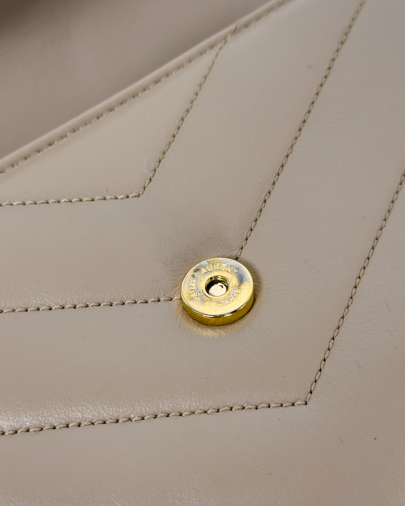 "model: Loulou. Beżowa skórzana torebka ze złotym logo marki na przodzie, pikowana, zapinana na zatrzask, cienki pasek na ramię z regulacją, dwie komory z kieszenią oraz przegrodami na karty wewnątrz. Stan: bardzo dobry. Wymiary: szerokość 20cm, wysokość 15cm, głębokość 7cm."