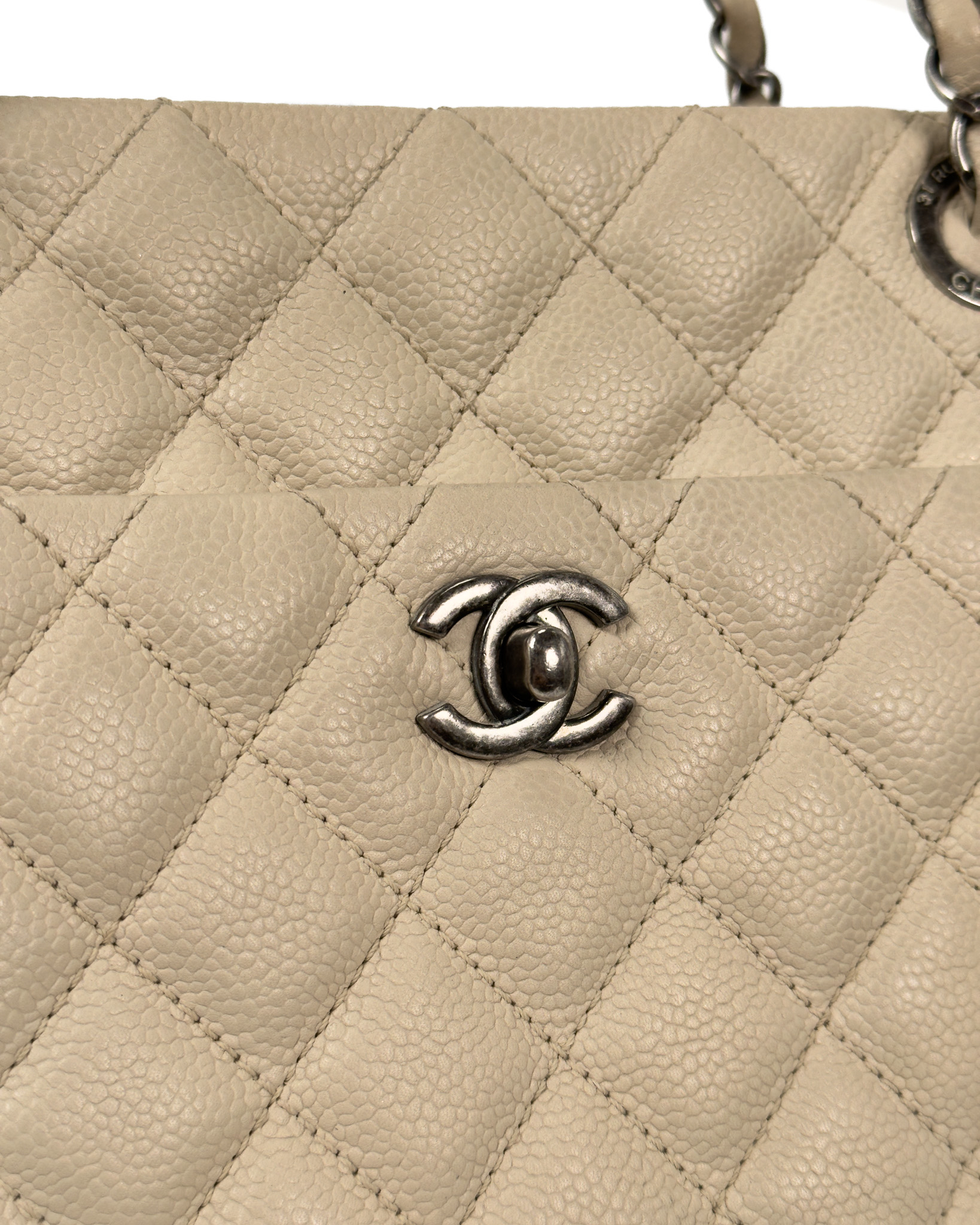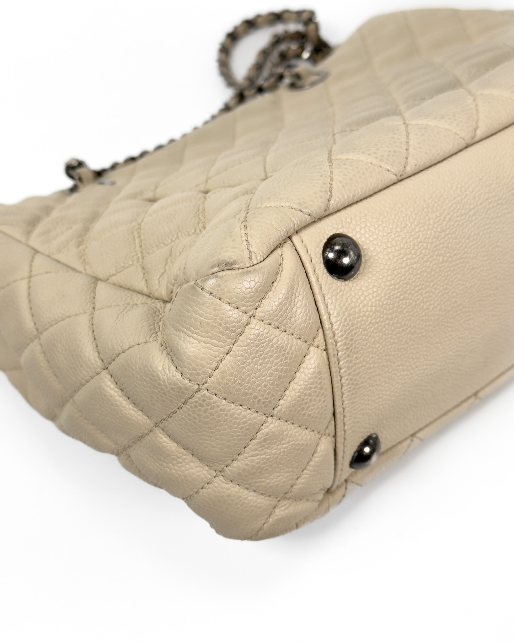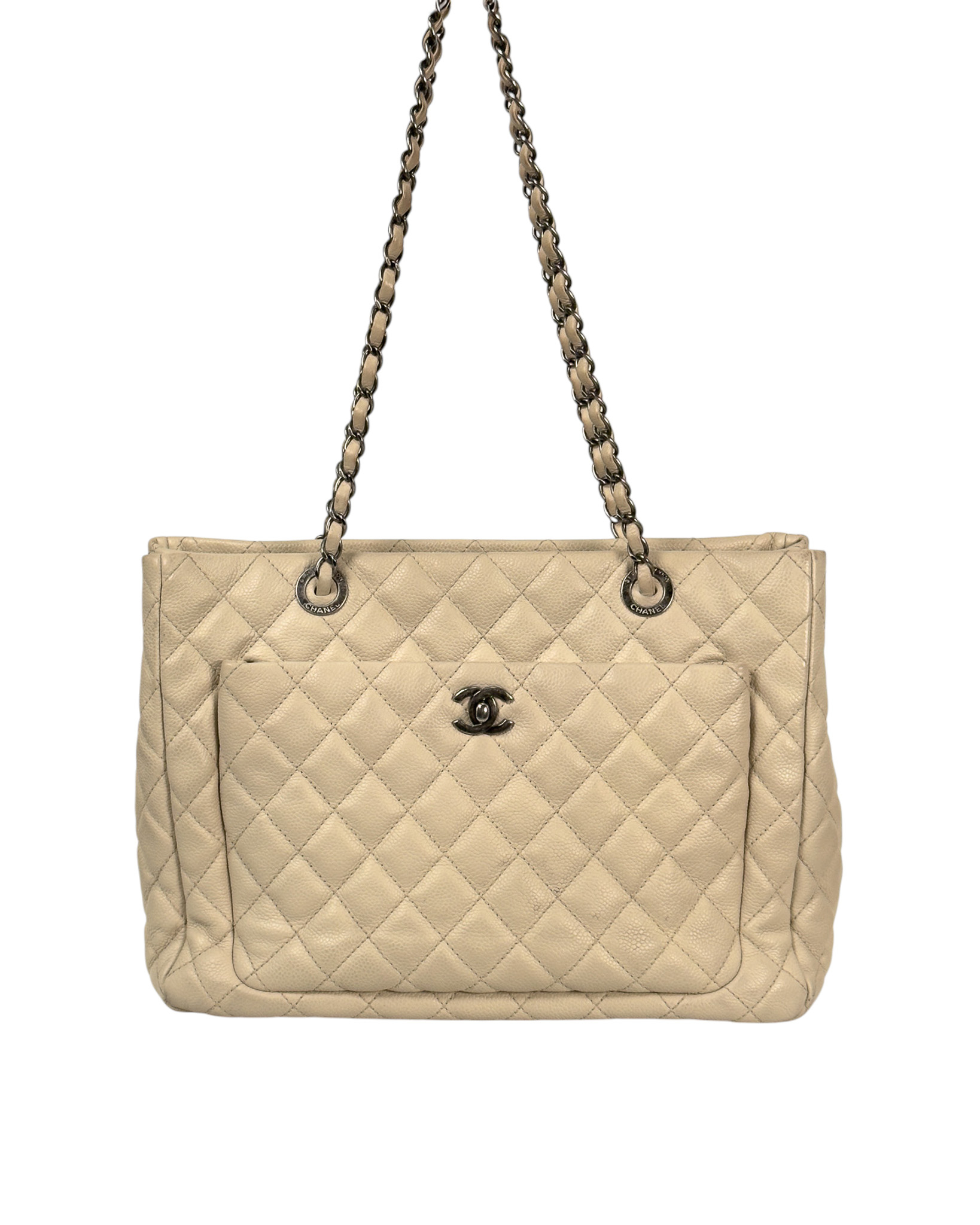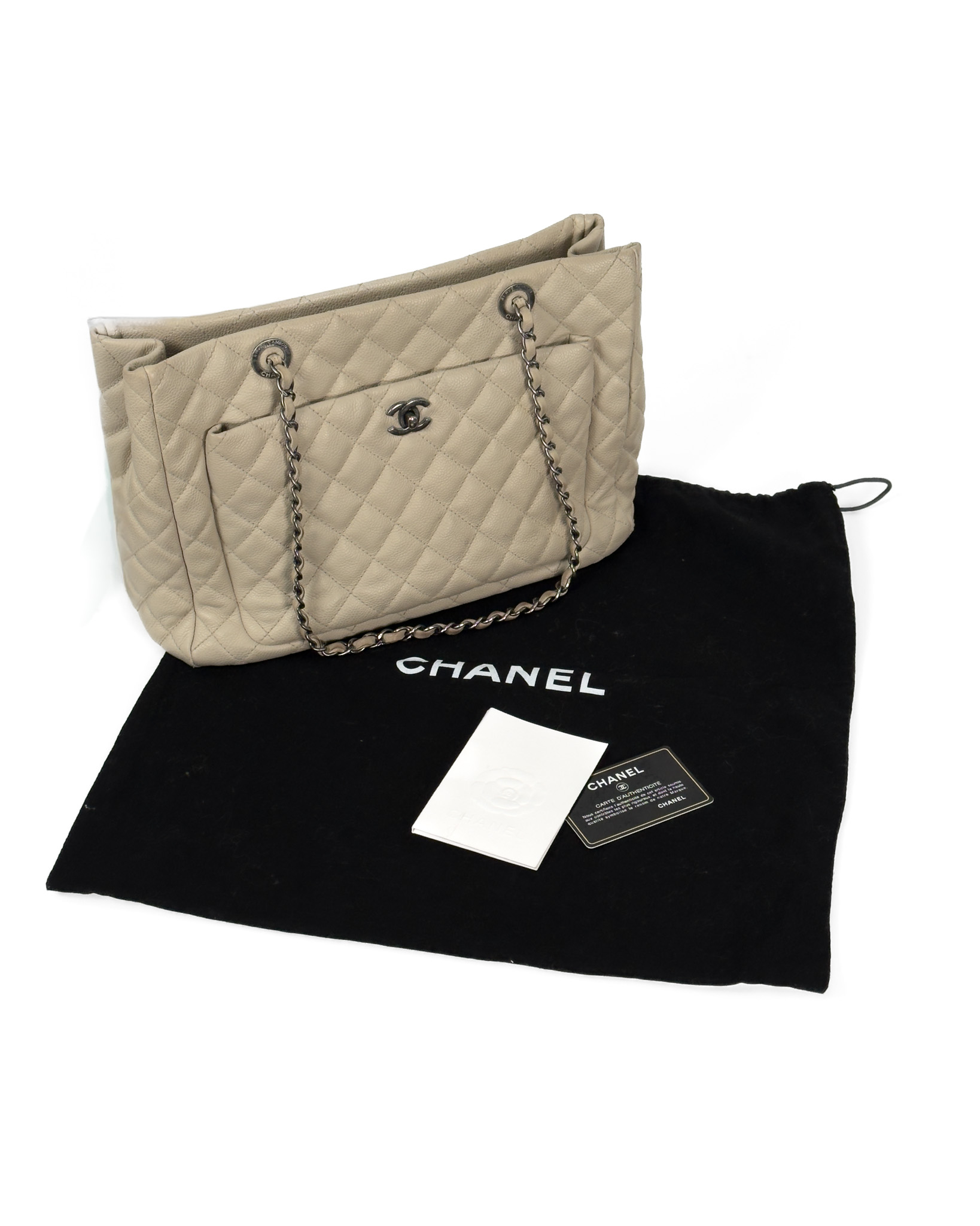 "torebka zakupiona w Paryżu , rok 2013/2014; Beżowa torebka na ramię, pikowana diamentowo, groszkowa skóra, kieszeń na przodzie ozdobiona przekręcanym zapięciem z logo marki, dwa uchwyty na ramię wykończone łańcuchem, prostokątny kształt, cztery nóżki od spodu, materiałowe wnętrze, trzy komory, w tym jedna zasuwana, trzy kieszenie, w zestawie z kartą autentyczności oraz workiem przeciwkurzowym. Stan bardzo dobry, posiada przetarcia na rogach, delikatne zabrudzenia na skórze. Wymiary: szerokość 31cm, wysokość 24cm, głębokość 11cm."