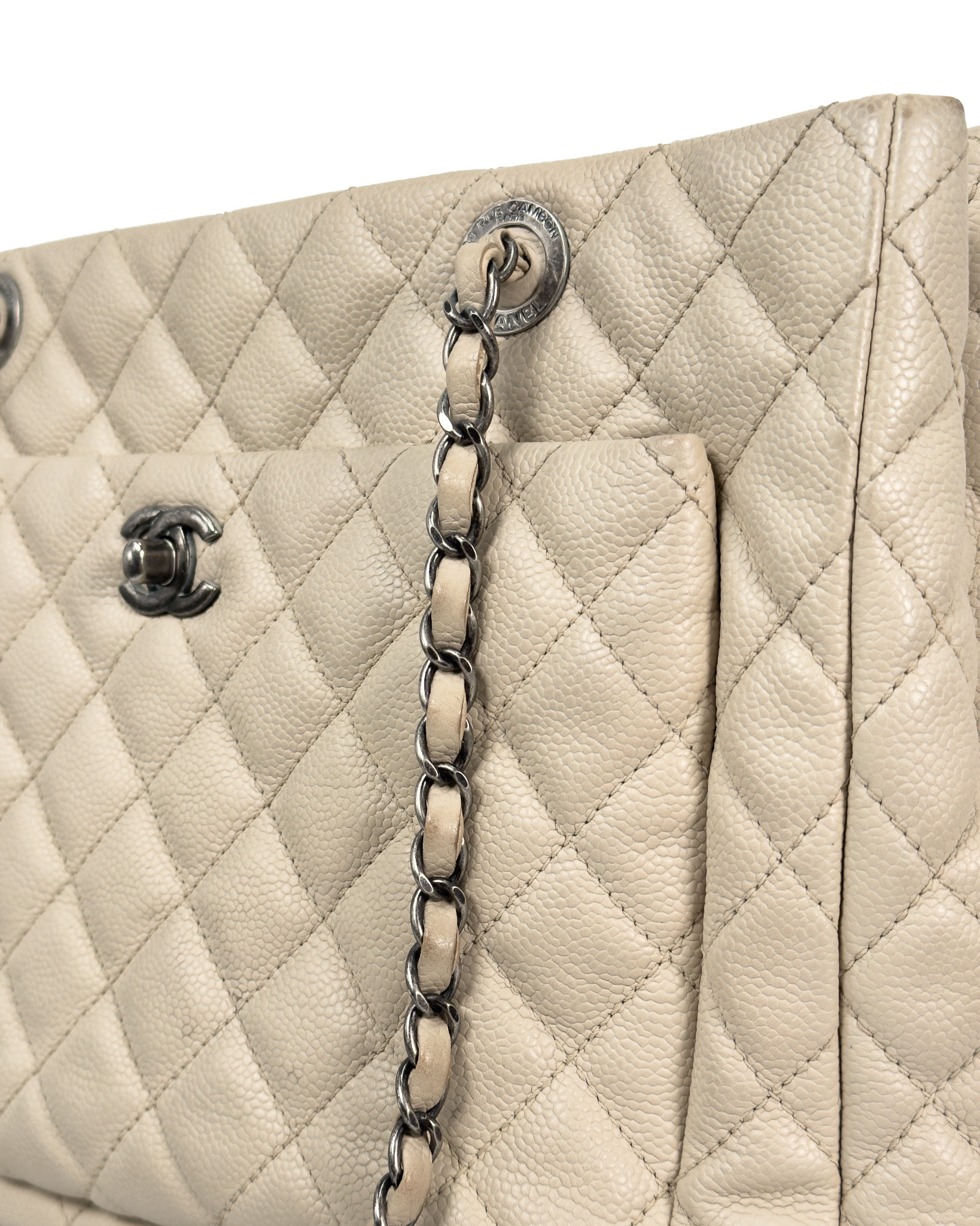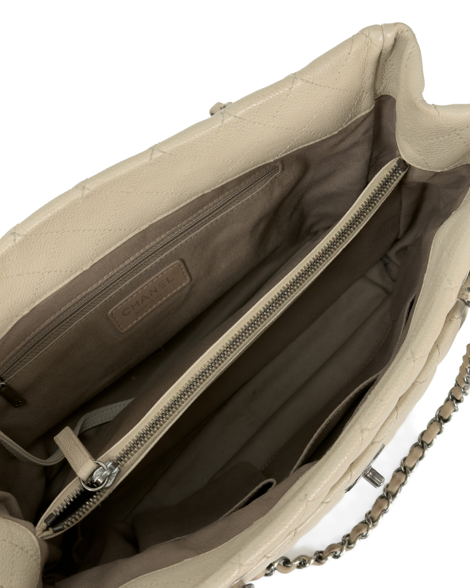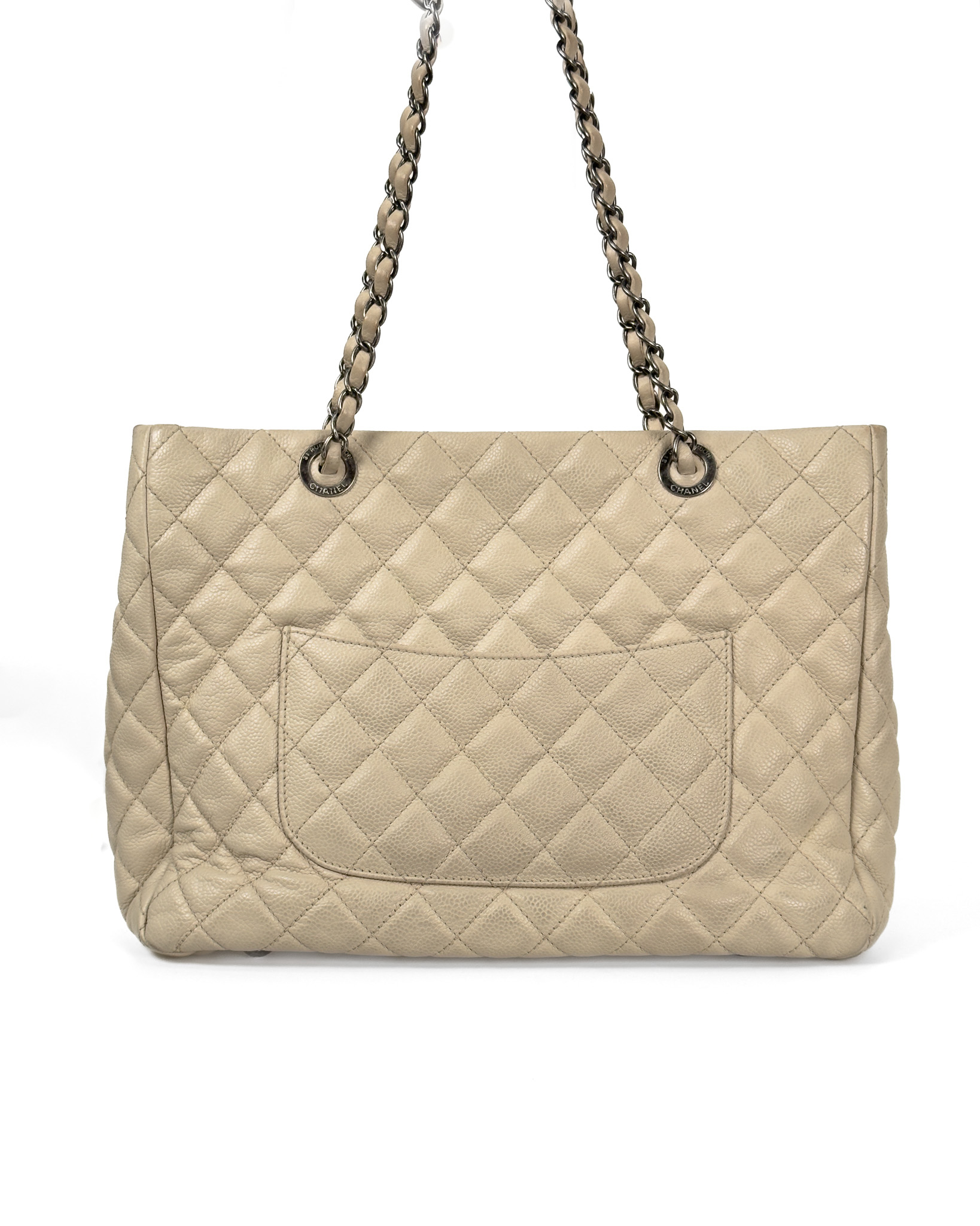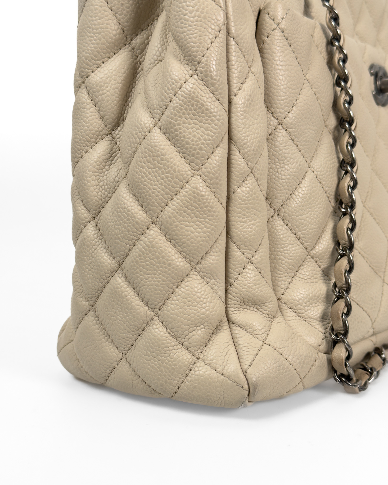 "torebka zakupiona w Paryżu , rok 2013/2014; Beżowa torebka na ramię, pikowana diamentowo, groszkowa skóra, kieszeń na przodzie ozdobiona przekręcanym zapięciem z logo marki, dwa uchwyty na ramię wykończone łańcuchem, prostokątny kształt, cztery nóżki od spodu, materiałowe wnętrze, trzy komory, w tym jedna zasuwana, trzy kieszenie, w zestawie z kartą autentyczności oraz workiem przeciwkurzowym. Stan bardzo dobry, posiada przetarcia na rogach, delikatne zabrudzenia na skórze. Wymiary: szerokość 31cm, wysokość 24cm, głębokość 11cm."