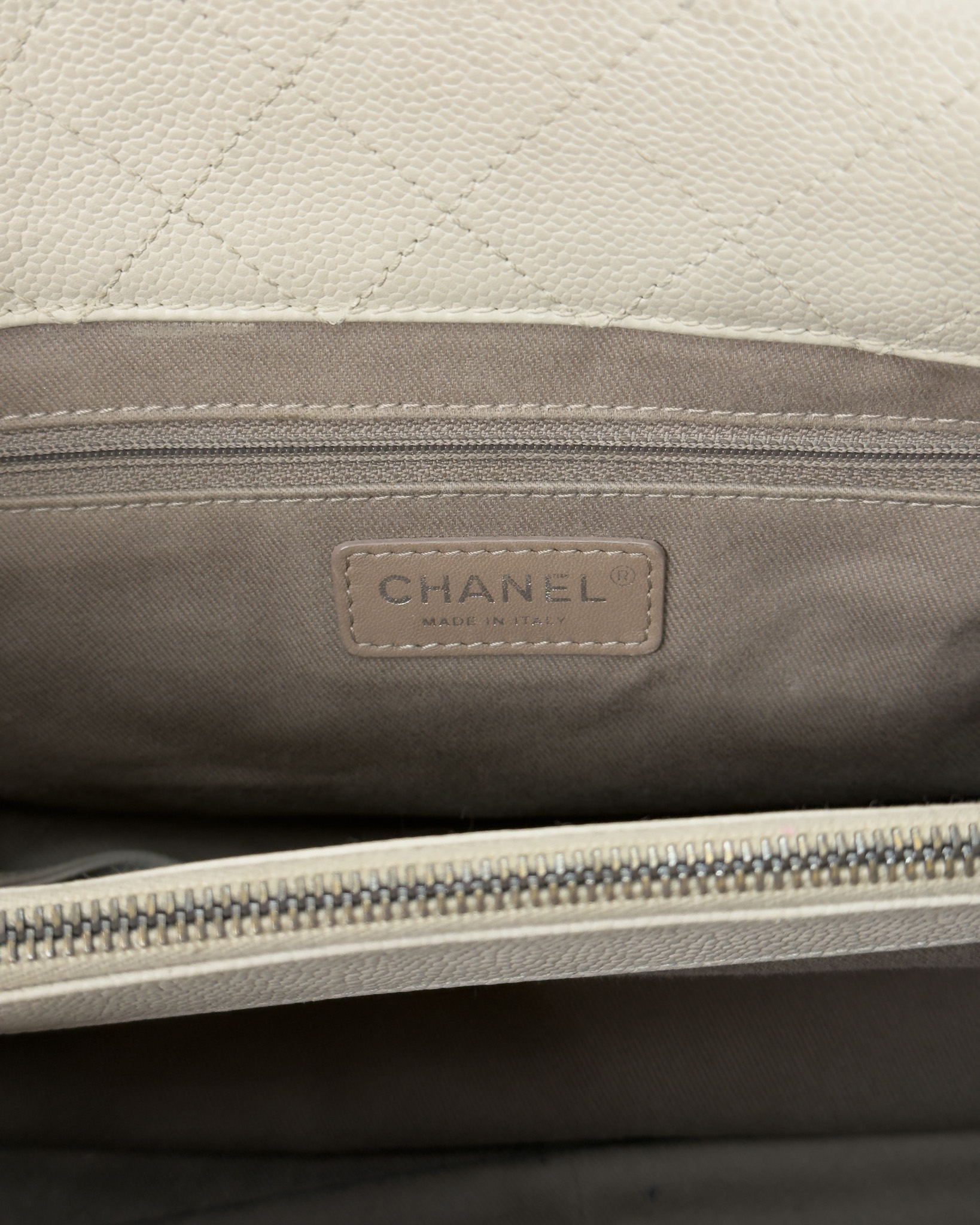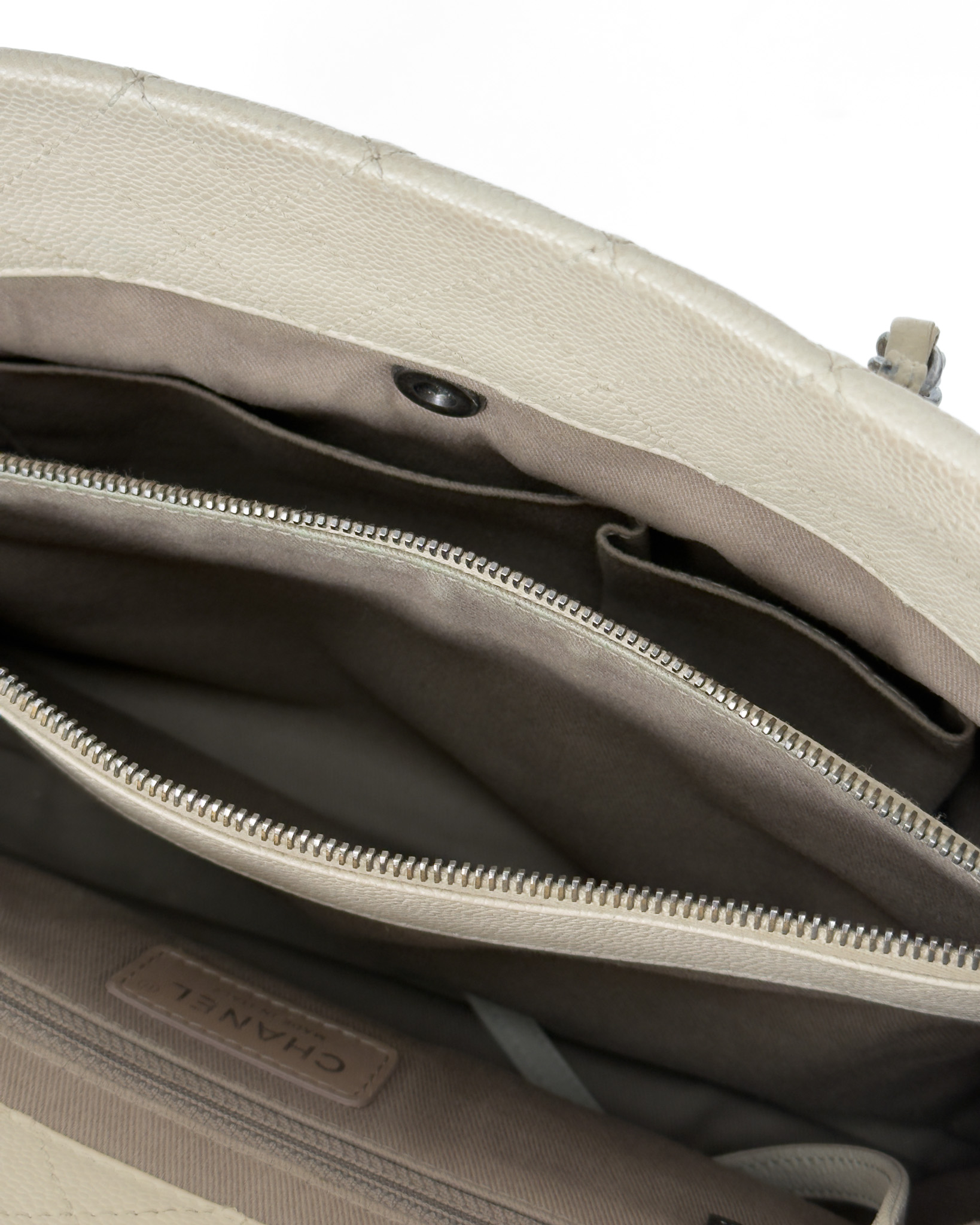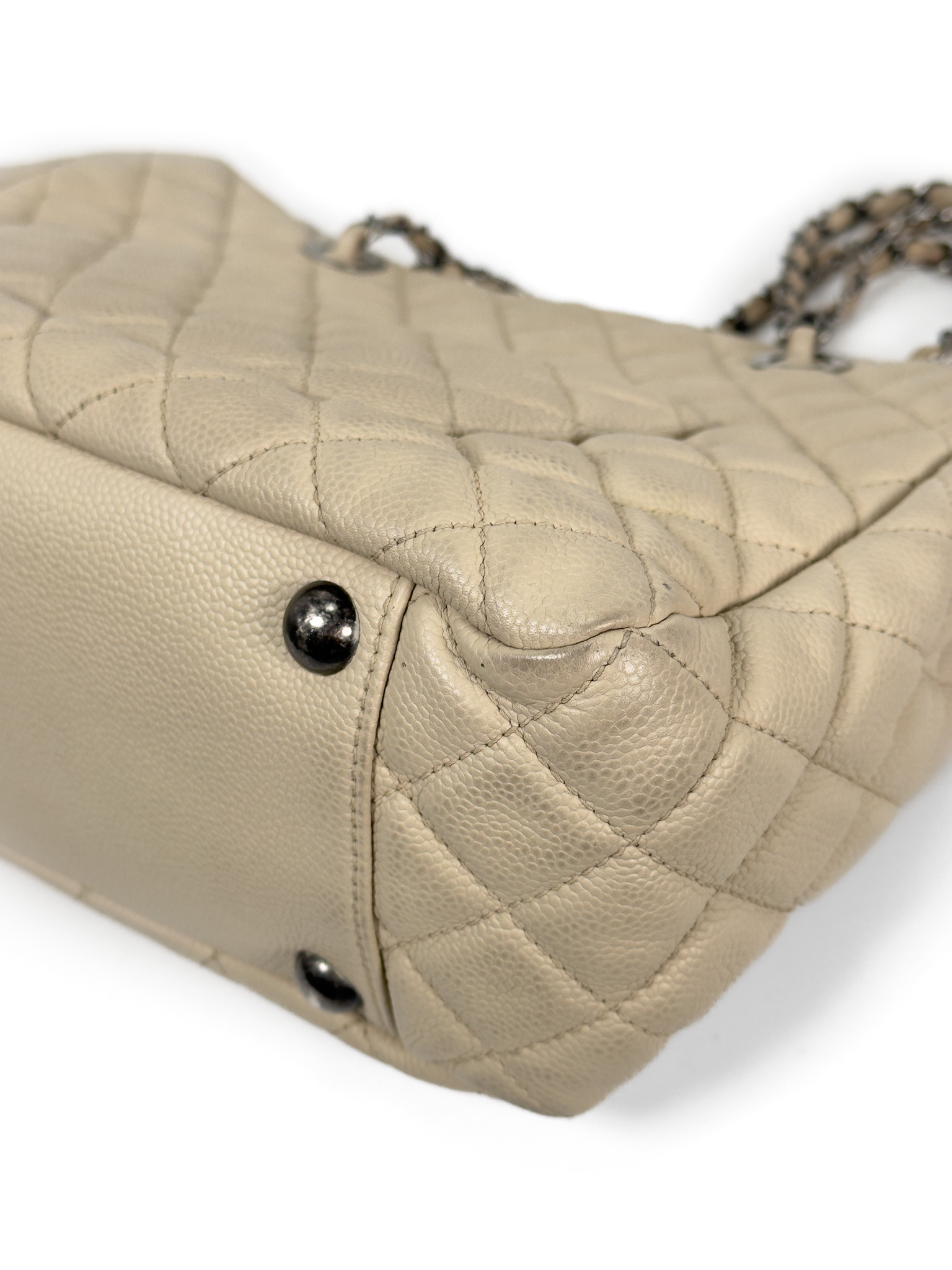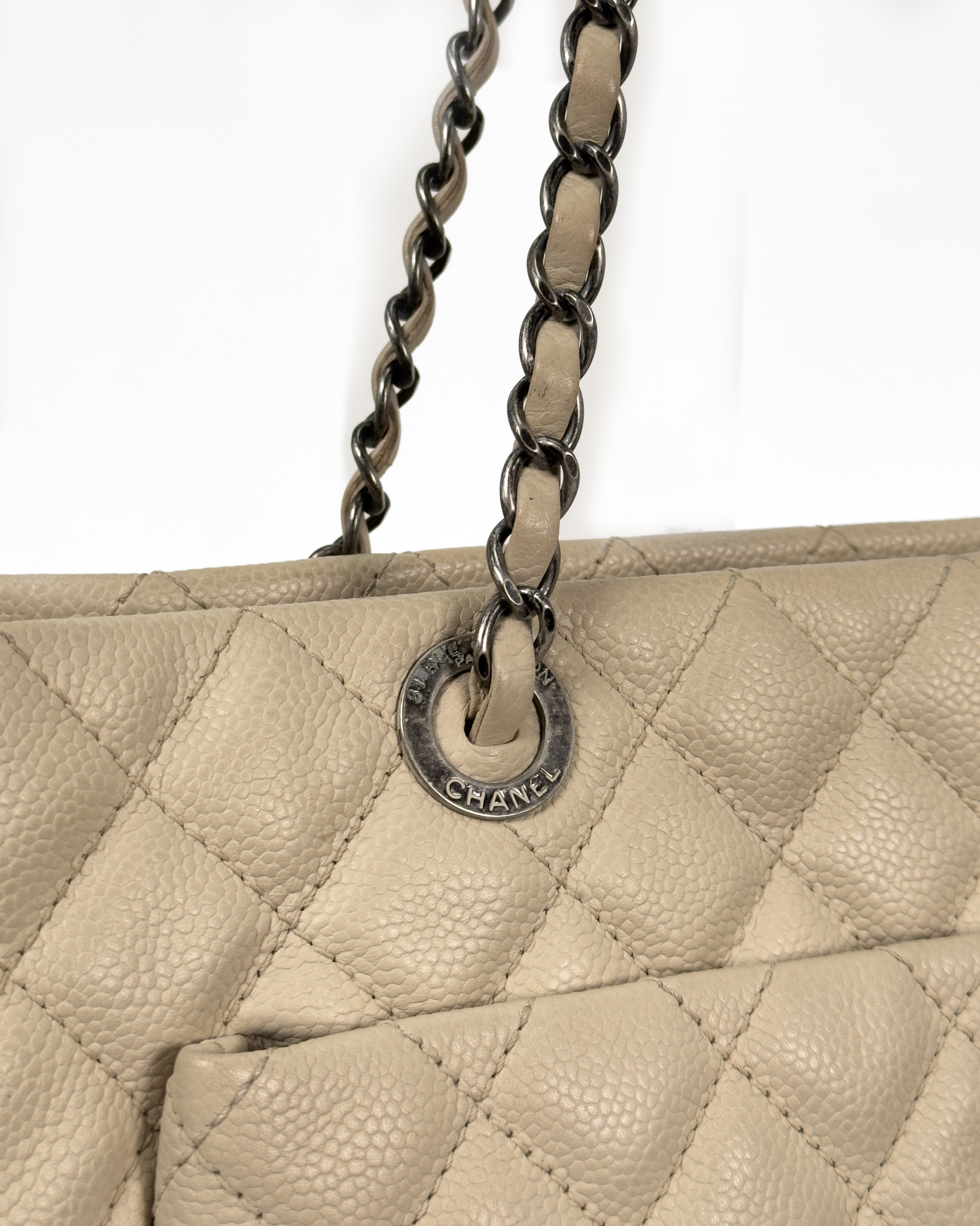"torebka zakupiona w Paryżu , rok 2013/2014; Beżowa torebka na ramię, pikowana diamentowo, groszkowa skóra, kieszeń na przodzie ozdobiona przekręcanym zapięciem z logo marki, dwa uchwyty na ramię wykończone łańcuchem, prostokątny kształt, cztery nóżki od spodu, materiałowe wnętrze, trzy komory, w tym jedna zasuwana, trzy kieszenie, w zestawie z kartą autentyczności oraz workiem przeciwkurzowym. Stan bardzo dobry, posiada przetarcia na rogach, delikatne zabrudzenia na skórze. Wymiary: szerokość 31cm, wysokość 24cm, głębokość 11cm."
