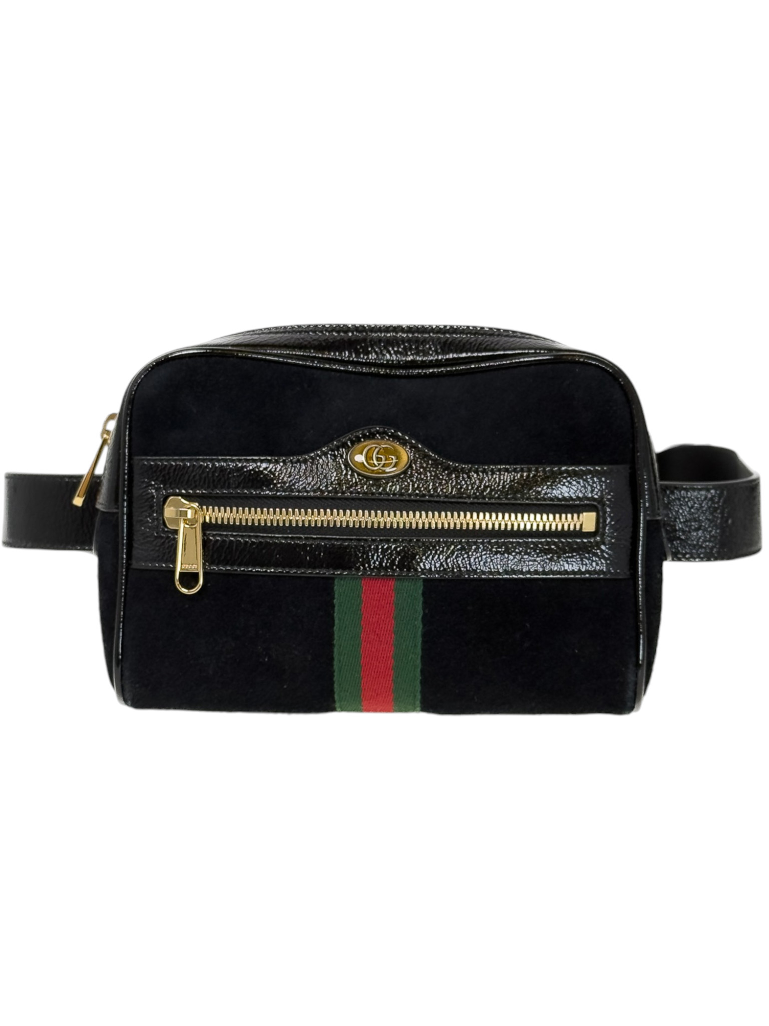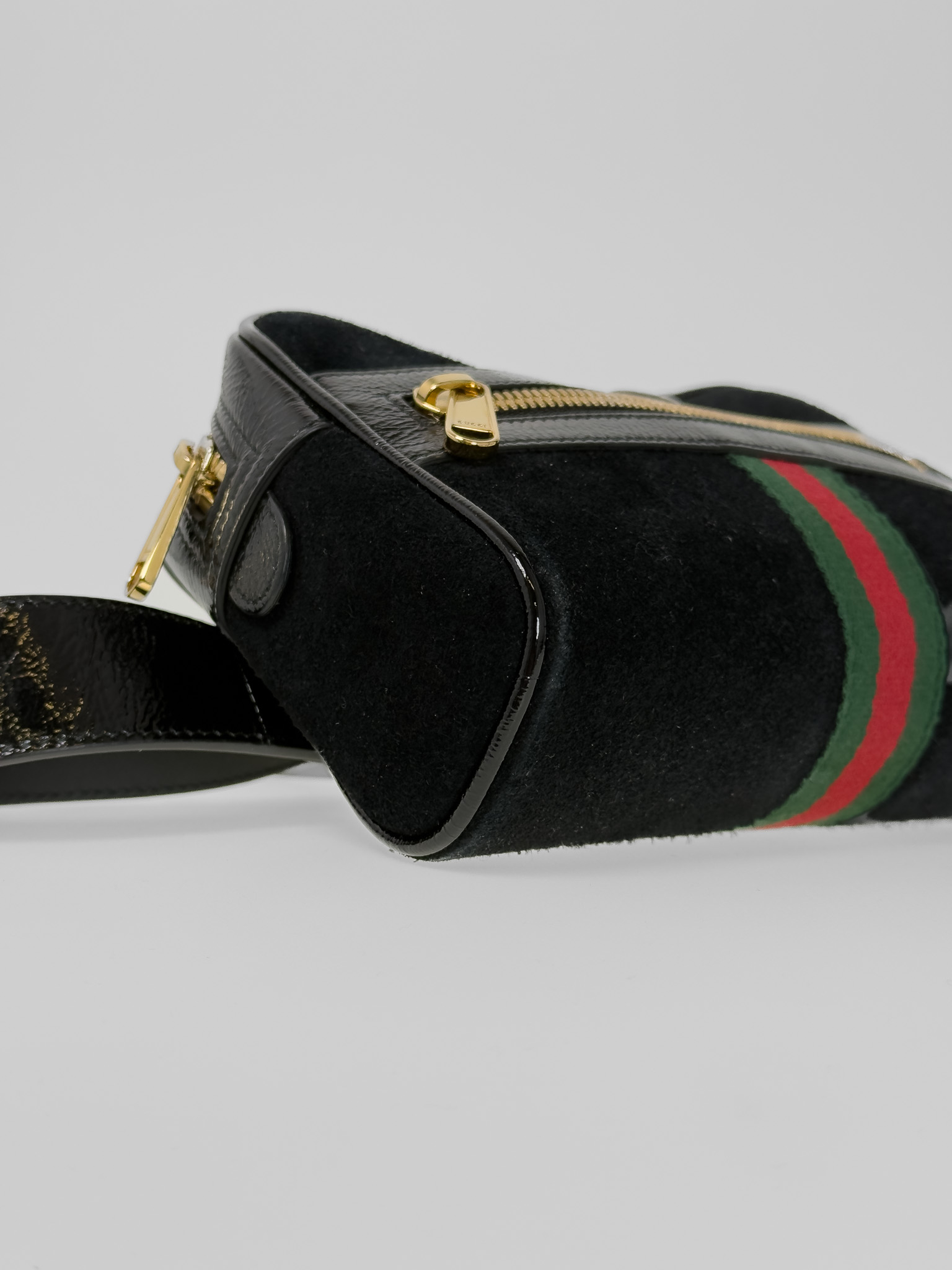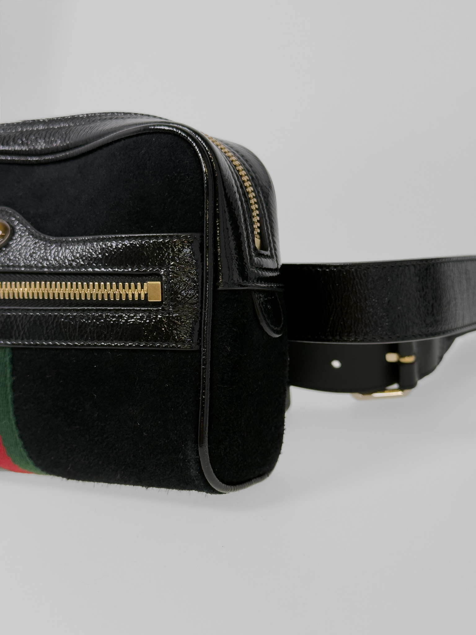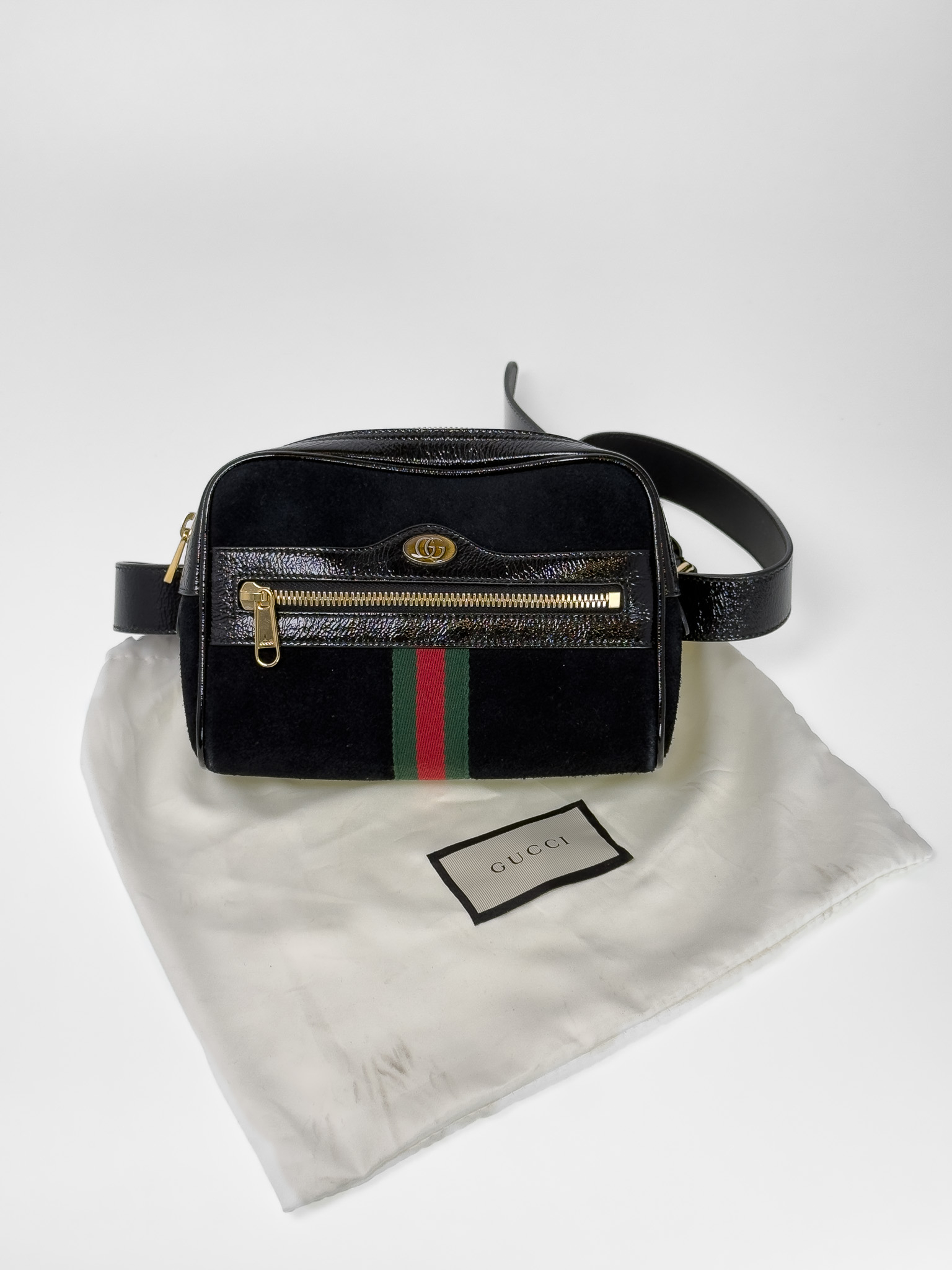 "Model: patent web mini ophidia. Czarny, zamszowy belt bag, złote okucia, posiada charakterystyczny, ozdobny pasek dla marki. Worek przeciwkurzowy w komplecie. Stan bardzo dobry, delikatnie wytarty zamsz w jednym rogu. Wymiary: szerokość 17,8 cm, wysokość 12,7 cm, głębokość 5 cm."