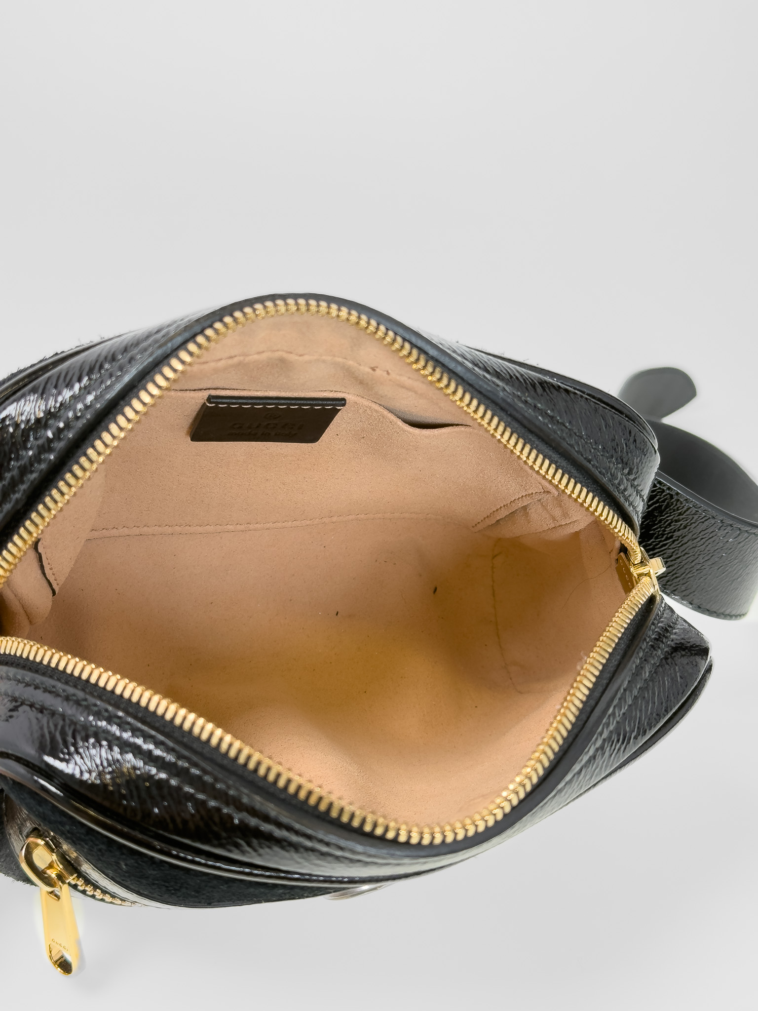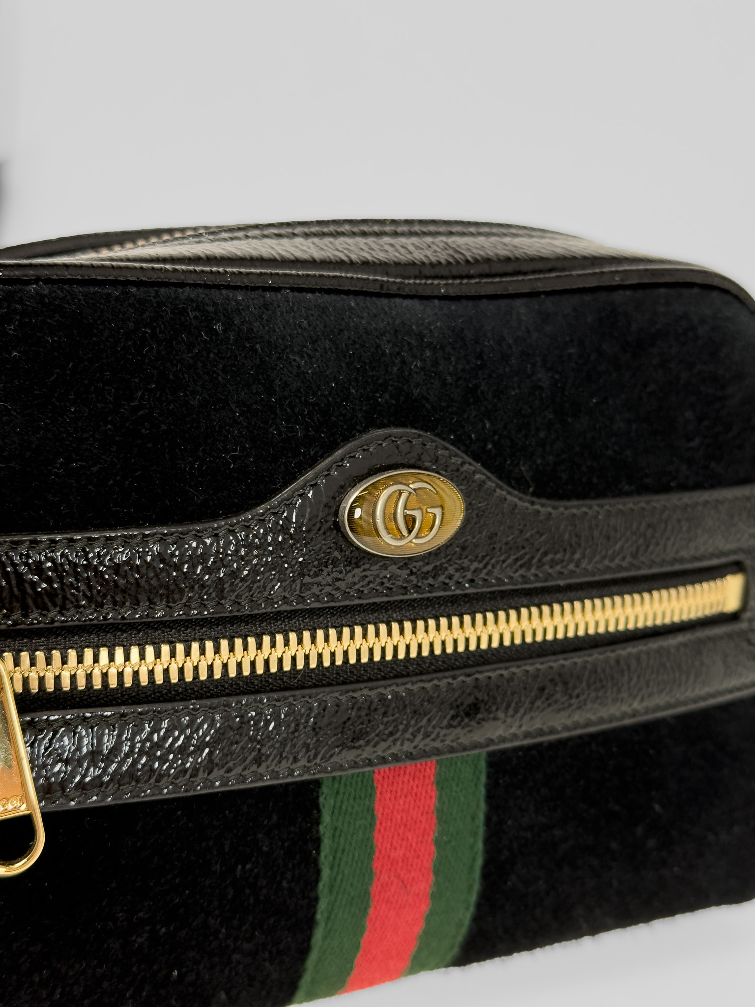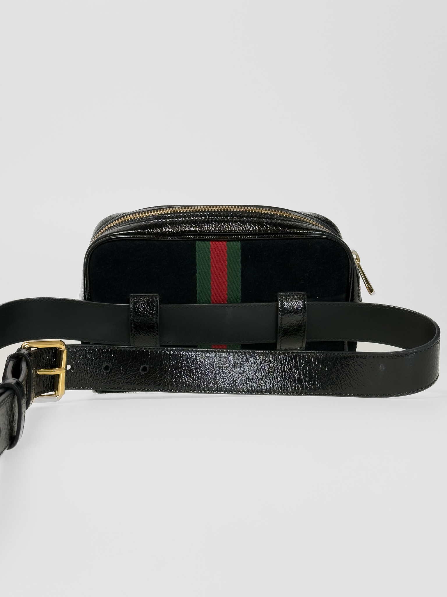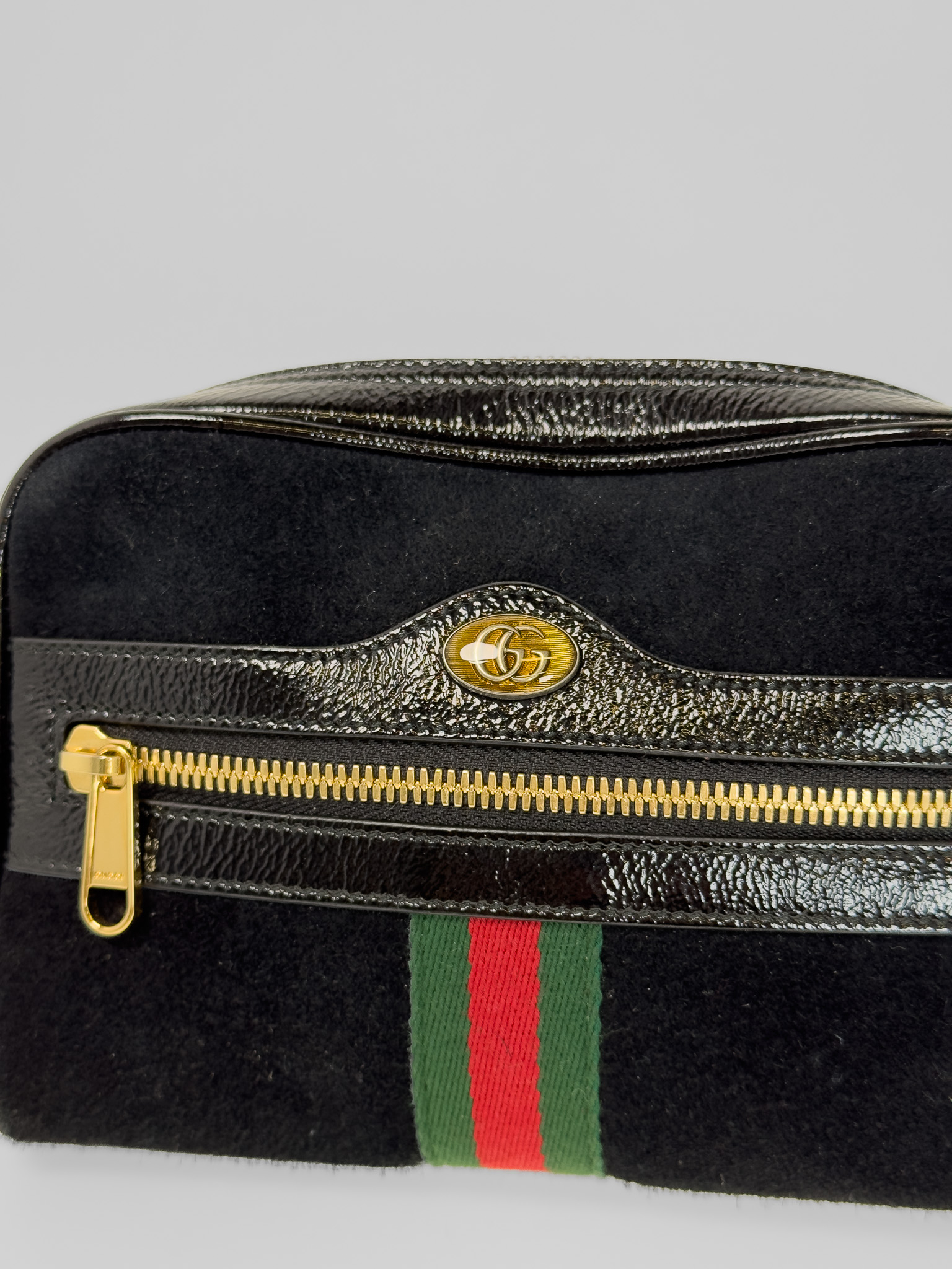 "Model: patent web mini ophidia. Czarny, zamszowy belt bag, złote okucia, posiada charakterystyczny, ozdobny pasek dla marki. Worek przeciwkurzowy w komplecie. Stan bardzo dobry, delikatnie wytarty zamsz w jednym rogu. Wymiary: szerokość 17,8 cm, wysokość 12,7 cm, głębokość 5 cm."
