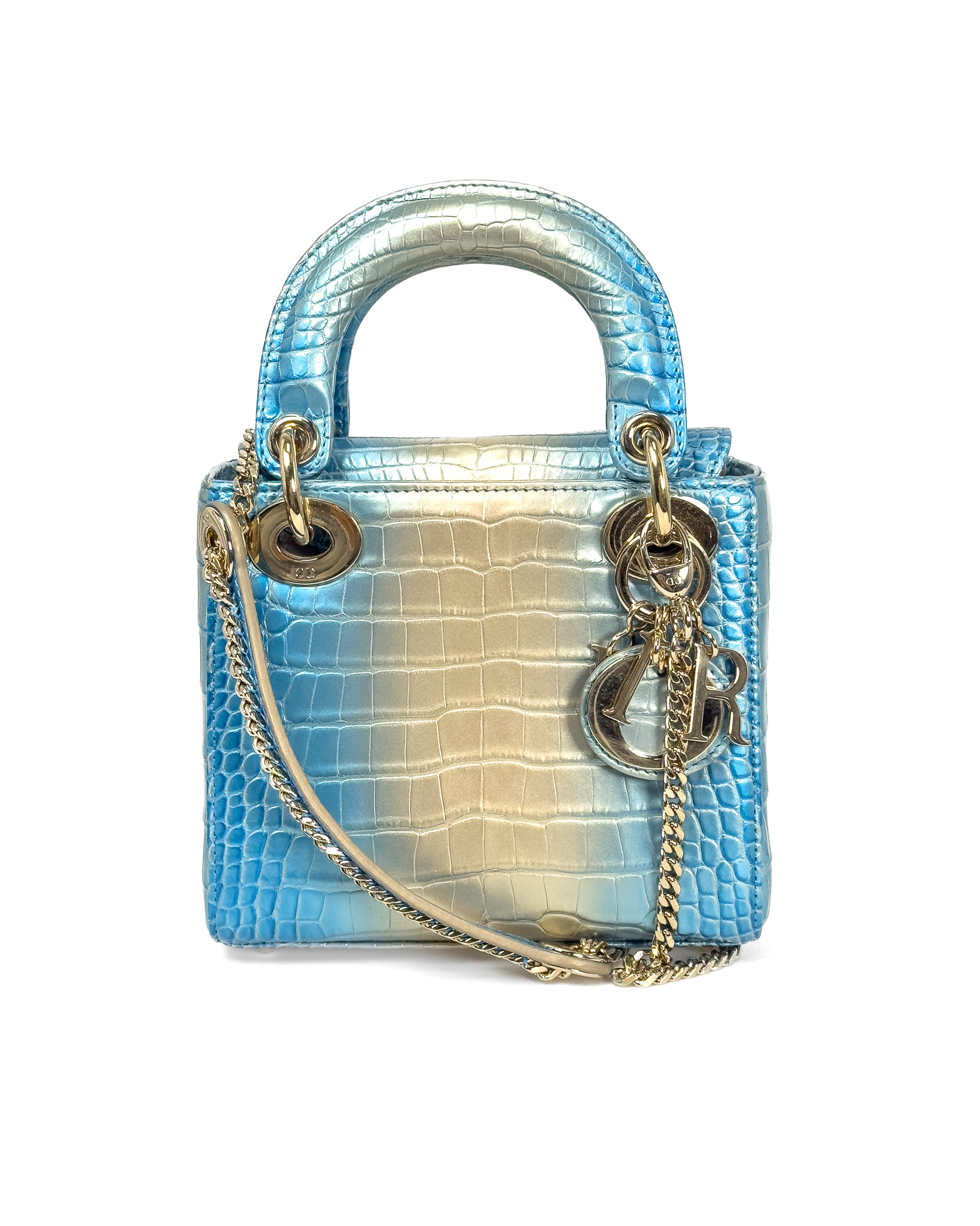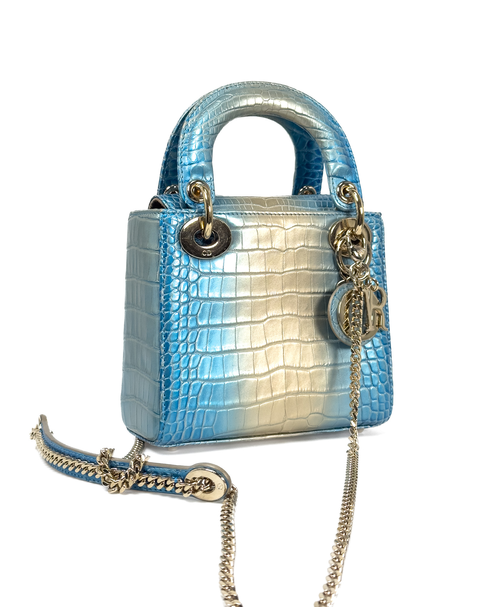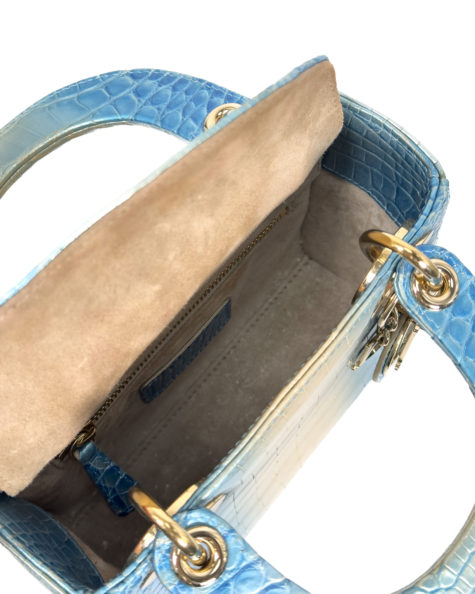 "Model: Lady Dior, rozmiar mini, wersja limitowana. Złoto-niebieska mała torebka wykonana ze skóry krokodyla, dwa uchwyty do ręki ze złotymi brelokami w kształcie liter tworzących logo marki, długi odpinany łańcuchowy pasek na ramię wykończony skórzaną wstawką, cztery nóżki od spodu, logowane złote okucia, zamszowe wnętrze, jedna komora z kieszenią wewnątrz, w zestawie z kartą autentyczności. Stan bardzo dobry, posiada małe rysy na metalowych elementach, delikatne przetarcia na rogach oraz zabrudzenia wewnątrz. Wymiary: szerokość 17cm, wysokość 15cm, głębokość 7cm."