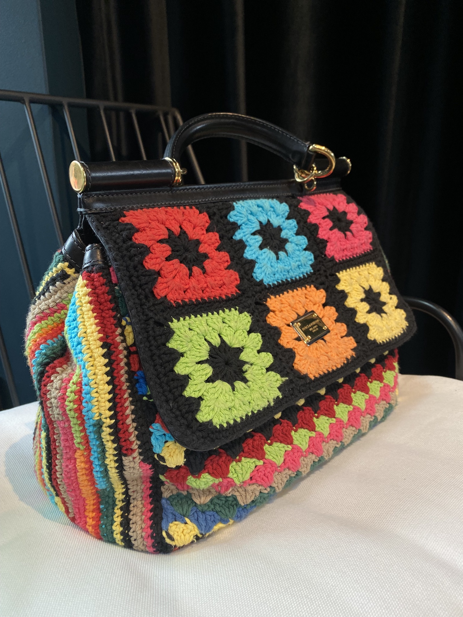 "Model: Miss Sicilly, kolorowa szydełkowa torebka z czarną skórzaną rączką, paskiem, oraz środkiem. Wymiary: 32 cm x 29 cm"