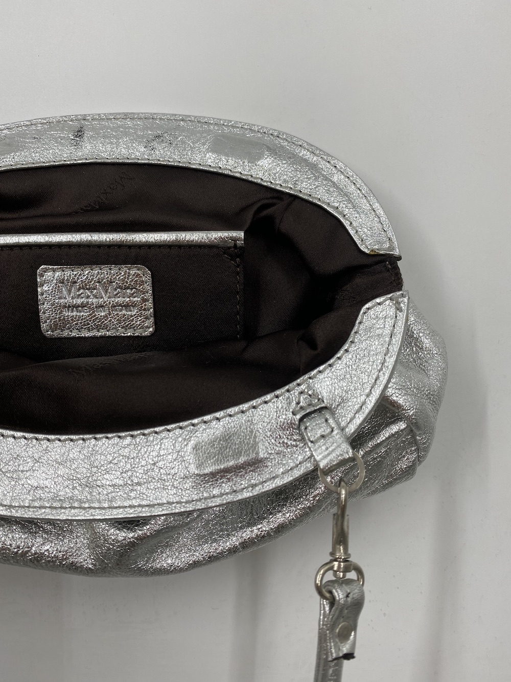 "srebrna, mała torebka na pasku. Może być odpinany wtedy jest kopertówka. Wytłoczone logo na przodzie. Zapinana na magnes. Srodek brązowy, logowany z małą kieszonką. Stan bardzo dobry. Wymiary: 19cm x 26cm."