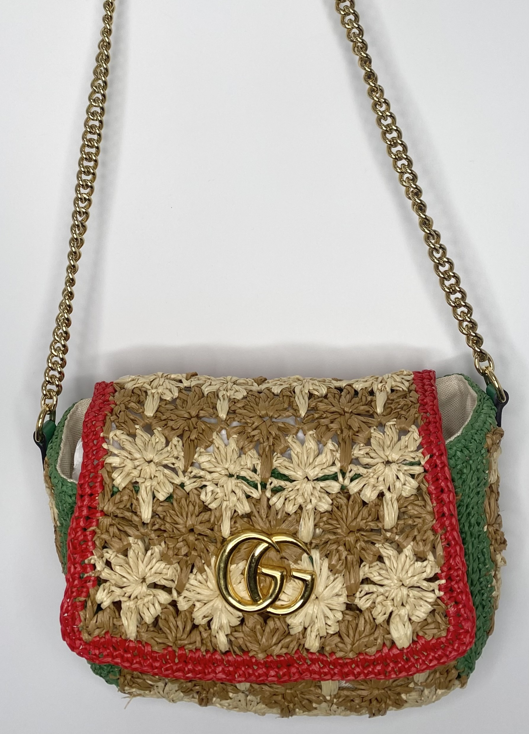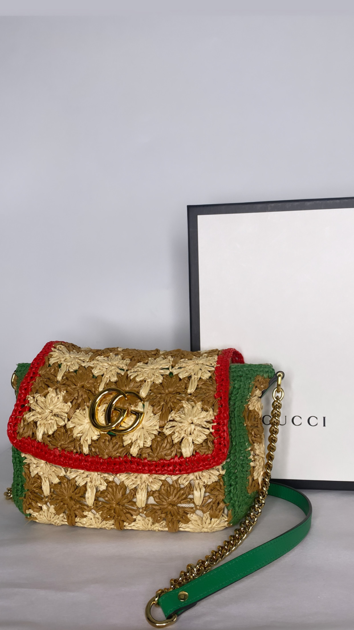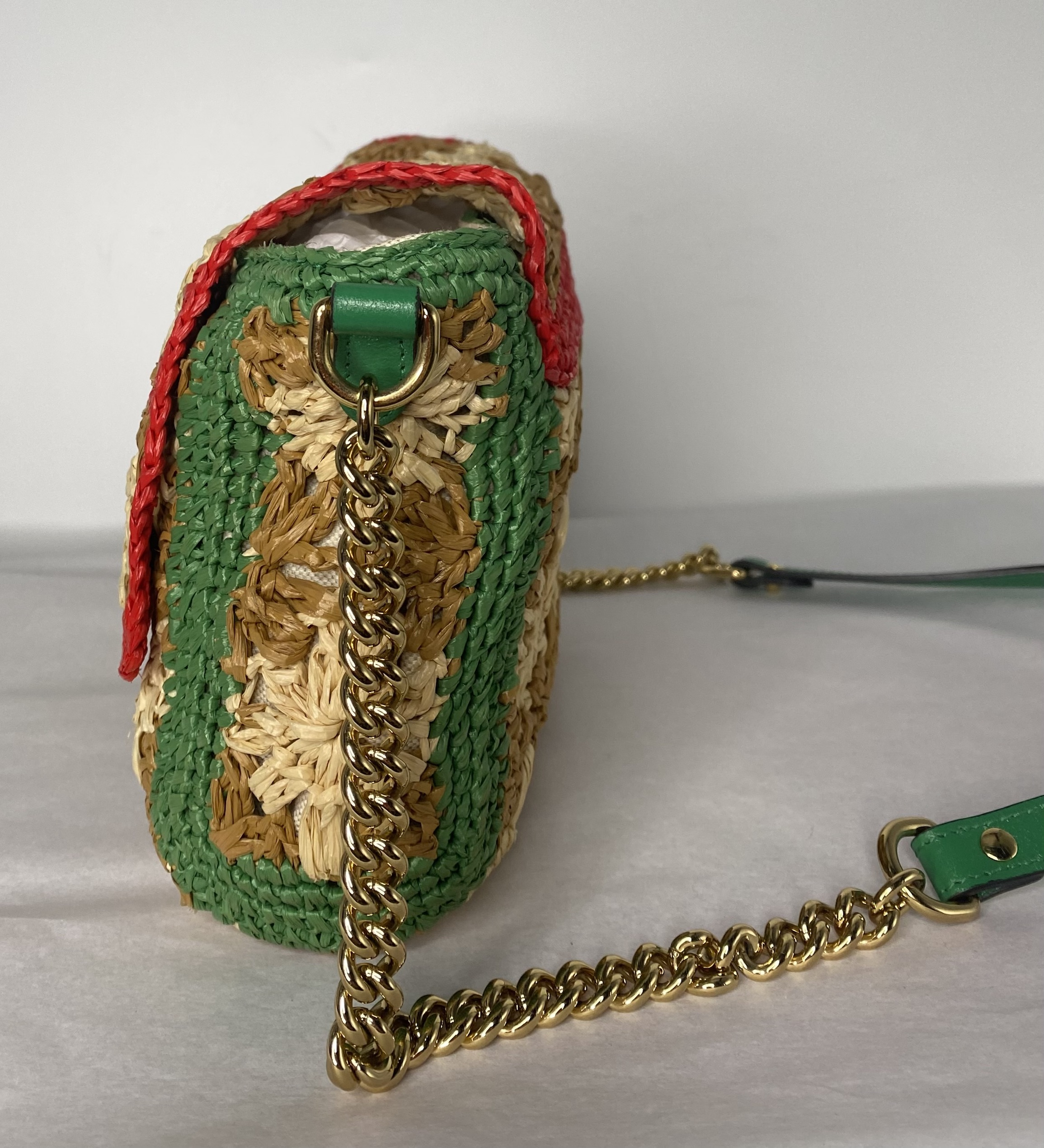 "beżowa torba z rafii, z klapą zapinana na zatrzask złotym logiem, czerwono zielone wstawki, długi zielony pasek ze złotym łańcuchem, pudełko. Wymiary: szer. 30 cm, wys. 22 cm, dł. paska 106 cm. Gucci GG Marmont Flower Crochet Raffia Shoulder Bag"