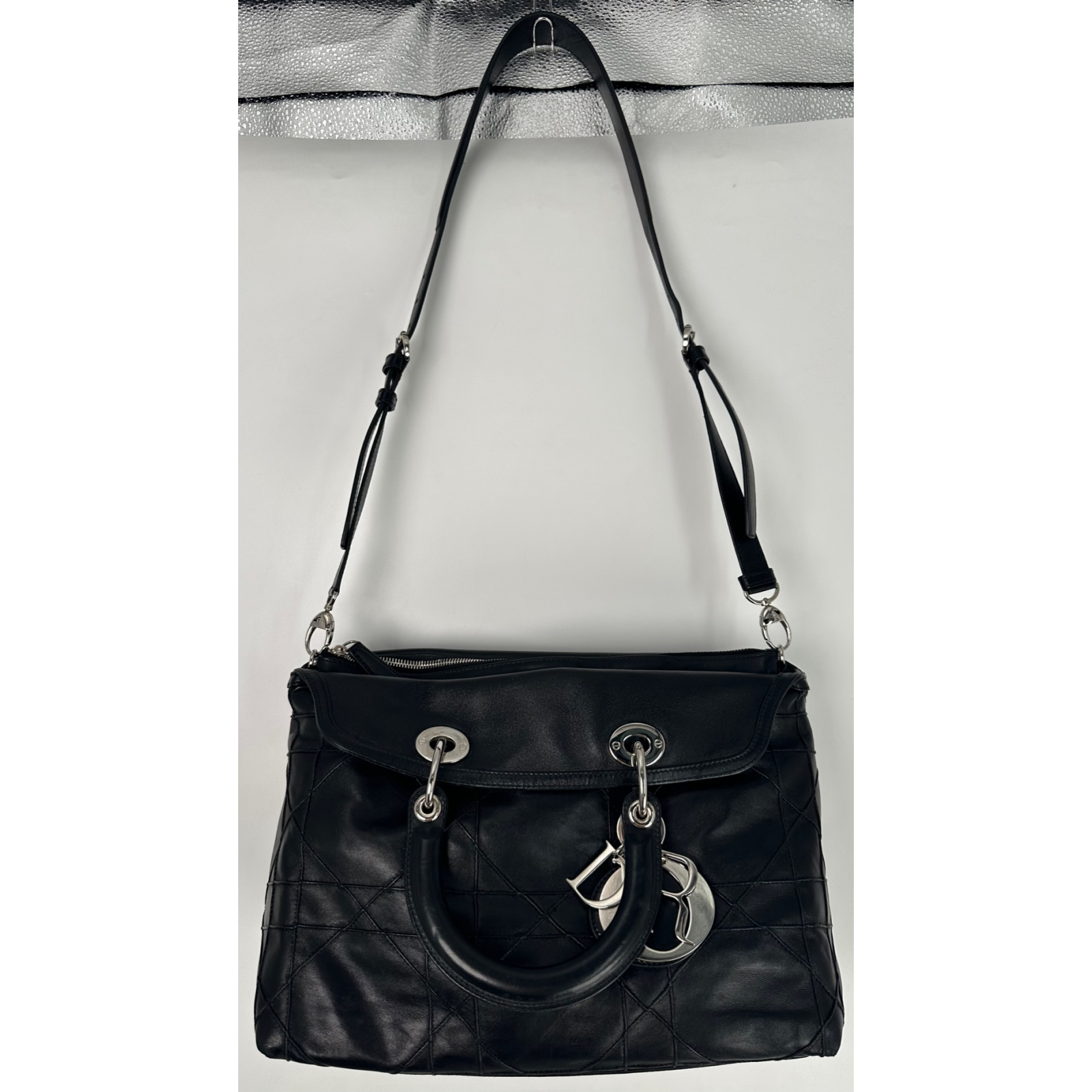 "czarna skórzana torebka do ręki oraz na ramię, srebrne elementy. Przetarte rogi, miejscami rysy. Model Diorr. Wymiary: szer. 38 cm, wys, 28 cm, podstawa 14 cm, dł rączki 31 cm, dł. paska regulowana."