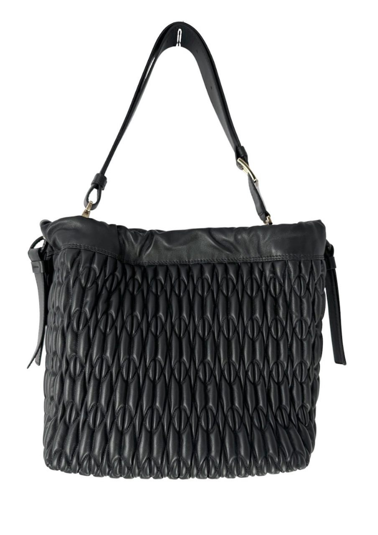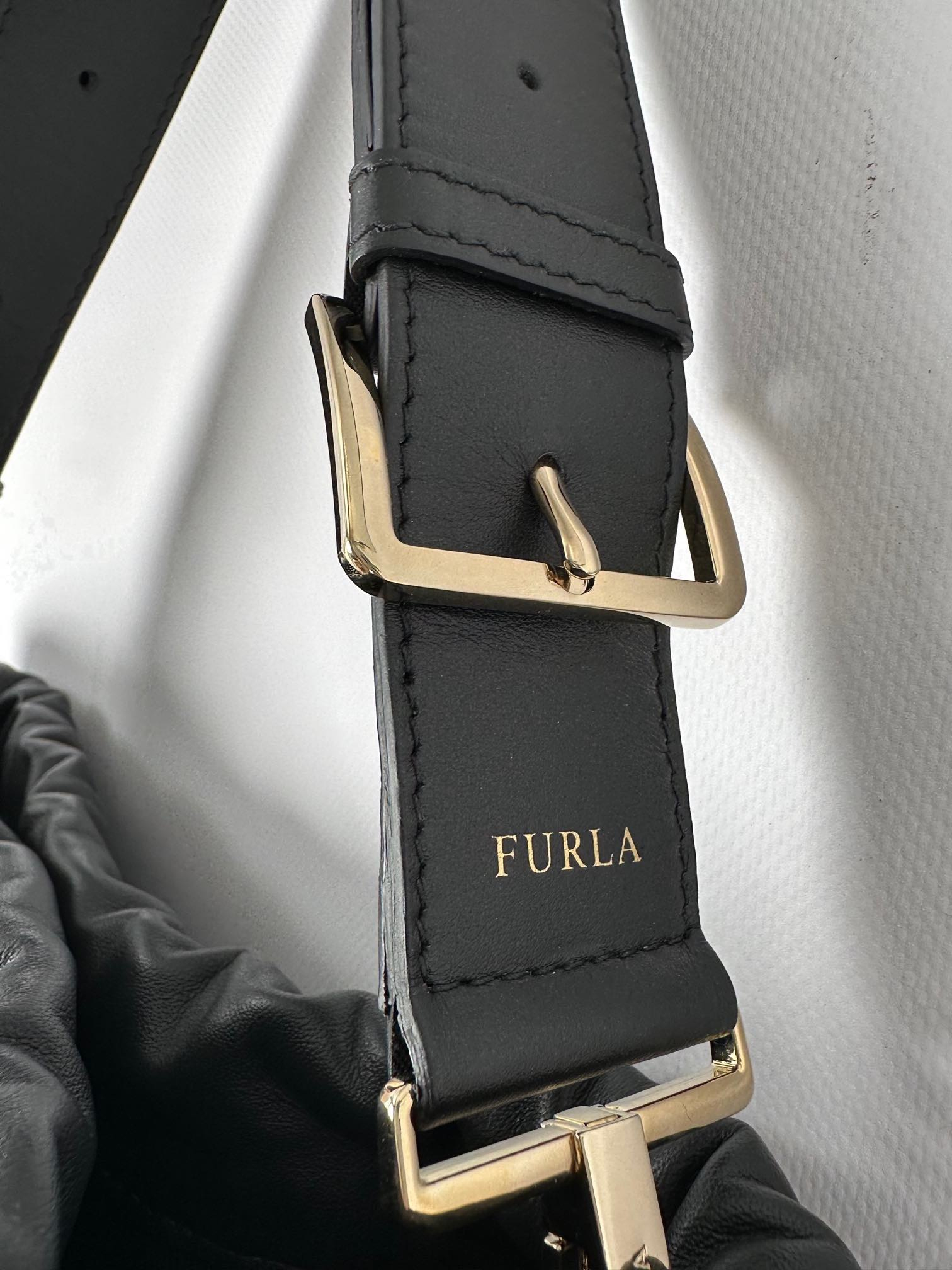 "czarna skórzana torebka z przeszyciami, zapięcie na zatrzask, z boku ściągacze ze skóry, pasek na ramię w zestawie, nowa. Wymiary: szer. 35 cm, wys. 30 cm, podstawa 13 cm."