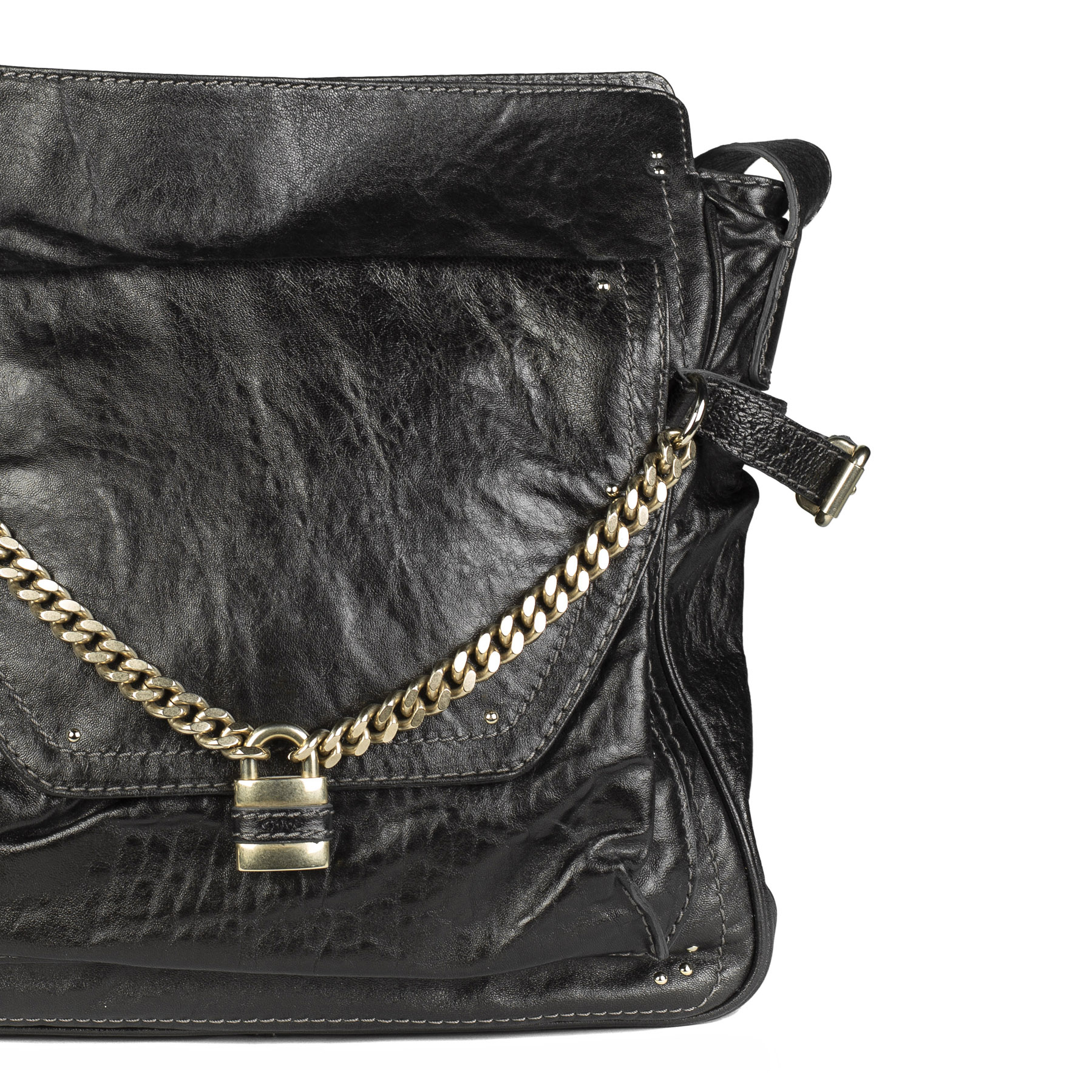 "Torebka, czarna, złote okucia, złoty łańcuch, złota kłódka, na szerokim pasku, zapięcia na magnesy, duża, kluczyk. Wymiary: szerokość 41 cm, wysokość 36 cm, dł. pasek 123 cm"
