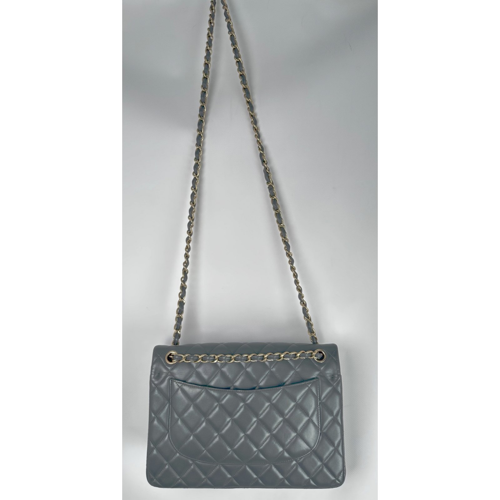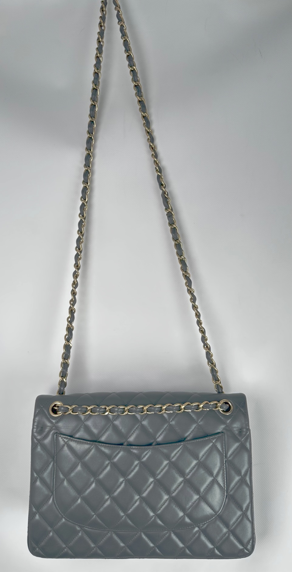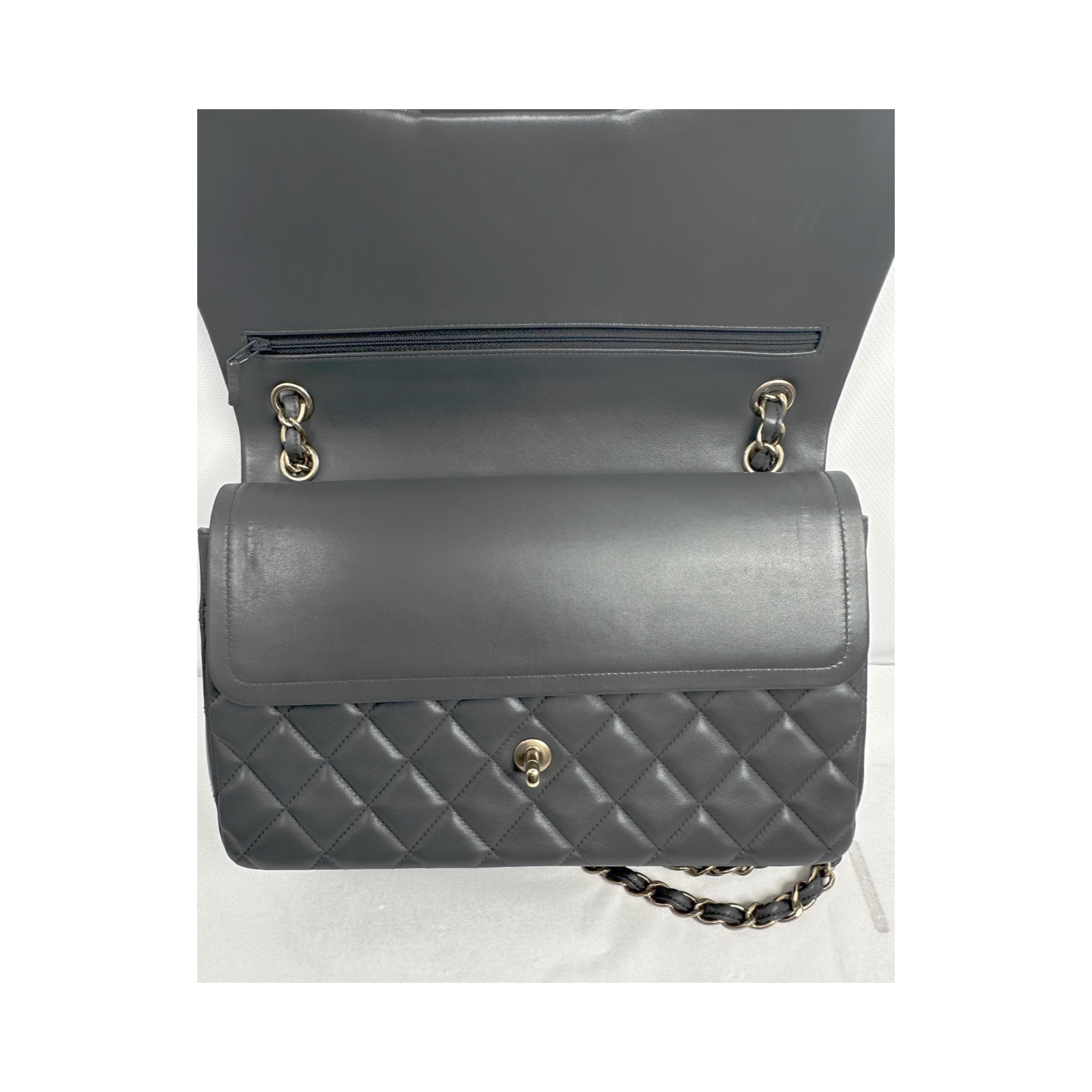 "(Timeless Flap Large )torebka z szarej, pikowanej skóry. Zawieszona jest na długim łańcuszku w kolorze złotym o dużych ogniwach, przez które przepleciony jest skórzany pasek. Chwytając go w połowie długości można uzyskać, krótsze dwa paski. Dzięki temu torebkę można nosić zarówno na jednym ramieniu, jak i po skosie jak listonoszkę. Dół torebki jest dodatkowo lekko usztywniony. Przednia klapa jest lekko wycięta i zamyka body torebki na przekręcaną metalową klamrę w kolorze złotym z logo. Od strony ciała ma otwartą kieszeń. Wewnątrz ma dwie komory. Jedna jest płaska, bez zapięcia, a druga zamykana na zatrzask, ukryty pod klapą z jednolitej skóry licowej. Wewnątrz komory ma dwie, duże kieszenie oraz dwie mniejsze kieszonki. Stan: dobry, lekkie przetarcia na rogach. Karta oraz worek przeciwkurzowy w zestawie oraz pudełko. Skład: 100% skóra naturalna. Wymiary: dł. całkowita: 30 cm., szer.: 5-9 cm., gł. : 9 cm. , ws.: 19,5 cm. dł. paska: 132 cm."